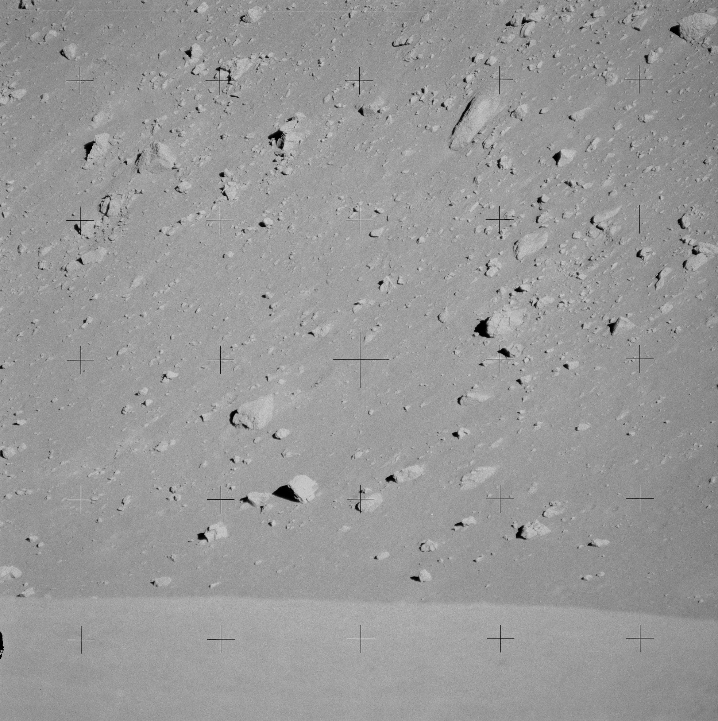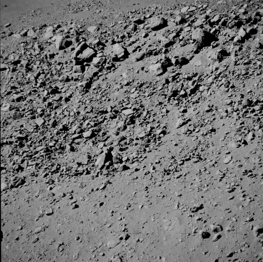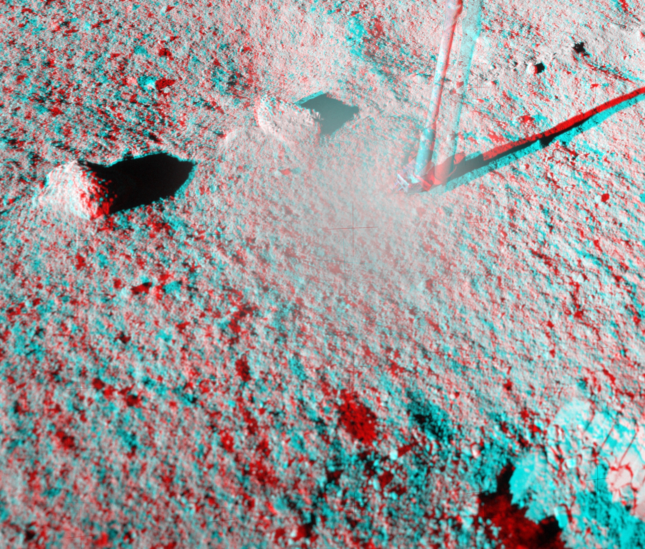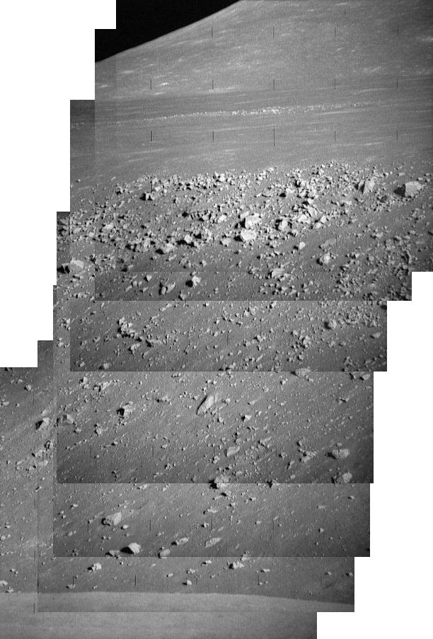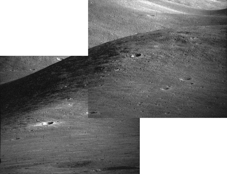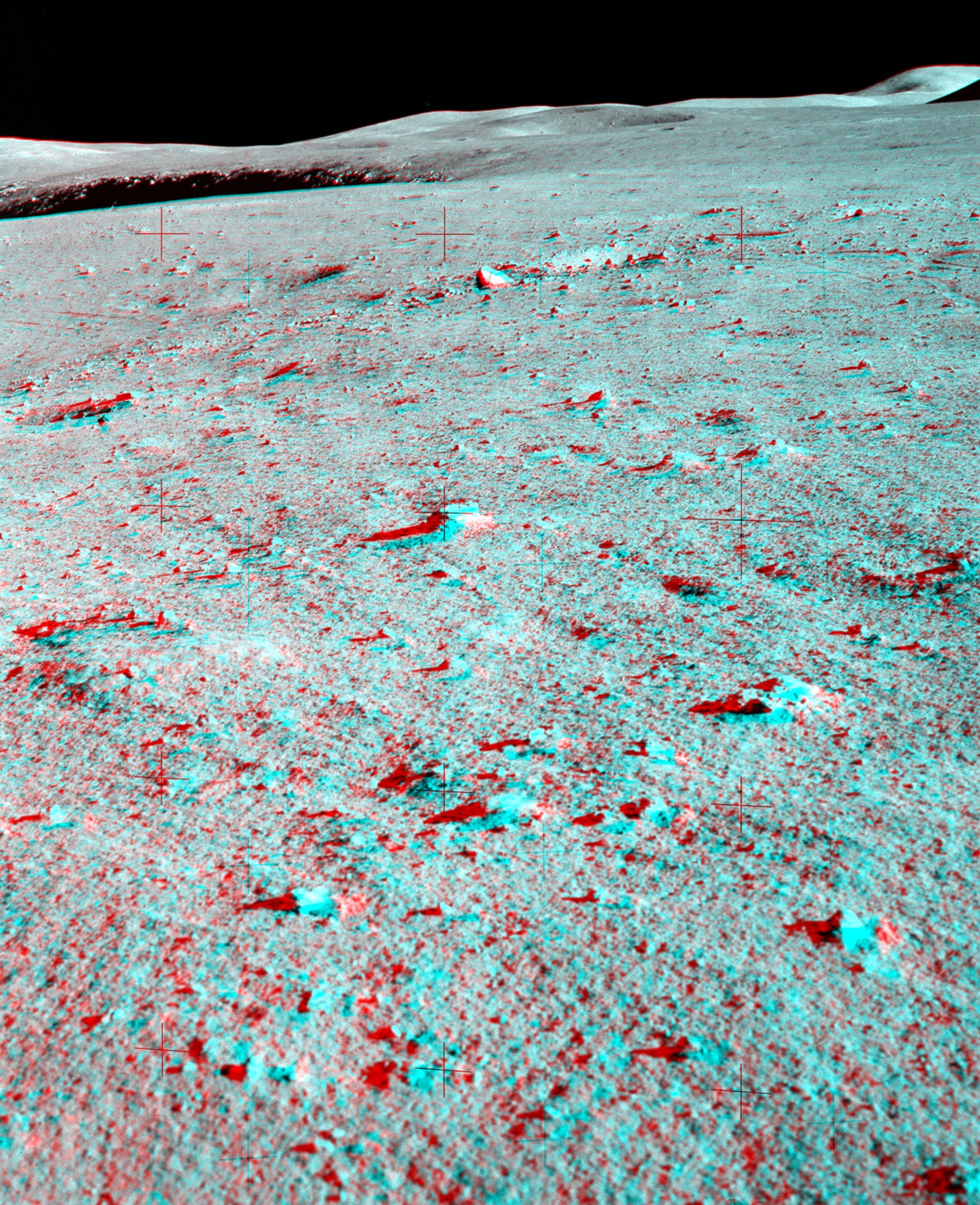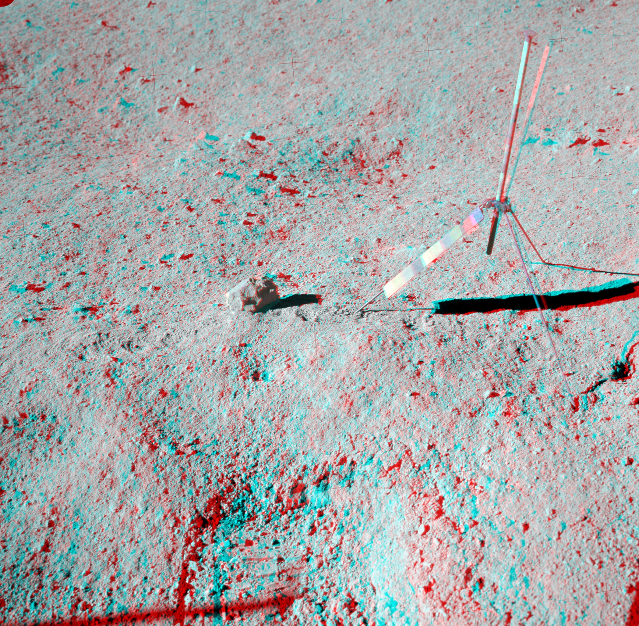 These two images of the landing site were taken during the Rev. 16 pass. The vertical exaggeration is about a factor of five. The images were downloaded from Arizona State University's Apollo Image Archive and cleaned to remove the effects of dust-specks. Anaglyph created by Eric Nelson.Rev 23 Mapping (Metric) Camera Frame 0854 ( 13 Mb )