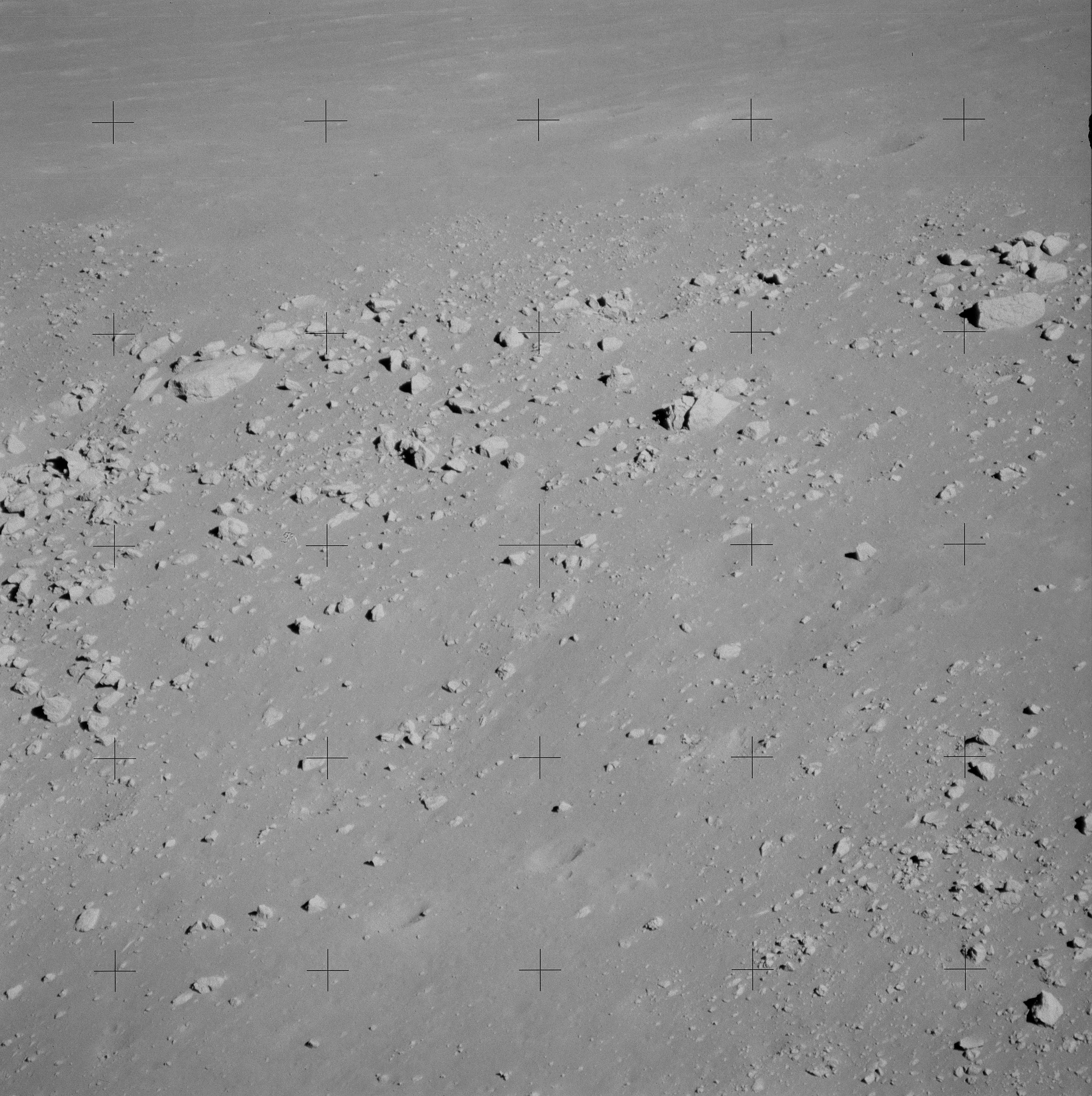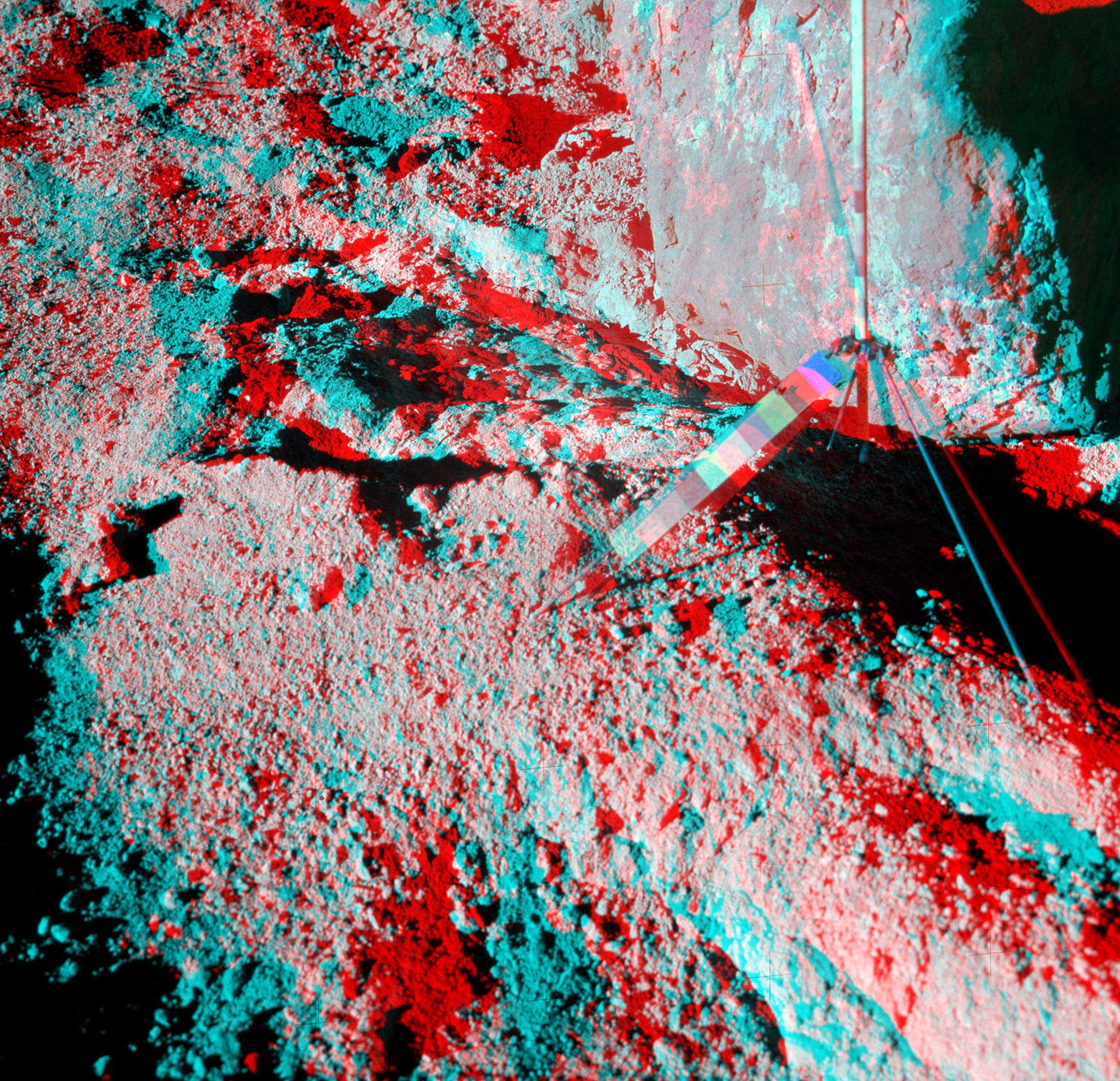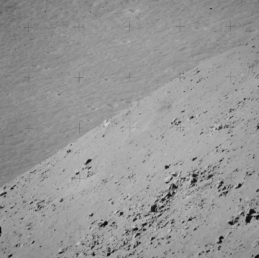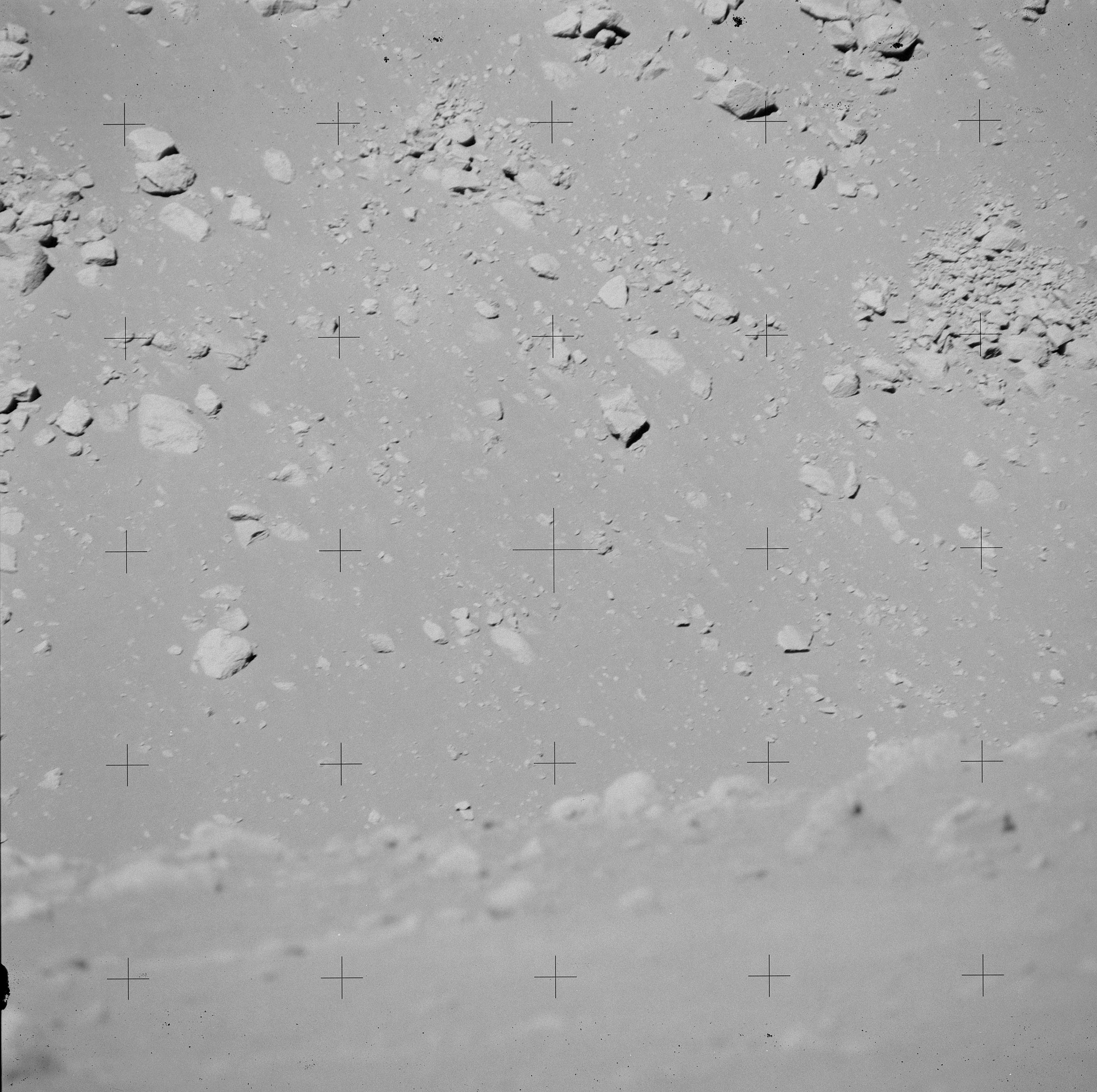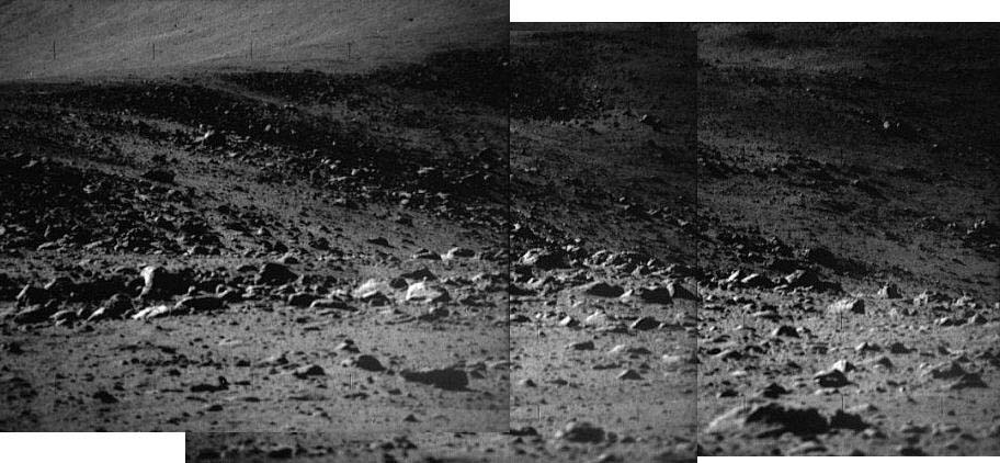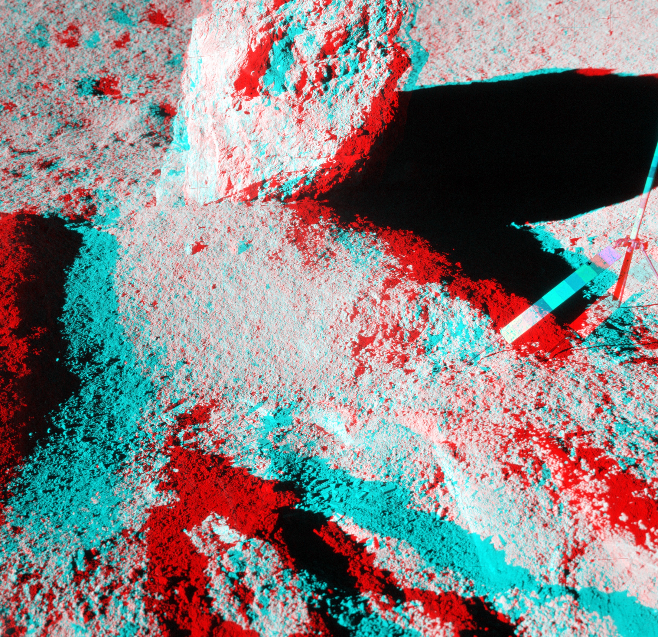 These two images of the landing site were taken during the Rev. 16 pass. The vertical exaggeration is about a factor of five. The images were downloaded from Arizona State University's Apollo Image Archive and cleaned to remove the effects of dust-specks. Anaglyph created by Eric Nelson.Rev 23 Mapping (Metric) Camera Frame 0854 ( 13 Mb )