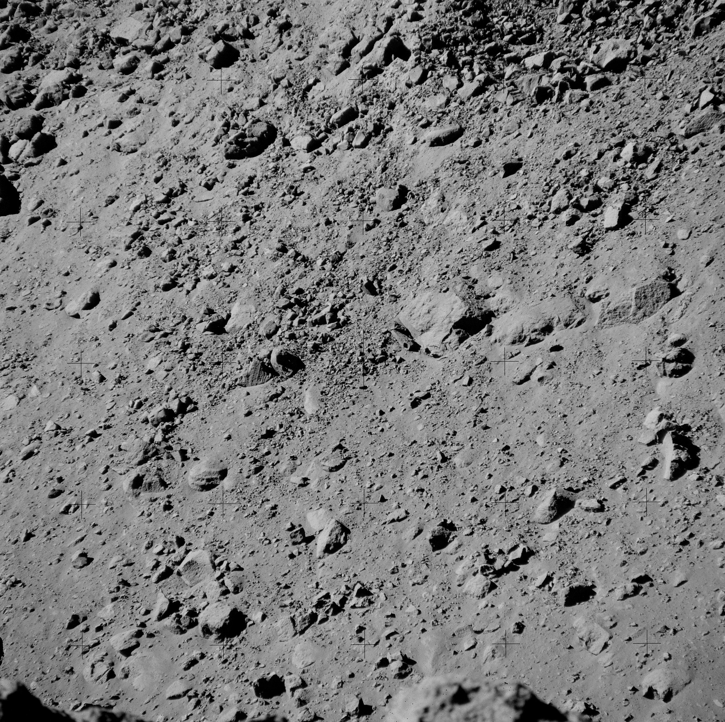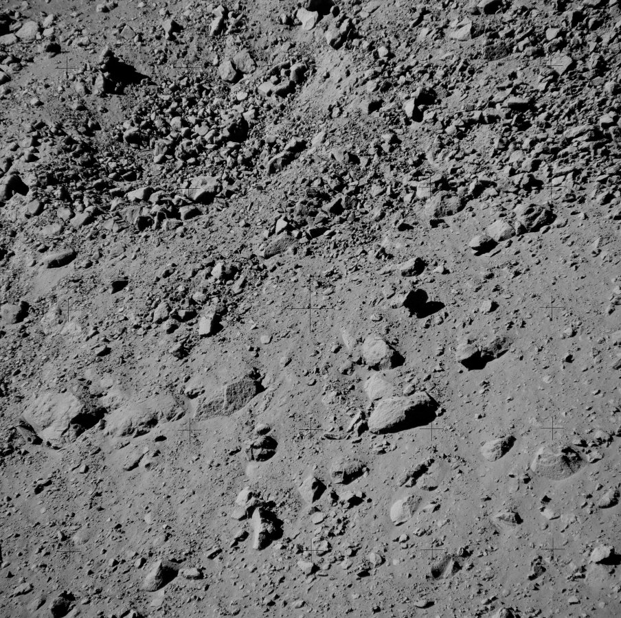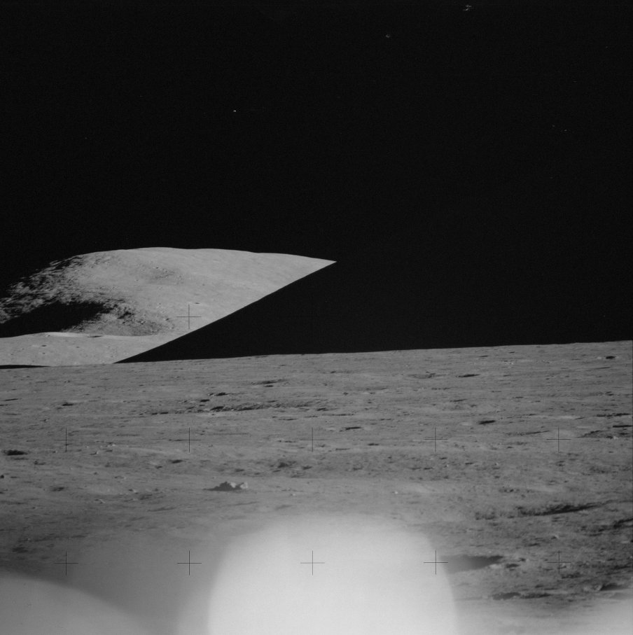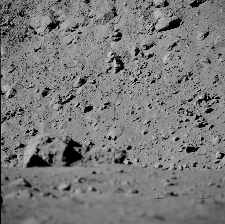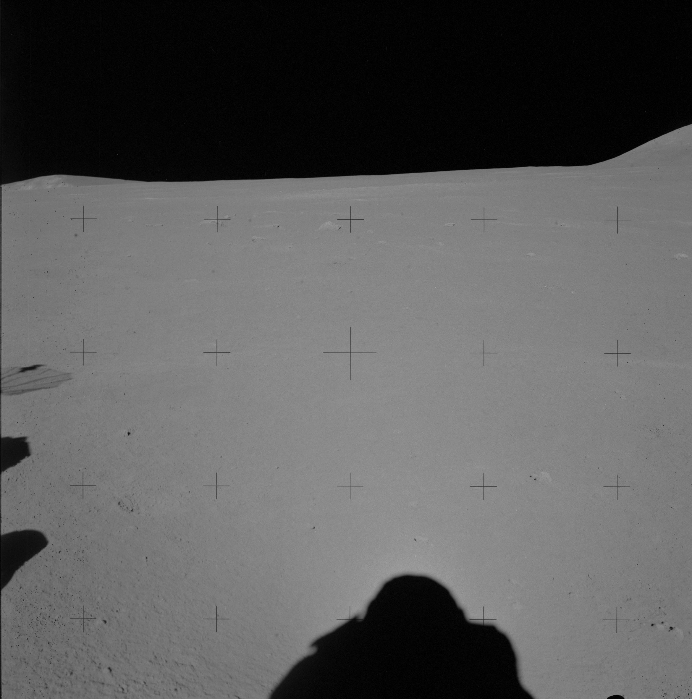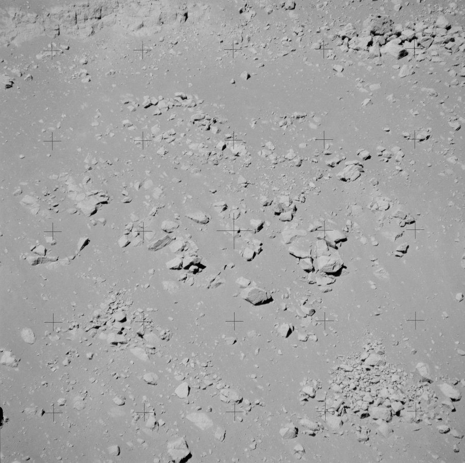 These two images of the landing site were taken during the Rev. 16 pass. The vertical exaggeration is about a factor of five. The images were downloaded from Arizona State University's Apollo Image Archive and cleaned to remove the effects of dust-specks. Anaglyph created by Eric Nelson.Rev 23 Mapping (Metric) Camera Frame 0854 ( 13 Mb )