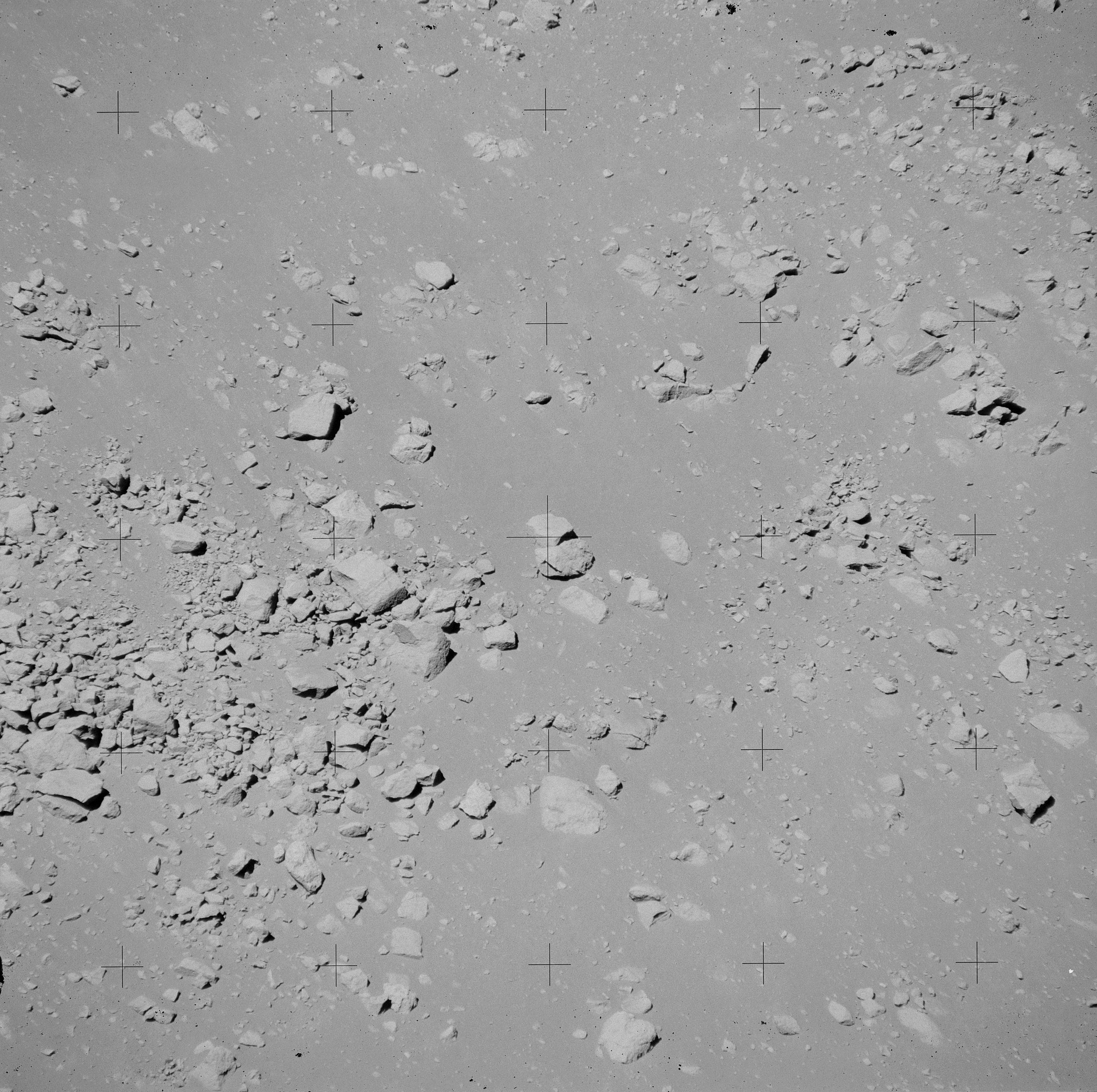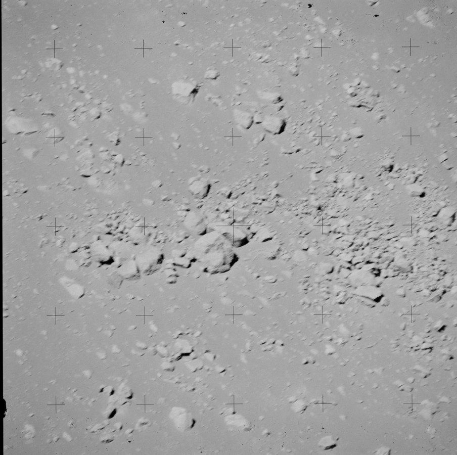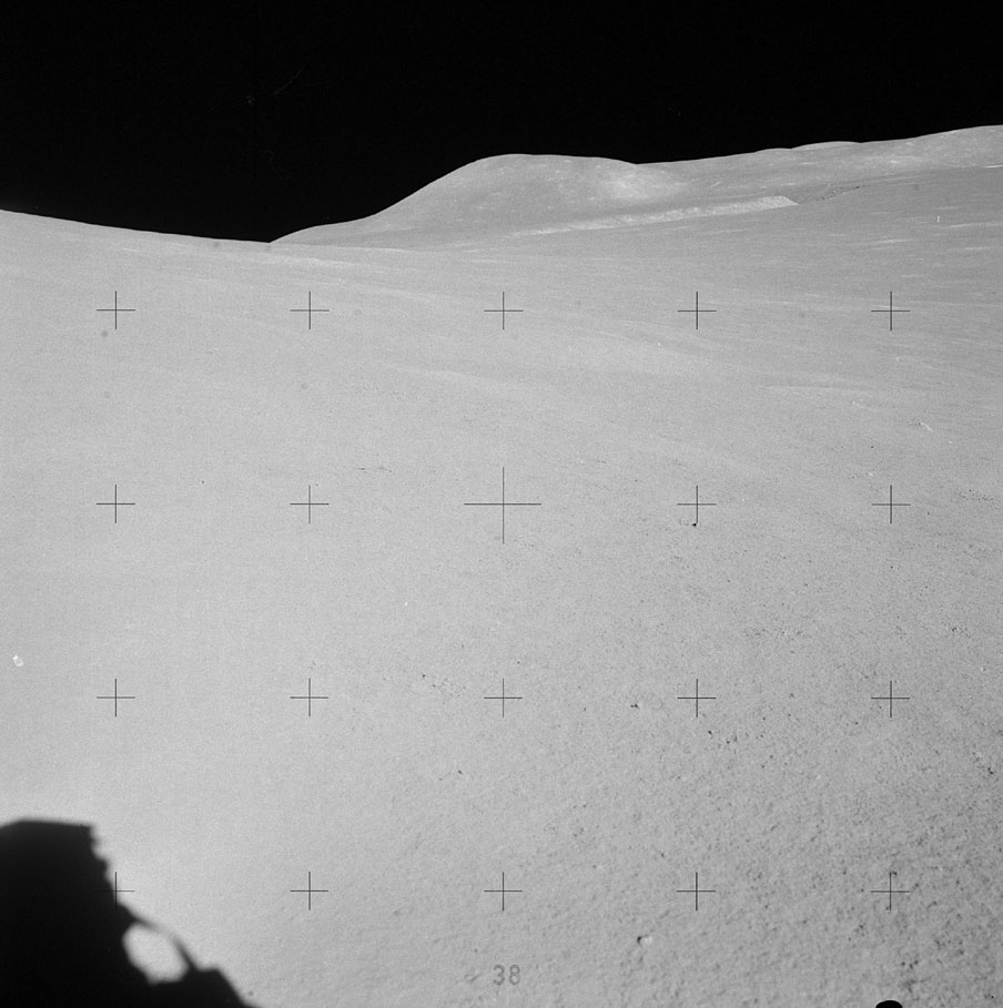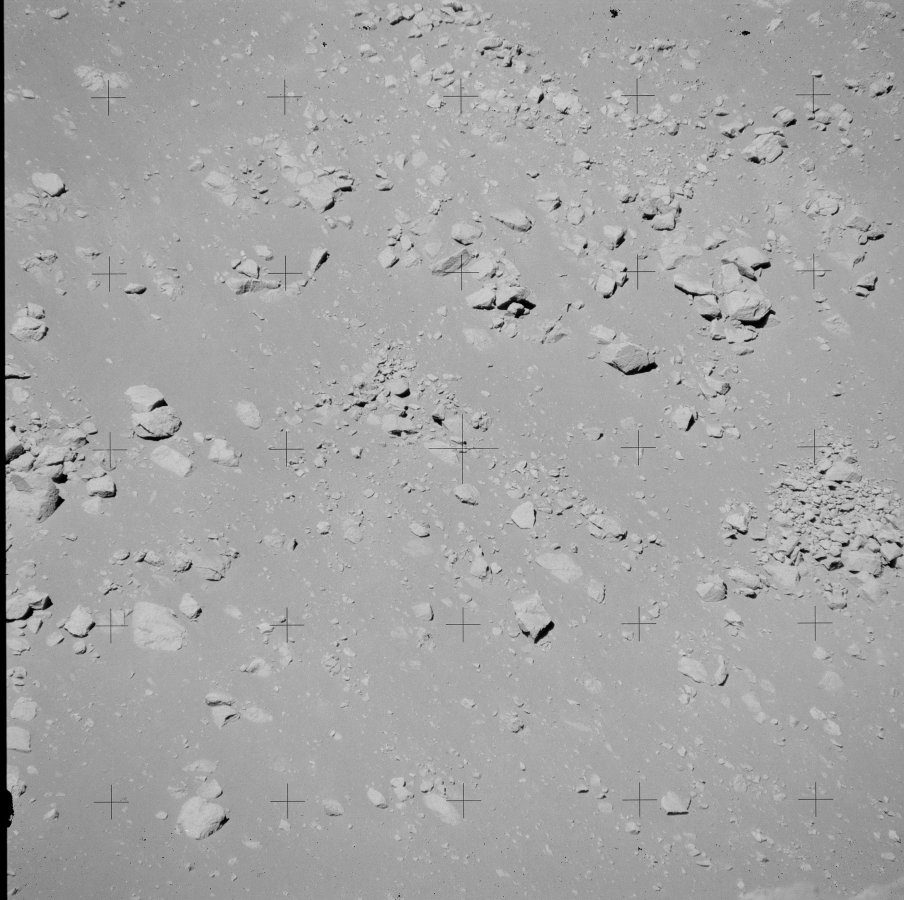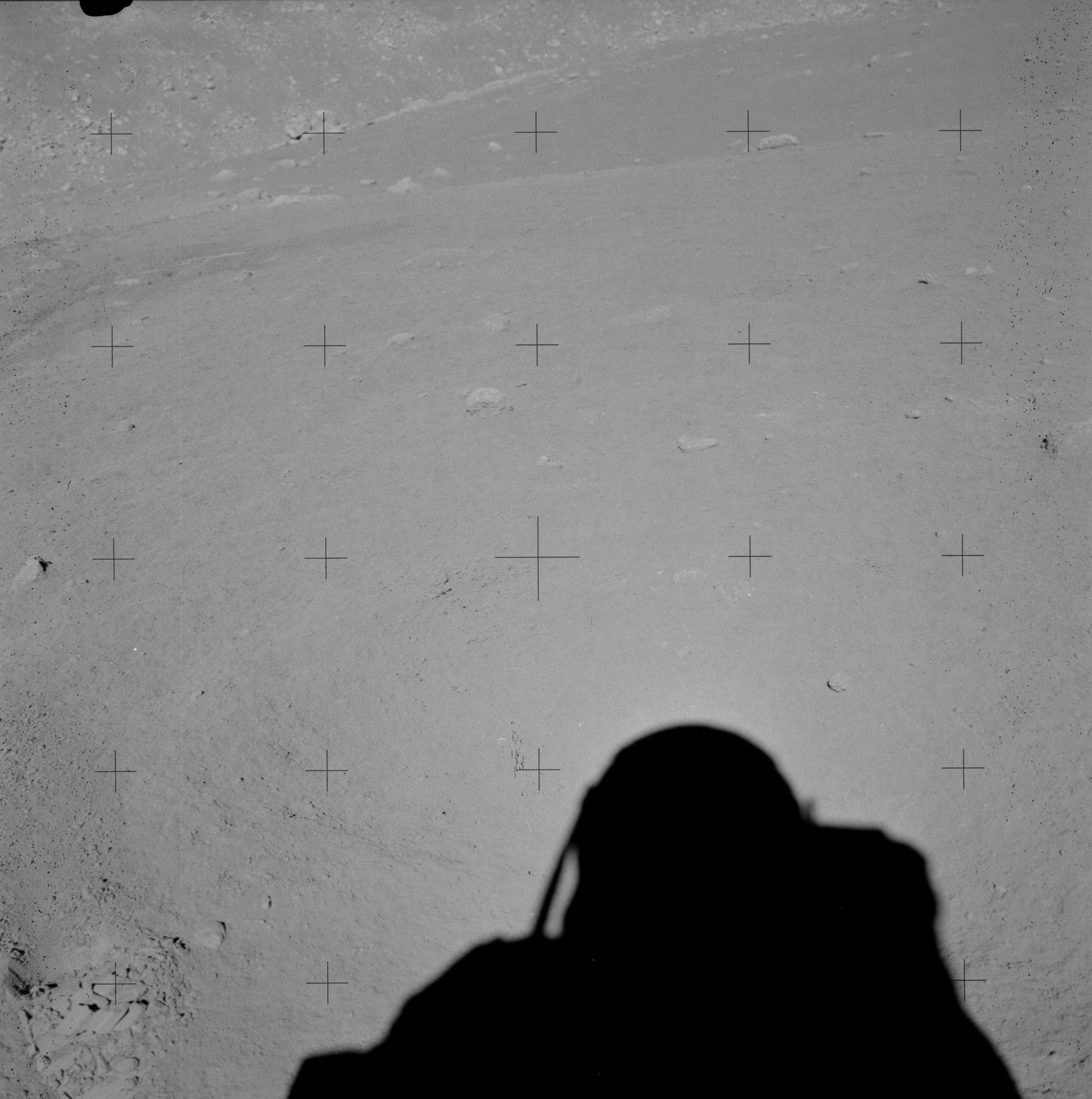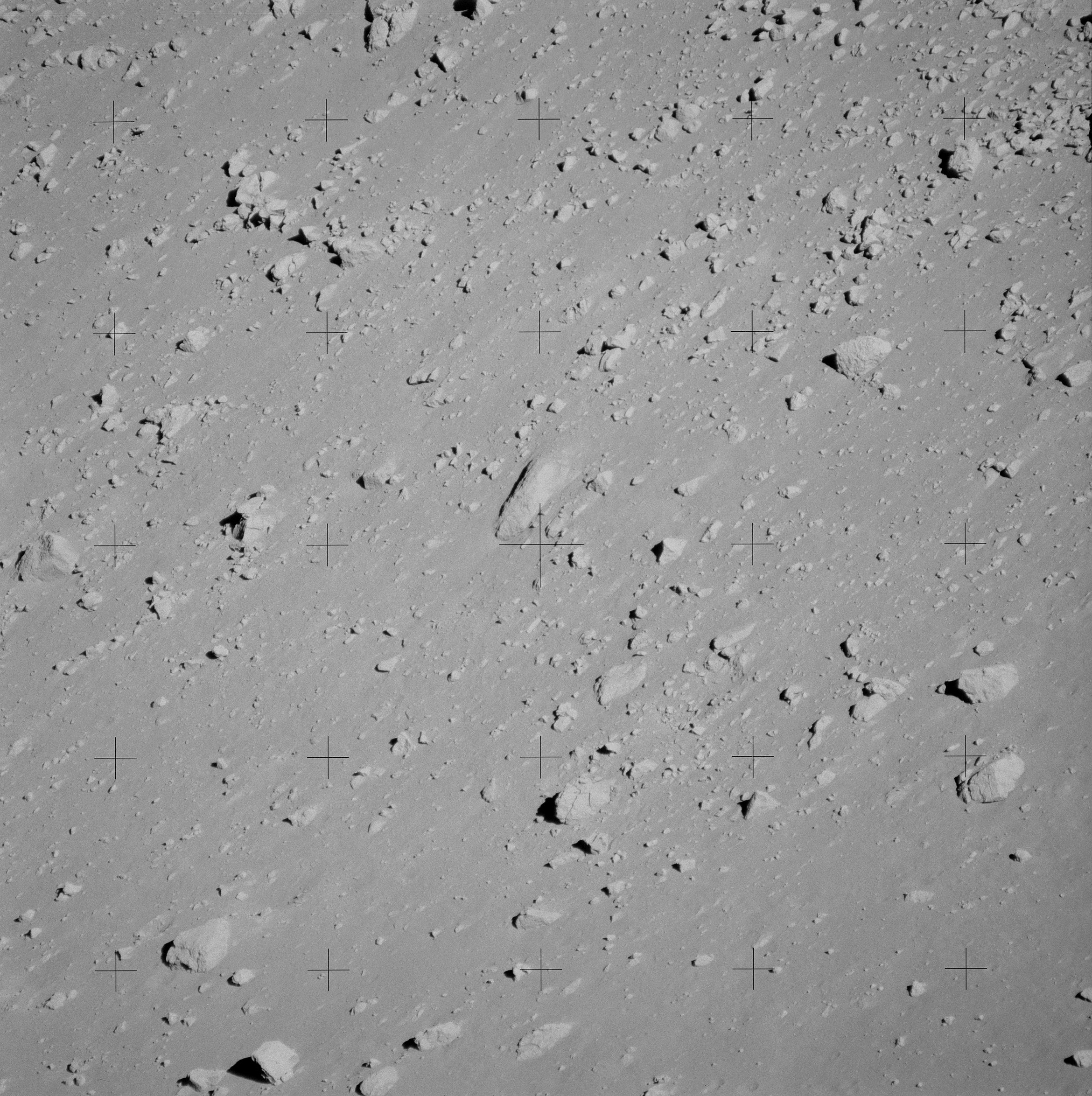 These two images of the landing site were taken during the Rev. 16 pass. The vertical exaggeration is about a factor of five. The images were downloaded from Arizona State University's Apollo Image Archive and cleaned to remove the effects of dust-specks. Anaglyph created by Eric Nelson.Rev 23 Mapping (Metric) Camera Frame 0854 ( 13 Mb )