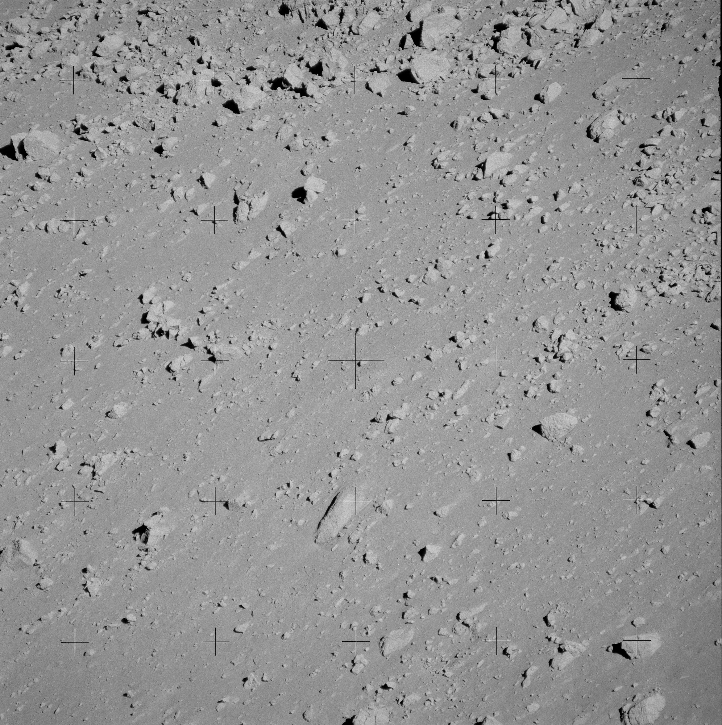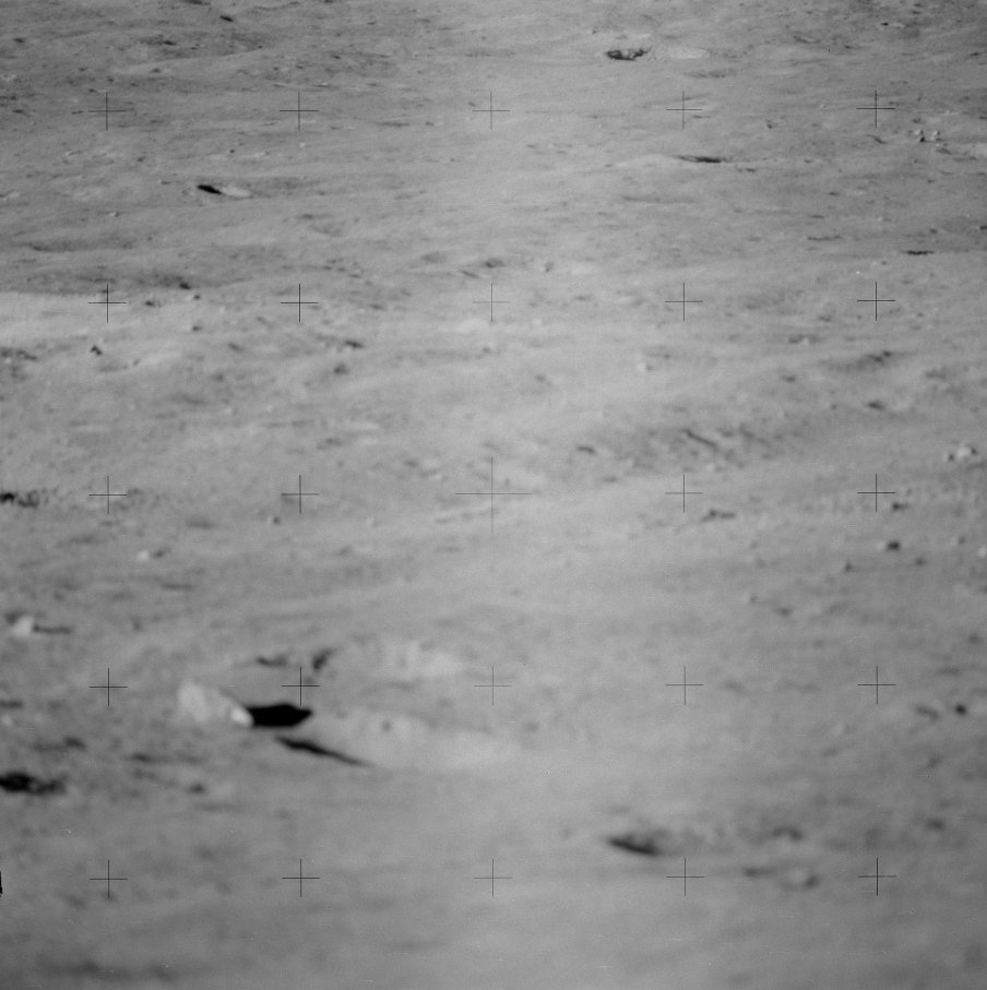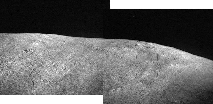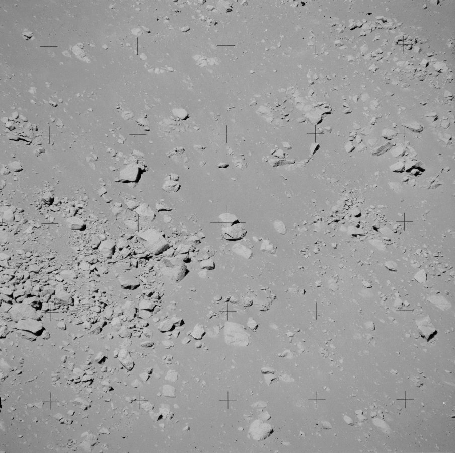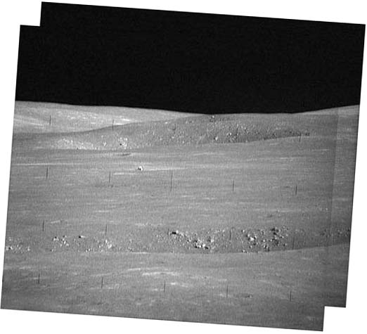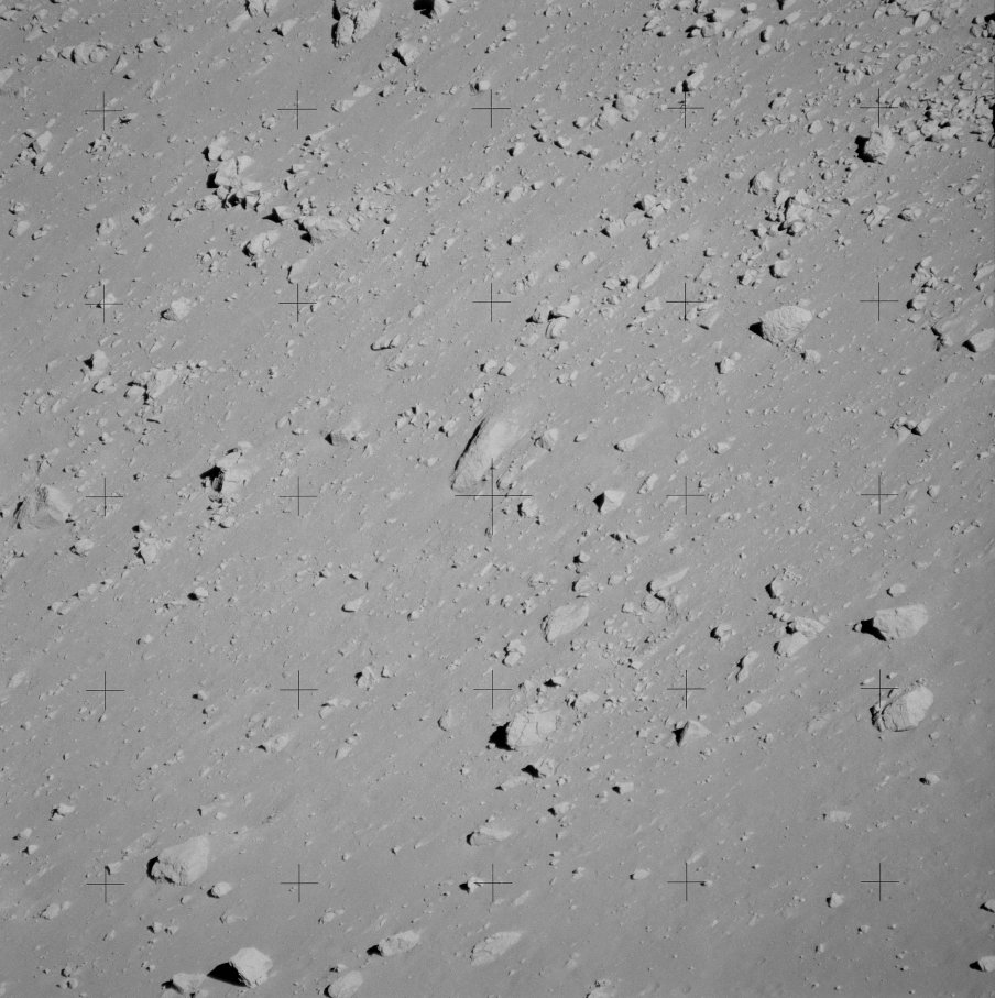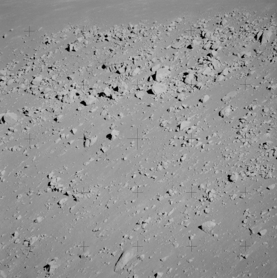 These two images of the landing site were taken during the Rev. 16 pass. The vertical exaggeration is about a factor of five. The images were downloaded from Arizona State University's Apollo Image Archive and cleaned to remove the effects of dust-specks. Anaglyph created by Eric Nelson.Rev 23 Mapping (Metric) Camera Frame 0854 ( 13 Mb )