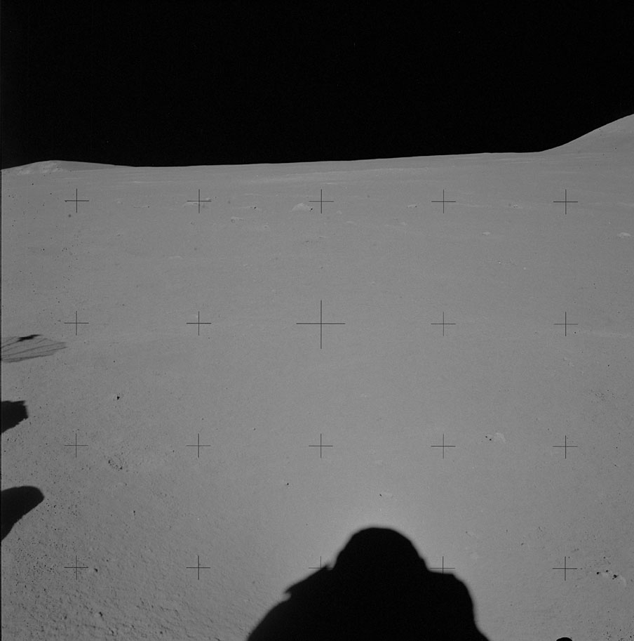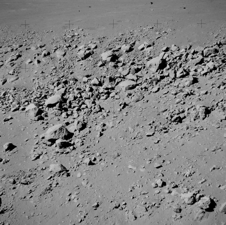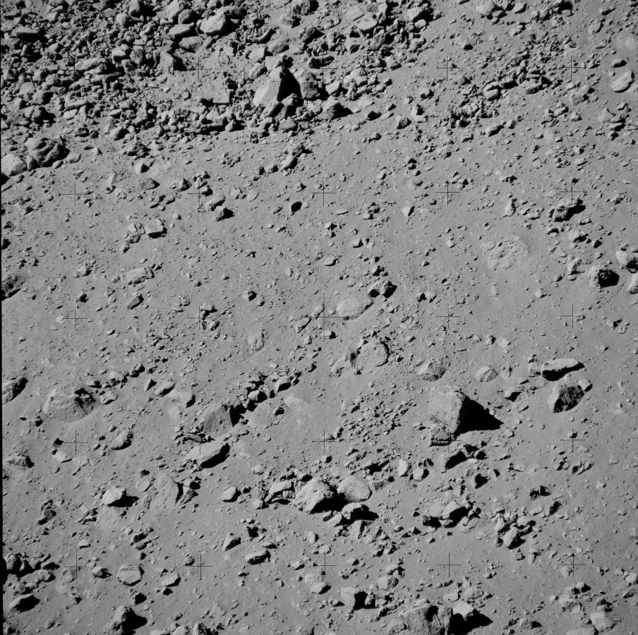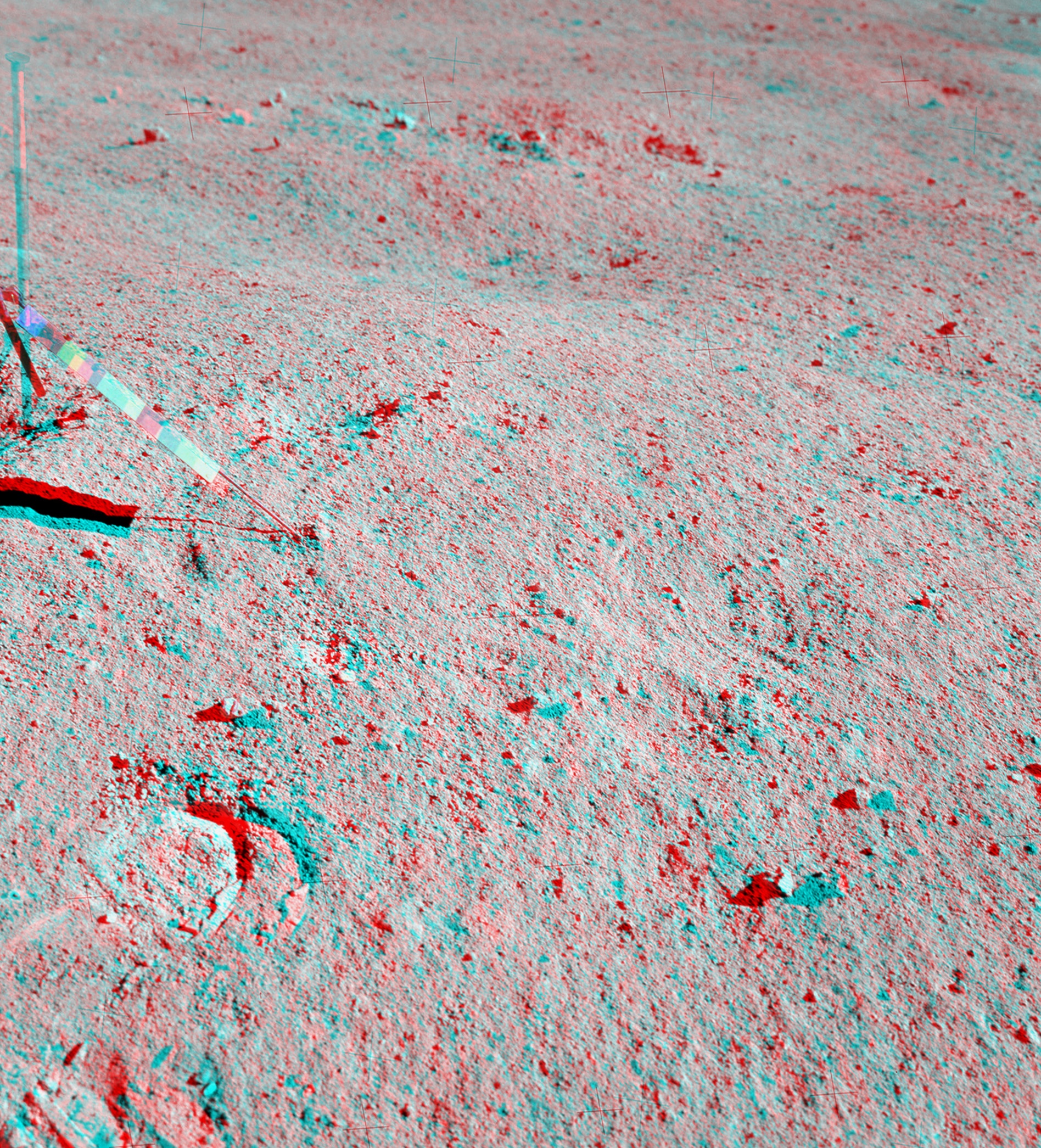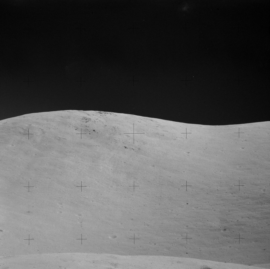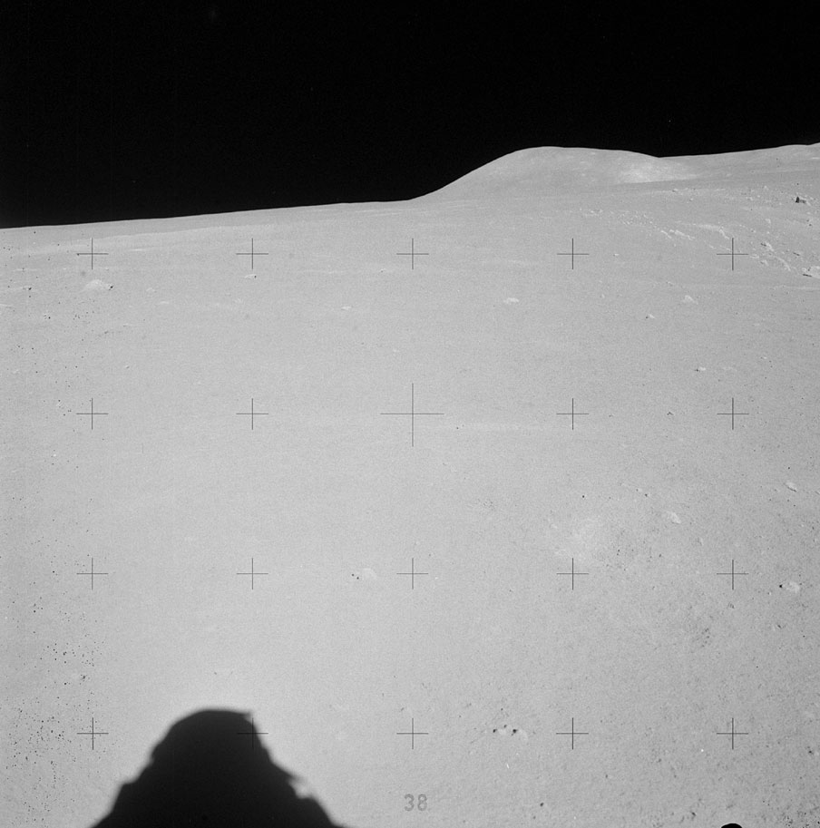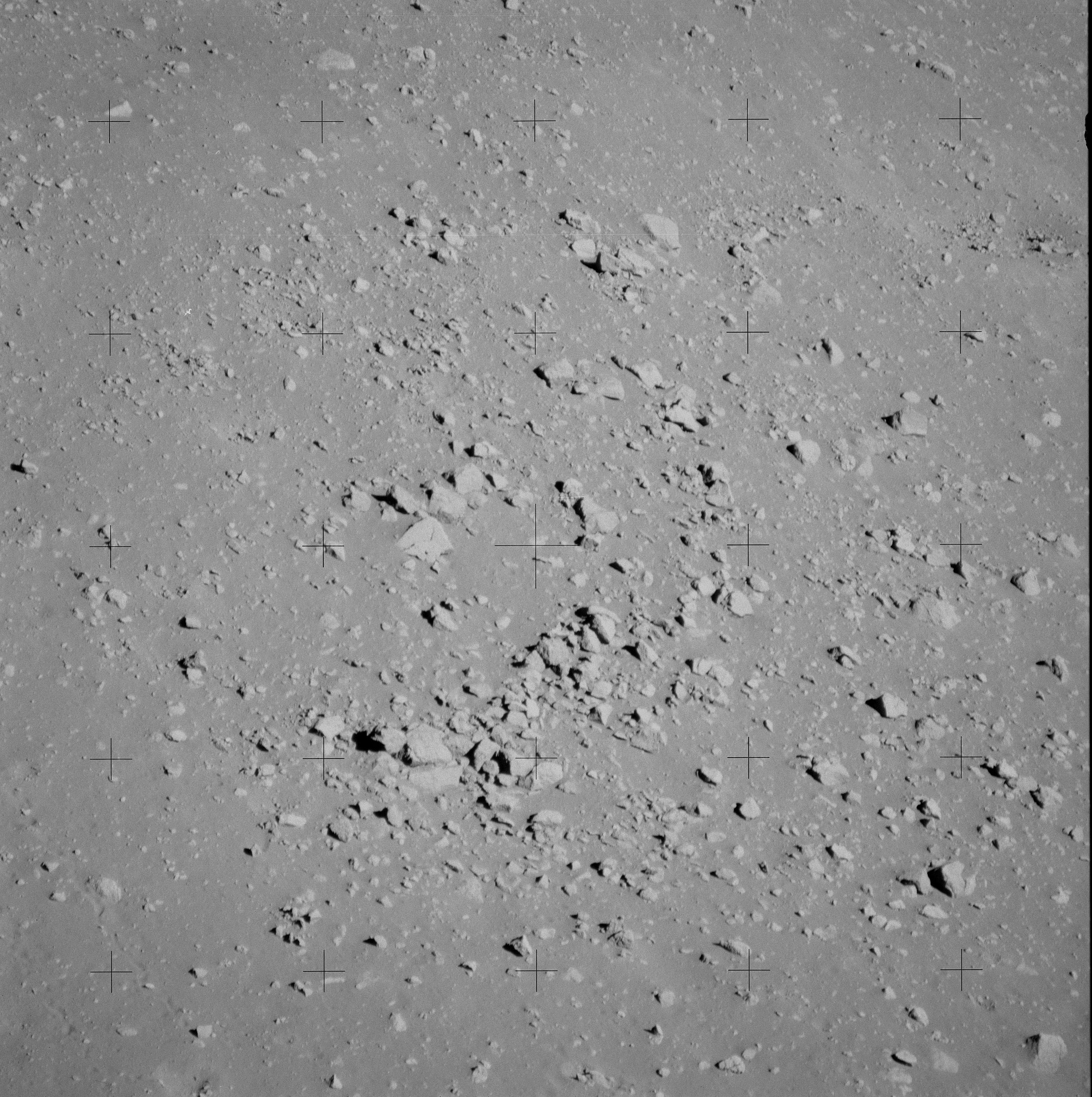 These two images of the landing site were taken during the Rev. 16 pass. The vertical exaggeration is about a factor of five. The images were downloaded from Arizona State University's Apollo Image Archive and cleaned to remove the effects of dust-specks. Anaglyph created by Eric Nelson.Rev 23 Mapping (Metric) Camera Frame 0854 ( 13 Mb )