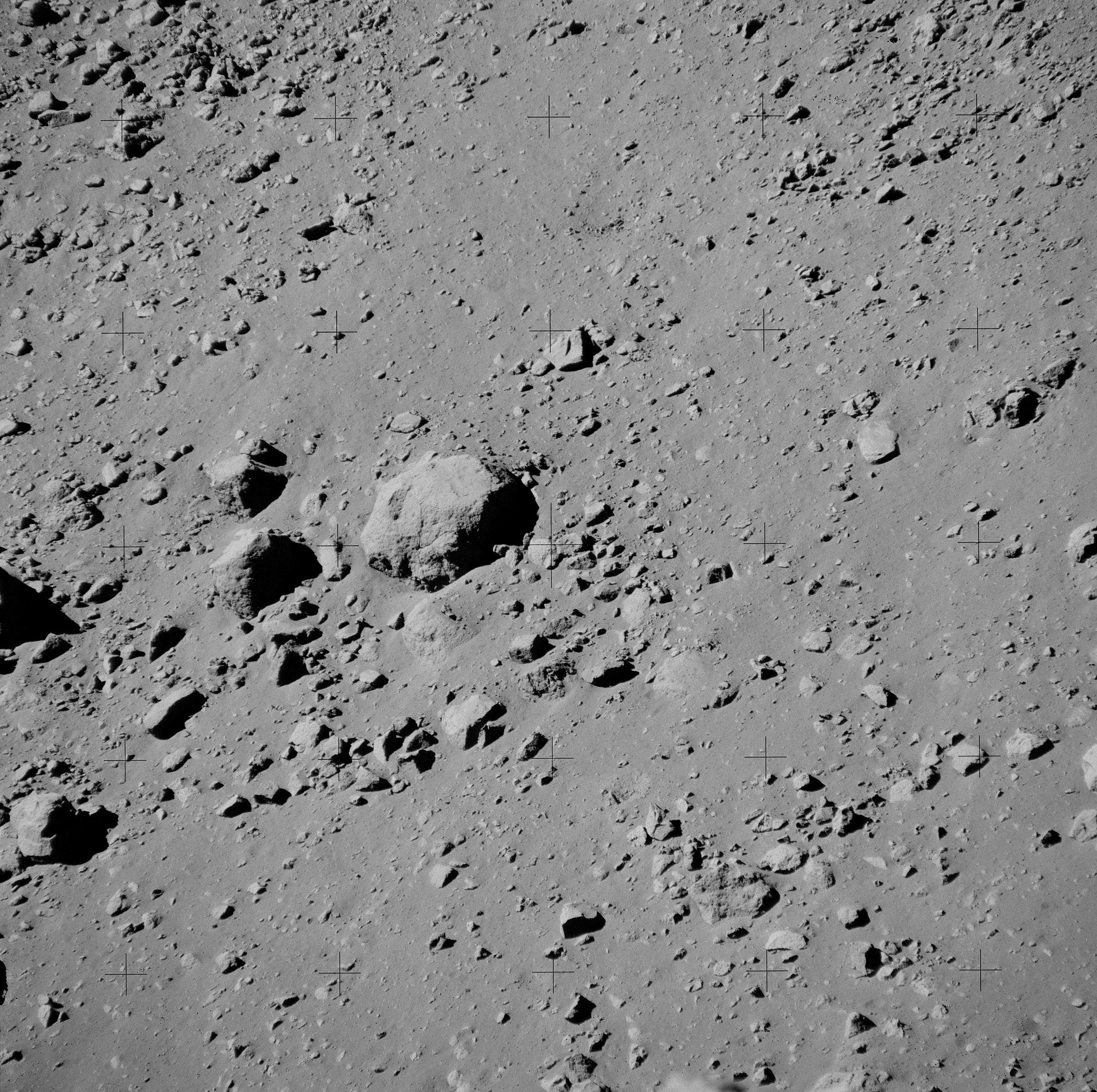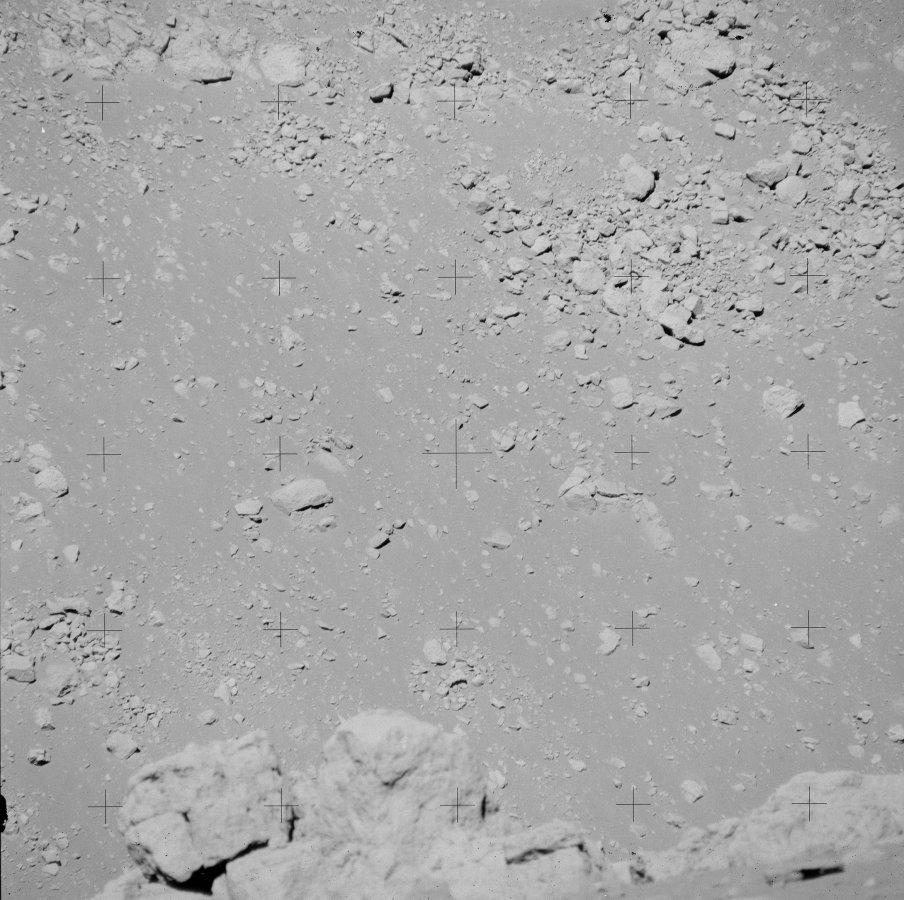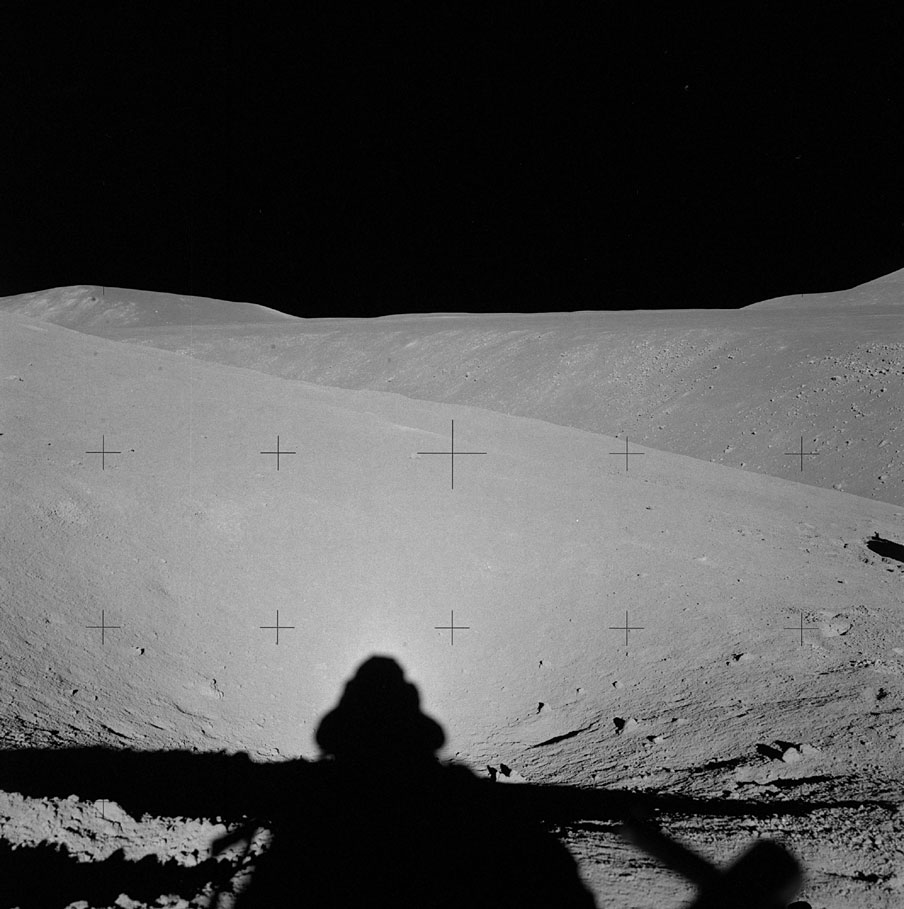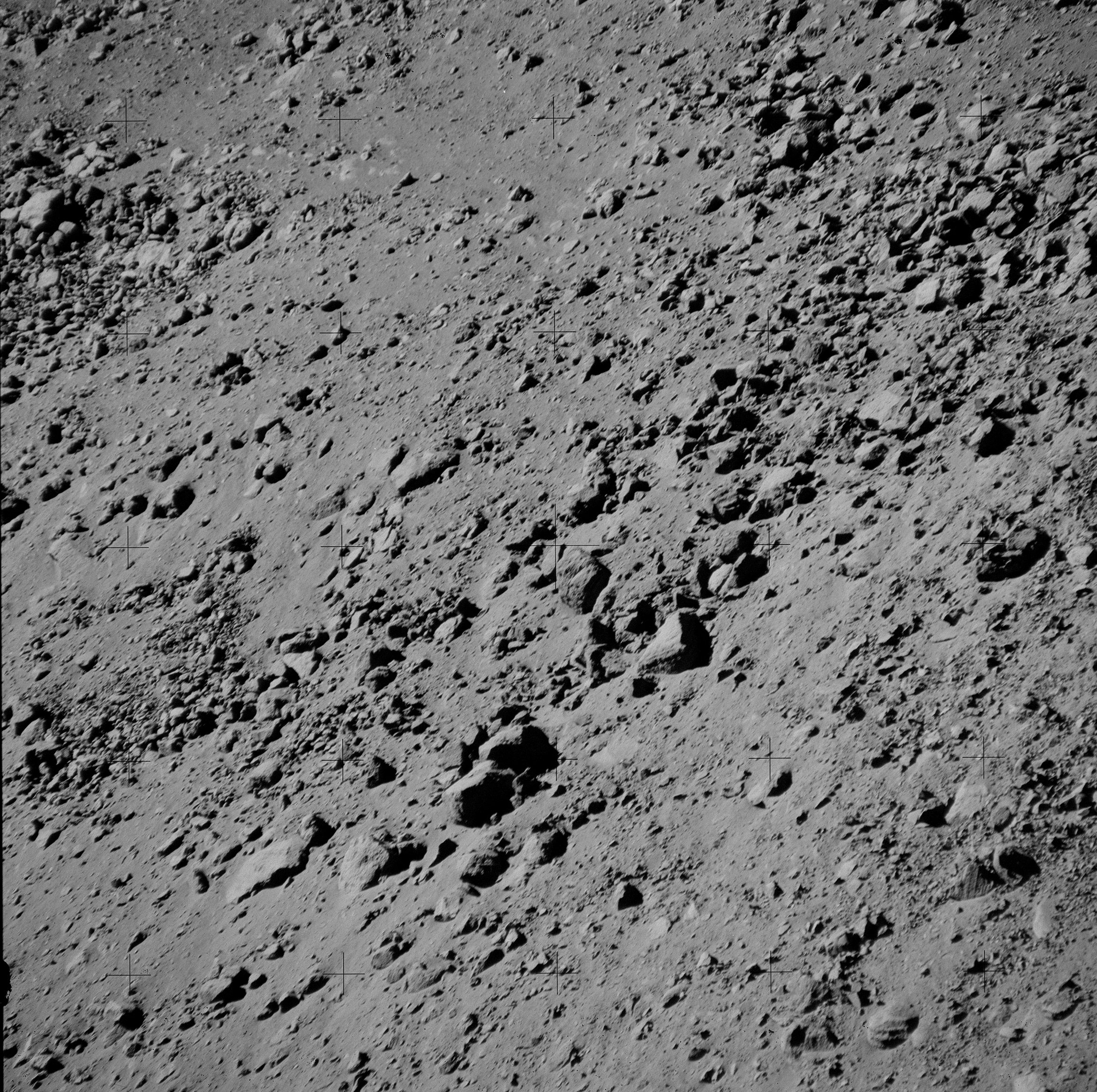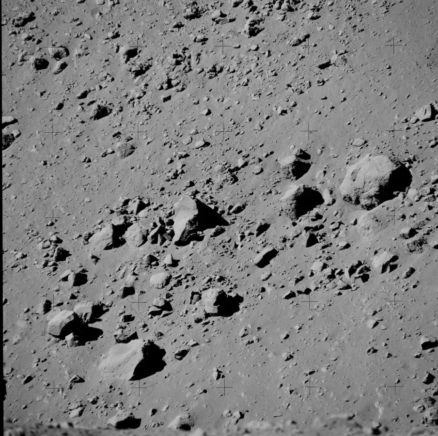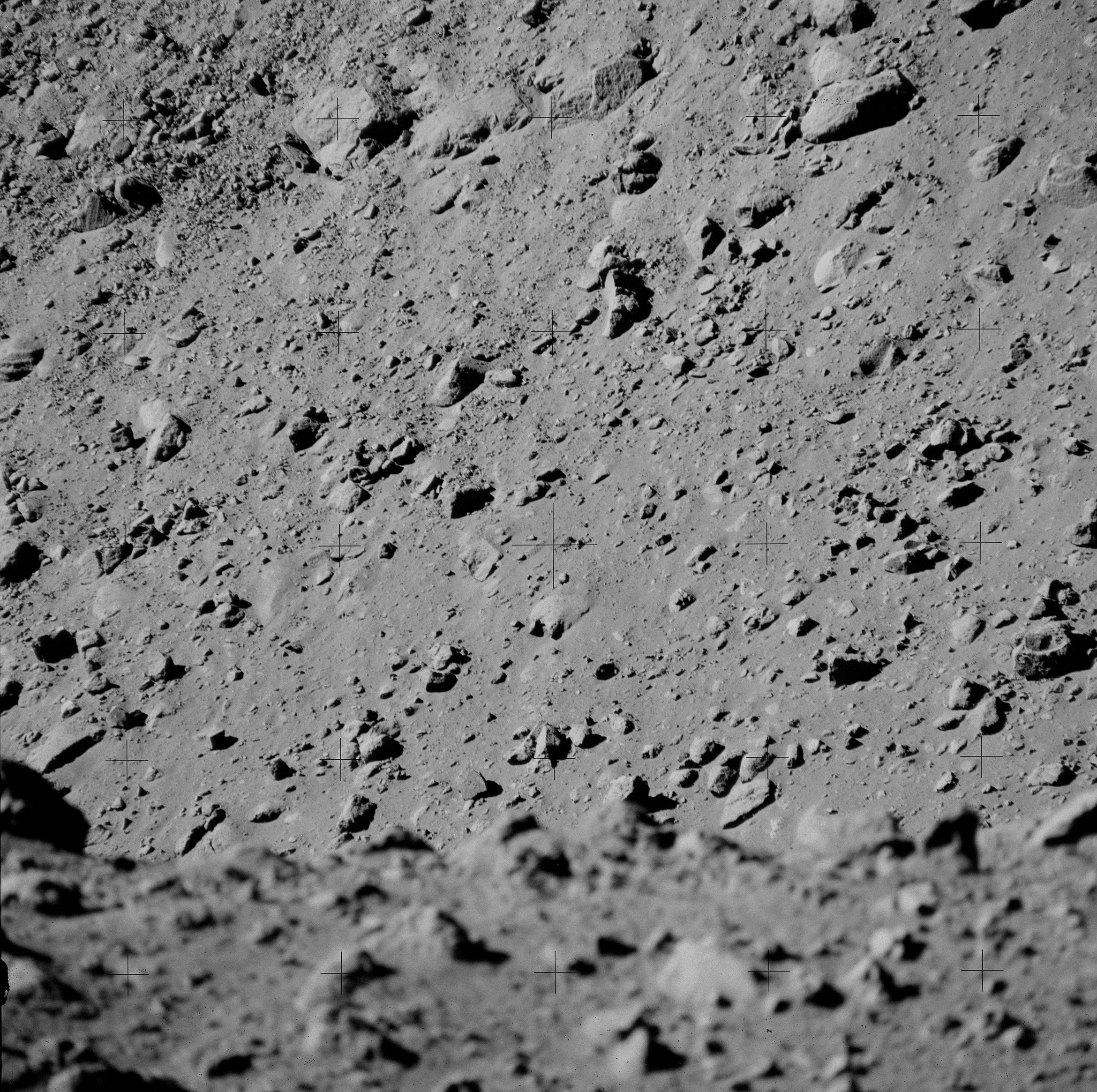 These two images of the landing site were taken during the Rev. 16 pass. The vertical exaggeration is about a factor of five. The images were downloaded from Arizona State University's Apollo Image Archive and cleaned to remove the effects of dust-specks. Anaglyph created by Eric Nelson.Rev 23 Mapping (Metric) Camera Frame 0854 ( 13 Mb )