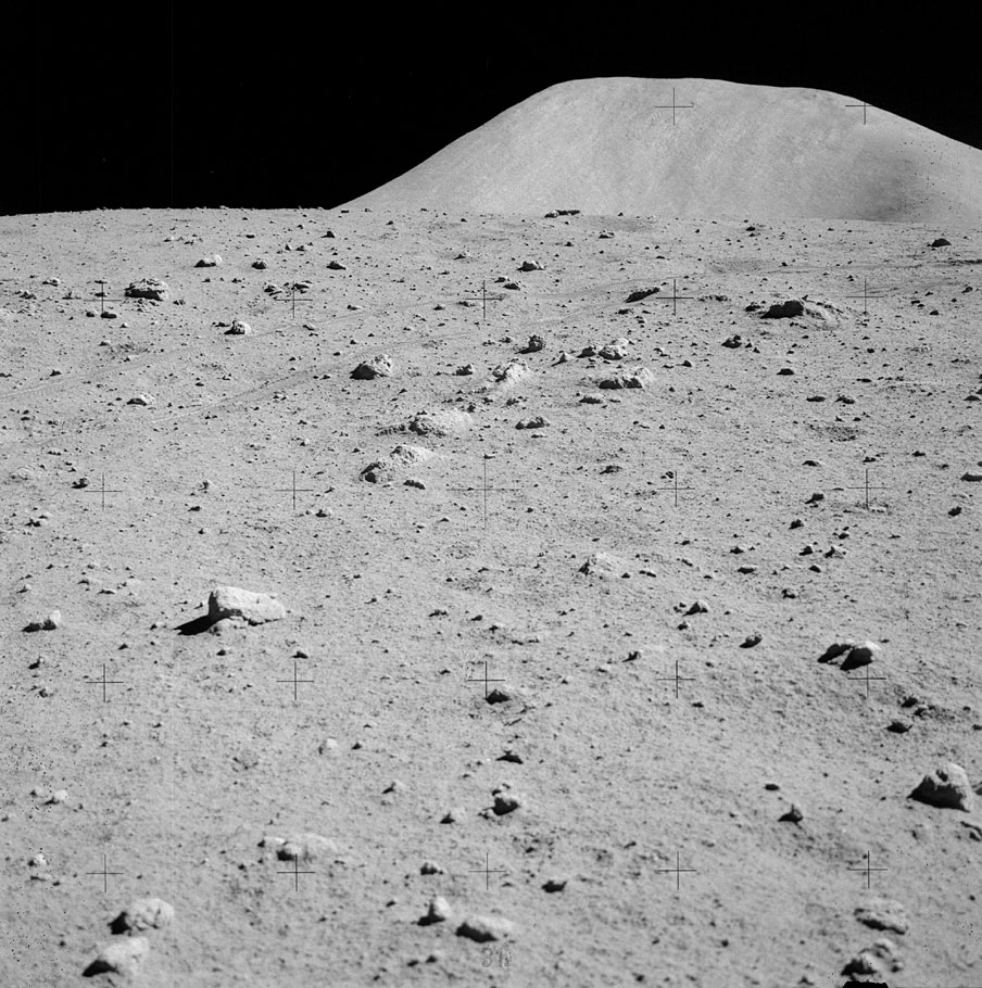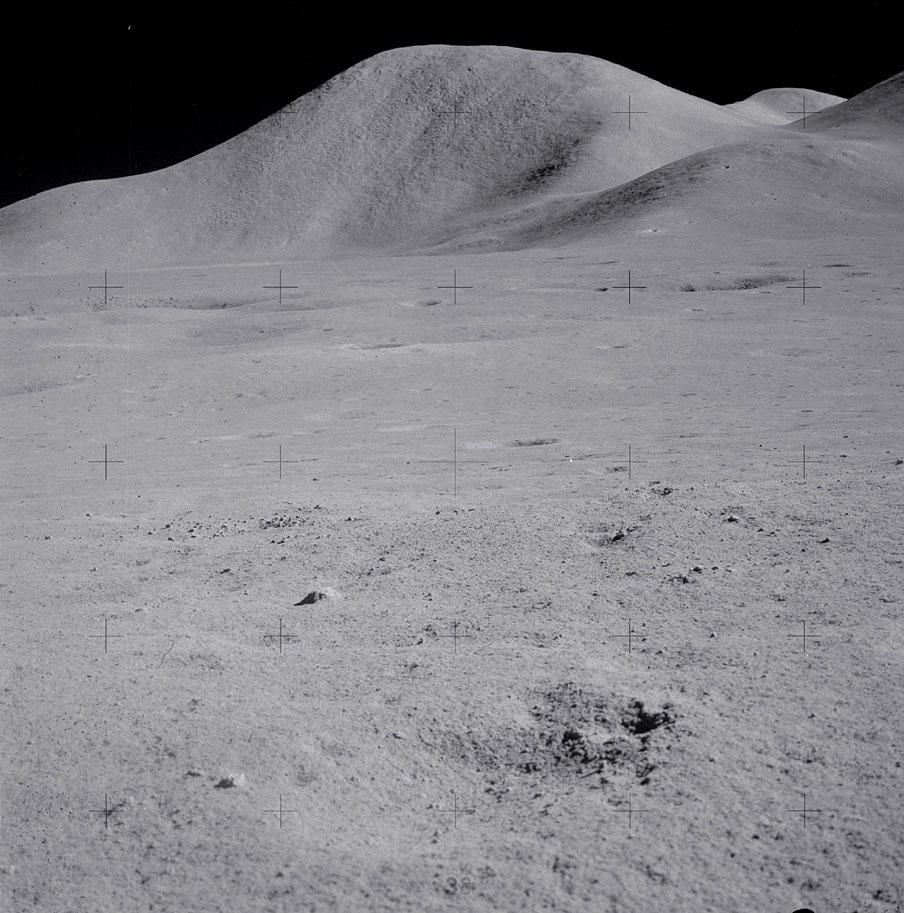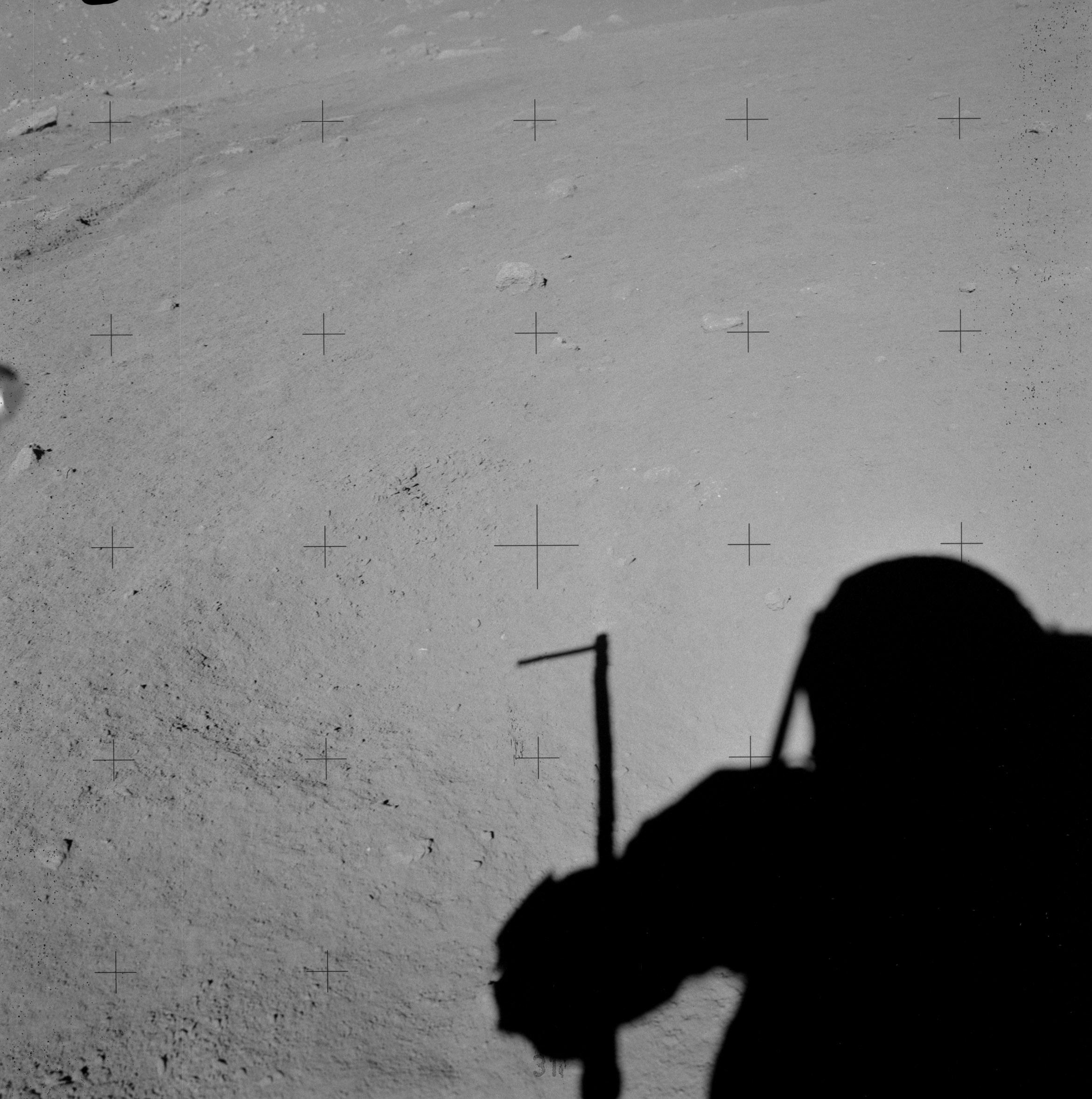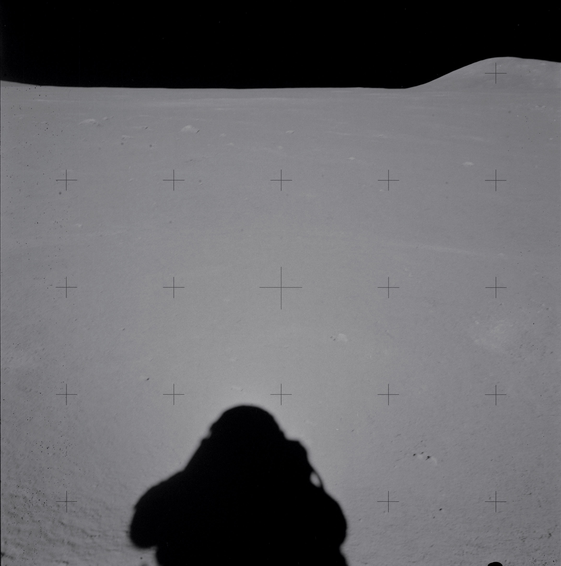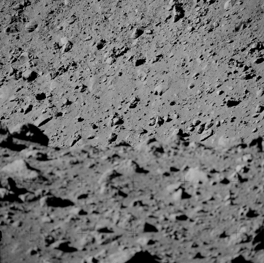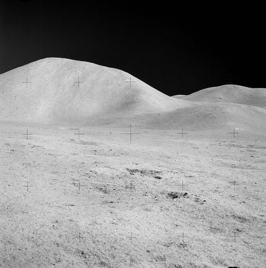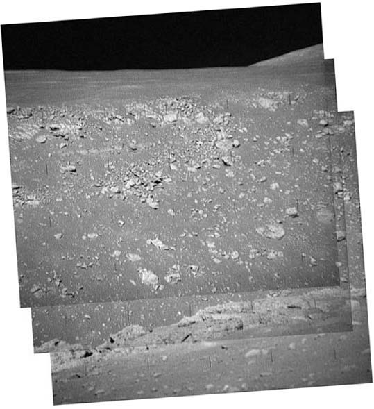 These two images of the landing site were taken during the Rev. 16 pass. The vertical exaggeration is about a factor of five. The images were downloaded from Arizona State University's Apollo Image Archive and cleaned to remove the effects of dust-specks. Anaglyph created by Eric Nelson.Rev 23 Mapping (Metric) Camera Frame 0854 ( 13 Mb )