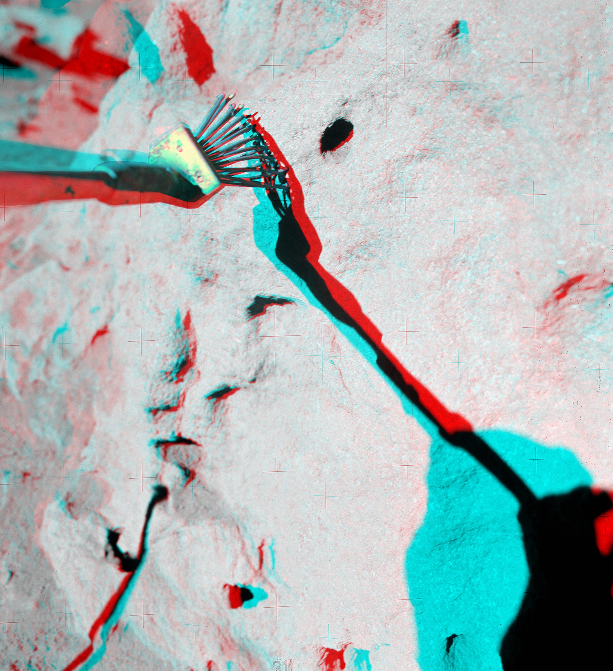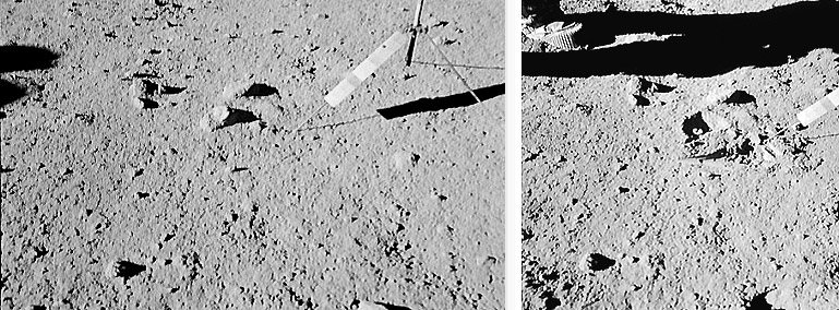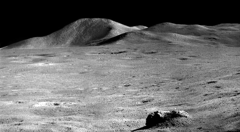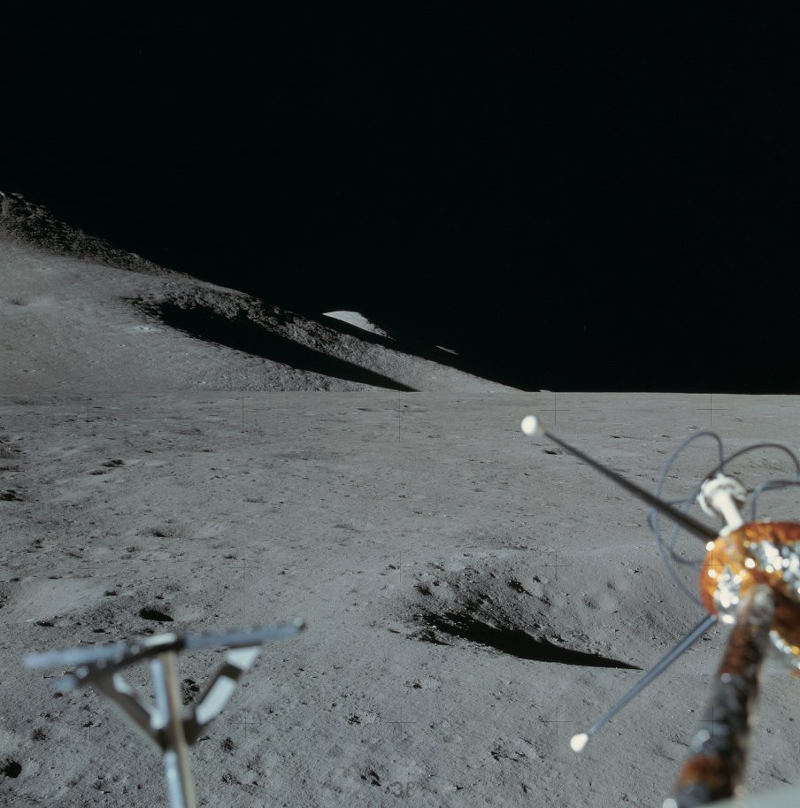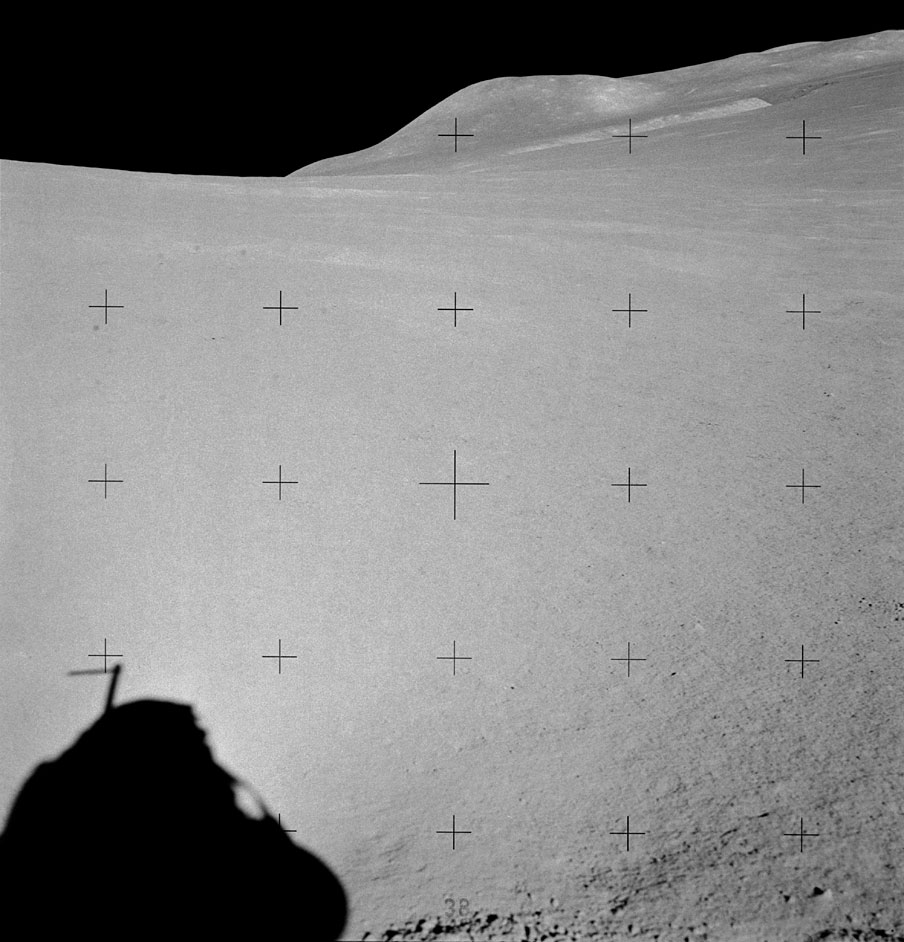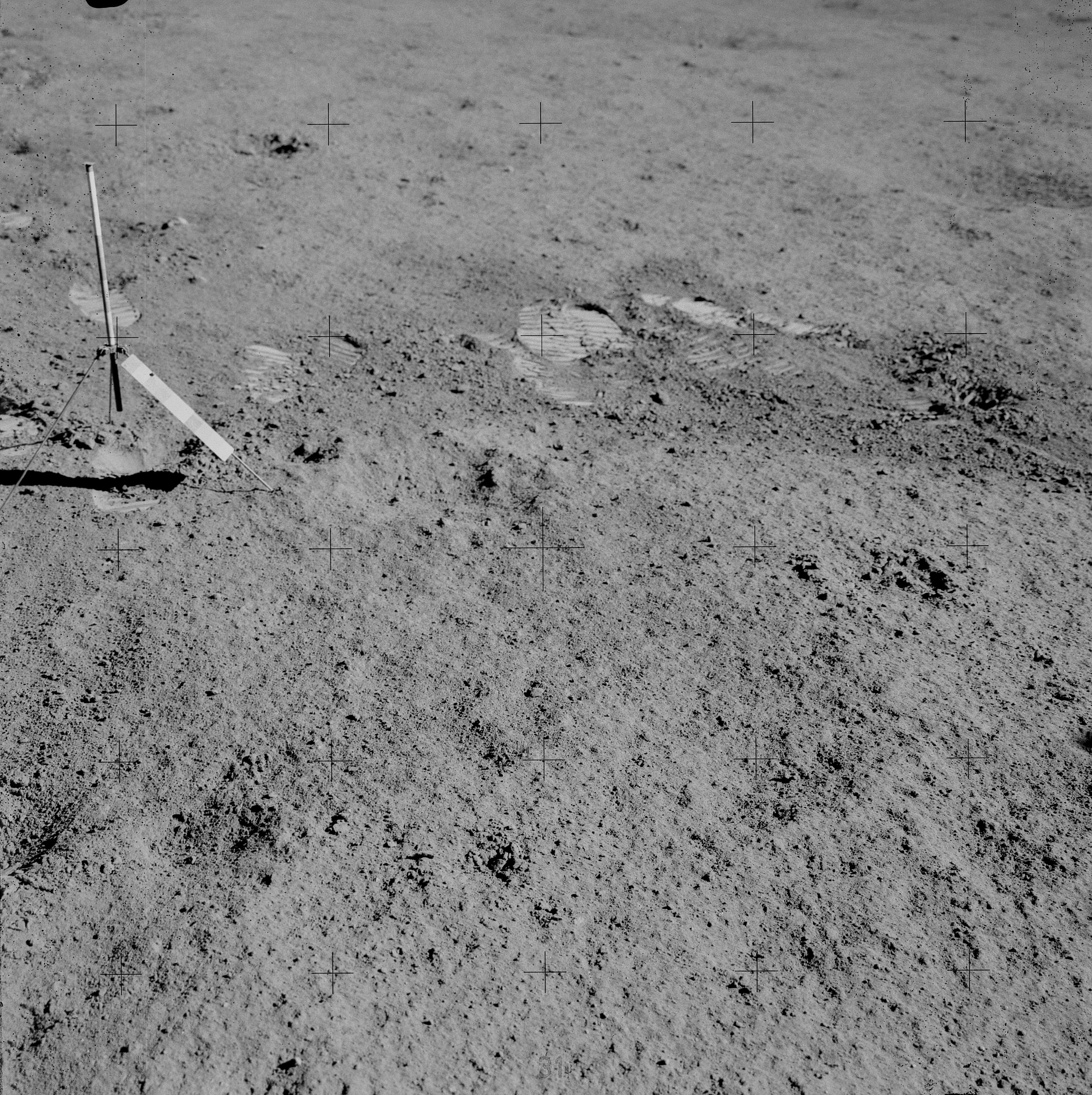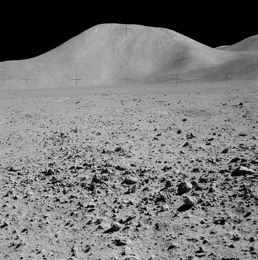 These two images of the landing site were taken during the Rev. 16 pass. The vertical exaggeration is about a factor of five. The images were downloaded from Arizona State University's Apollo Image Archive and cleaned to remove the effects of dust-specks. Anaglyph created by Eric Nelson.Rev 23 Mapping (Metric) Camera Frame 0854 ( 13 Mb )