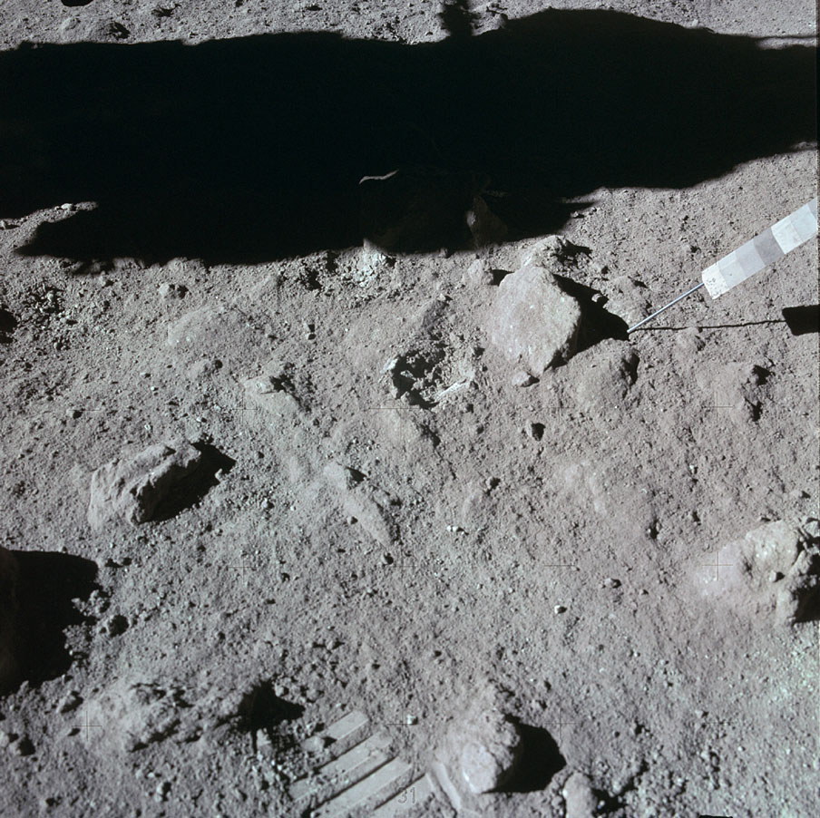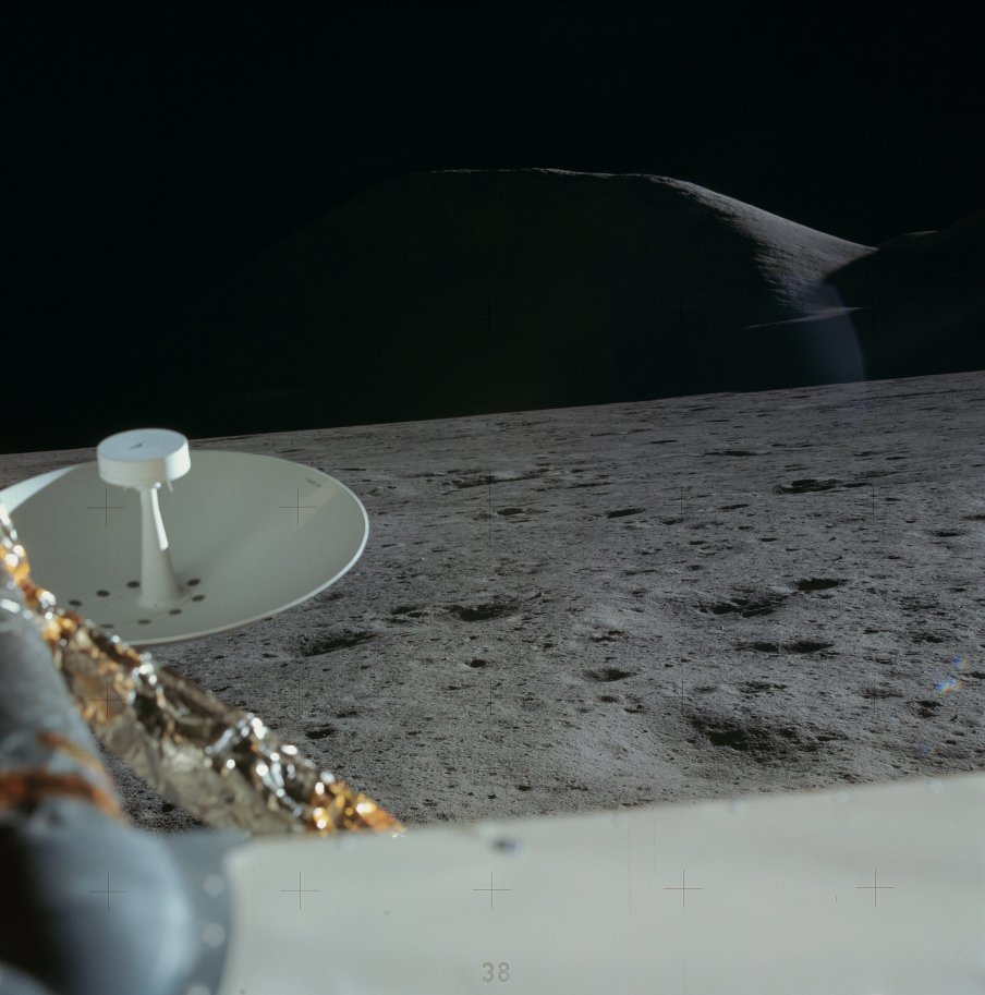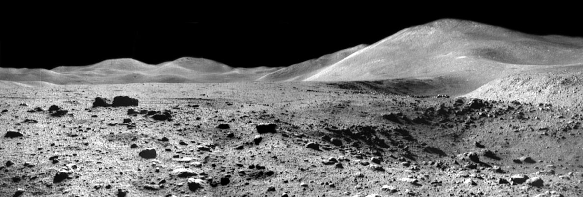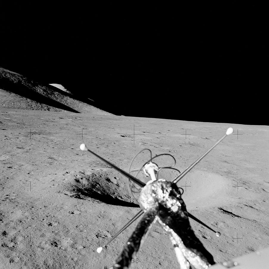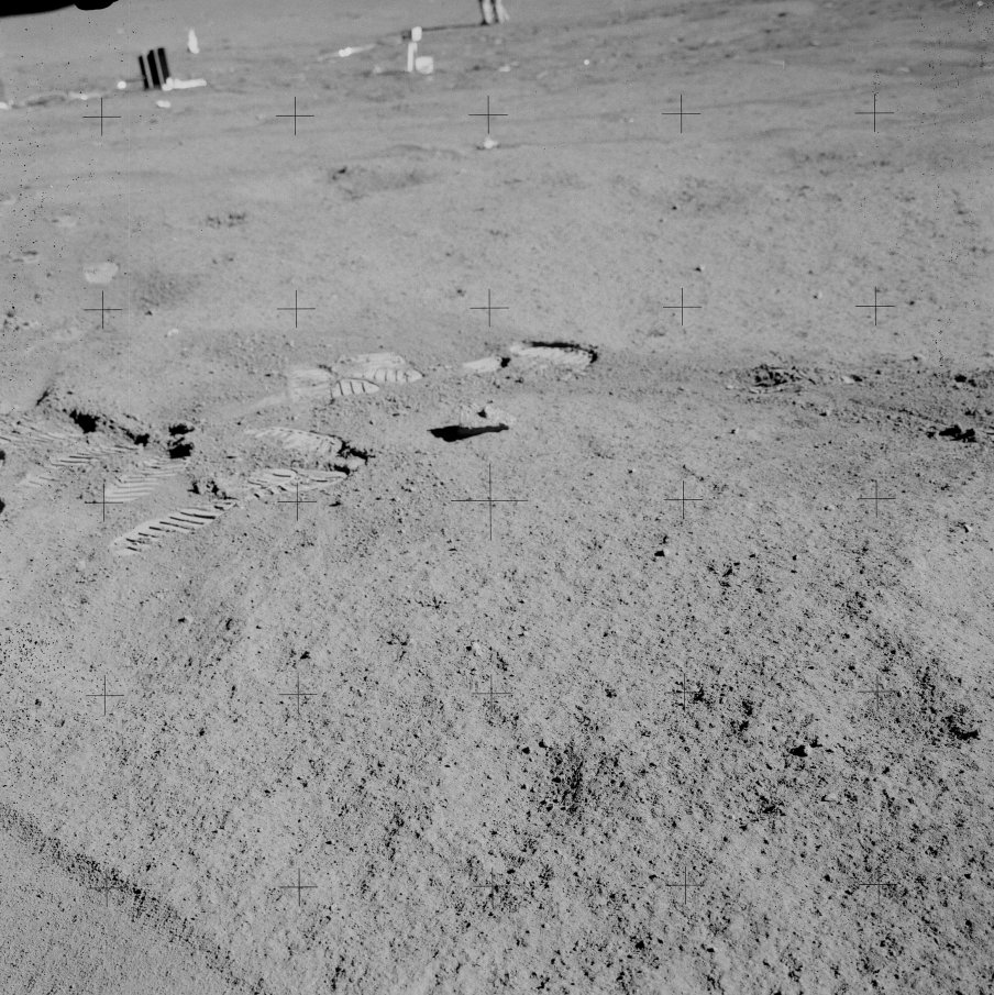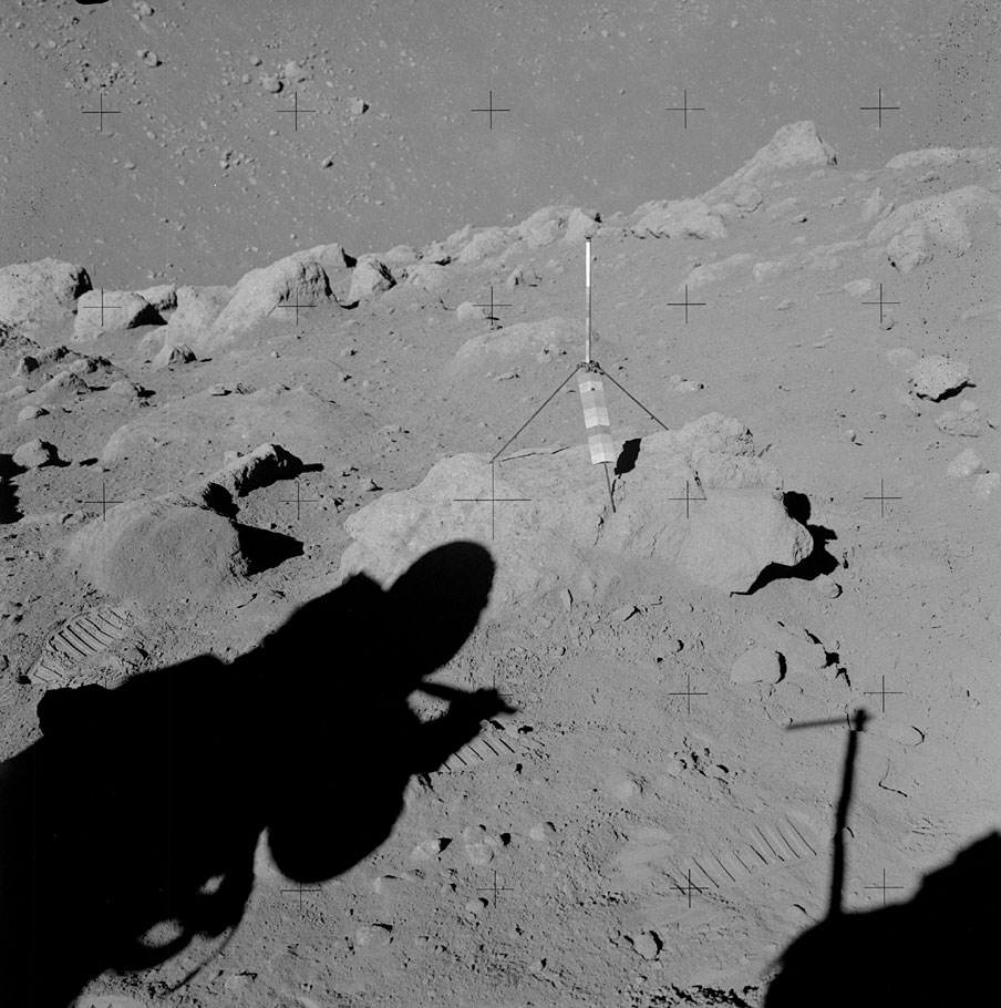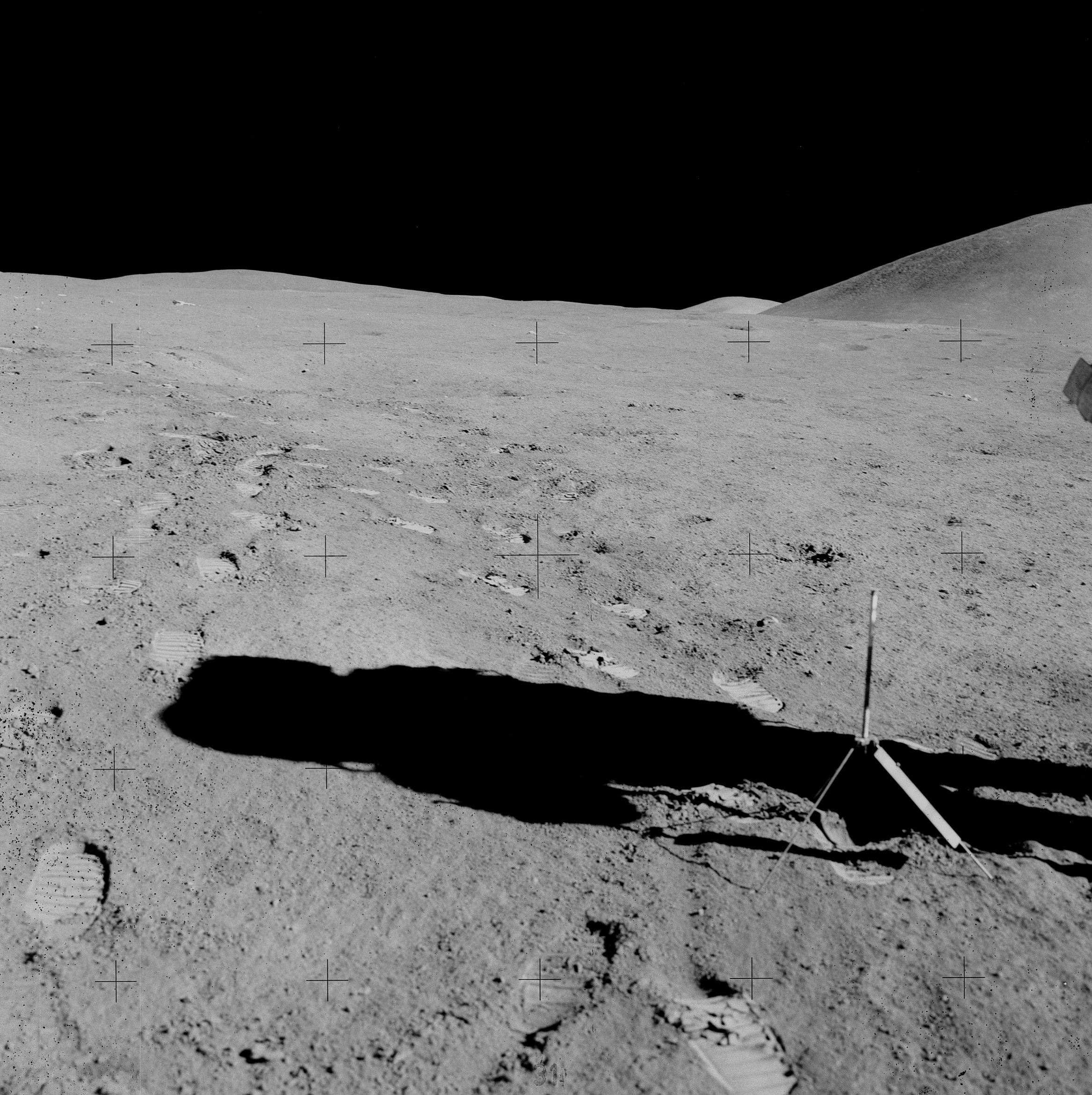 These two images of the landing site were taken during the Rev. 16 pass. The vertical exaggeration is about a factor of five. The images were downloaded from Arizona State University's Apollo Image Archive and cleaned to remove the effects of dust-specks. Anaglyph created by Eric Nelson.Rev 23 Mapping (Metric) Camera Frame 0854 ( 13 Mb )
