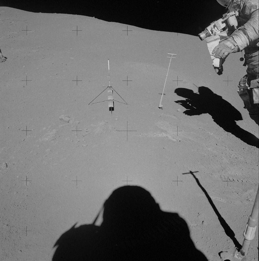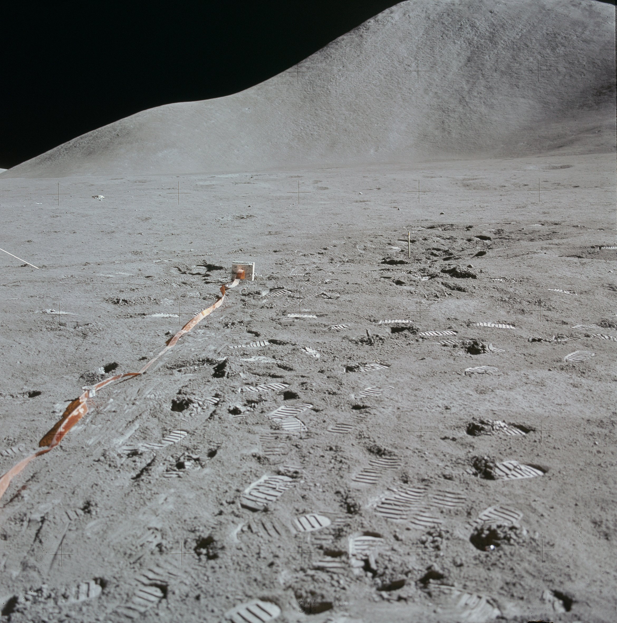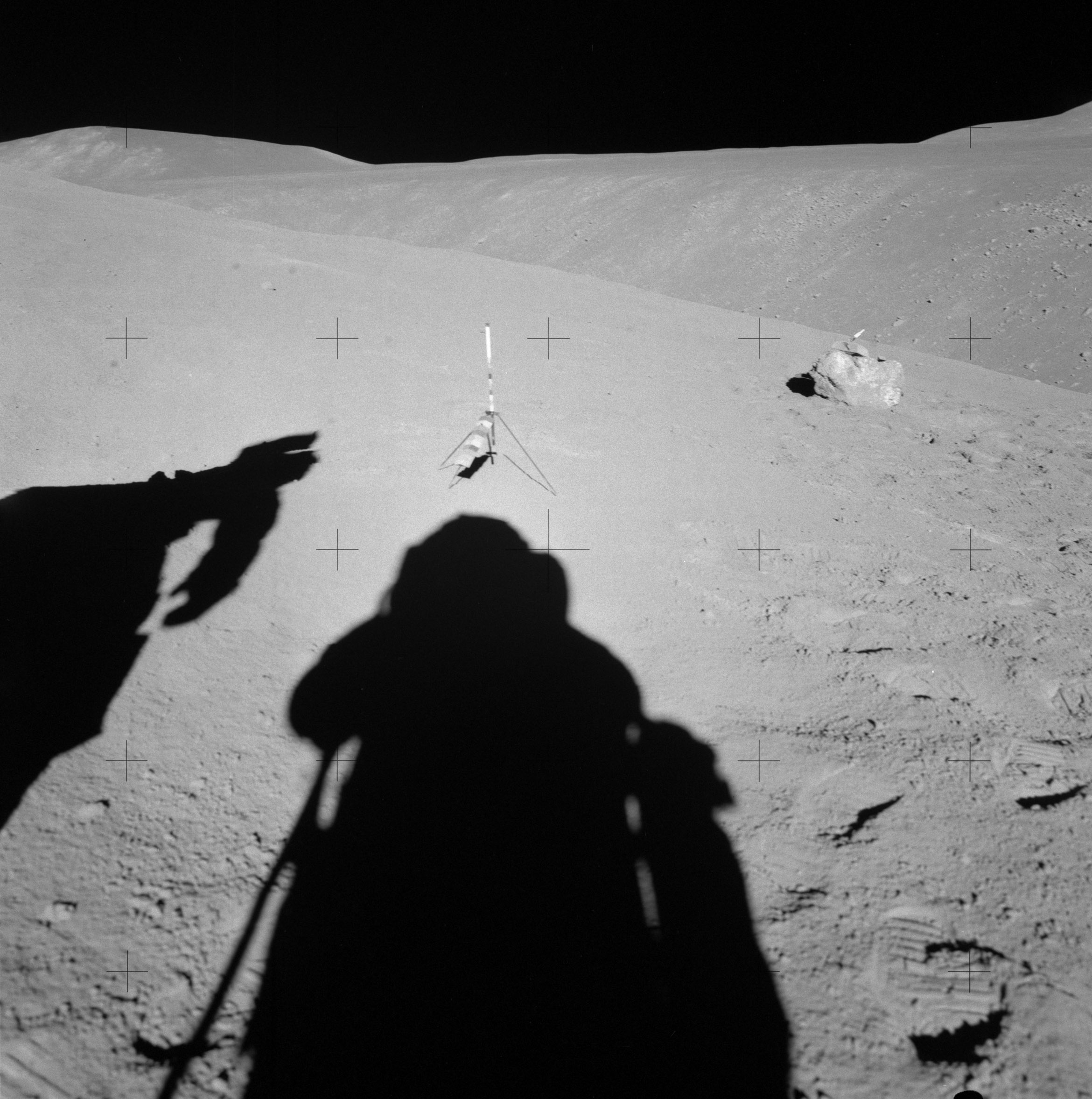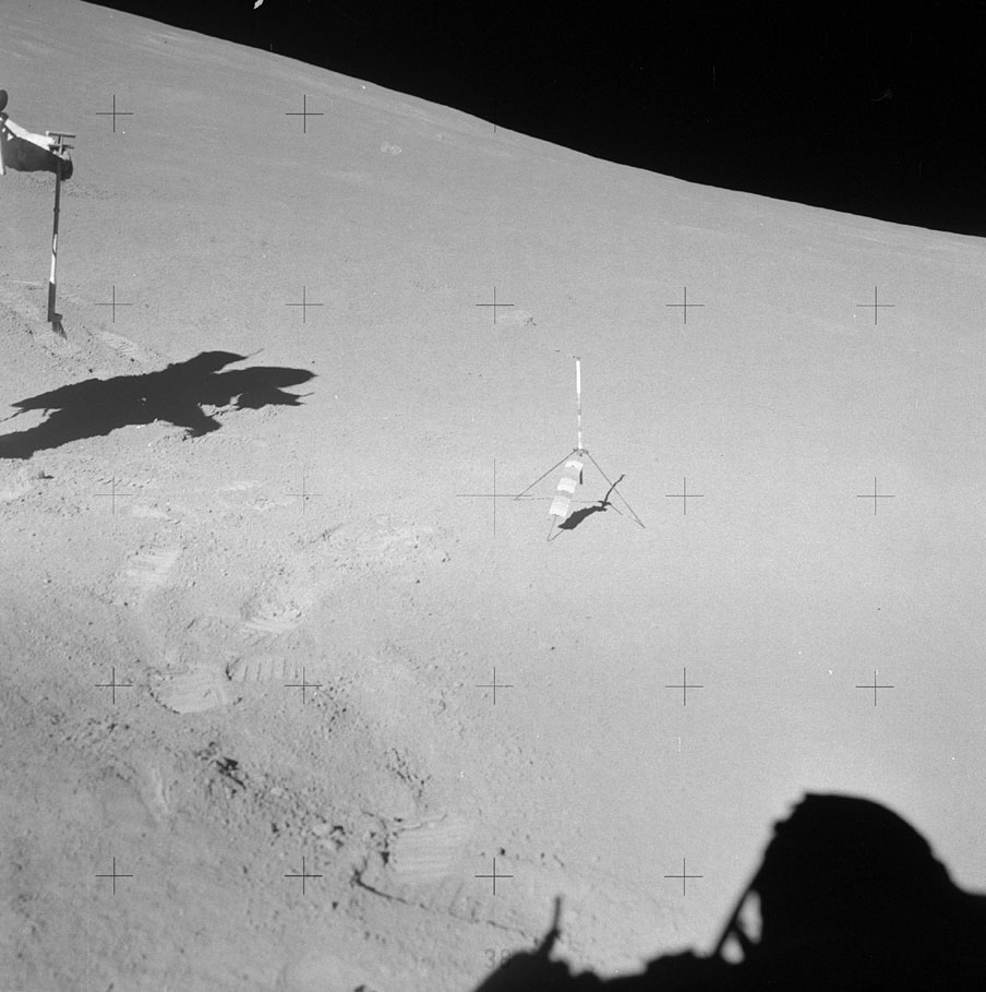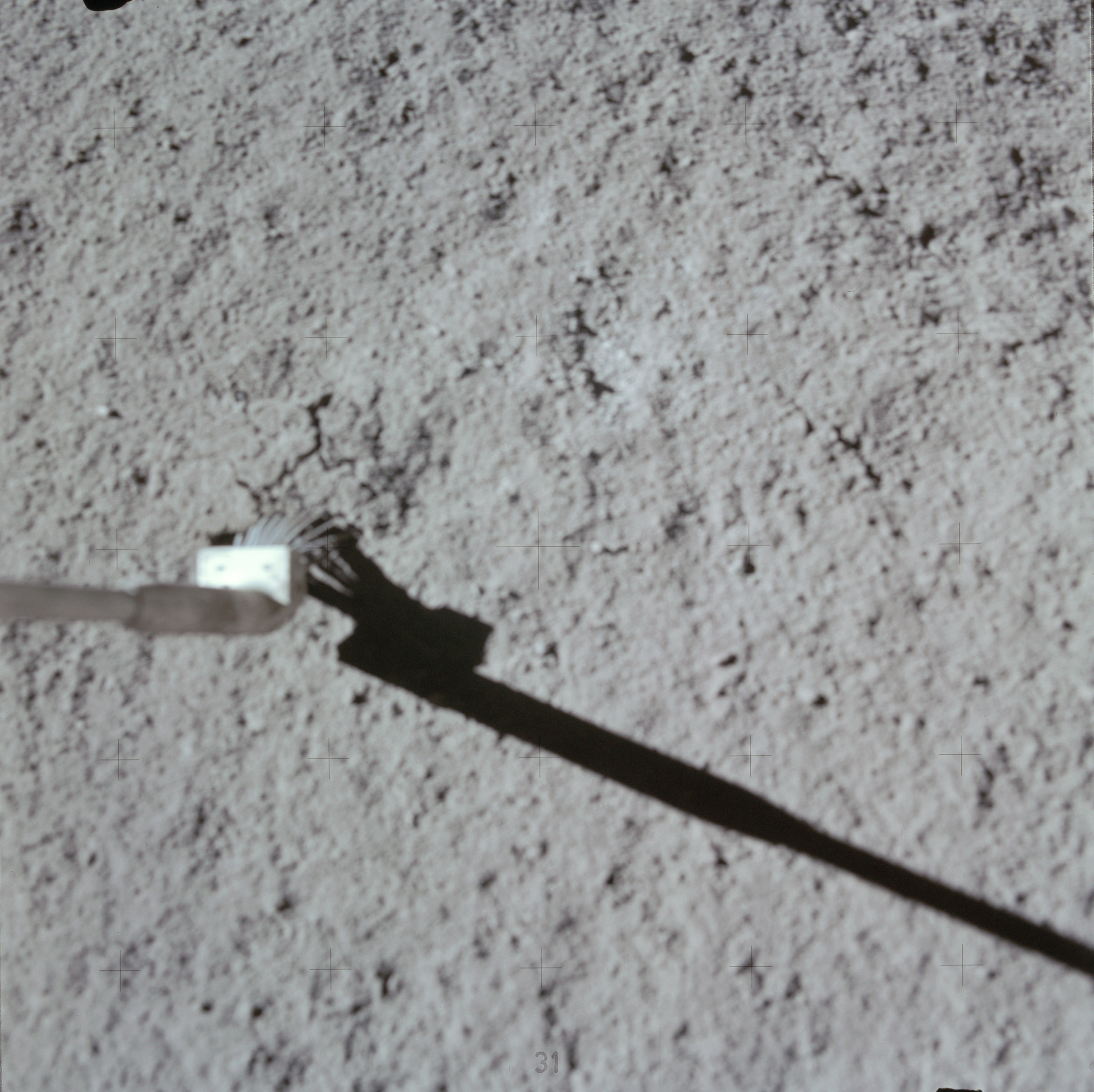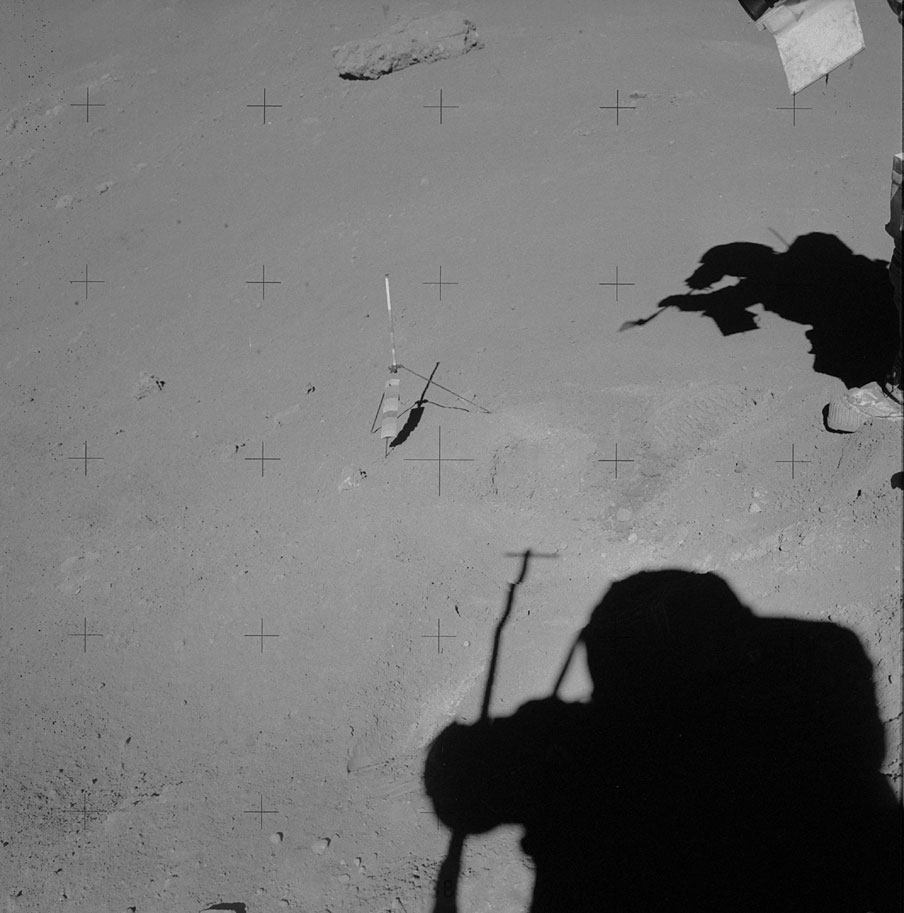 These two images of the landing site were taken during the Rev. 16 pass. The vertical exaggeration is about a factor of five. The images were downloaded from Arizona State University's Apollo Image Archive and cleaned to remove the effects of dust-specks. Anaglyph created by Eric Nelson.Rev 23 Mapping (Metric) Camera Frame 0854 ( 13 Mb )