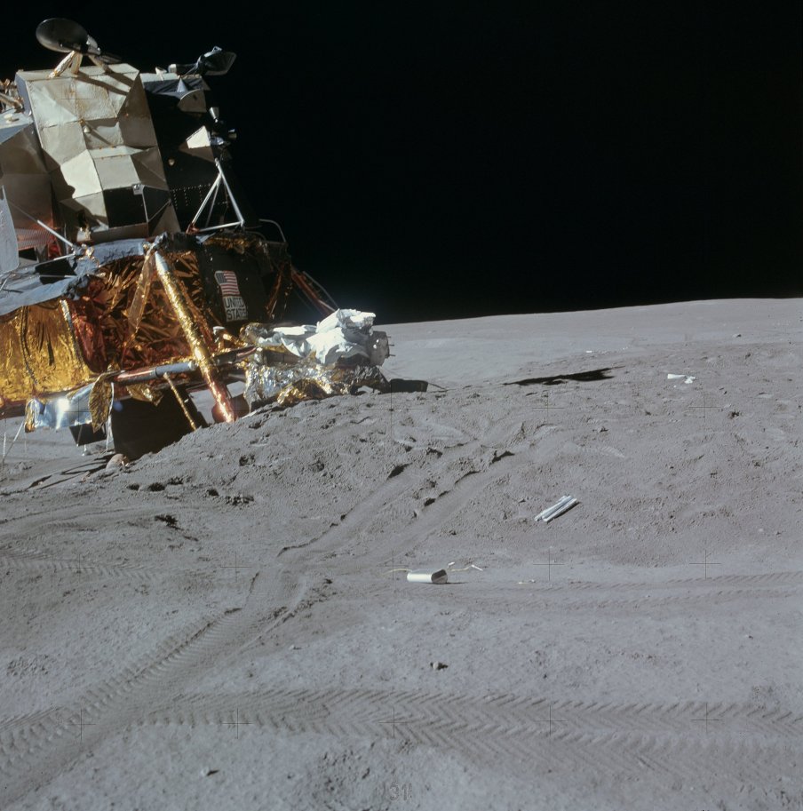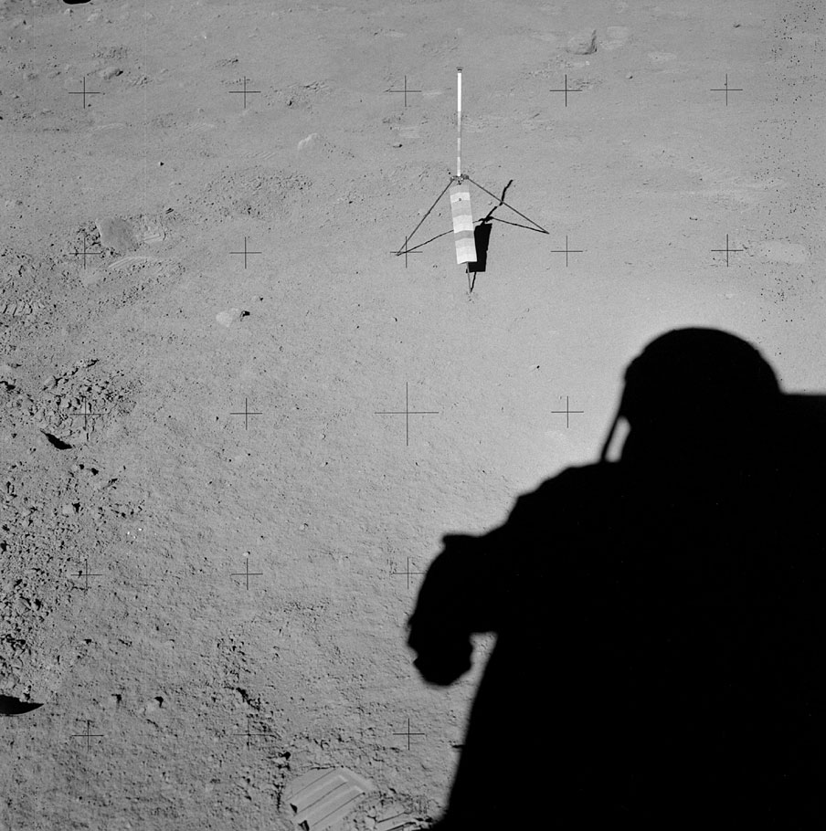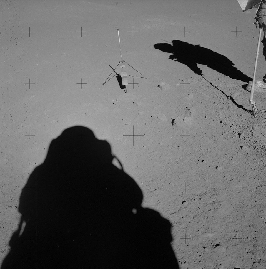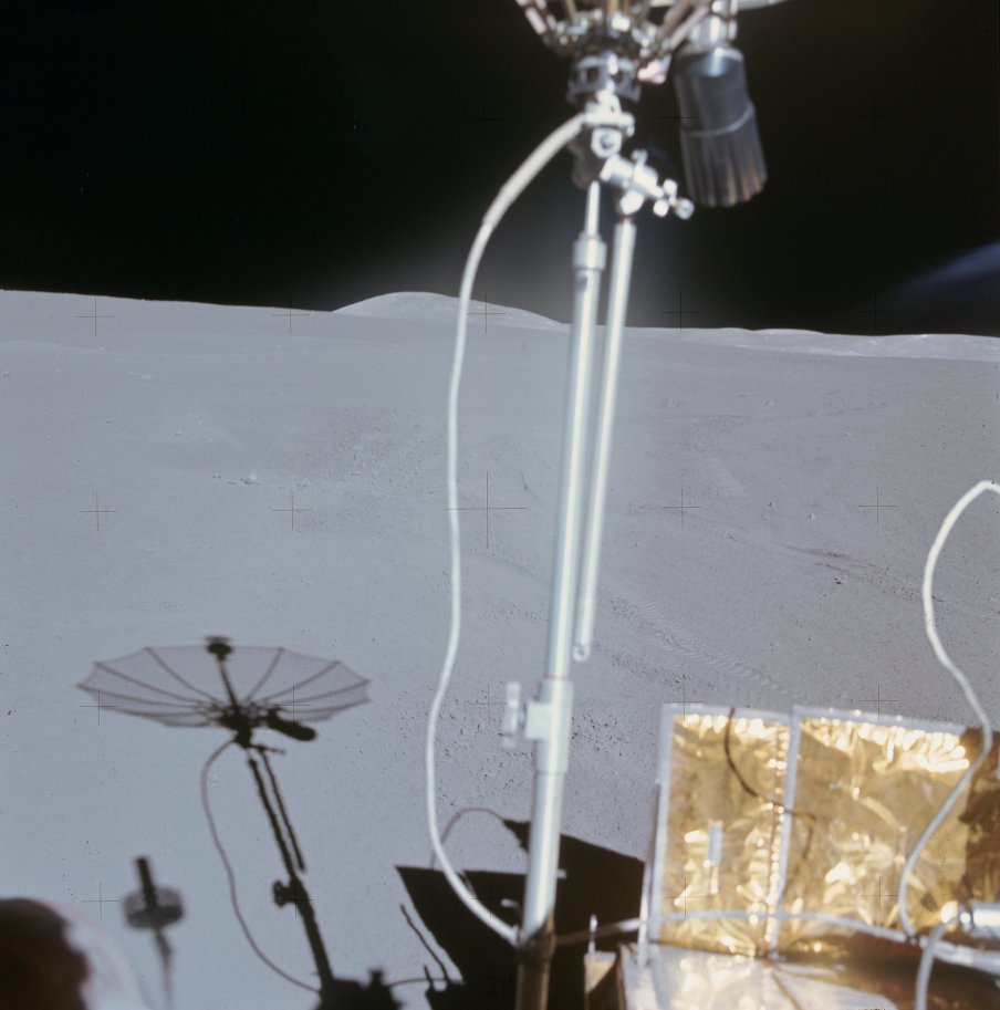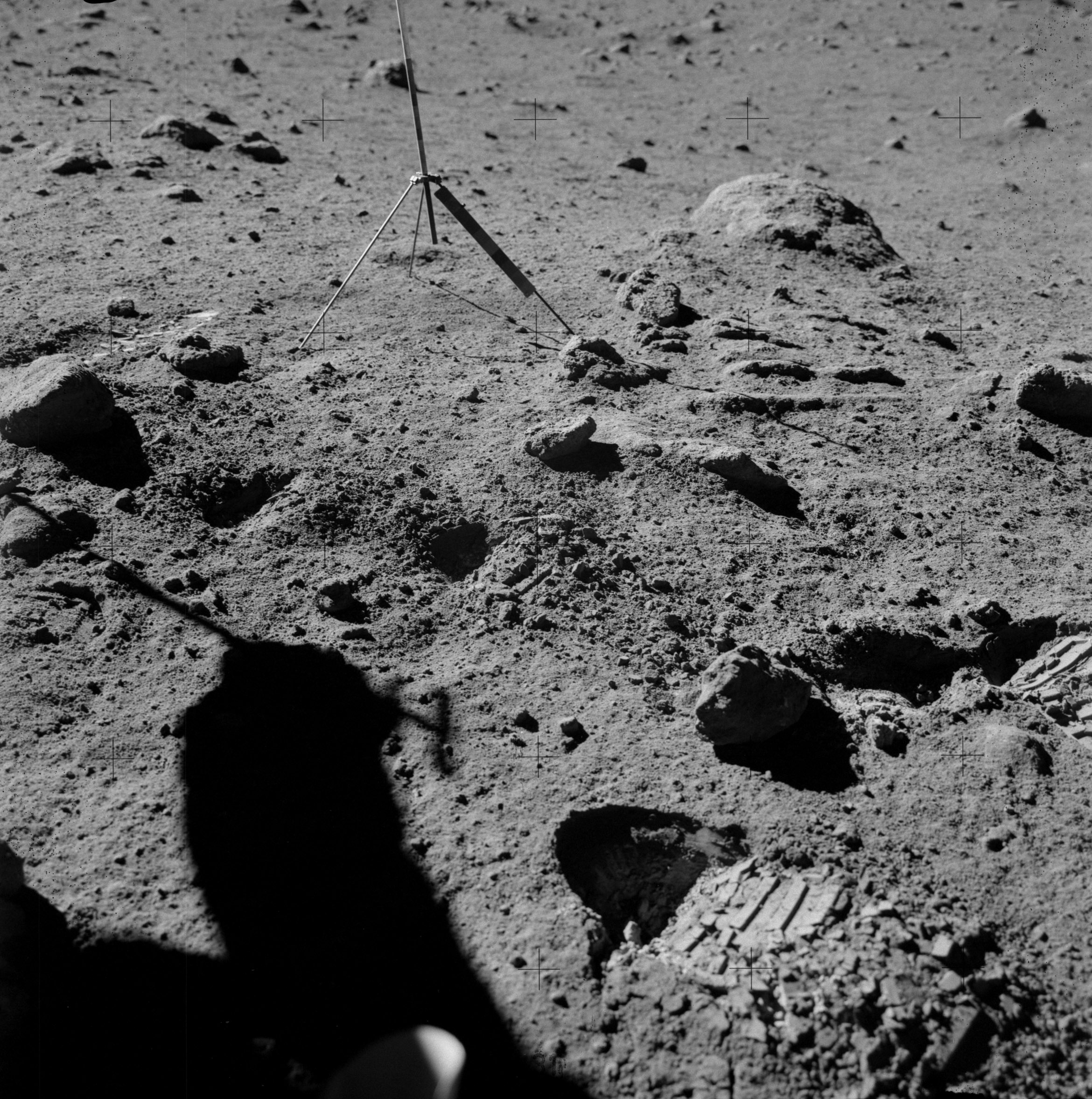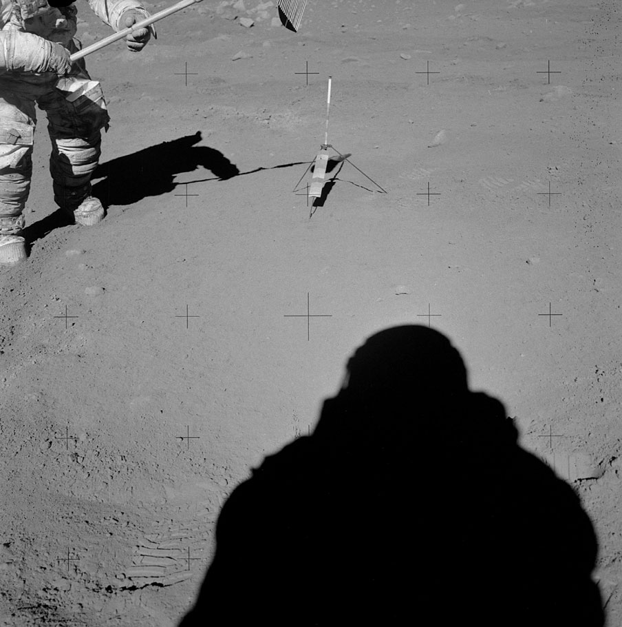 These two images of the landing site were taken during the Rev. 16 pass. The vertical exaggeration is about a factor of five. The images were downloaded from Arizona State University's Apollo Image Archive and cleaned to remove the effects of dust-specks. Anaglyph created by Eric Nelson.Rev 23 Mapping (Metric) Camera Frame 0854 ( 13 Mb )