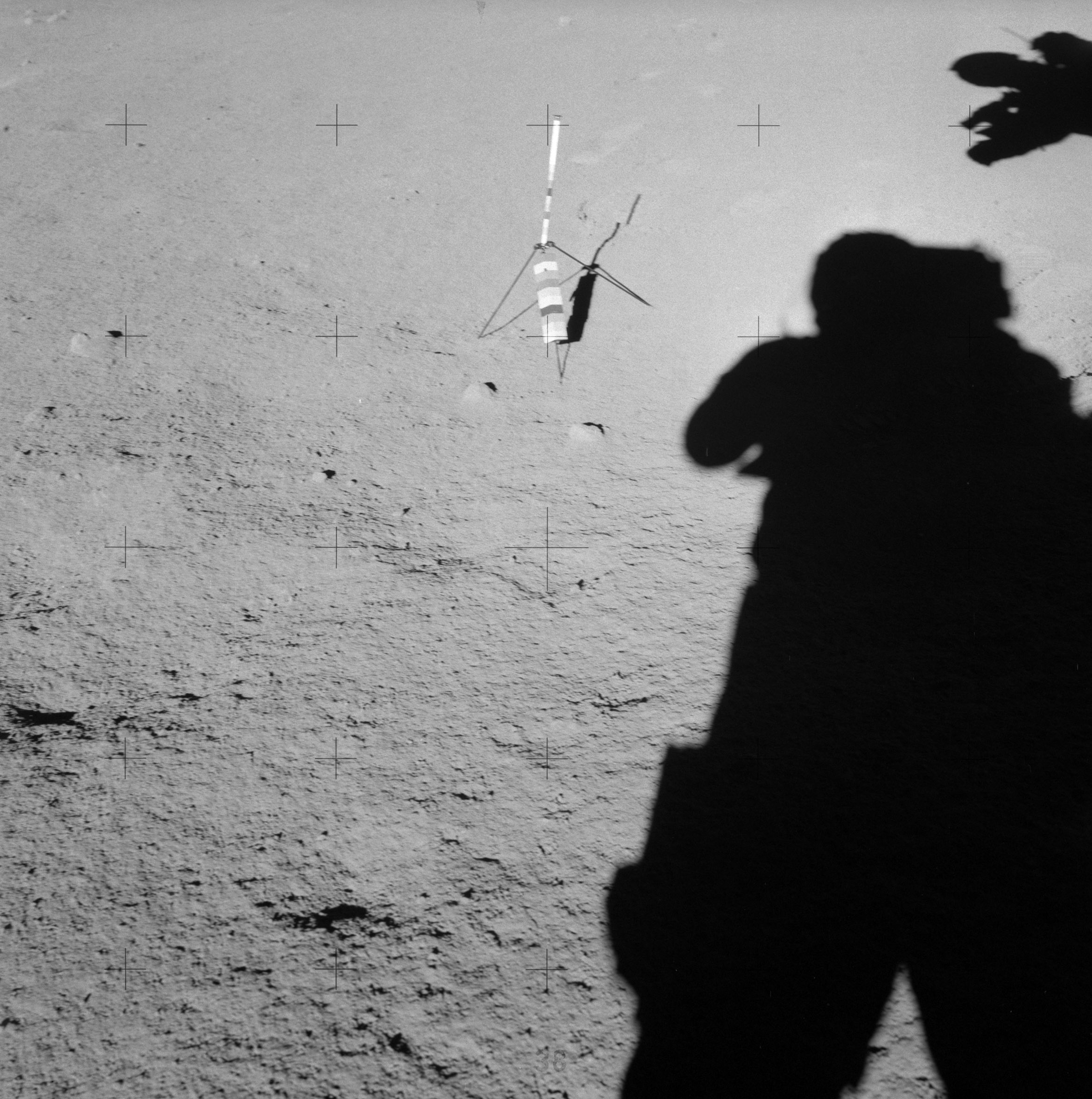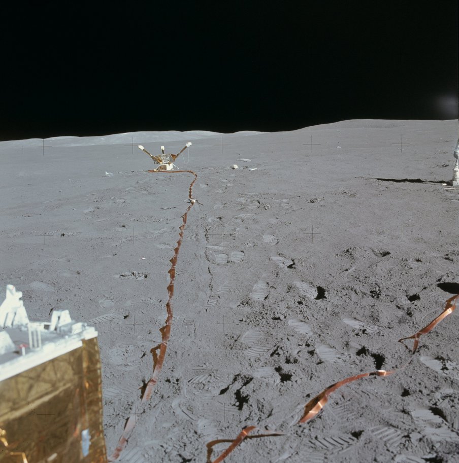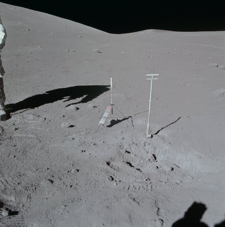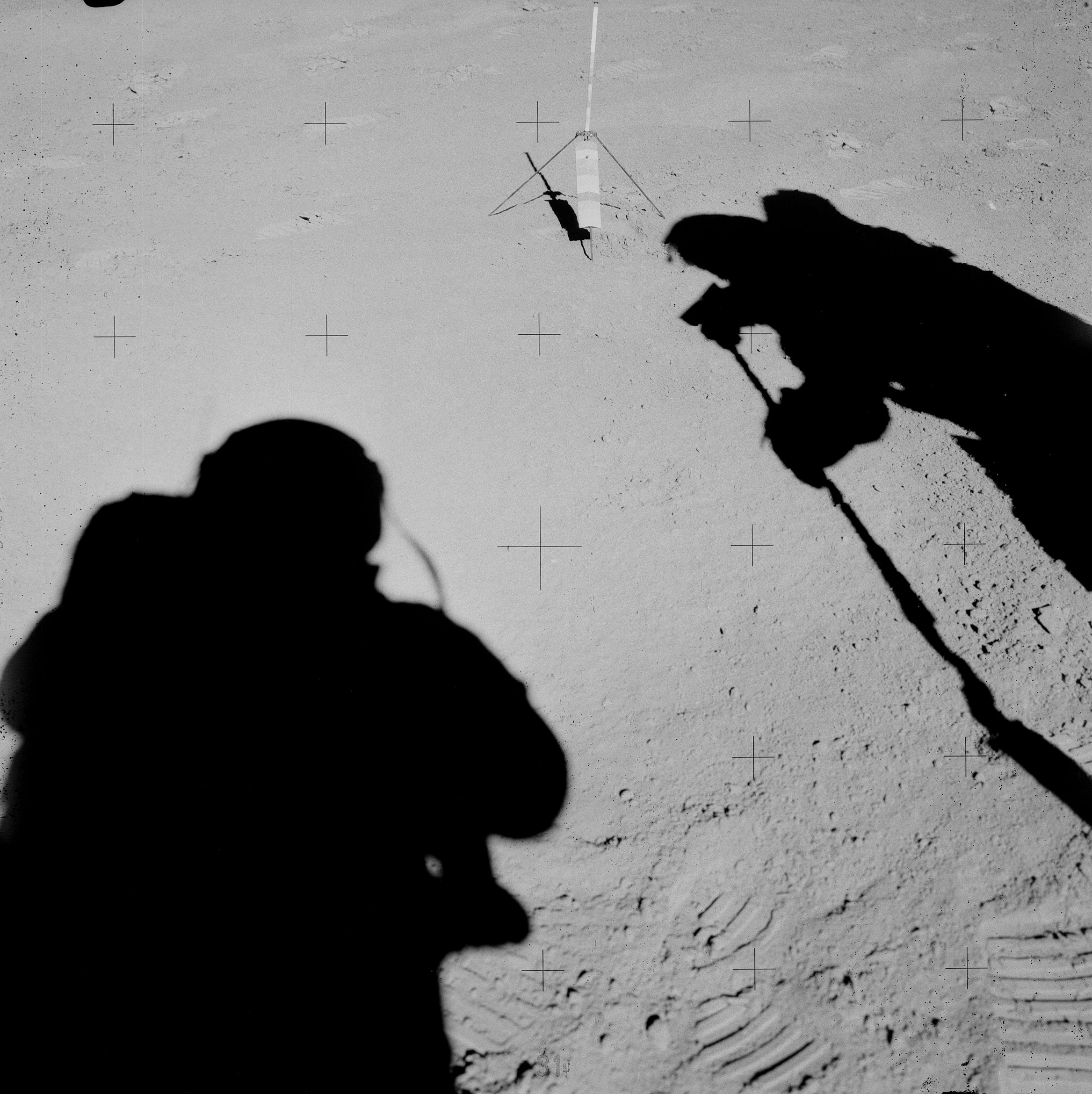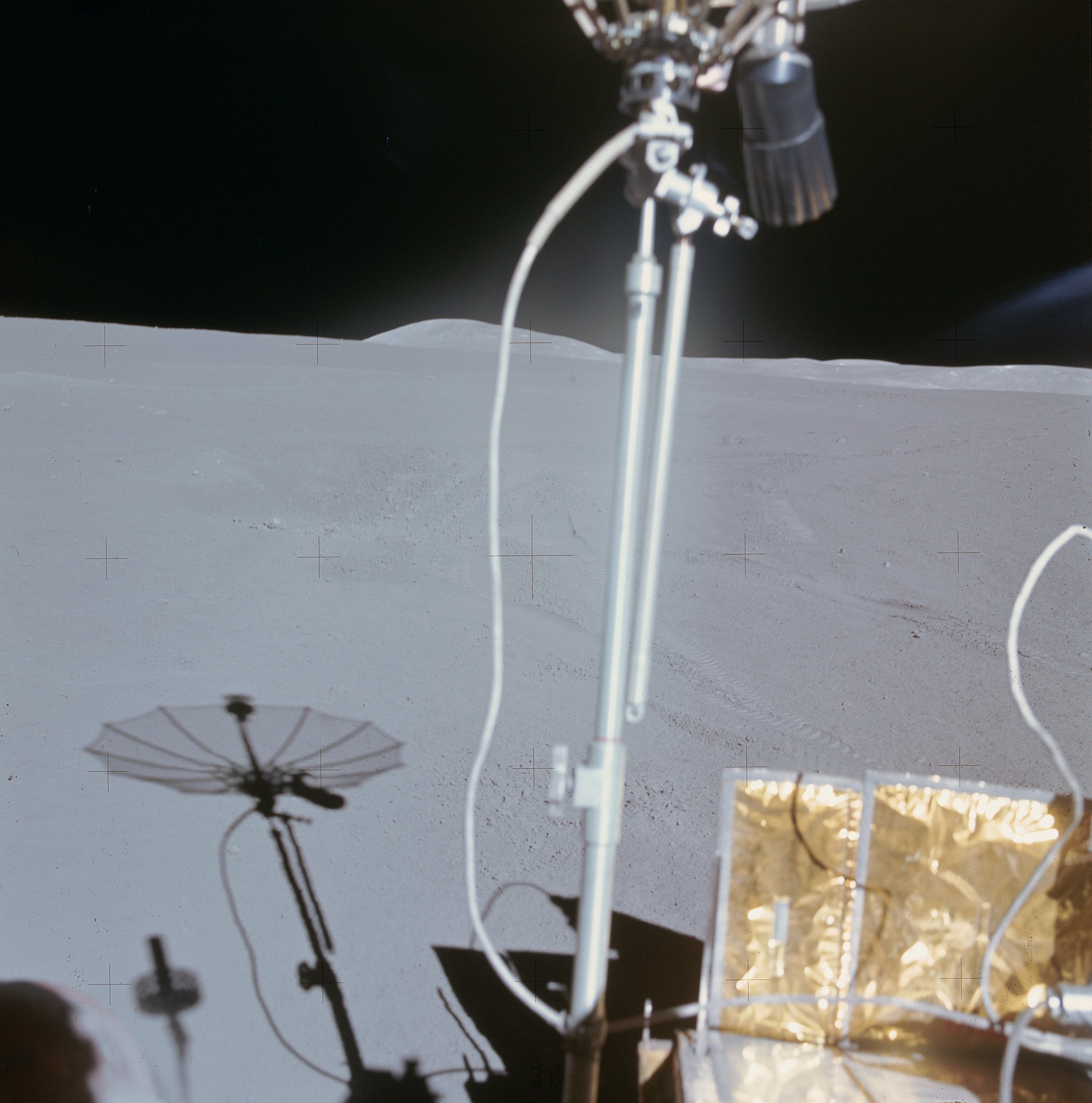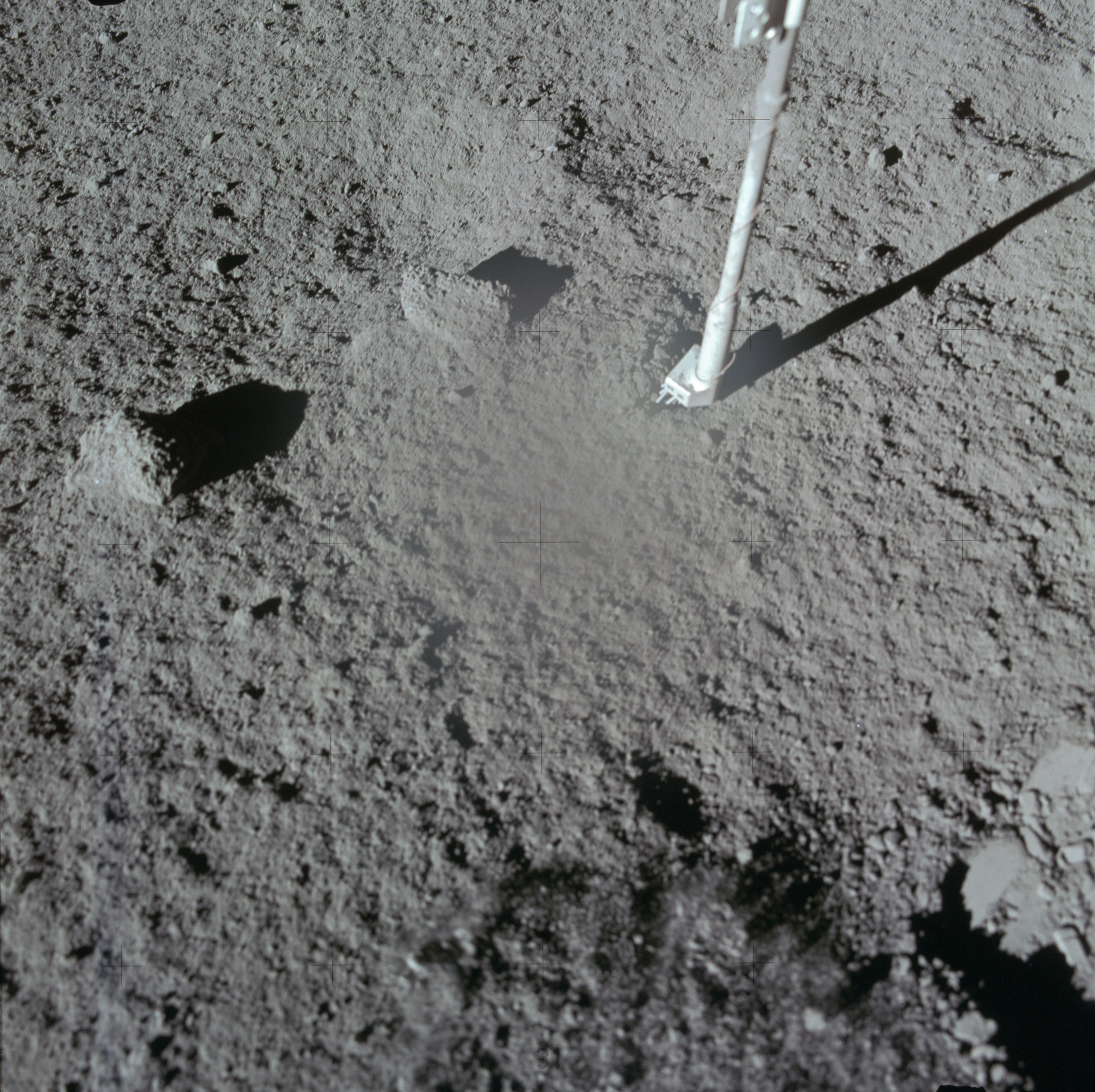 These two images of the landing site were taken during the Rev. 16 pass. The vertical exaggeration is about a factor of five. The images were downloaded from Arizona State University's Apollo Image Archive and cleaned to remove the effects of dust-specks. Anaglyph created by Eric Nelson.Rev 23 Mapping (Metric) Camera Frame 0854 ( 13 Mb )