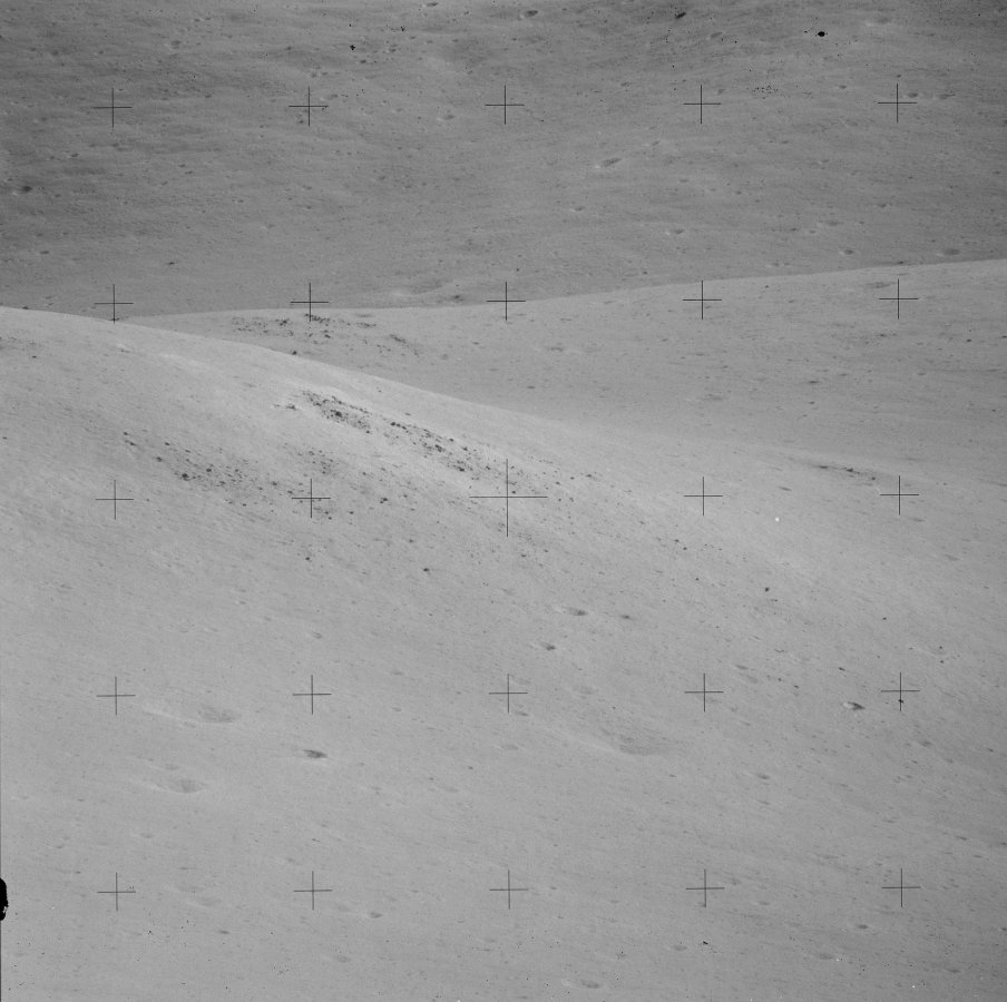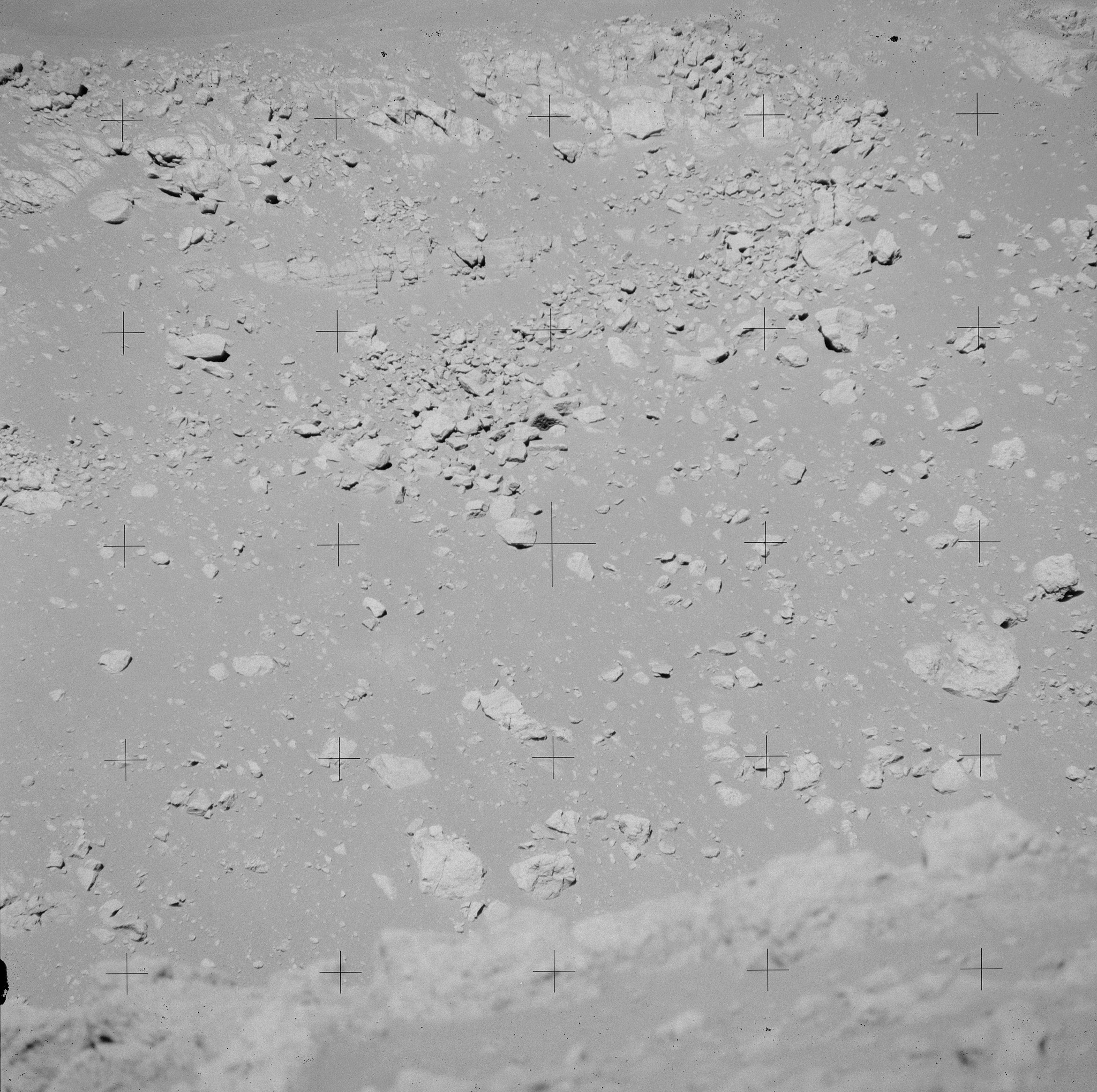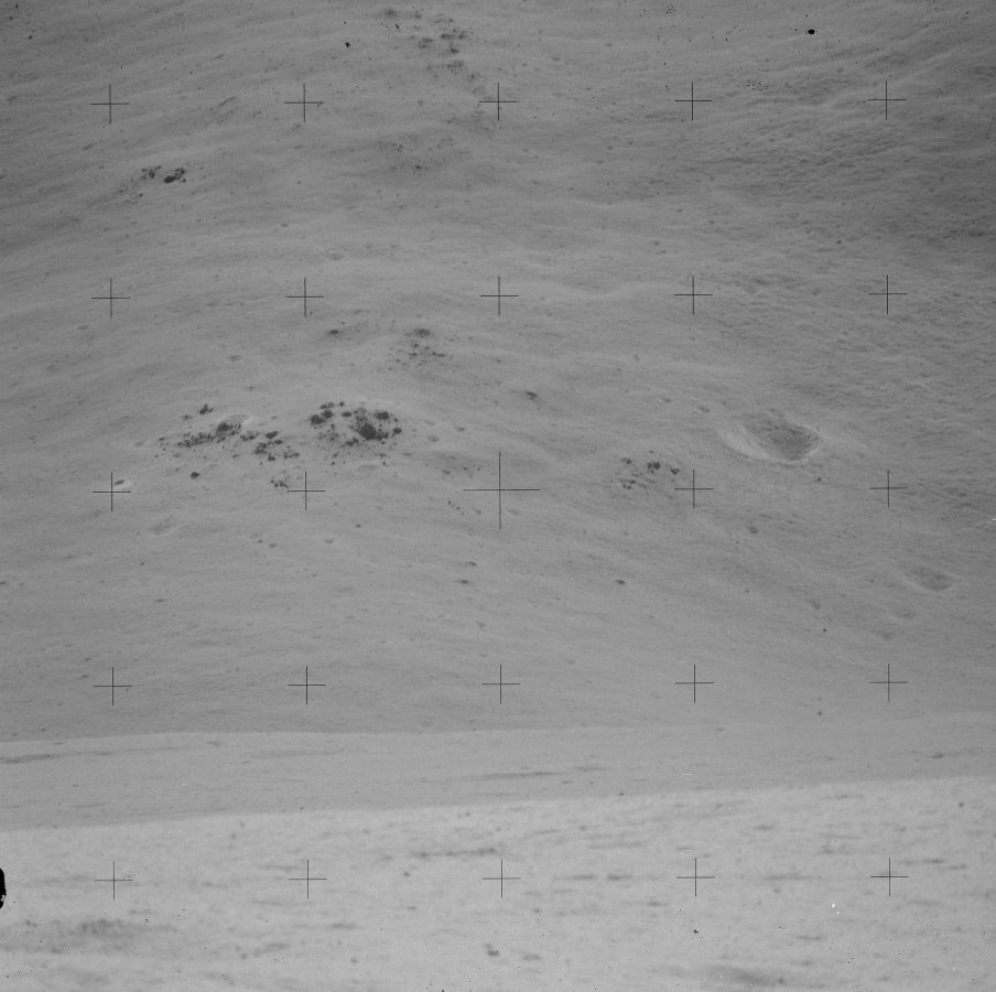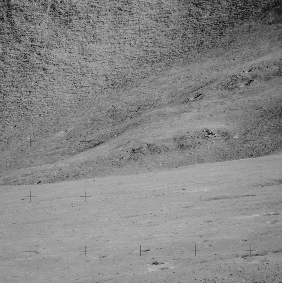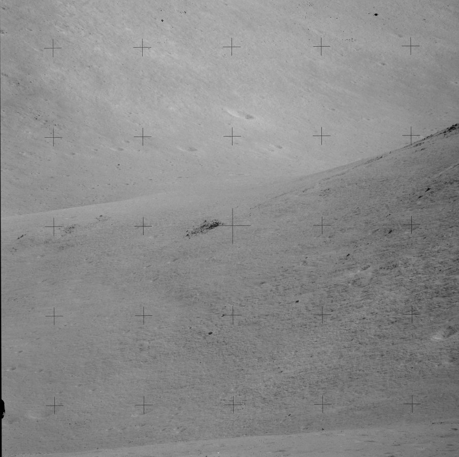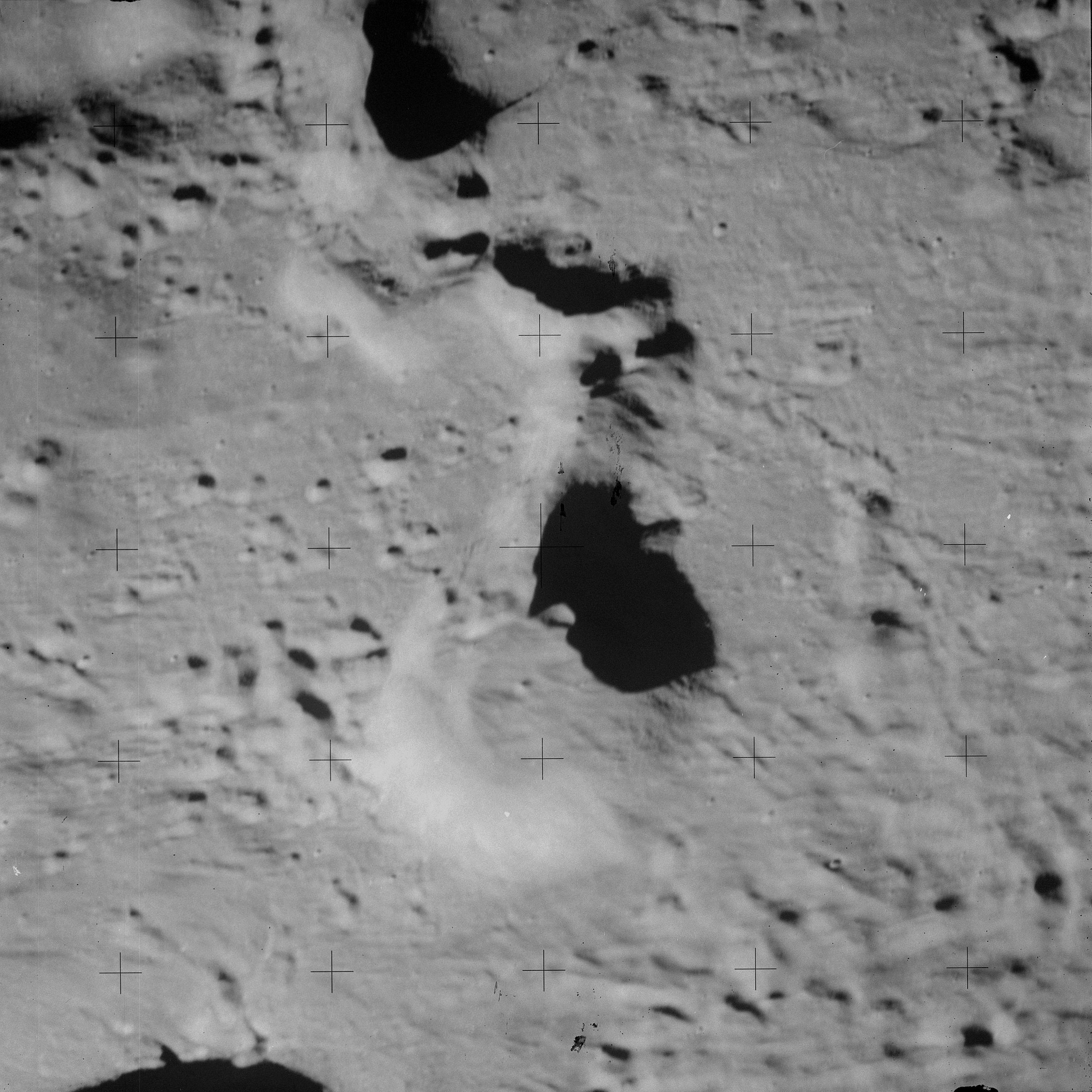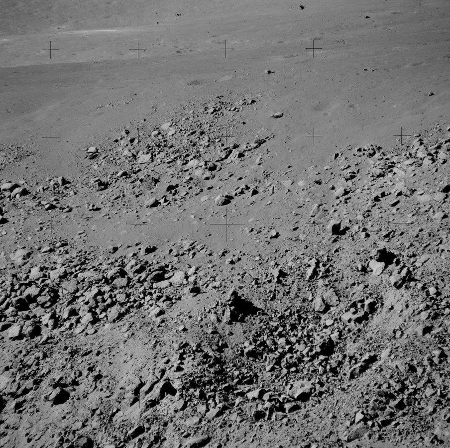 Stephen Tellier scanned a portion of Pan Camera frame 9798, which was taken during CSM Rev 38 at about 151:37. At that time, Dave and Jim were in the LM after the completion of EVA-2. A prominent feature of this image is the darkening of the soil around the LM and along a corridor extending from the LM toward 11 o'clock. See a comparison with frame 9377 by Markus Mehring, who has processed the images to account for differing orientations, different scales due to differing CSM-LM ranges, and different foreshortening due to differing CSM elevation angles. As Jack Schmitt discusses in the Apollo 17 commentary, the surface around the LM became brighter after being swept by the descent engine exhaust. As can be seen in photos taken on the surface, areas subsequently disturbed by the astronauts became relatively dark again. At locations relatively far from the LM, disturbed soil had the same brightness as undisturbed soil, another indication of brightening due to the engine exhaust.Rev. 50 Pan Camera 9809, North Detail ( 332k )