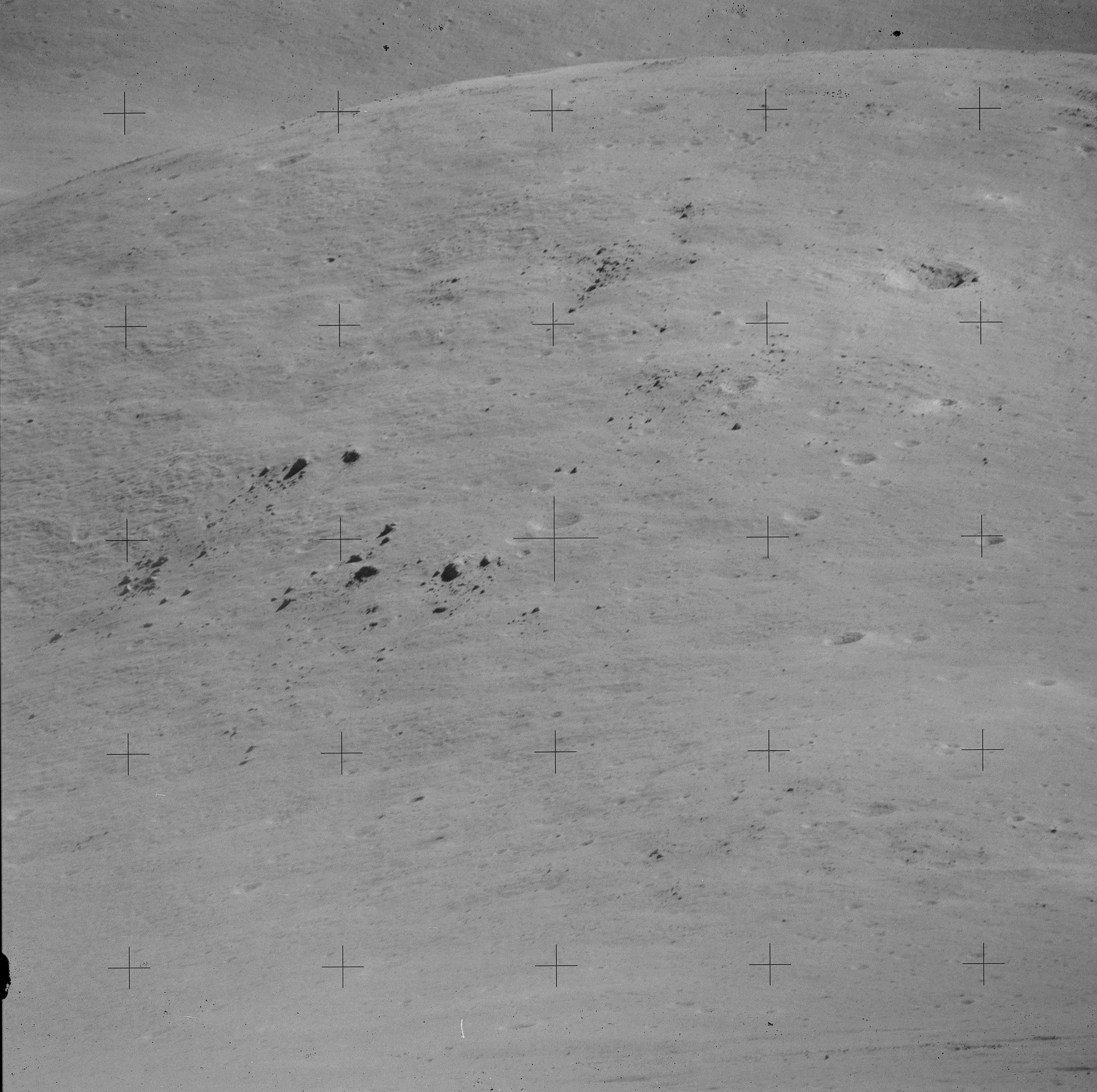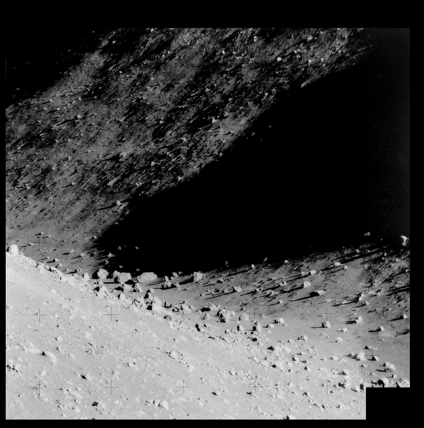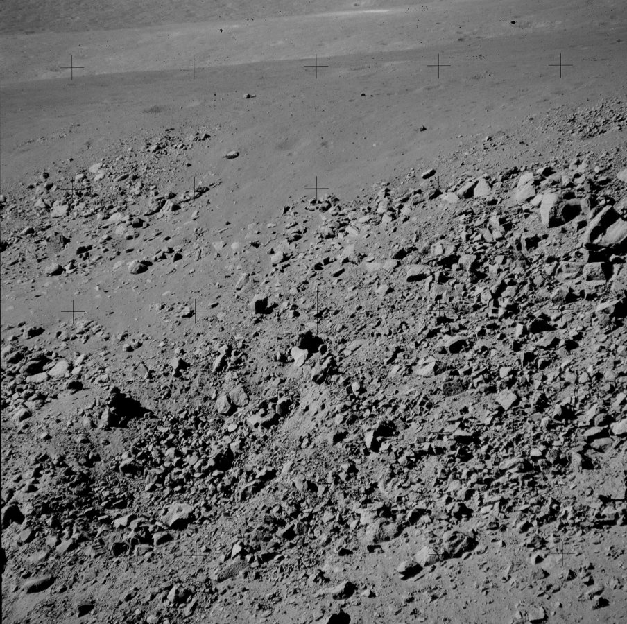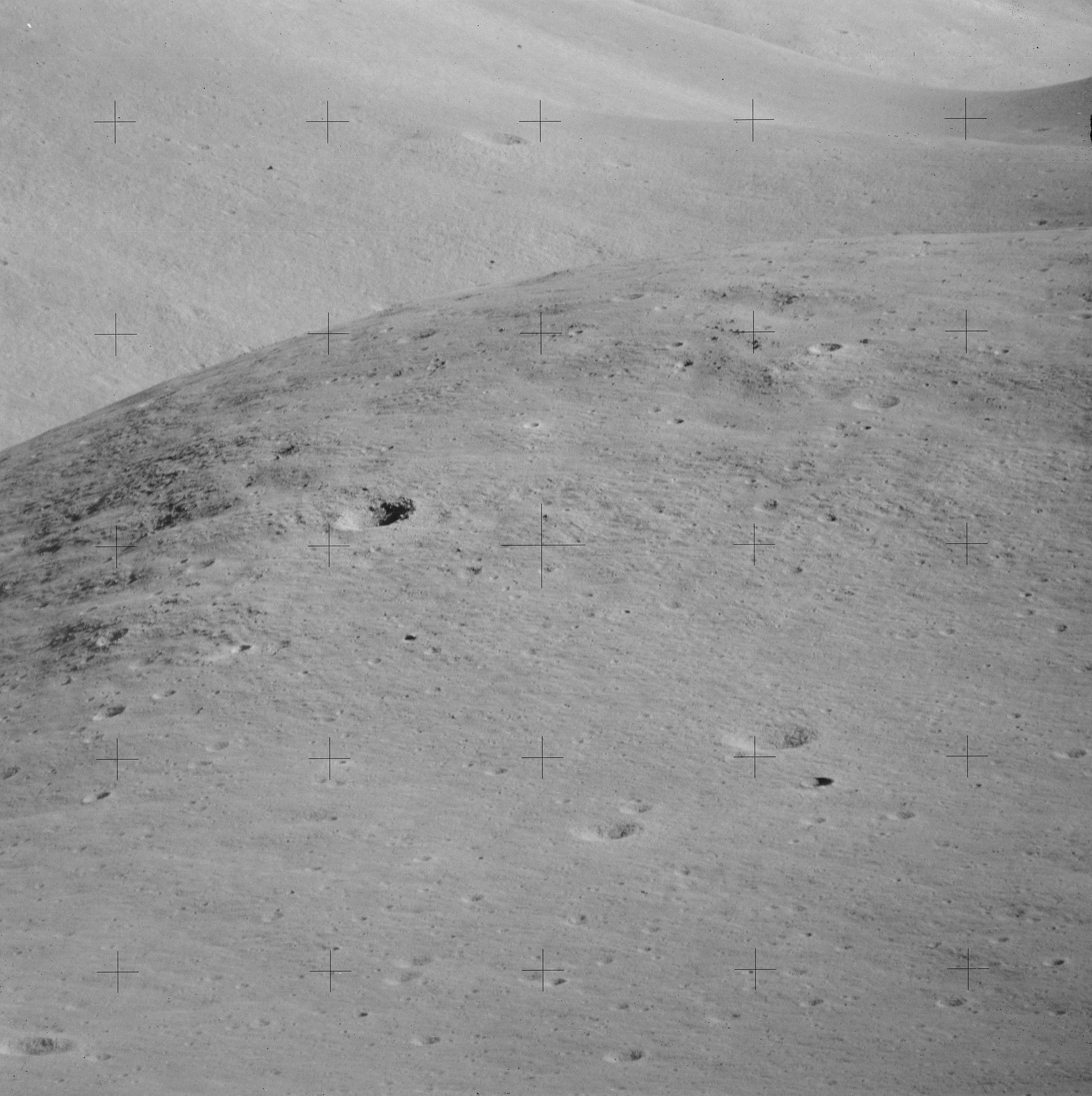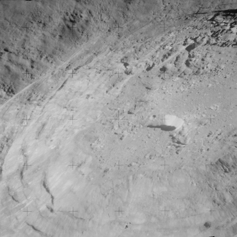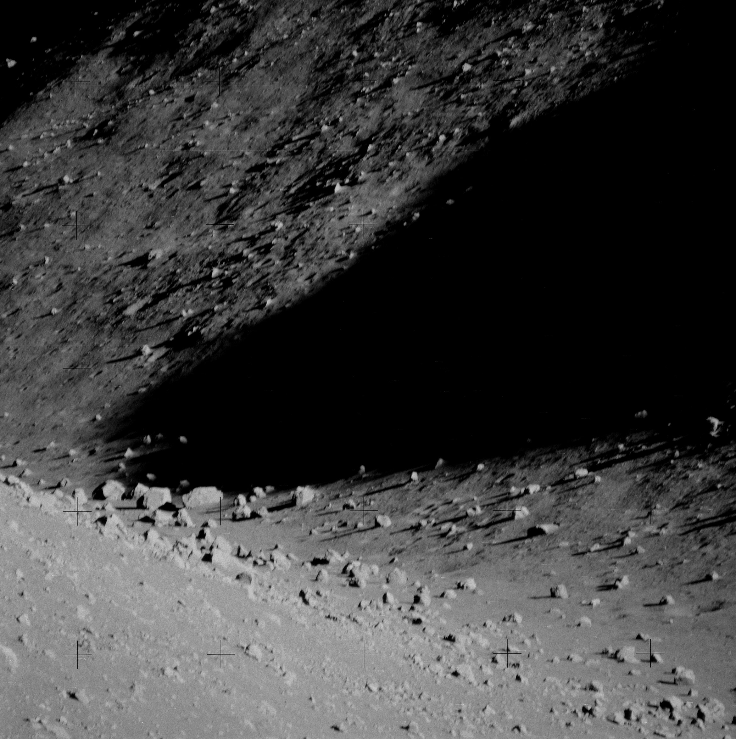 Stephen Tellier scanned a portion of Pan Camera frame 9798, which was taken during CSM Rev 38 at about 151:37. At that time, Dave and Jim were in the LM after the completion of EVA-2. A prominent feature of this image is the darkening of the soil around the LM and along a corridor extending from the LM toward 11 o'clock. See a comparison with frame 9377 by Markus Mehring, who has processed the images to account for differing orientations, different scales due to differing CSM-LM ranges, and different foreshortening due to differing CSM elevation angles. As Jack Schmitt discusses in the Apollo 17 commentary, the surface around the LM became brighter after being swept by the descent engine exhaust. As can be seen in photos taken on the surface, areas subsequently disturbed by the astronauts became relatively dark again. At locations relatively far from the LM, disturbed soil had the same brightness as undisturbed soil, another indication of brightening due to the engine exhaust.Rev. 50 Pan Camera 9809, North Detail ( 332k )