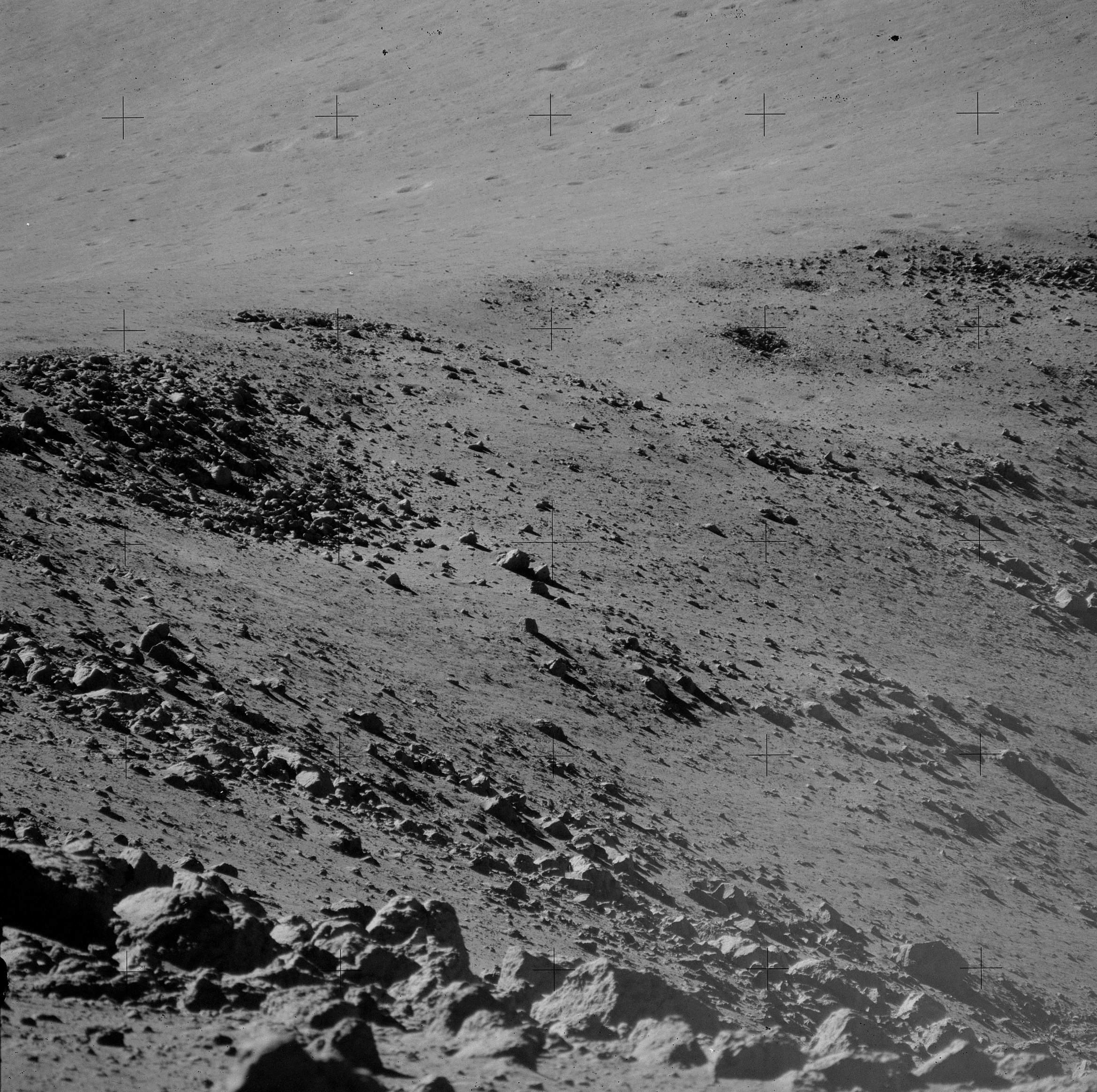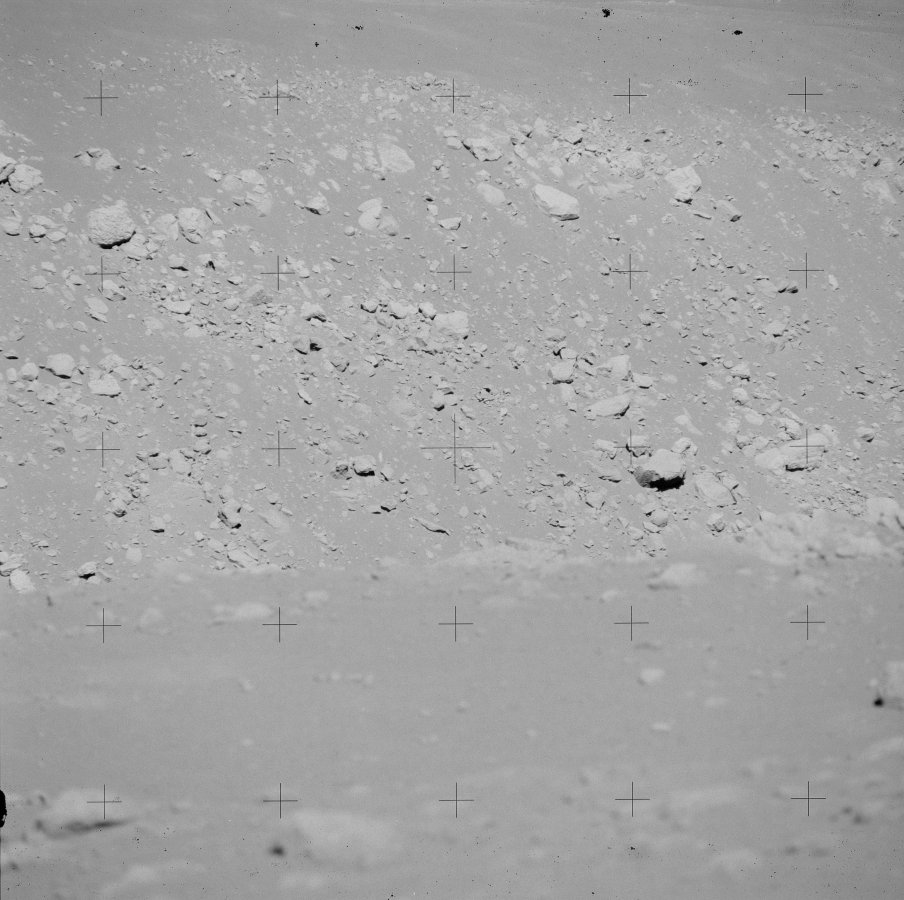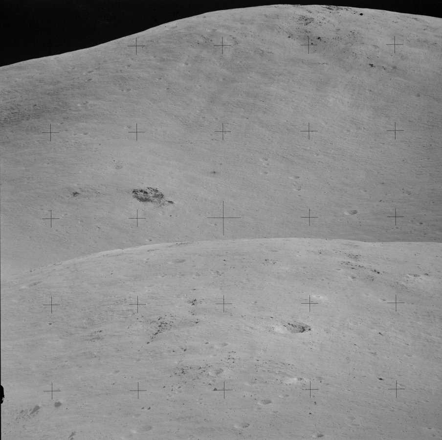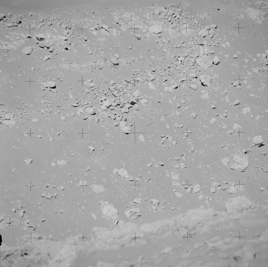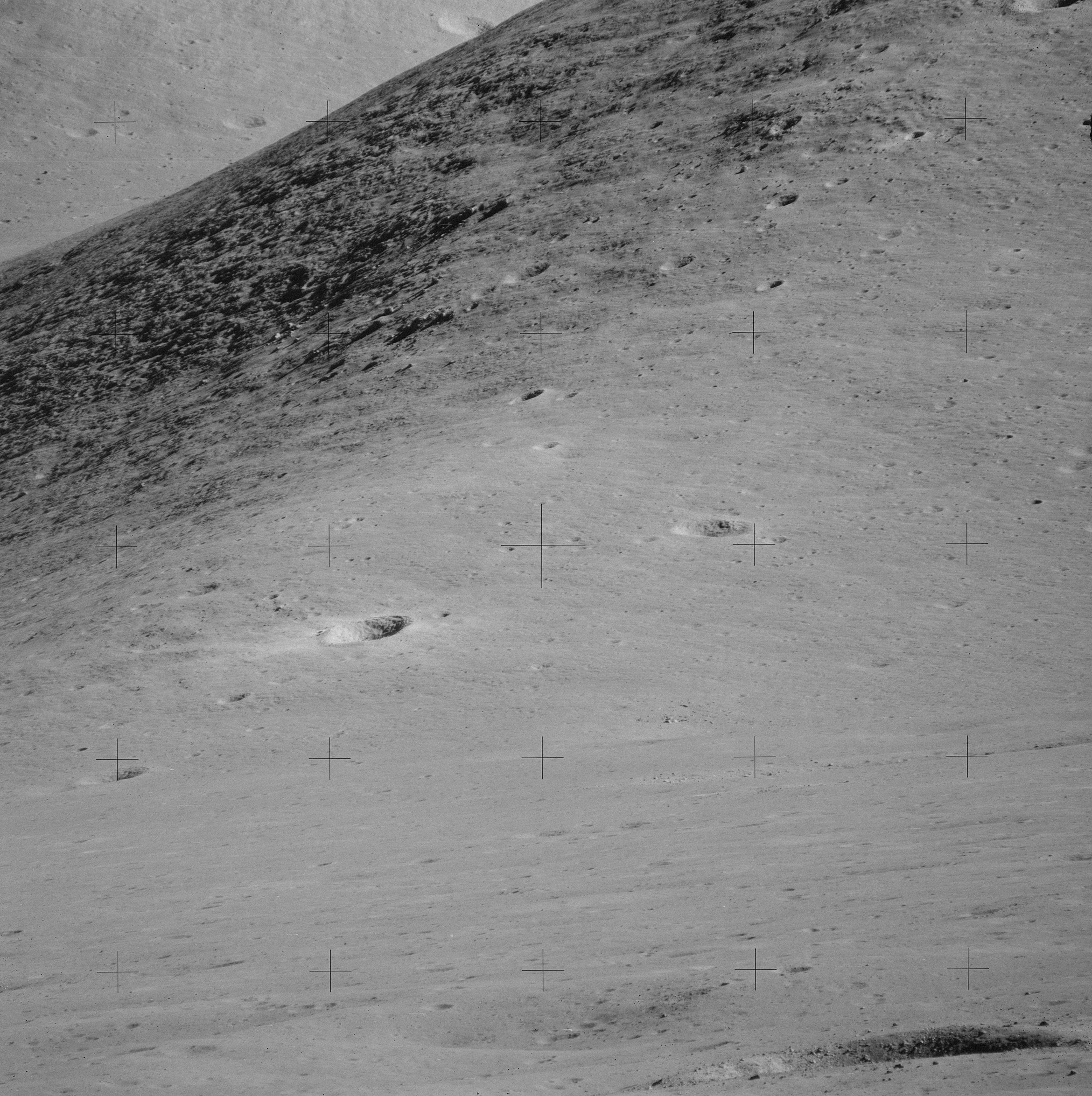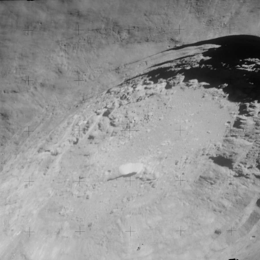 Stephen Tellier scanned a portion of Pan Camera frame 9798, which was taken during CSM Rev 38 at about 151:37. At that time, Dave and Jim were in the LM after the completion of EVA-2. A prominent feature of this image is the darkening of the soil around the LM and along a corridor extending from the LM toward 11 o'clock. See a comparison with frame 9377 by Markus Mehring, who has processed the images to account for differing orientations, different scales due to differing CSM-LM ranges, and different foreshortening due to differing CSM elevation angles. As Jack Schmitt discusses in the Apollo 17 commentary, the surface around the LM became brighter after being swept by the descent engine exhaust. As can be seen in photos taken on the surface, areas subsequently disturbed by the astronauts became relatively dark again. At locations relatively far from the LM, disturbed soil had the same brightness as undisturbed soil, another indication of brightening due to the engine exhaust.Rev. 50 Pan Camera 9809, North Detail ( 332k )
