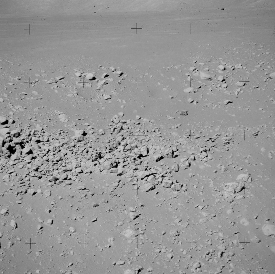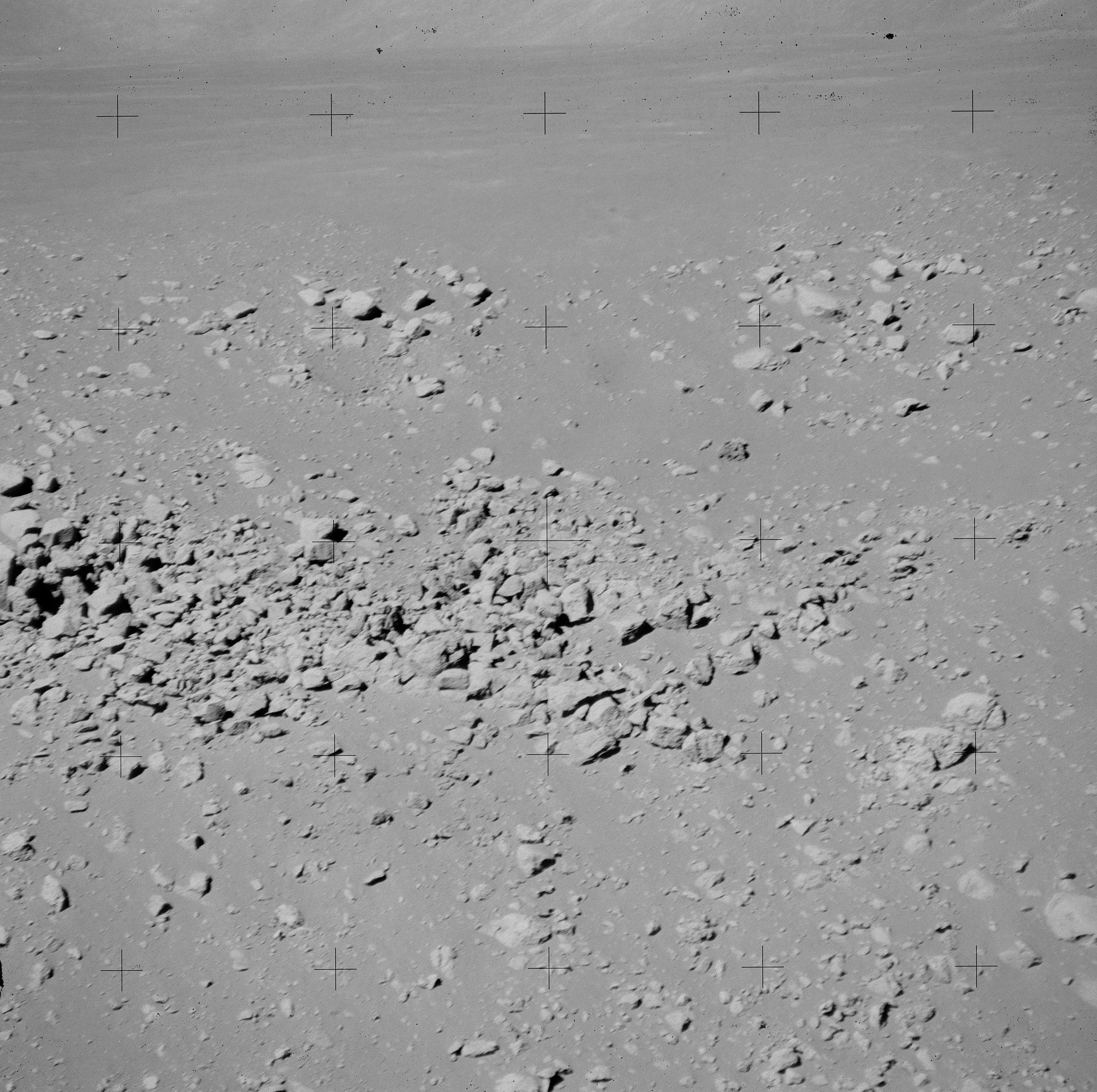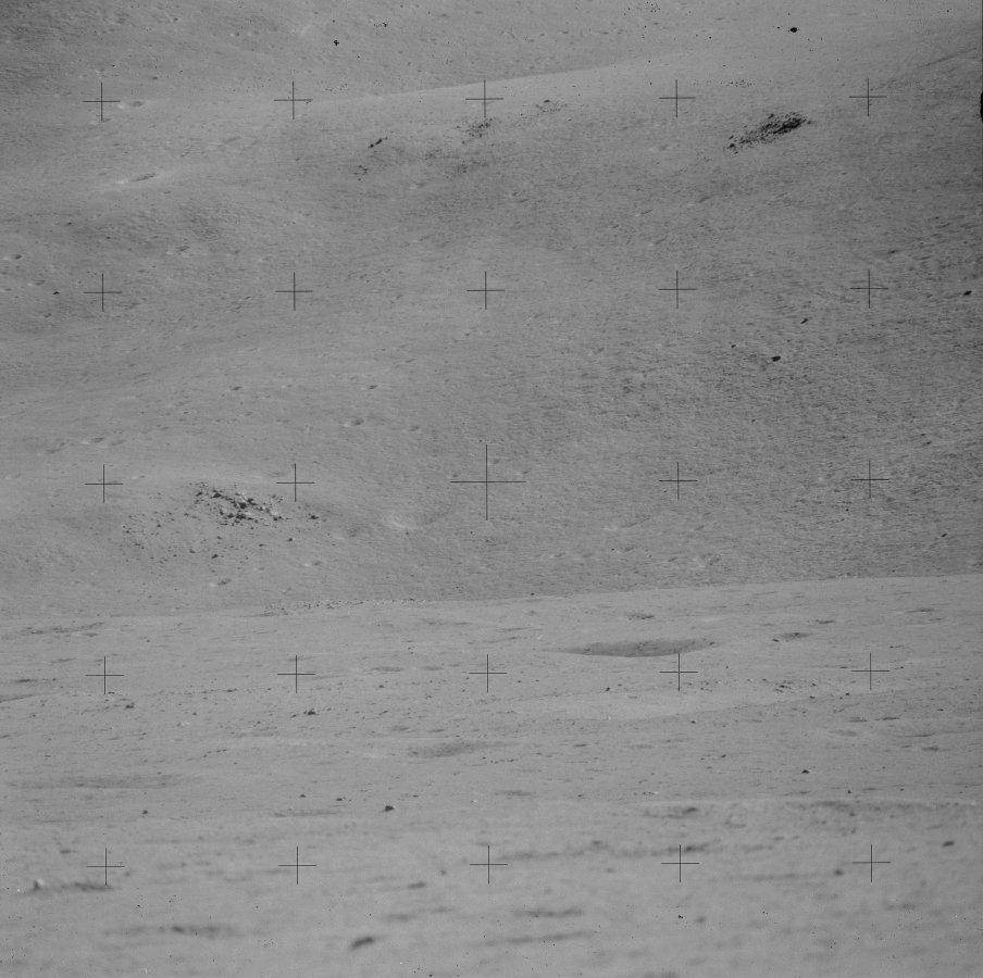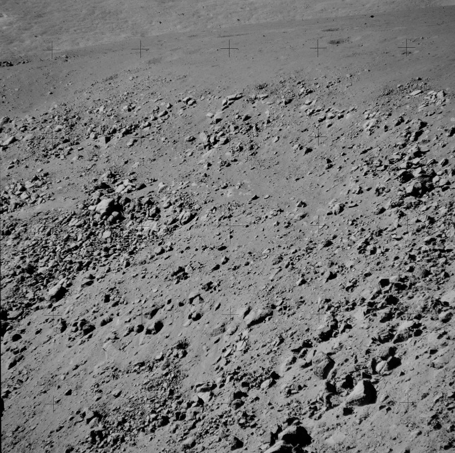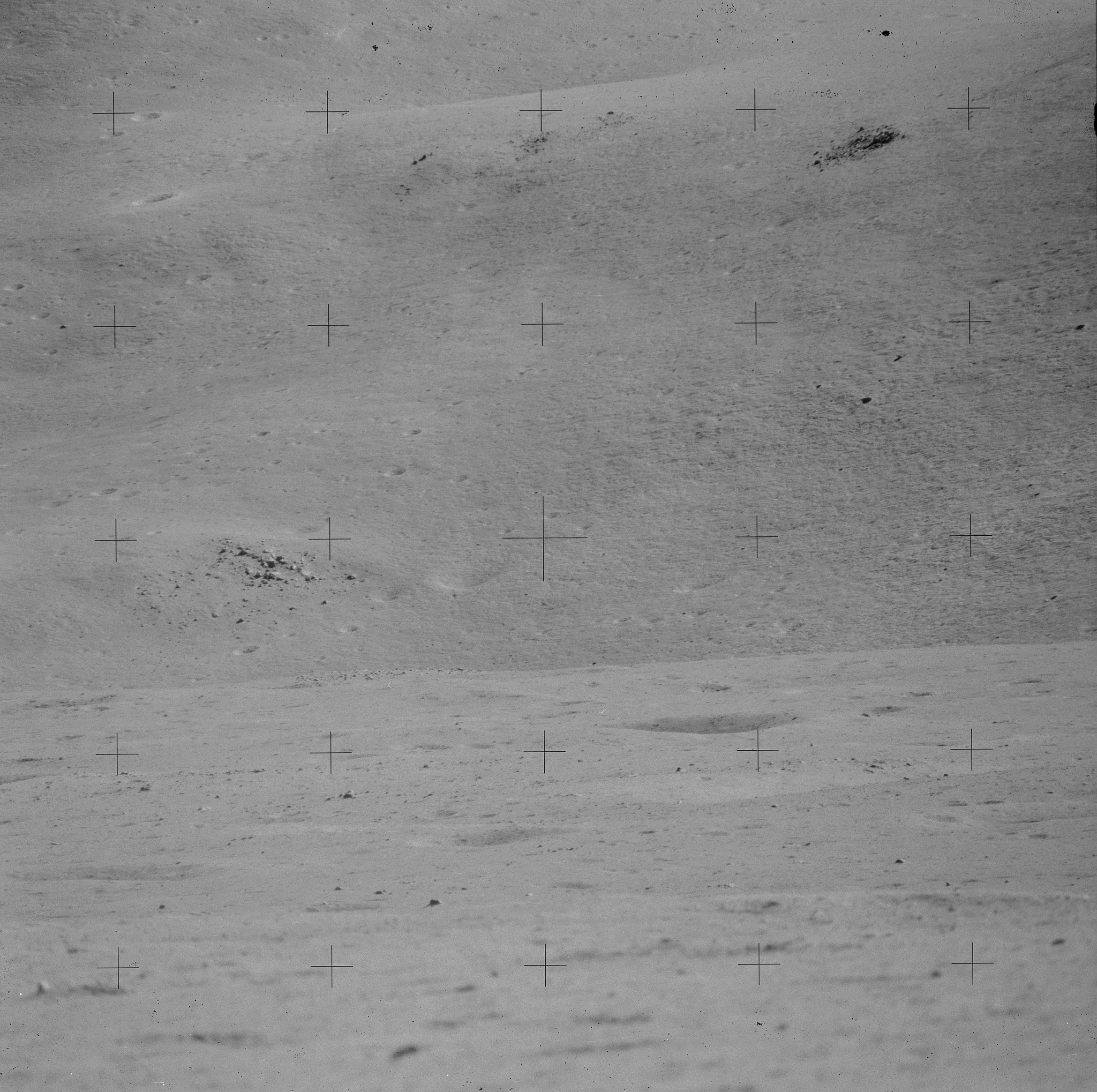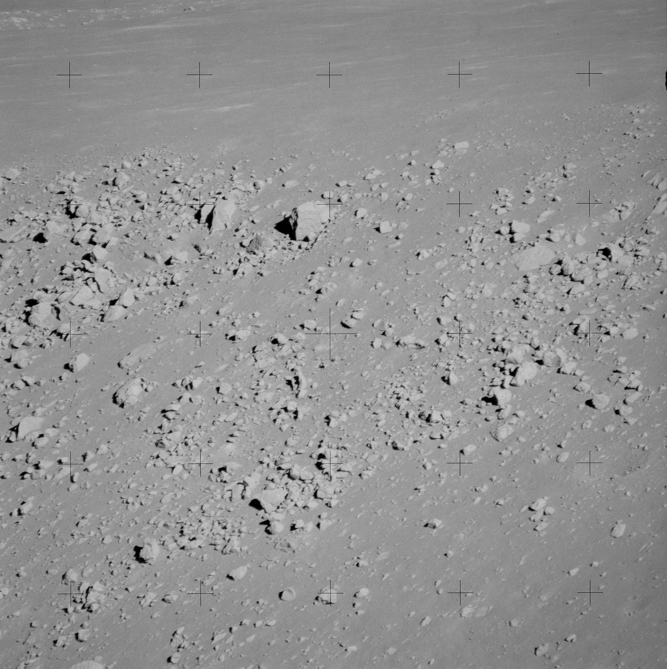 Stephen Tellier scanned a portion of Pan Camera frame 9798, which was taken during CSM Rev 38 at about 151:37. At that time, Dave and Jim were in the LM after the completion of EVA-2. A prominent feature of this image is the darkening of the soil around the LM and along a corridor extending from the LM toward 11 o'clock. See a comparison with frame 9377 by Markus Mehring, who has processed the images to account for differing orientations, different scales due to differing CSM-LM ranges, and different foreshortening due to differing CSM elevation angles. As Jack Schmitt discusses in the Apollo 17 commentary, the surface around the LM became brighter after being swept by the descent engine exhaust. As can be seen in photos taken on the surface, areas subsequently disturbed by the astronauts became relatively dark again. At locations relatively far from the LM, disturbed soil had the same brightness as undisturbed soil, another indication of brightening due to the engine exhaust.Rev. 50 Pan Camera 9809, North Detail ( 332k )