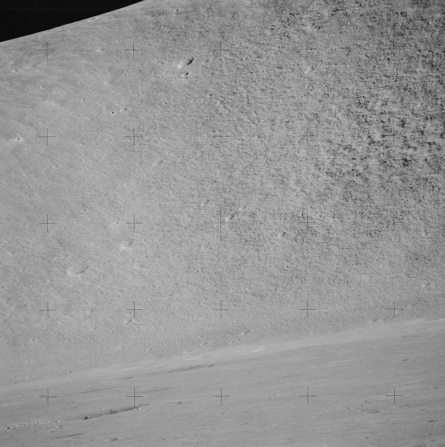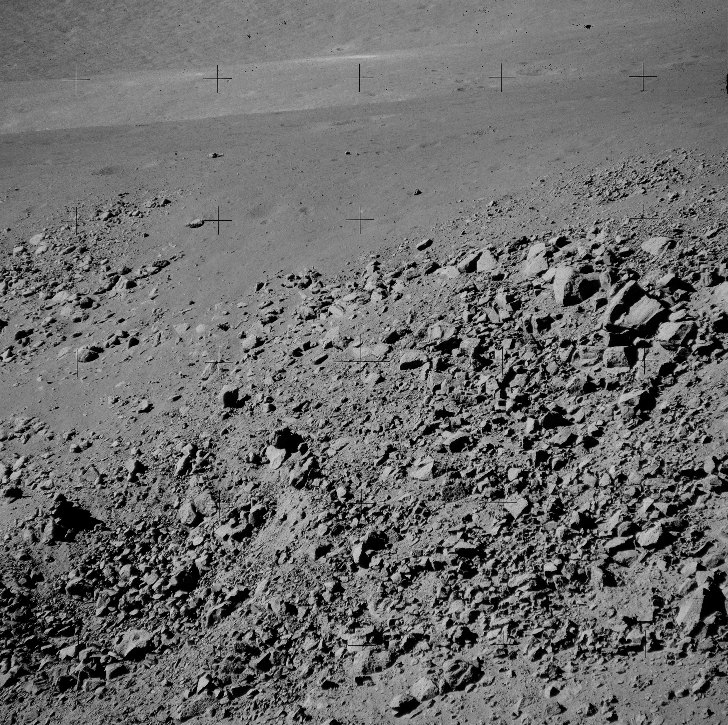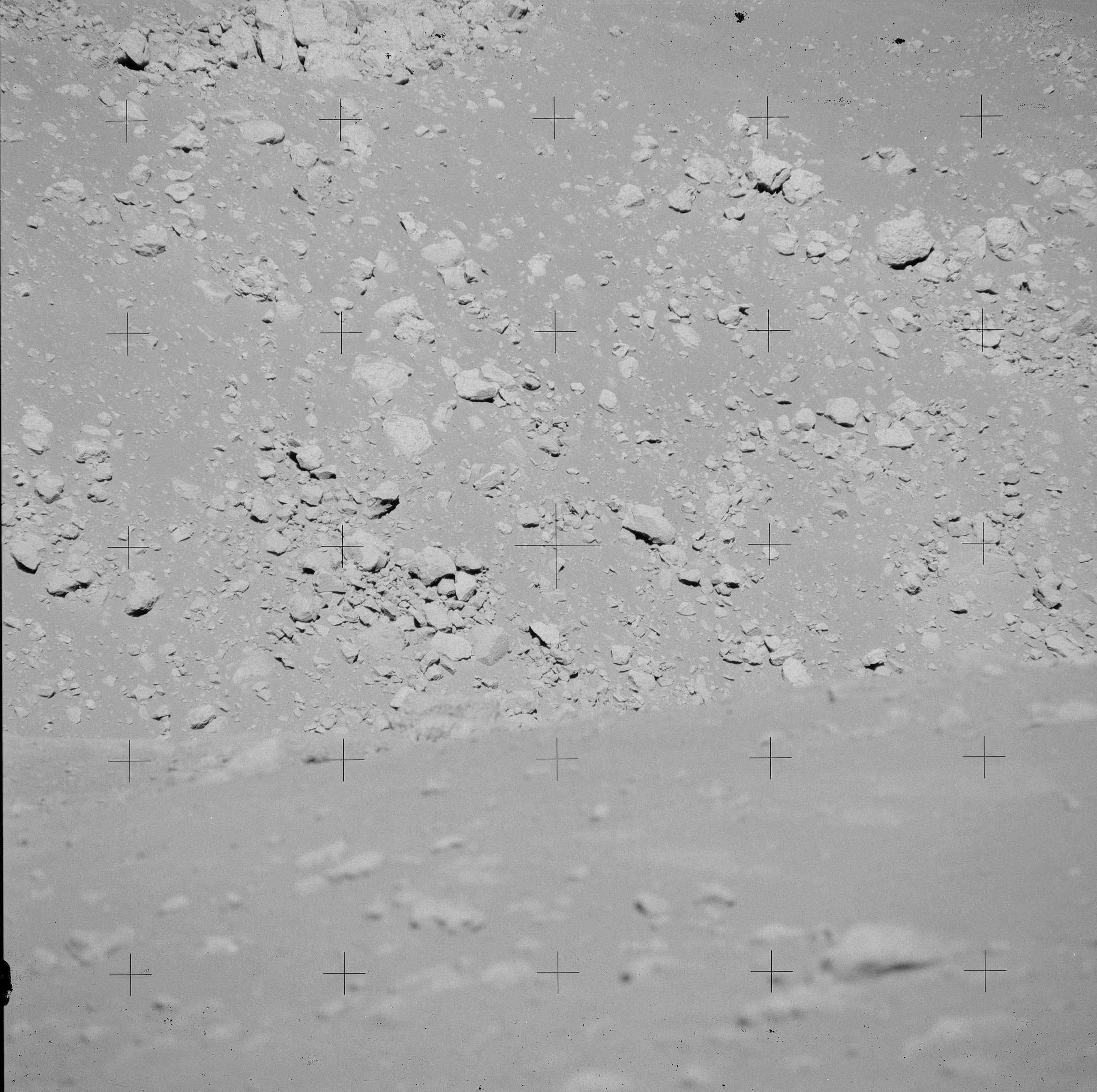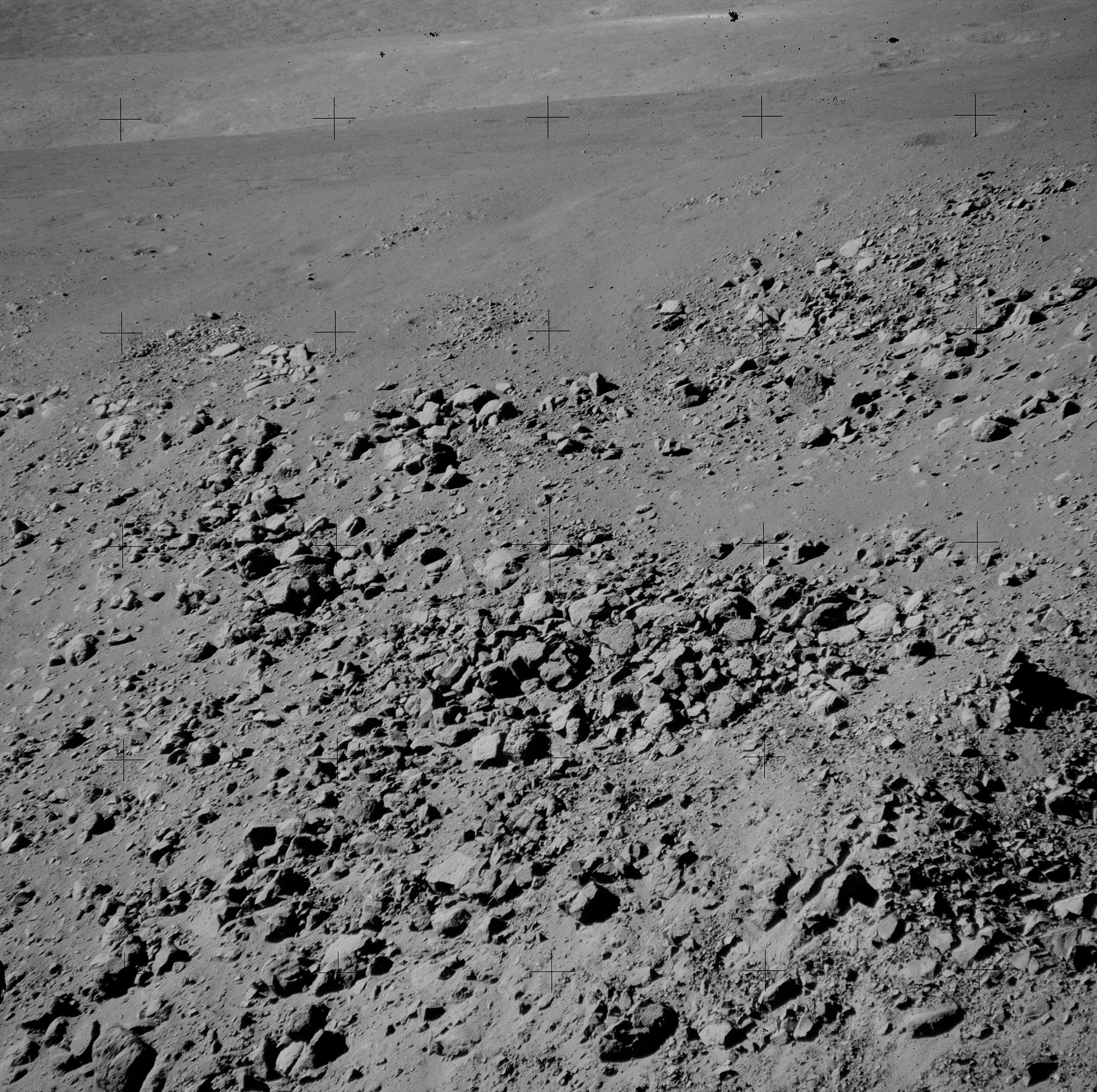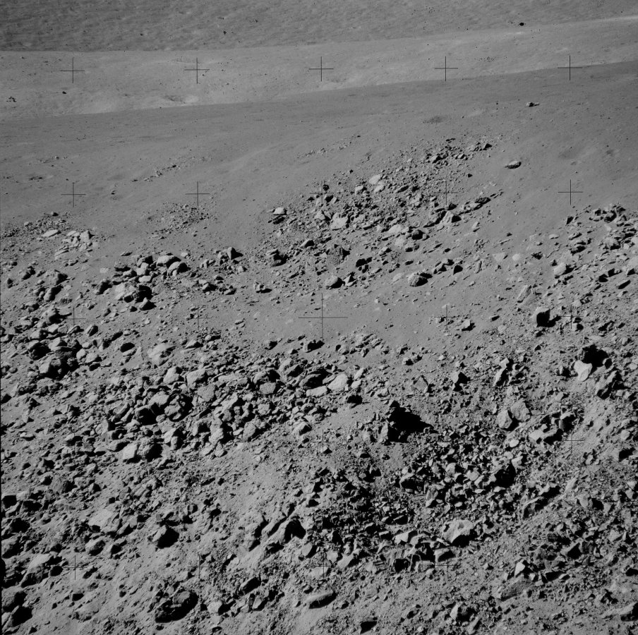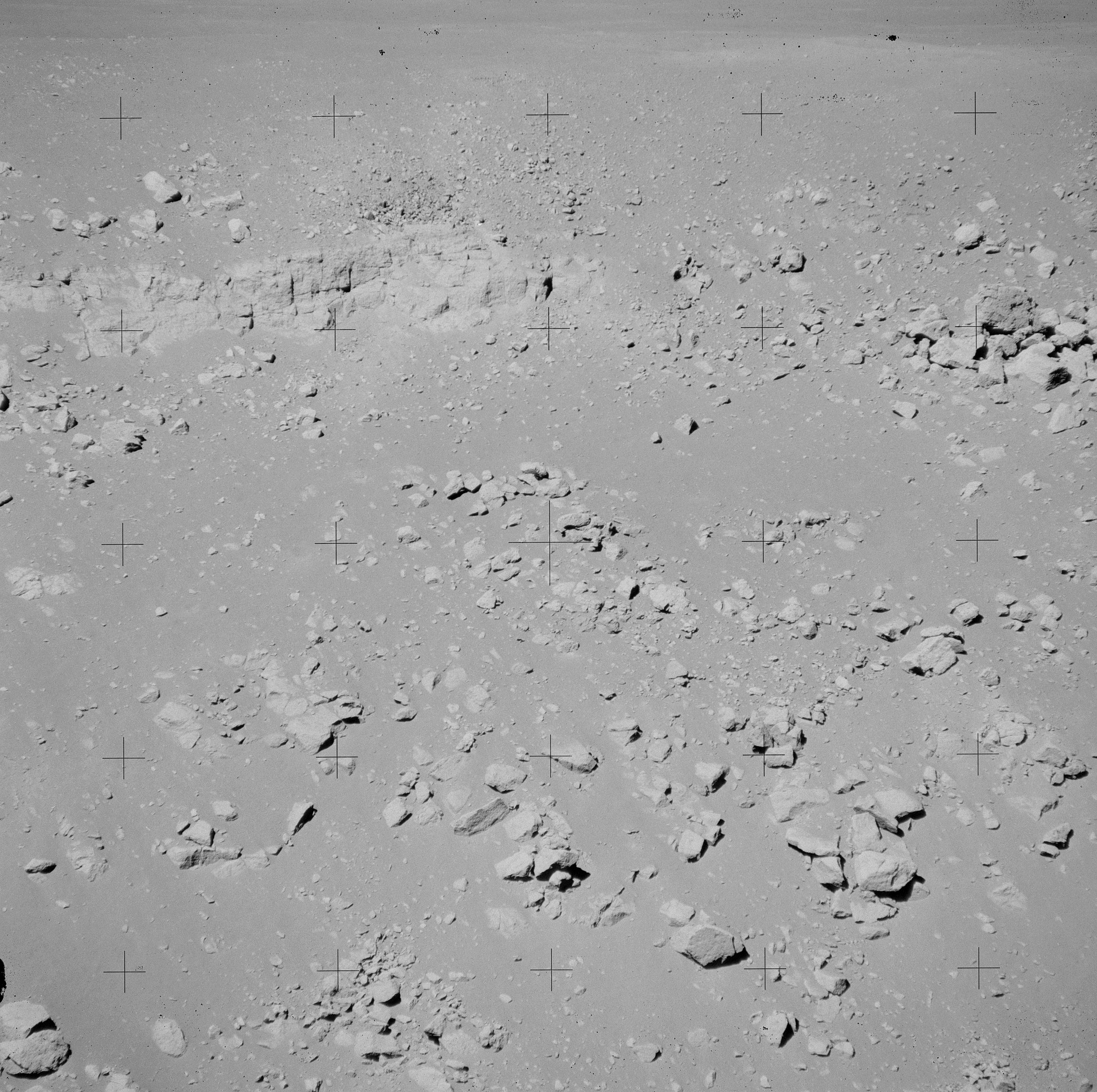 Stephen Tellier scanned a portion of Pan Camera frame 9798, which was taken during CSM Rev 38 at about 151:37. At that time, Dave and Jim were in the LM after the completion of EVA-2. A prominent feature of this image is the darkening of the soil around the LM and along a corridor extending from the LM toward 11 o'clock. See a comparison with frame 9377 by Markus Mehring, who has processed the images to account for differing orientations, different scales due to differing CSM-LM ranges, and different foreshortening due to differing CSM elevation angles. As Jack Schmitt discusses in the Apollo 17 commentary, the surface around the LM became brighter after being swept by the descent engine exhaust. As can be seen in photos taken on the surface, areas subsequently disturbed by the astronauts became relatively dark again. At locations relatively far from the LM, disturbed soil had the same brightness as undisturbed soil, another indication of brightening due to the engine exhaust.Rev. 50 Pan Camera 9809, North Detail ( 332k )