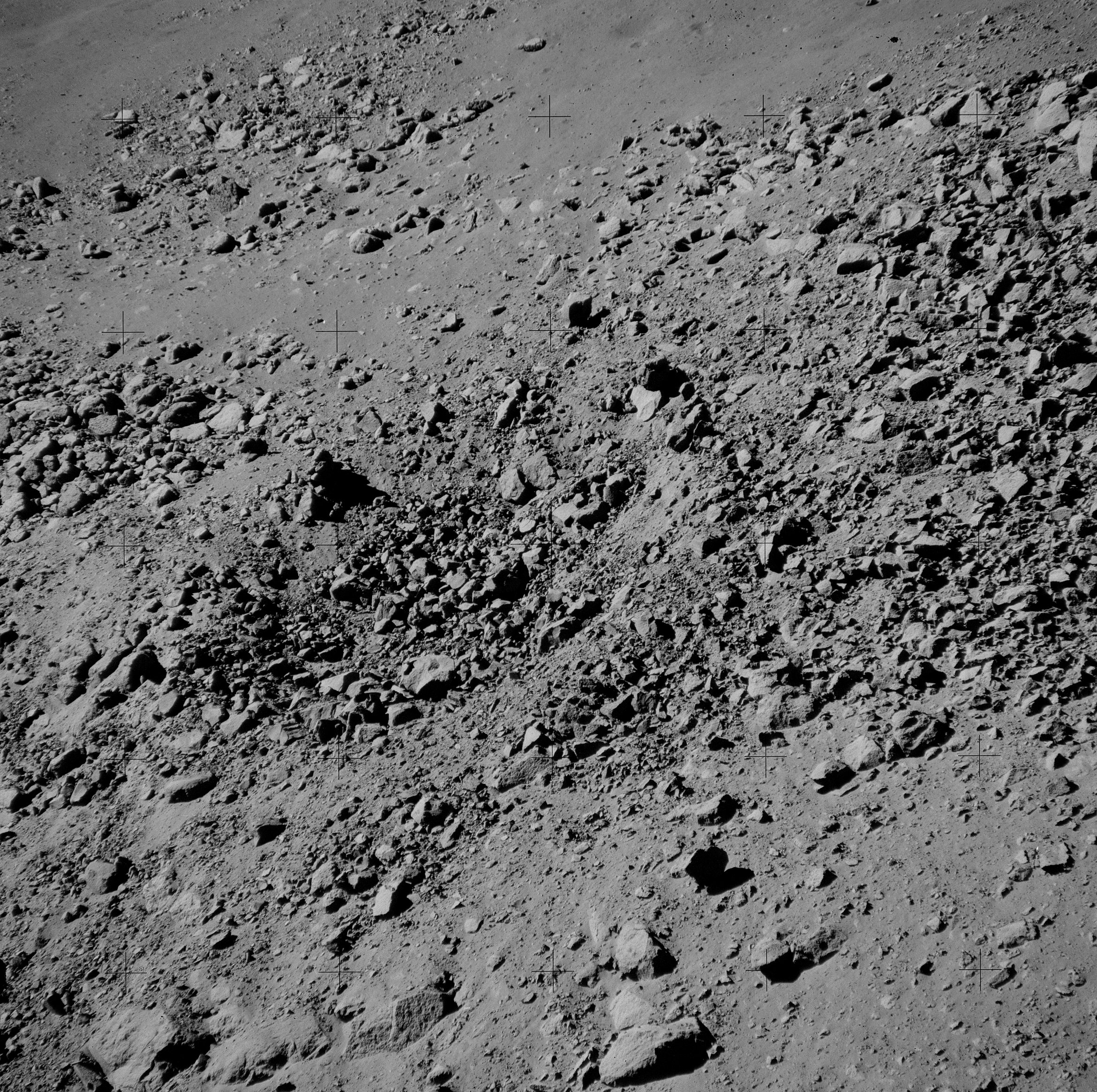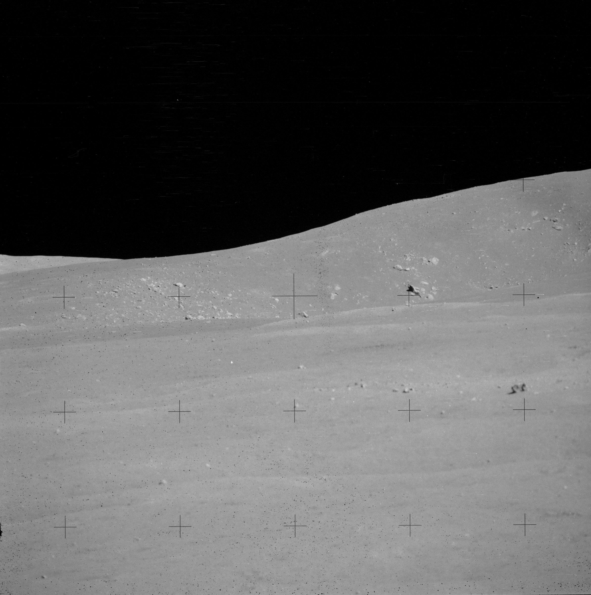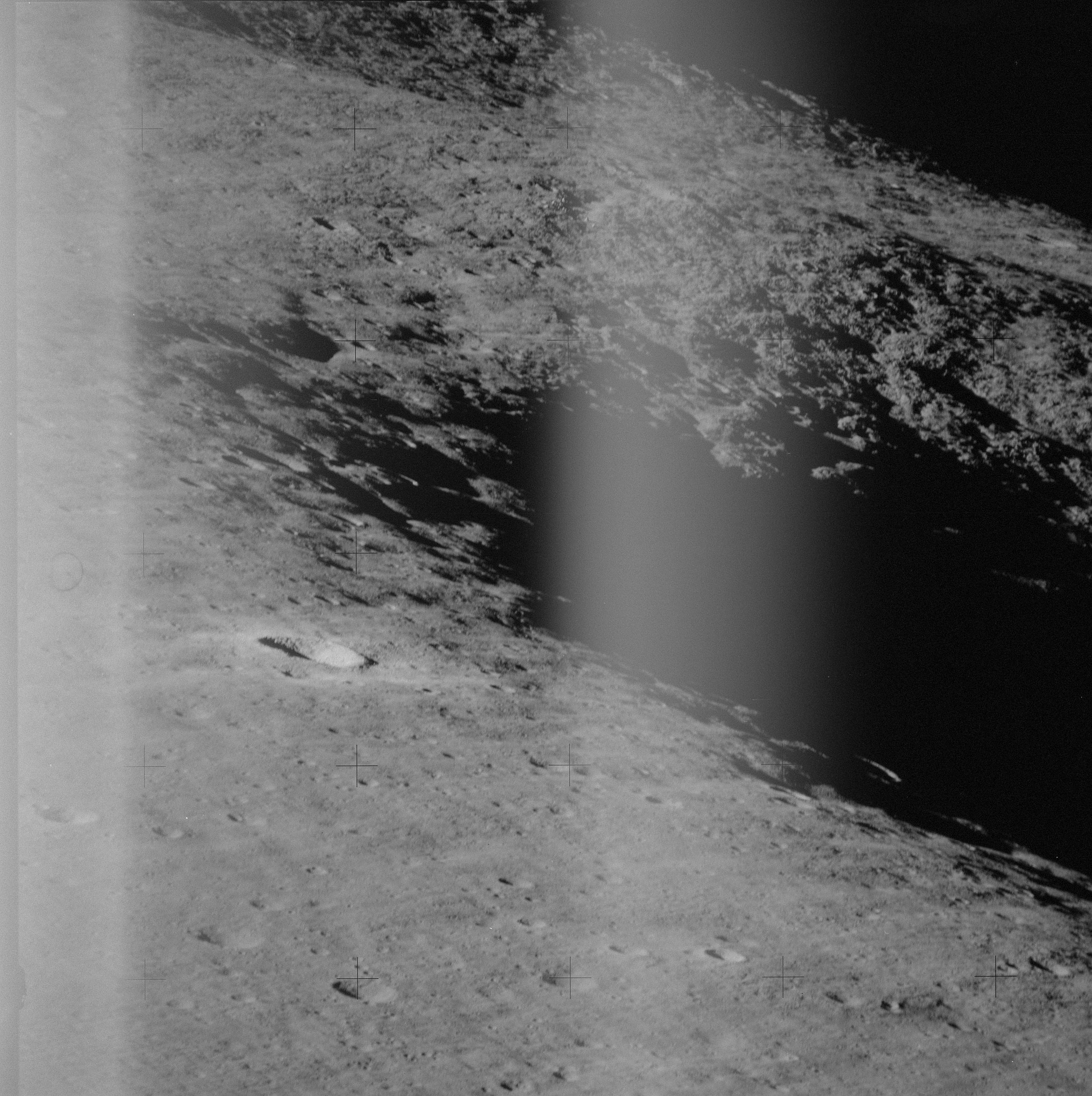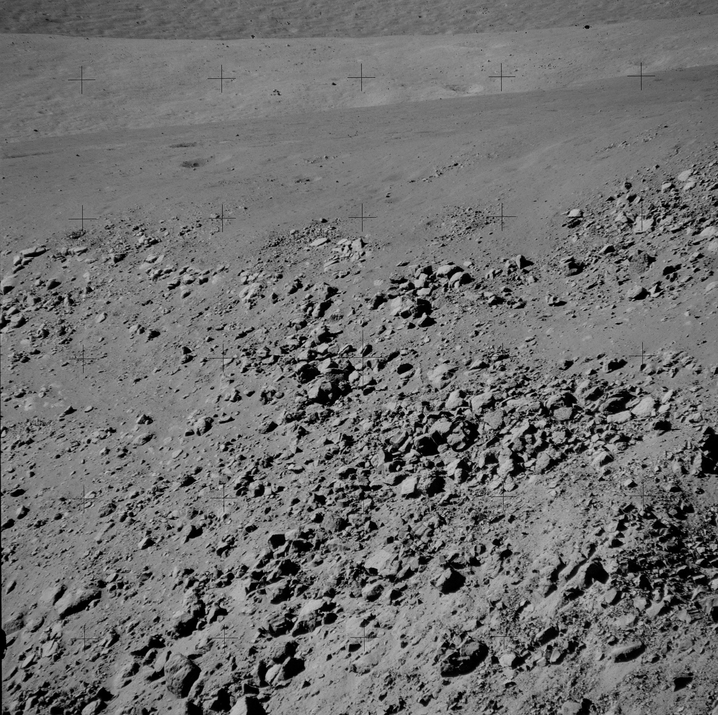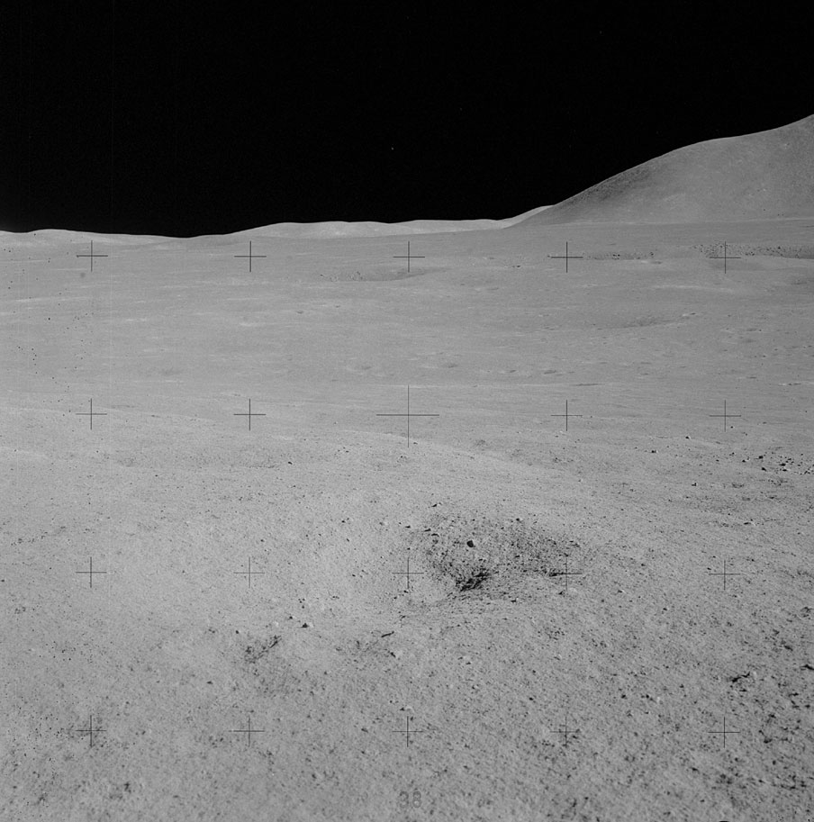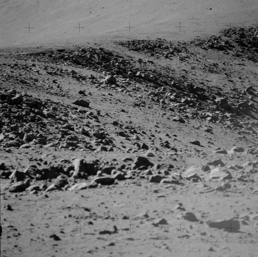 Stephen Tellier scanned a portion of Pan Camera frame 9798, which was taken during CSM Rev 38 at about 151:37. At that time, Dave and Jim were in the LM after the completion of EVA-2. A prominent feature of this image is the darkening of the soil around the LM and along a corridor extending from the LM toward 11 o'clock. See a comparison with frame 9377 by Markus Mehring, who has processed the images to account for differing orientations, different scales due to differing CSM-LM ranges, and different foreshortening due to differing CSM elevation angles. As Jack Schmitt discusses in the Apollo 17 commentary, the surface around the LM became brighter after being swept by the descent engine exhaust. As can be seen in photos taken on the surface, areas subsequently disturbed by the astronauts became relatively dark again. At locations relatively far from the LM, disturbed soil had the same brightness as undisturbed soil, another indication of brightening due to the engine exhaust.Rev. 50 Pan Camera 9809, North Detail ( 332k )