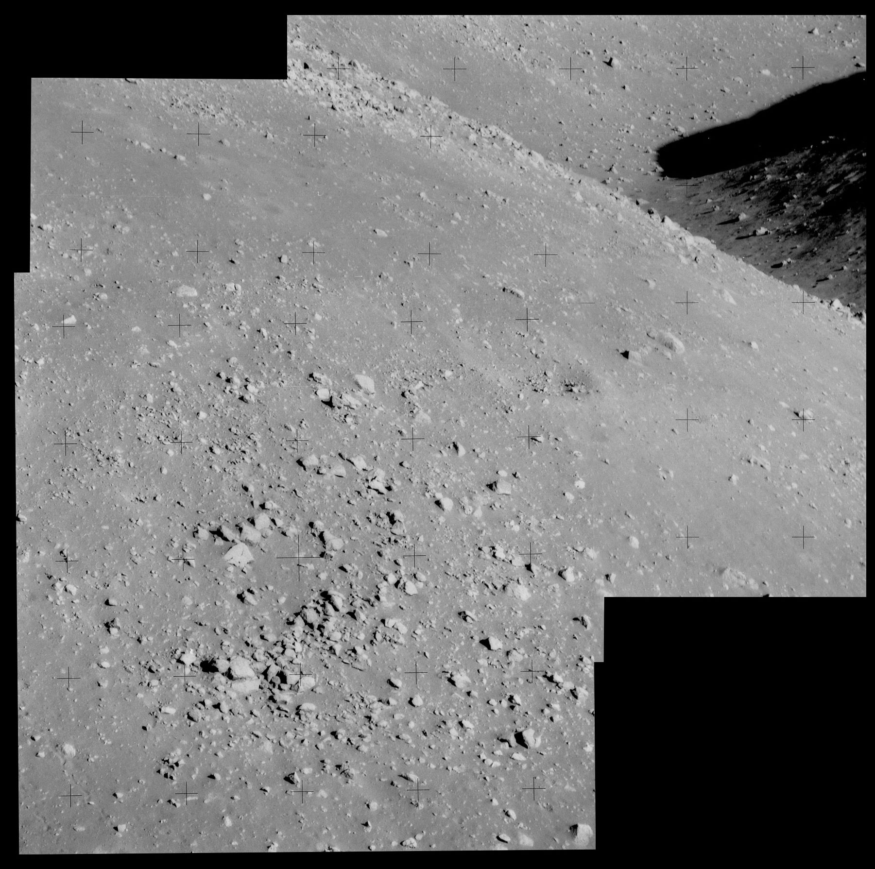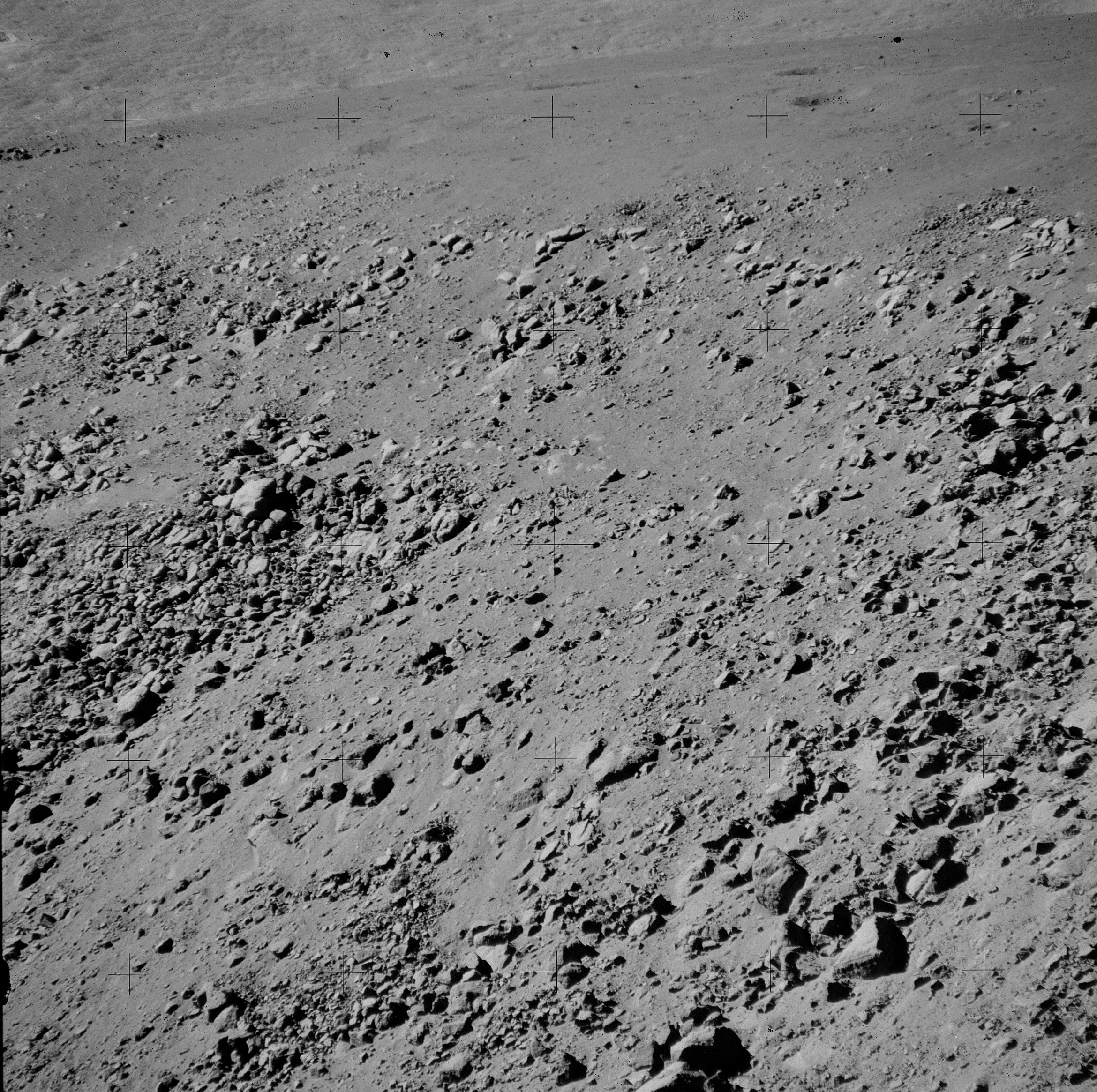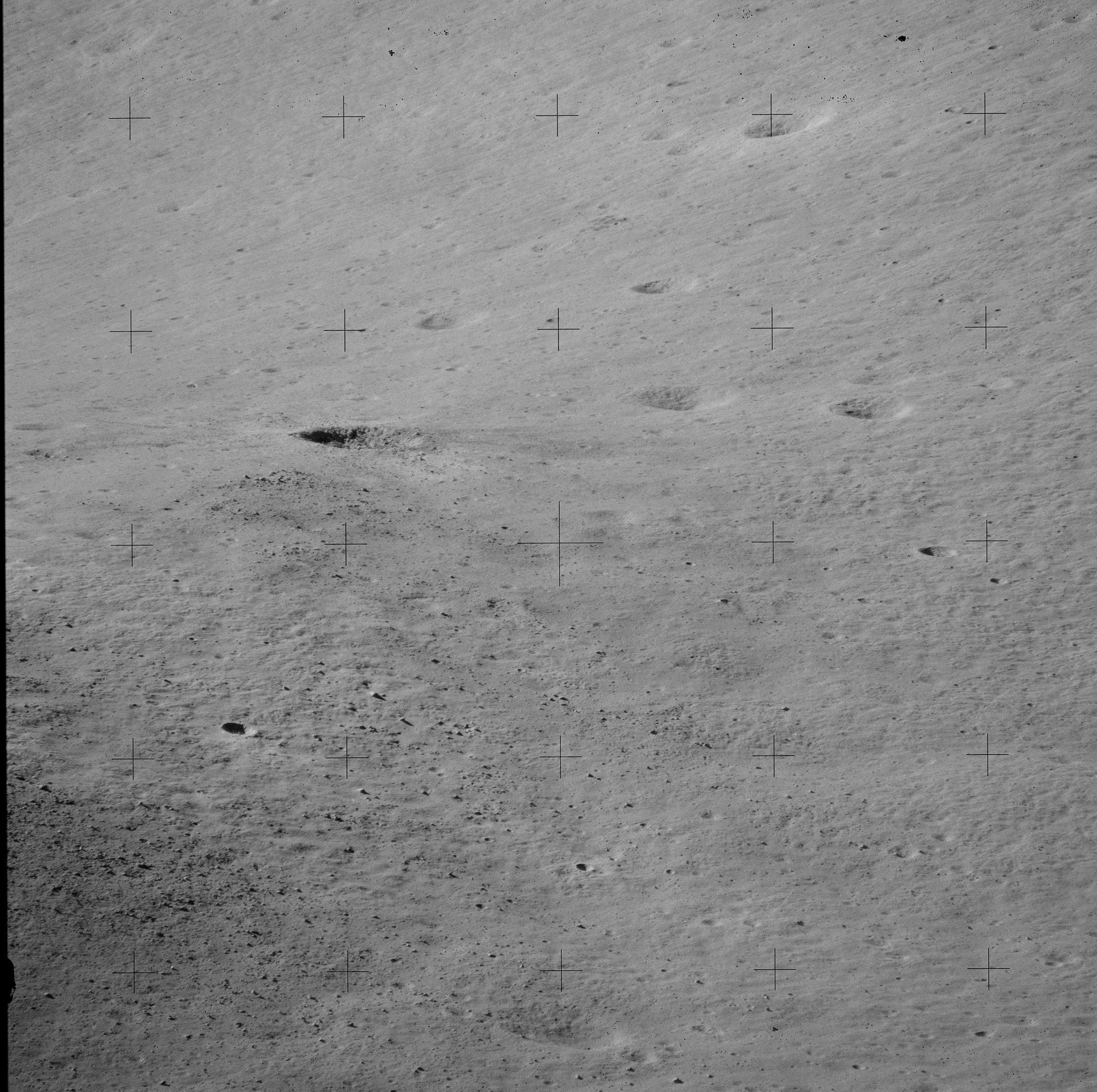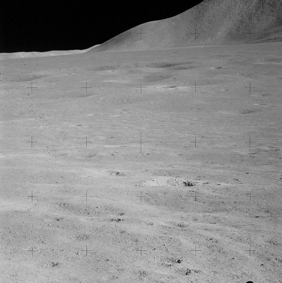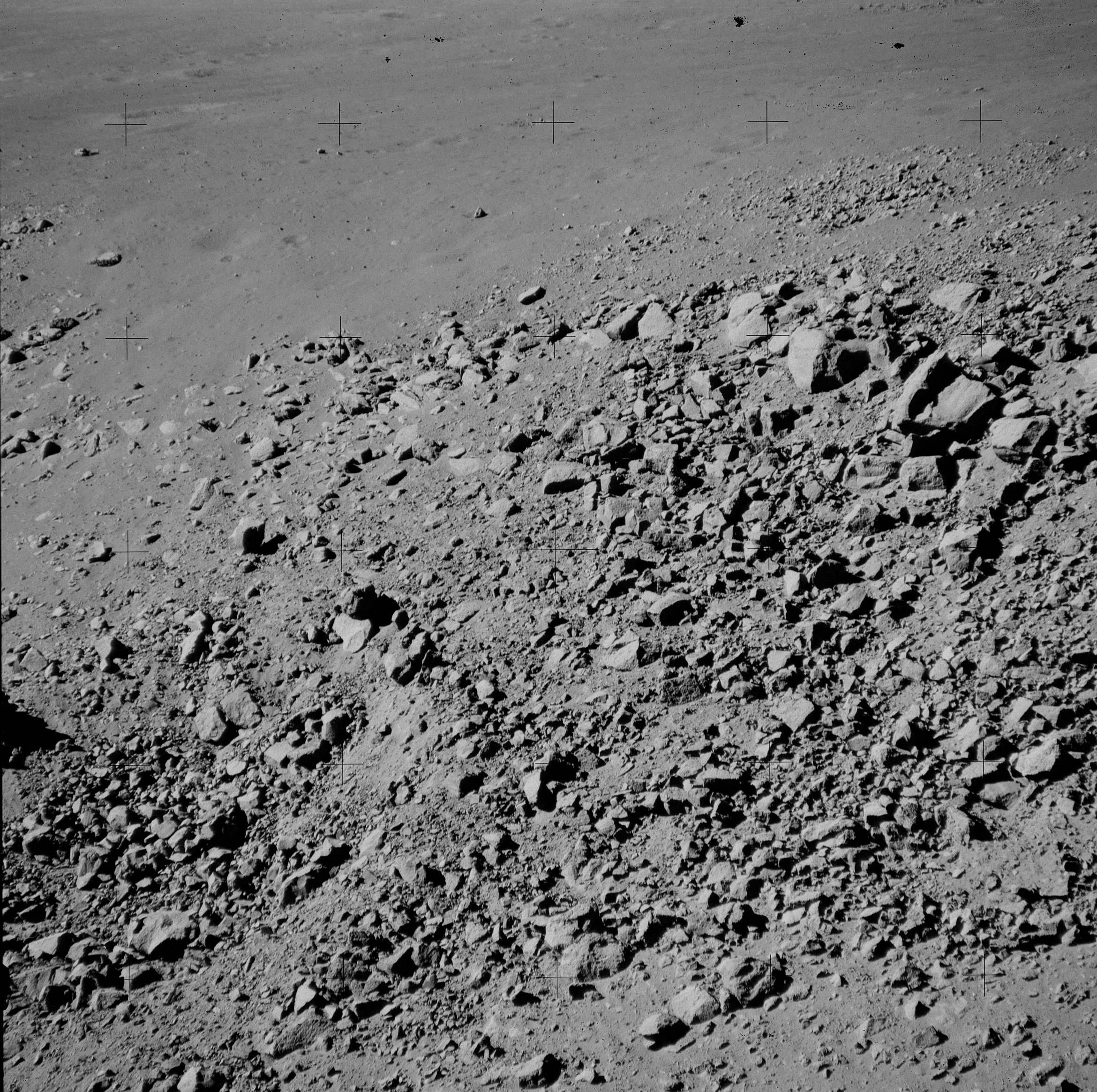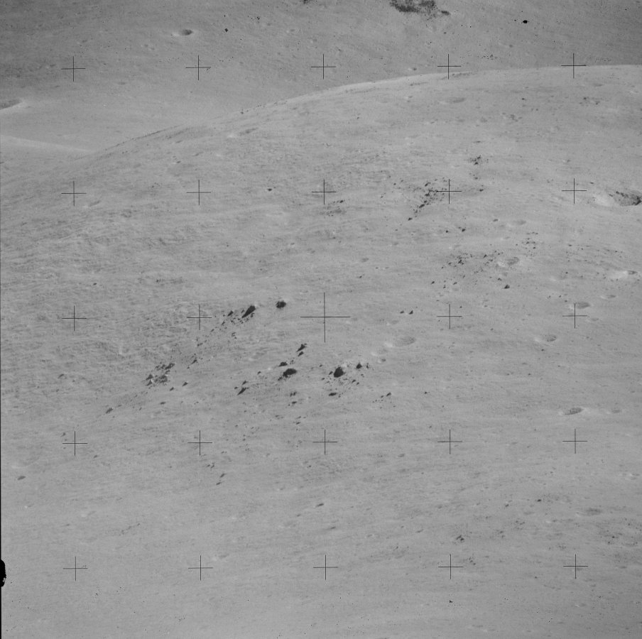 Stephen Tellier scanned a portion of Pan Camera frame 9798, which was taken during CSM Rev 38 at about 151:37. At that time, Dave and Jim were in the LM after the completion of EVA-2. A prominent feature of this image is the darkening of the soil around the LM and along a corridor extending from the LM toward 11 o'clock. See a comparison with frame 9377 by Markus Mehring, who has processed the images to account for differing orientations, different scales due to differing CSM-LM ranges, and different foreshortening due to differing CSM elevation angles. As Jack Schmitt discusses in the Apollo 17 commentary, the surface around the LM became brighter after being swept by the descent engine exhaust. As can be seen in photos taken on the surface, areas subsequently disturbed by the astronauts became relatively dark again. At locations relatively far from the LM, disturbed soil had the same brightness as undisturbed soil, another indication of brightening due to the engine exhaust.Rev. 50 Pan Camera 9809, North Detail ( 332k )