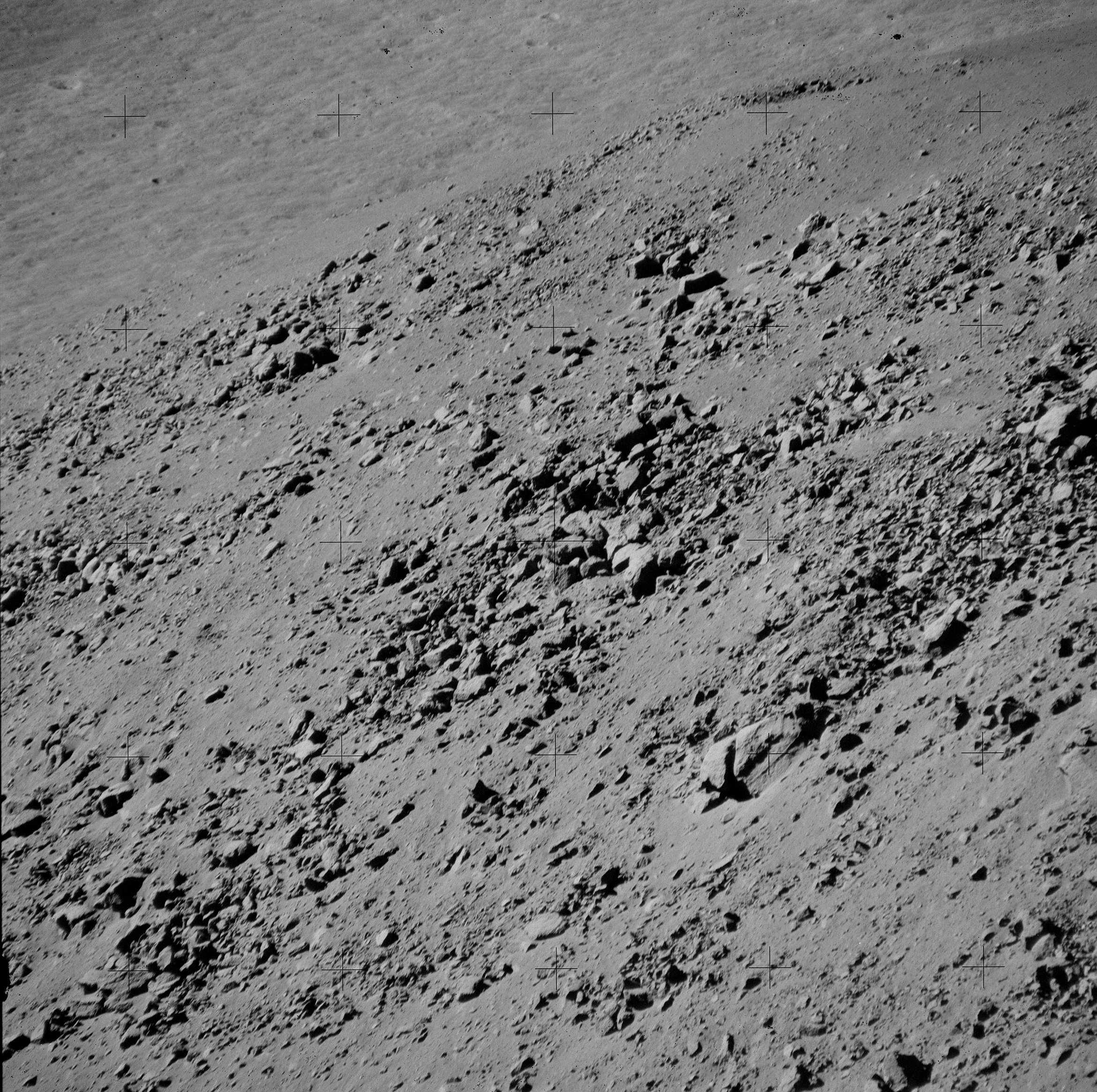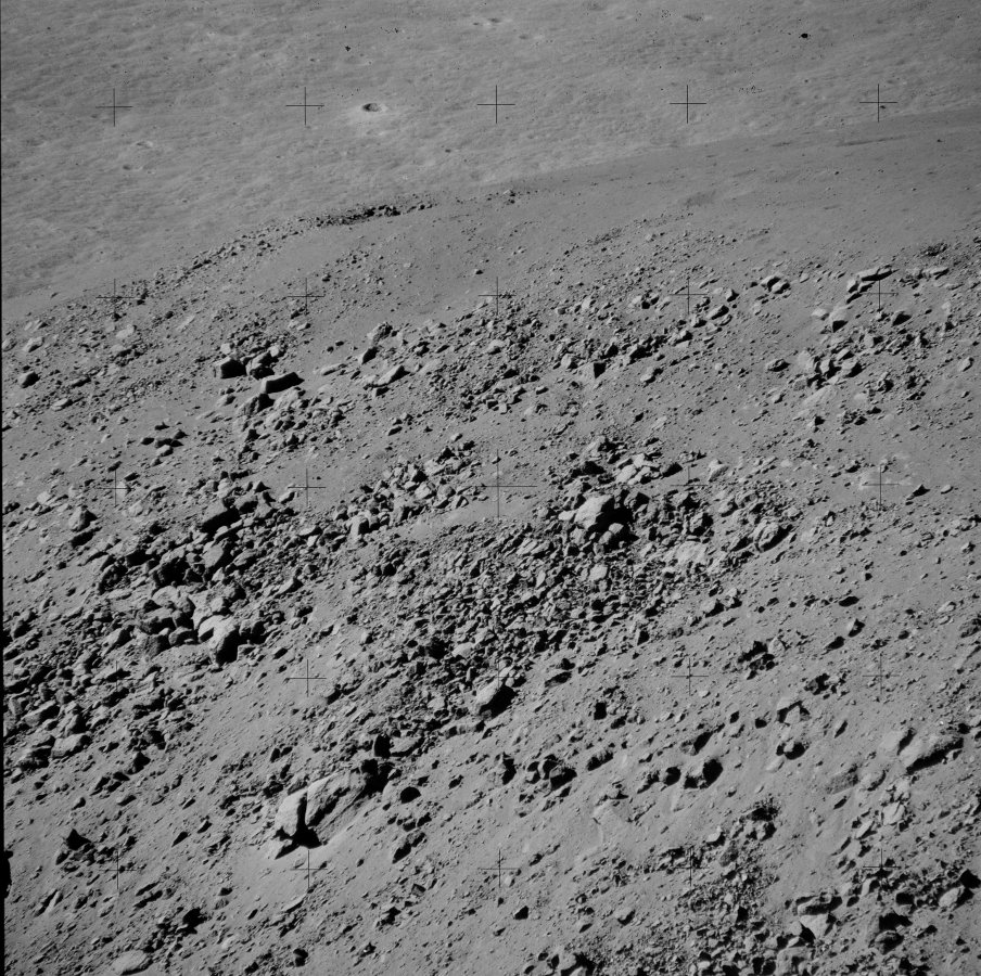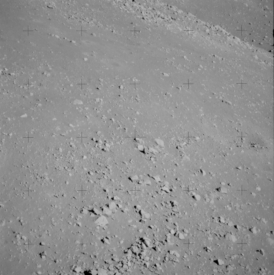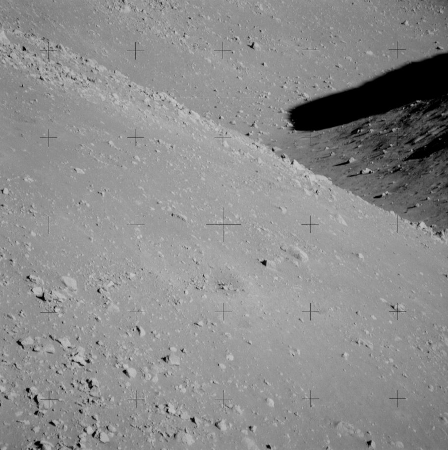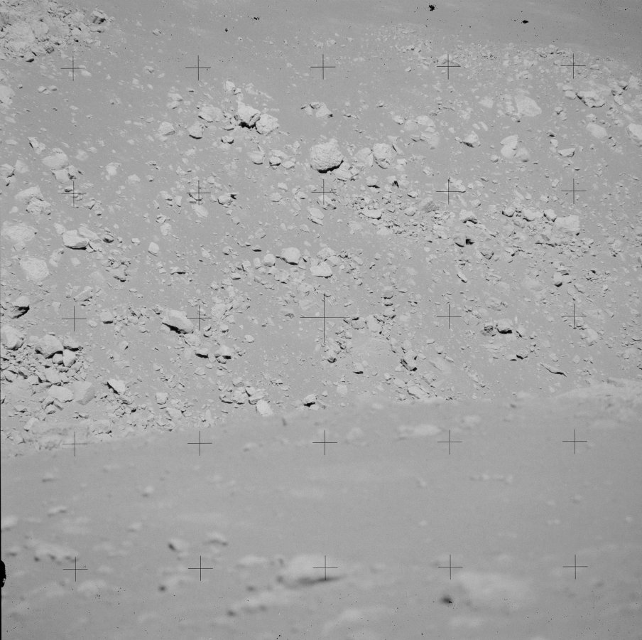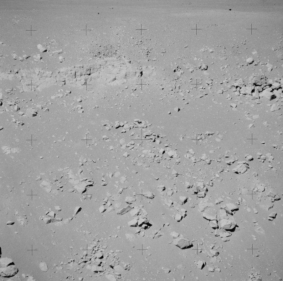 Stephen Tellier scanned a portion of Pan Camera frame 9798, which was taken during CSM Rev 38 at about 151:37. At that time, Dave and Jim were in the LM after the completion of EVA-2. A prominent feature of this image is the darkening of the soil around the LM and along a corridor extending from the LM toward 11 o'clock. See a comparison with frame 9377 by Markus Mehring, who has processed the images to account for differing orientations, different scales due to differing CSM-LM ranges, and different foreshortening due to differing CSM elevation angles. As Jack Schmitt discusses in the Apollo 17 commentary, the surface around the LM became brighter after being swept by the descent engine exhaust. As can be seen in photos taken on the surface, areas subsequently disturbed by the astronauts became relatively dark again. At locations relatively far from the LM, disturbed soil had the same brightness as undisturbed soil, another indication of brightening due to the engine exhaust.Rev. 50 Pan Camera 9809, North Detail ( 332k )