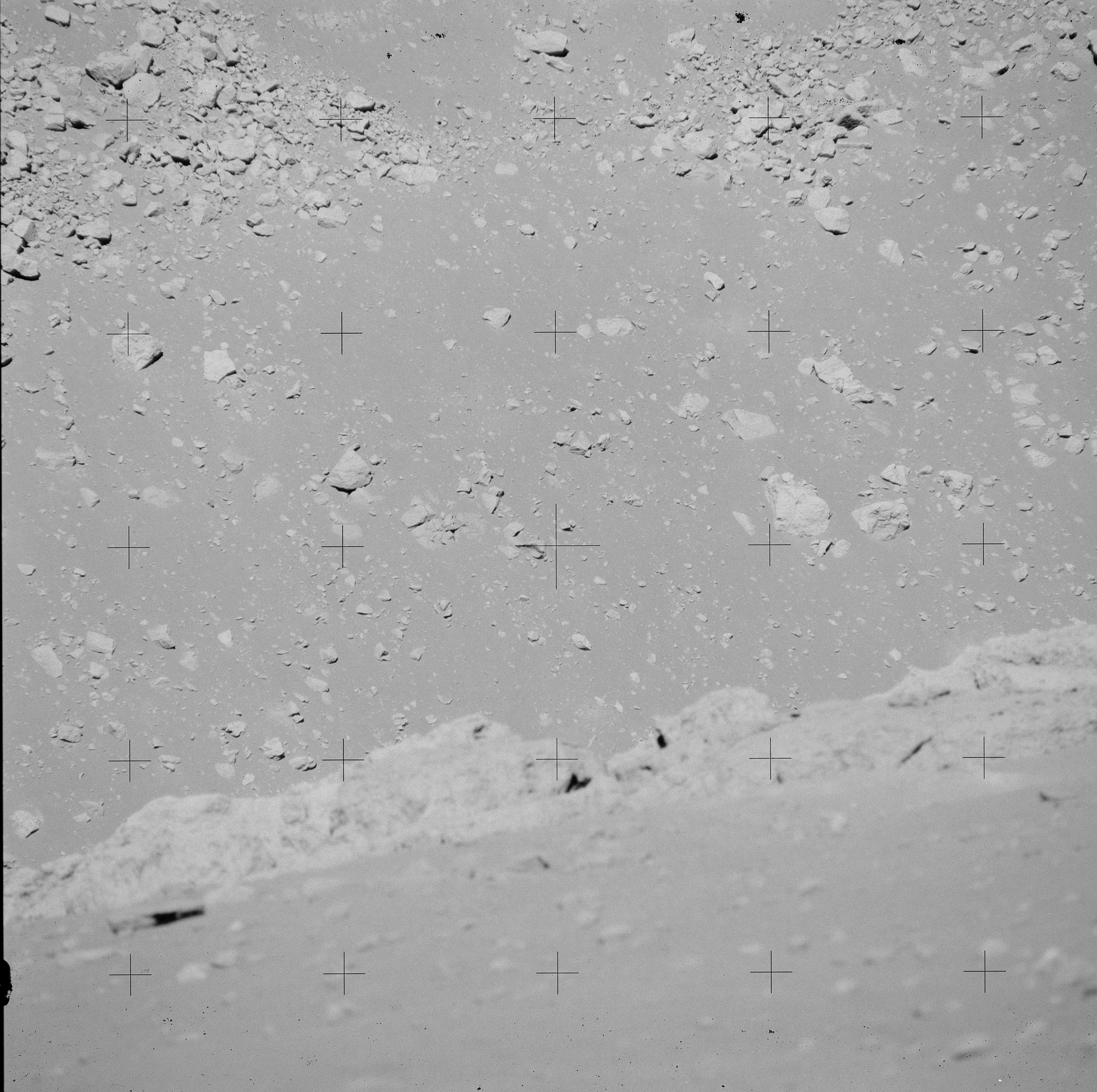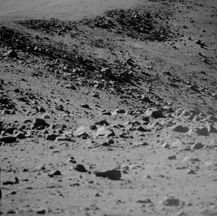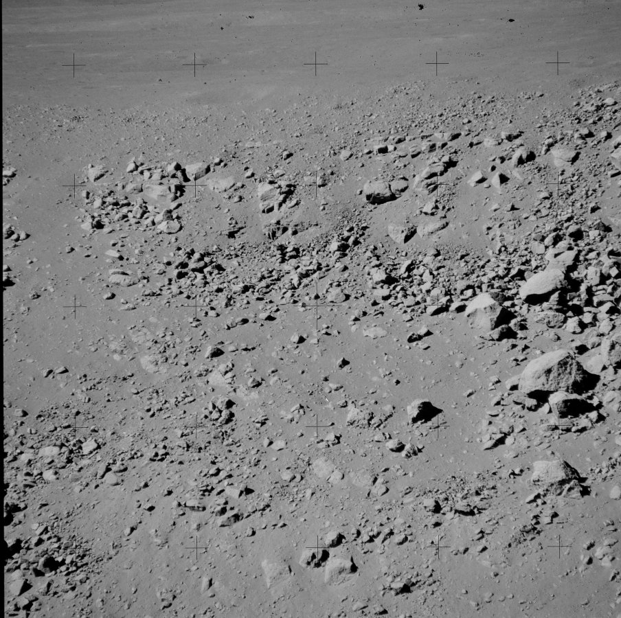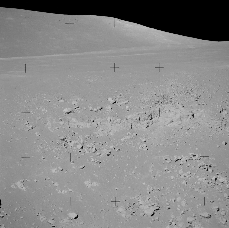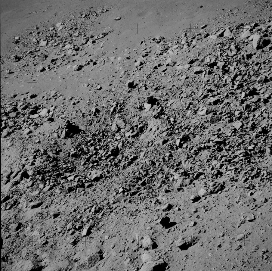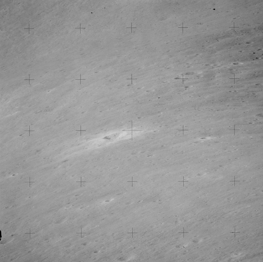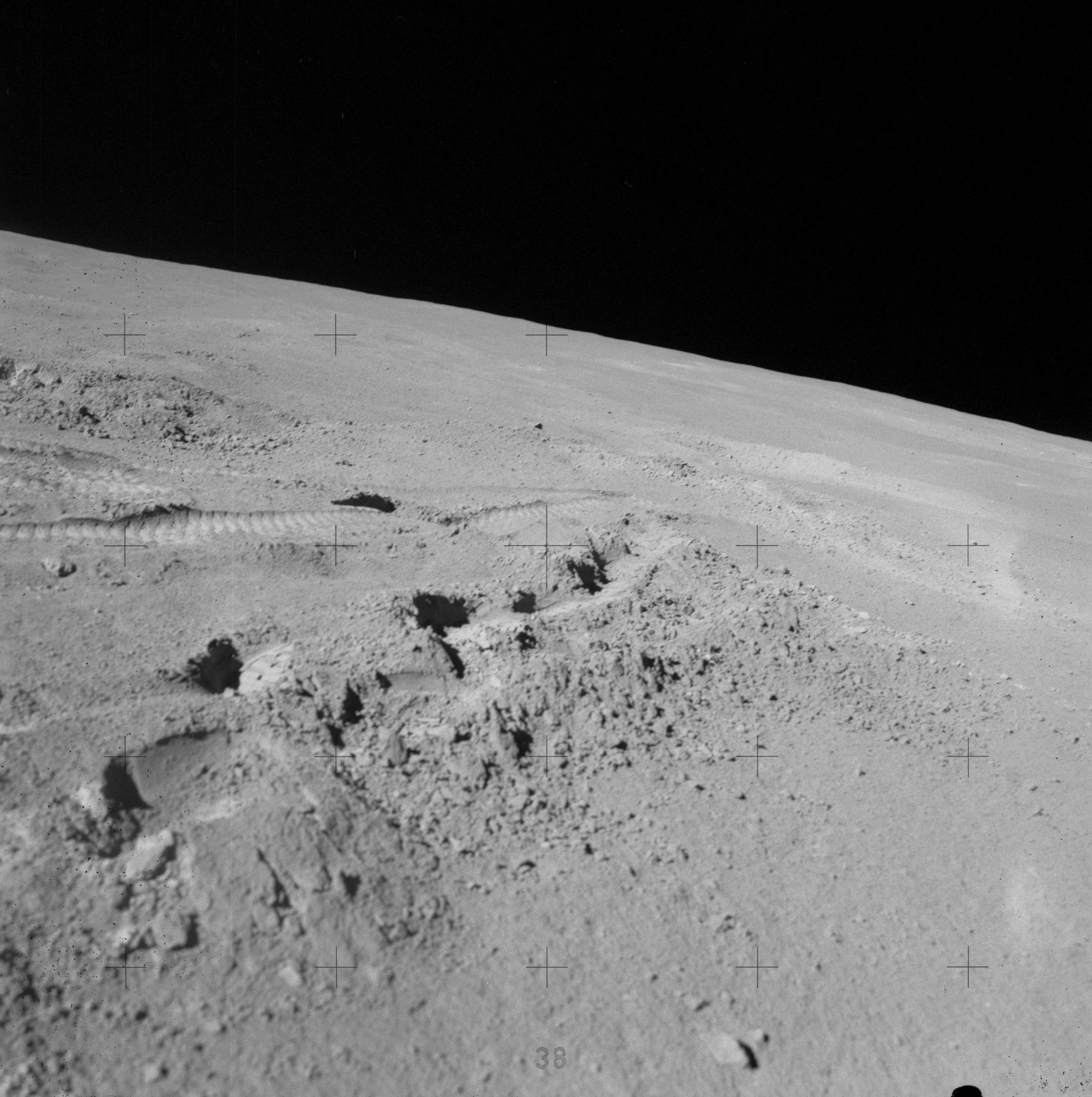 Stephen Tellier scanned a portion of Pan Camera frame 9798, which was taken during CSM Rev 38 at about 151:37. At that time, Dave and Jim were in the LM after the completion of EVA-2. A prominent feature of this image is the darkening of the soil around the LM and along a corridor extending from the LM toward 11 o'clock. See a comparison with frame 9377 by Markus Mehring, who has processed the images to account for differing orientations, different scales due to differing CSM-LM ranges, and different foreshortening due to differing CSM elevation angles. As Jack Schmitt discusses in the Apollo 17 commentary, the surface around the LM became brighter after being swept by the descent engine exhaust. As can be seen in photos taken on the surface, areas subsequently disturbed by the astronauts became relatively dark again. At locations relatively far from the LM, disturbed soil had the same brightness as undisturbed soil, another indication of brightening due to the engine exhaust.Rev. 50 Pan Camera 9809, North Detail ( 332k )