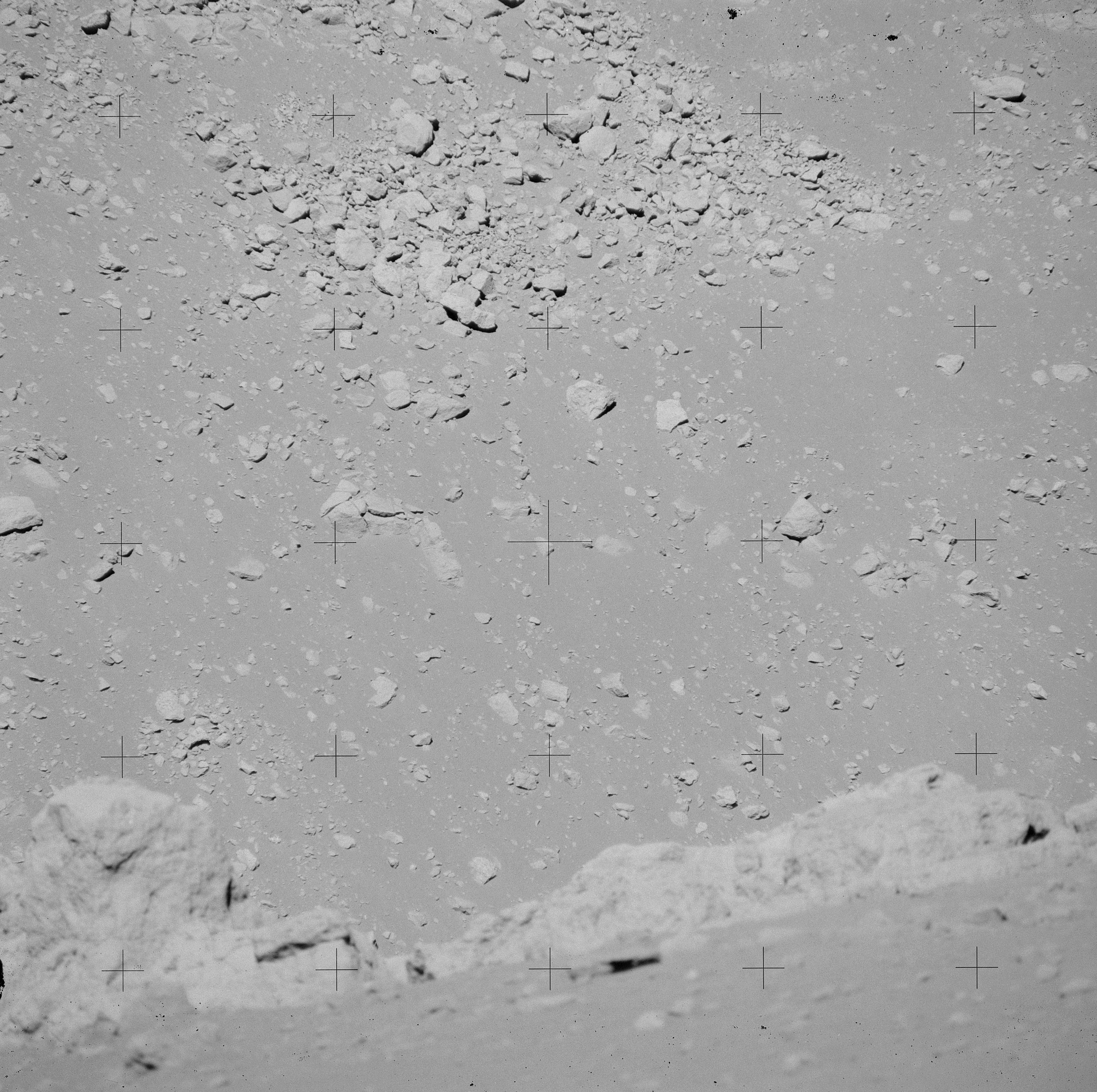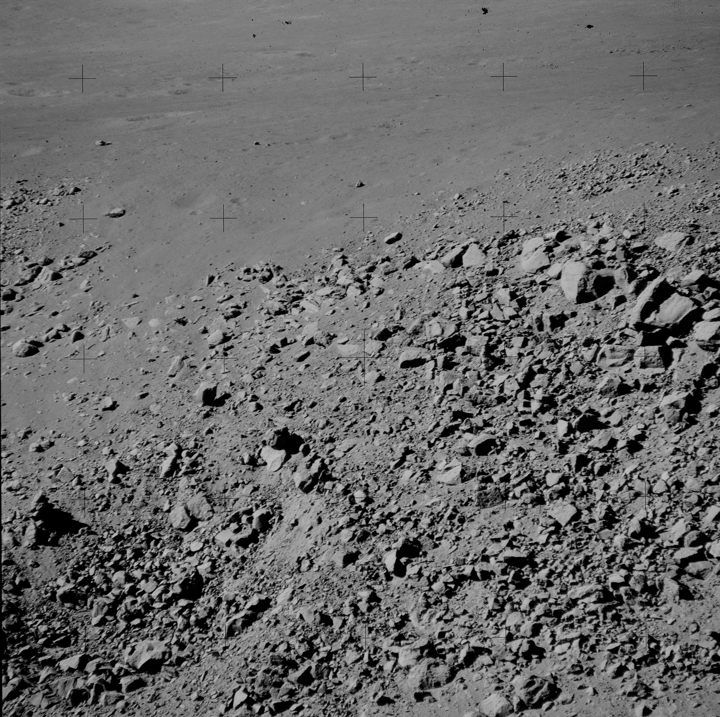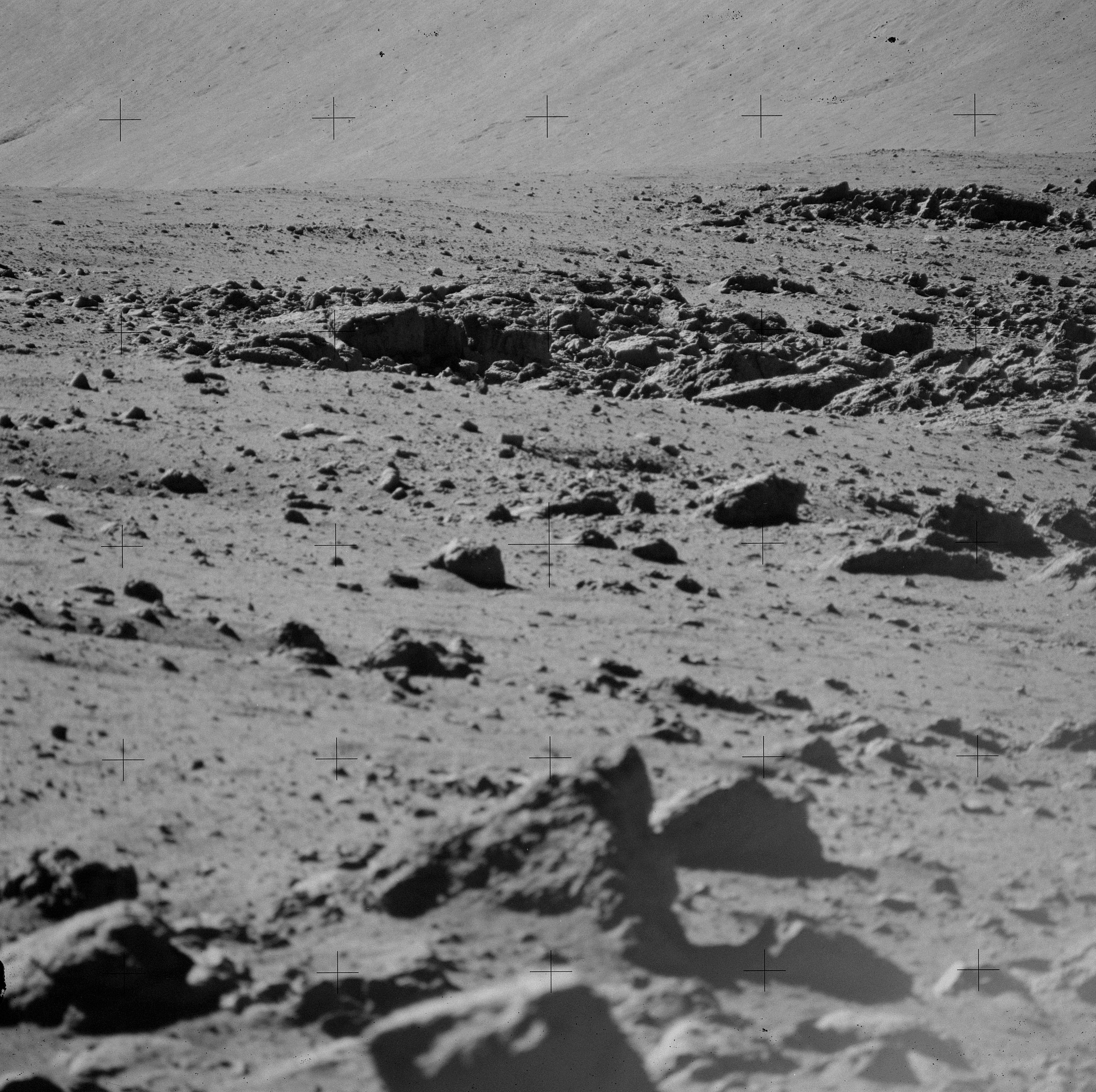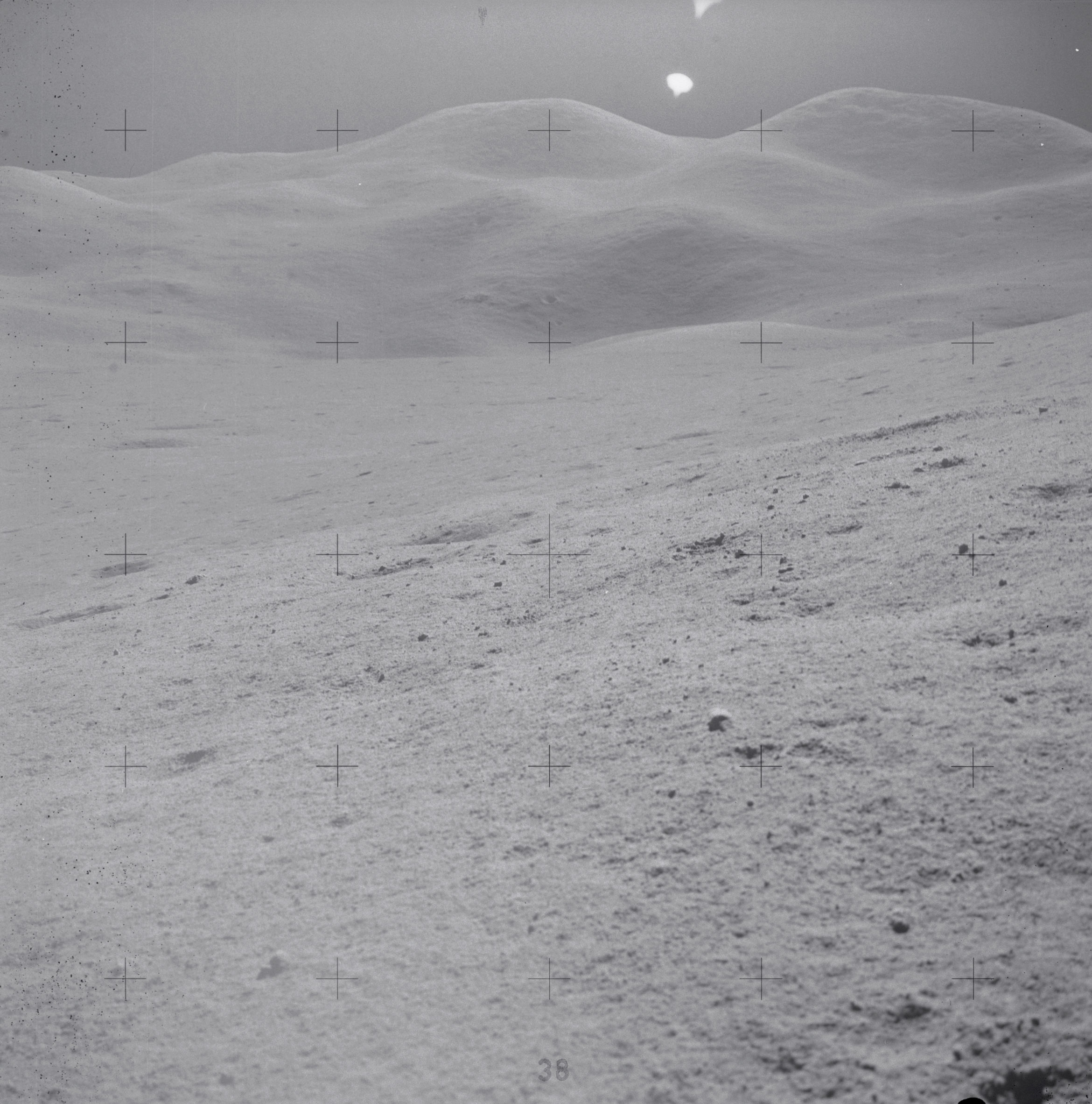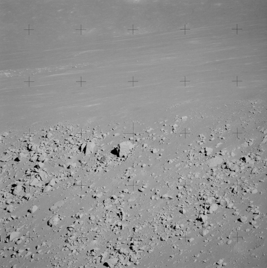 Stephen Tellier scanned a portion of Pan Camera frame 9798, which was taken during CSM Rev 38 at about 151:37. At that time, Dave and Jim were in the LM after the completion of EVA-2. A prominent feature of this image is the darkening of the soil around the LM and along a corridor extending from the LM toward 11 o'clock. See a comparison with frame 9377 by Markus Mehring, who has processed the images to account for differing orientations, different scales due to differing CSM-LM ranges, and different foreshortening due to differing CSM elevation angles. As Jack Schmitt discusses in the Apollo 17 commentary, the surface around the LM became brighter after being swept by the descent engine exhaust. As can be seen in photos taken on the surface, areas subsequently disturbed by the astronauts became relatively dark again. At locations relatively far from the LM, disturbed soil had the same brightness as undisturbed soil, another indication of brightening due to the engine exhaust.Rev. 50 Pan Camera 9809, North Detail ( 332k )