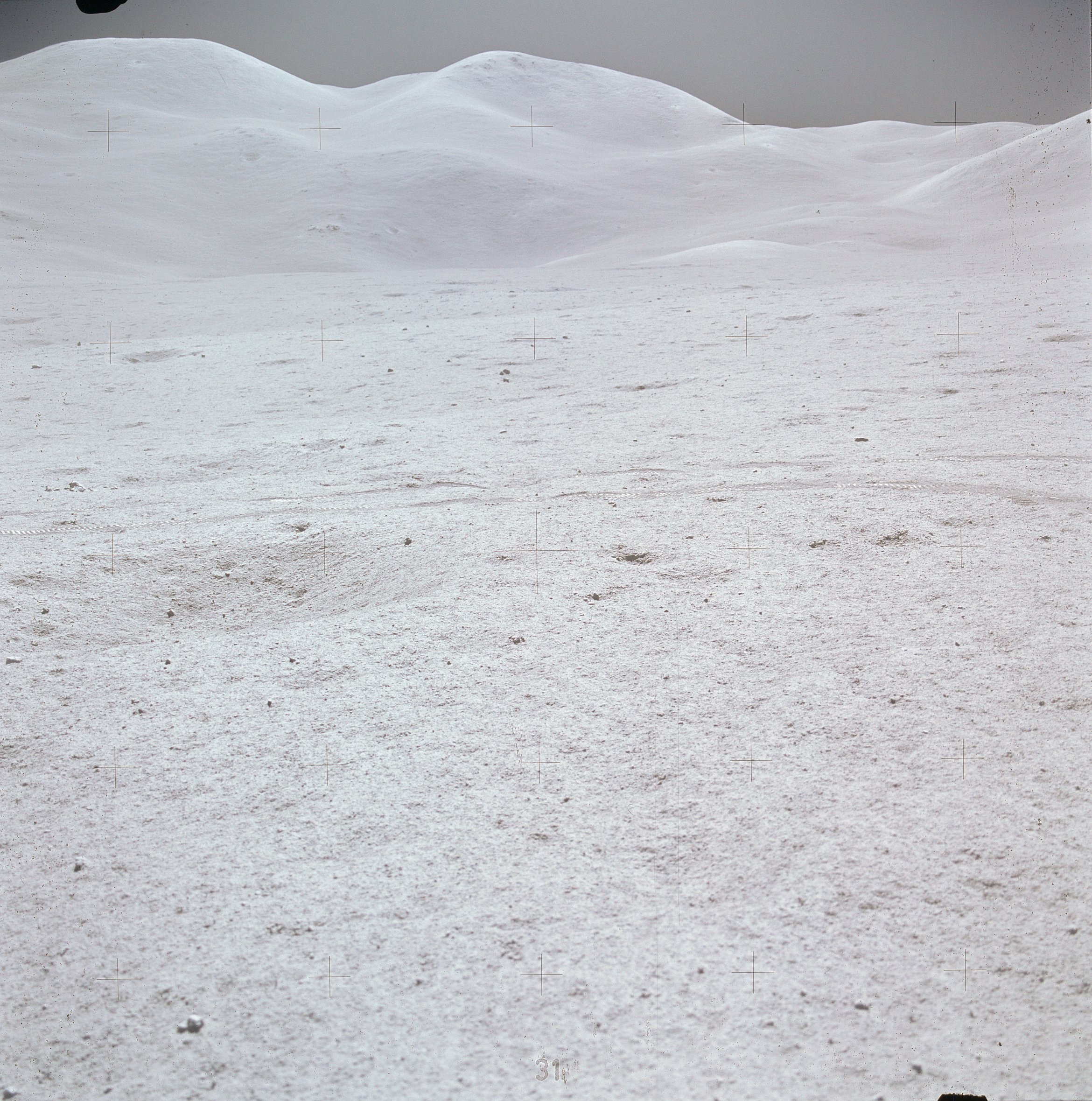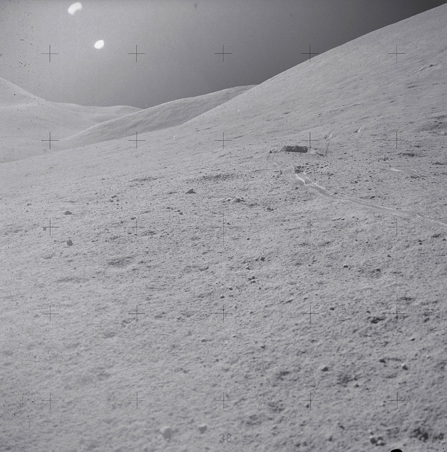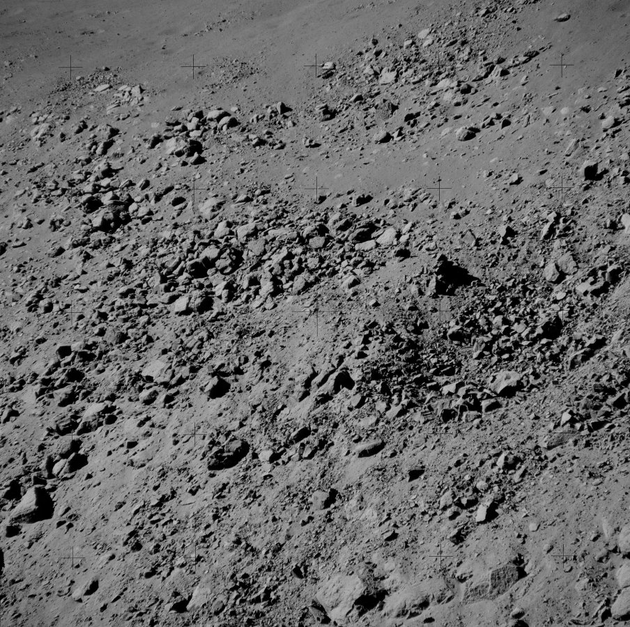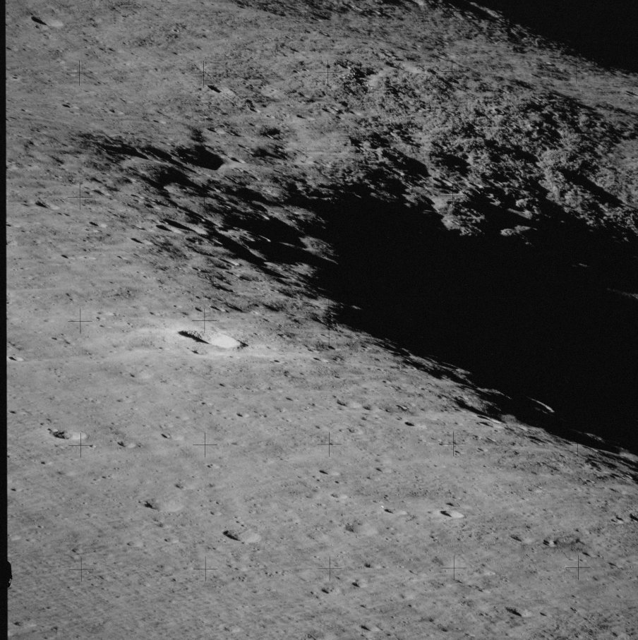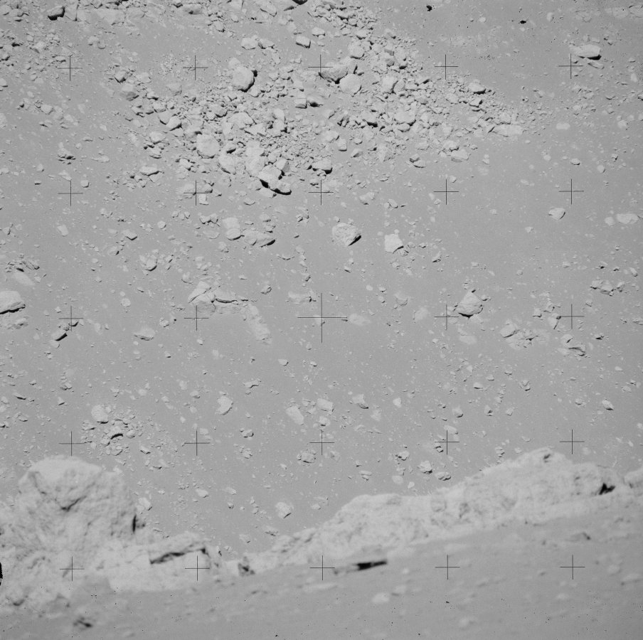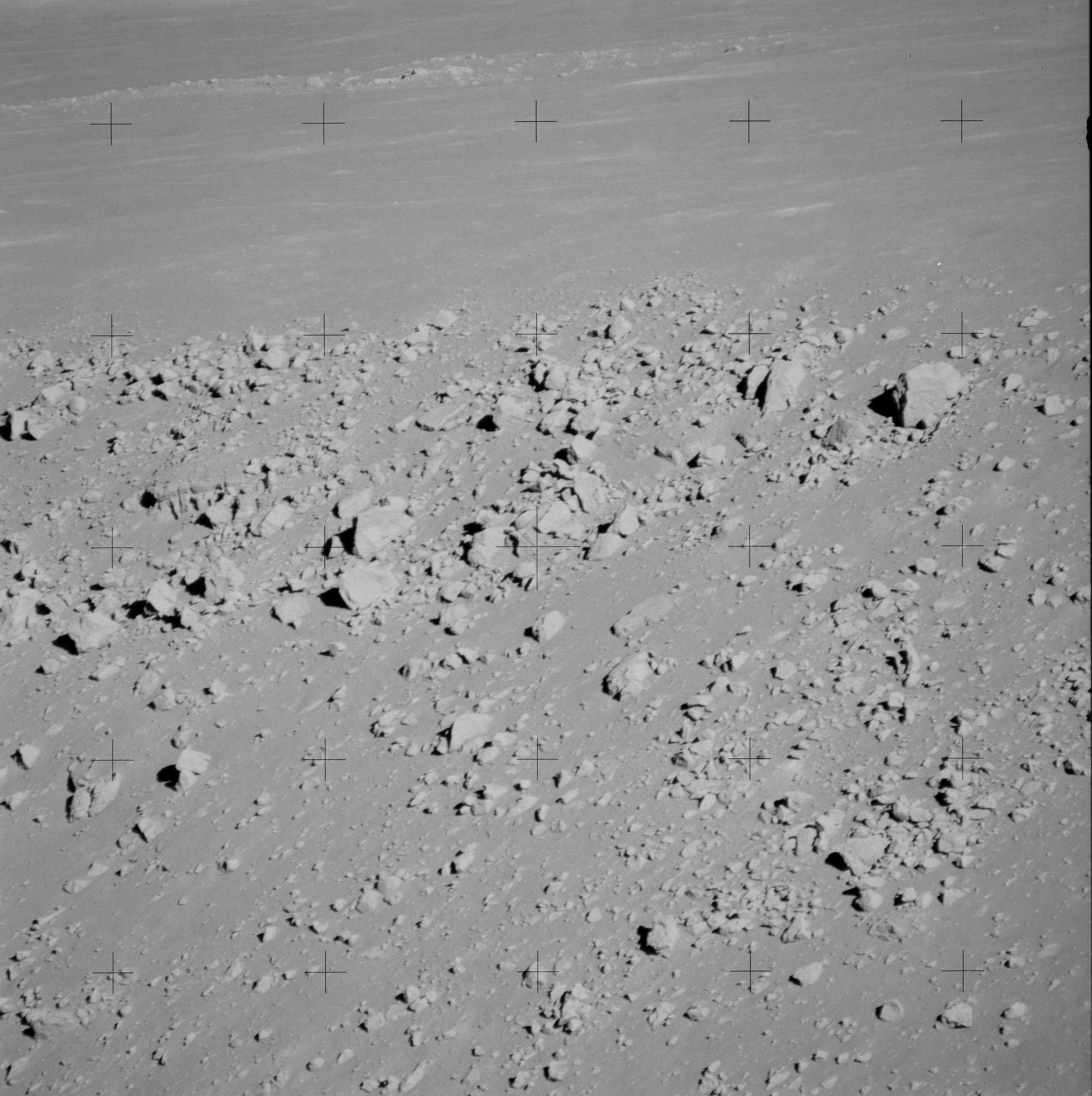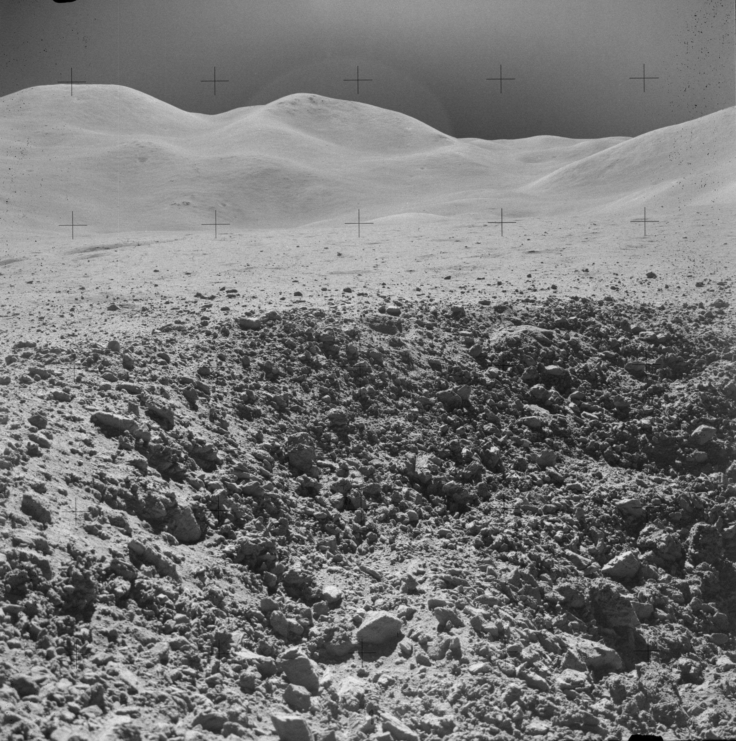 Stephen Tellier scanned a portion of Pan Camera frame 9798, which was taken during CSM Rev 38 at about 151:37. At that time, Dave and Jim were in the LM after the completion of EVA-2. A prominent feature of this image is the darkening of the soil around the LM and along a corridor extending from the LM toward 11 o'clock. See a comparison with frame 9377 by Markus Mehring, who has processed the images to account for differing orientations, different scales due to differing CSM-LM ranges, and different foreshortening due to differing CSM elevation angles. As Jack Schmitt discusses in the Apollo 17 commentary, the surface around the LM became brighter after being swept by the descent engine exhaust. As can be seen in photos taken on the surface, areas subsequently disturbed by the astronauts became relatively dark again. At locations relatively far from the LM, disturbed soil had the same brightness as undisturbed soil, another indication of brightening due to the engine exhaust.Rev. 50 Pan Camera 9809, North Detail ( 332k )
