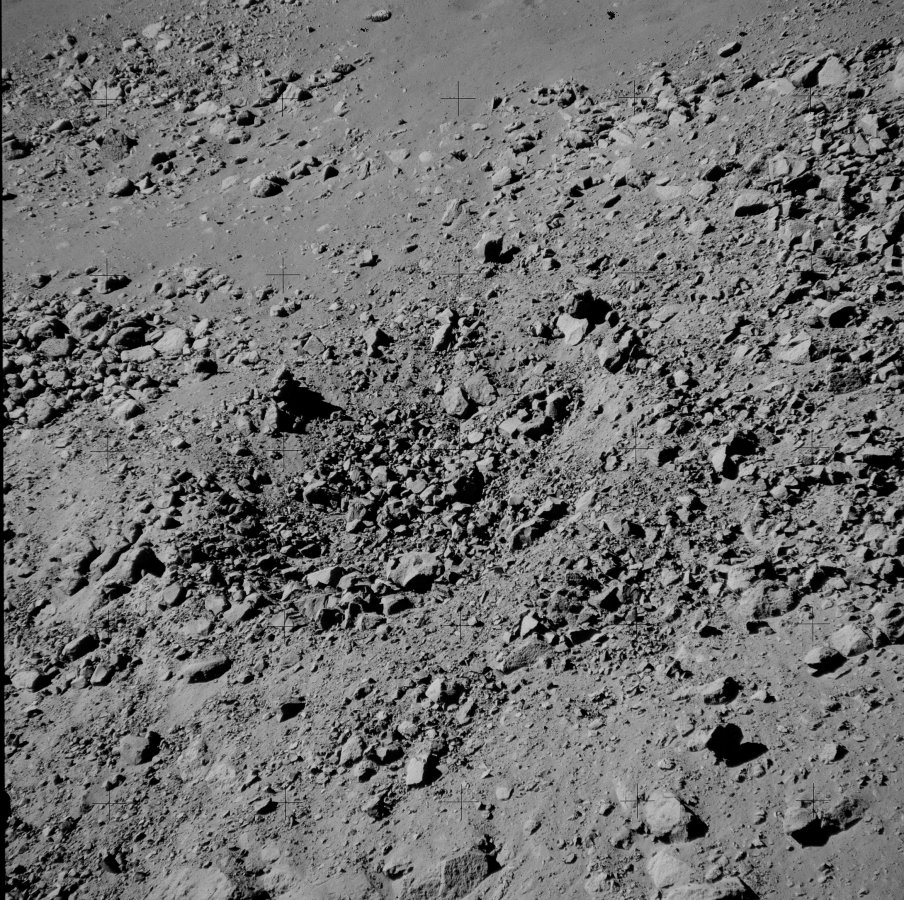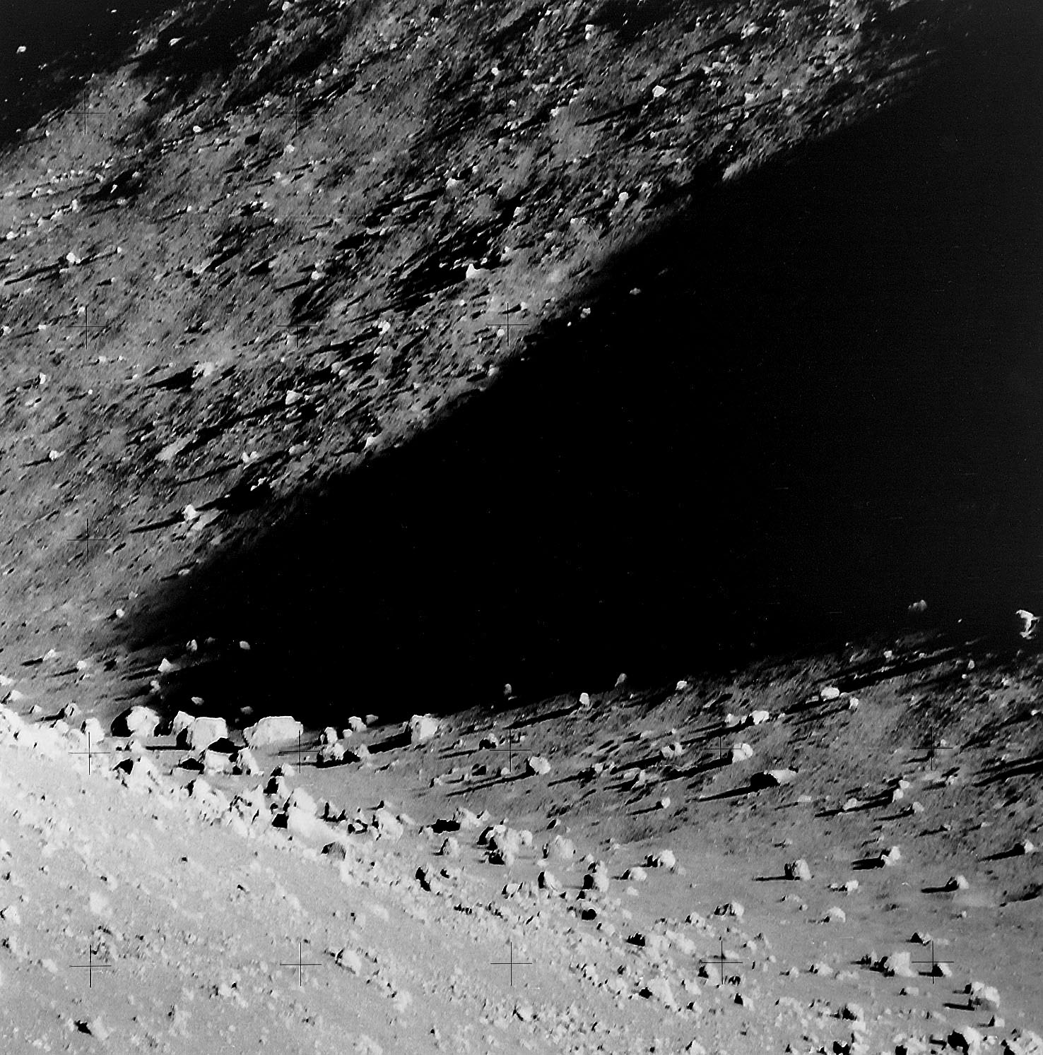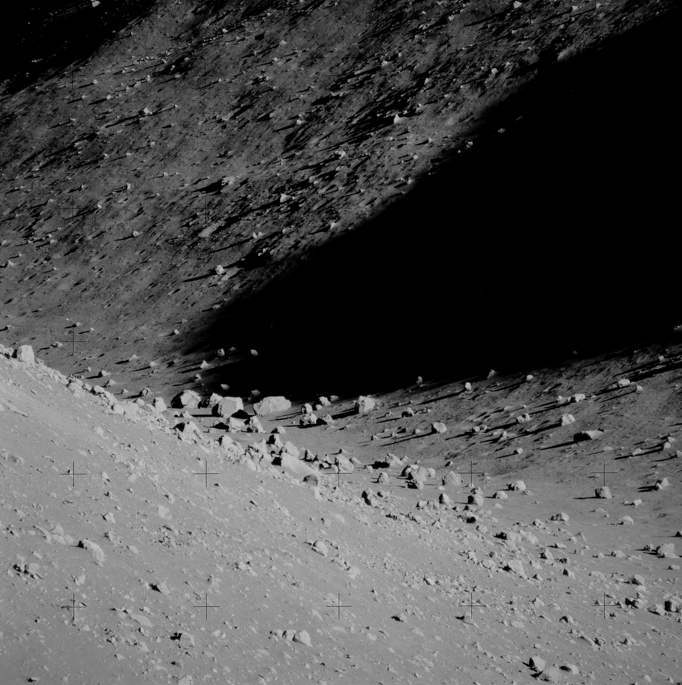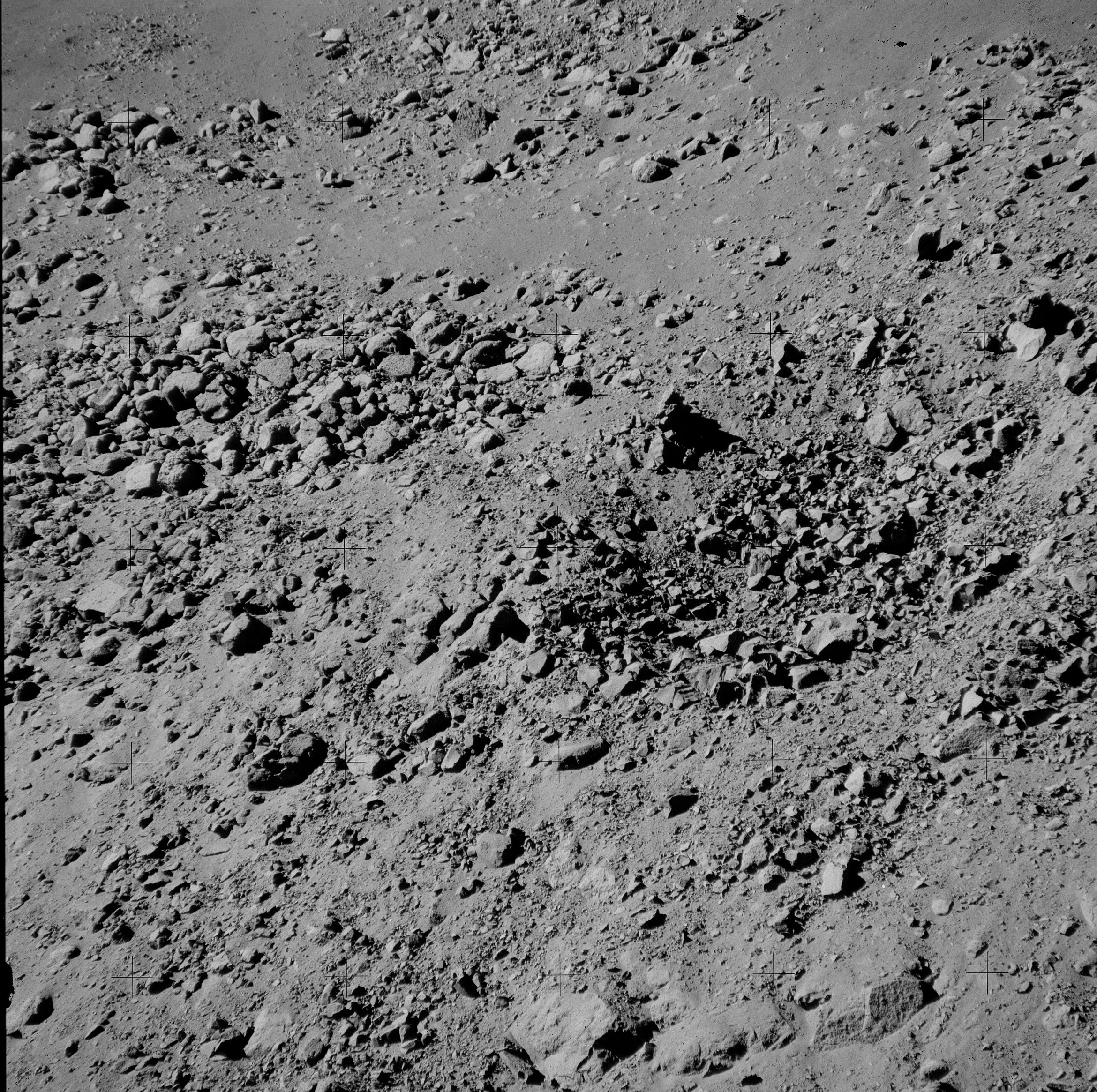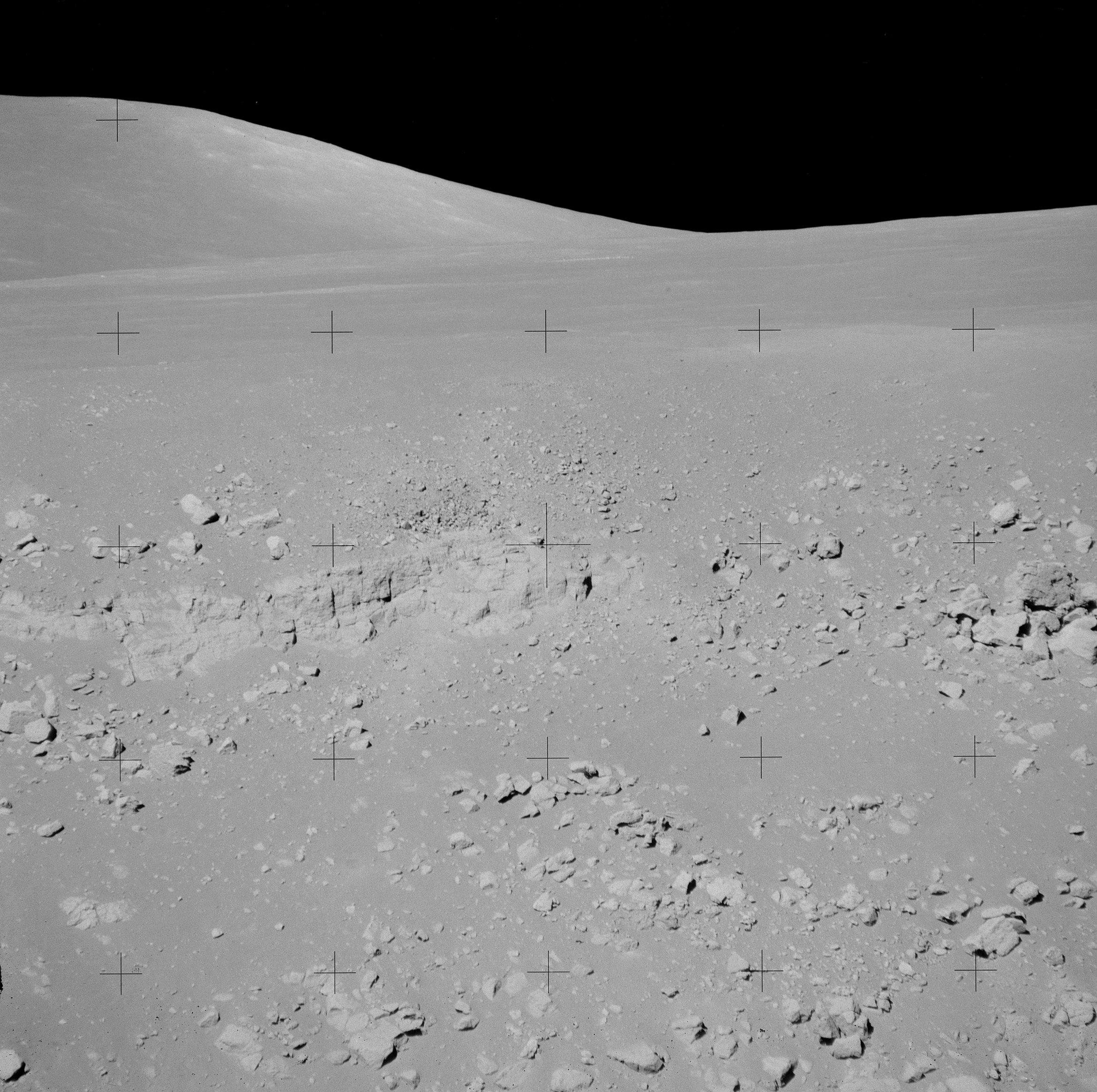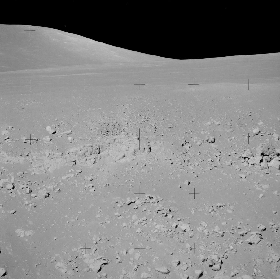 Stephen Tellier scanned a portion of Pan Camera frame 9798, which was taken during CSM Rev 38 at about 151:37. At that time, Dave and Jim were in the LM after the completion of EVA-2. A prominent feature of this image is the darkening of the soil around the LM and along a corridor extending from the LM toward 11 o'clock. See a comparison with frame 9377 by Markus Mehring, who has processed the images to account for differing orientations, different scales due to differing CSM-LM ranges, and different foreshortening due to differing CSM elevation angles. As Jack Schmitt discusses in the Apollo 17 commentary, the surface around the LM became brighter after being swept by the descent engine exhaust. As can be seen in photos taken on the surface, areas subsequently disturbed by the astronauts became relatively dark again. At locations relatively far from the LM, disturbed soil had the same brightness as undisturbed soil, another indication of brightening due to the engine exhaust.Rev. 50 Pan Camera 9809, North Detail ( 332k )