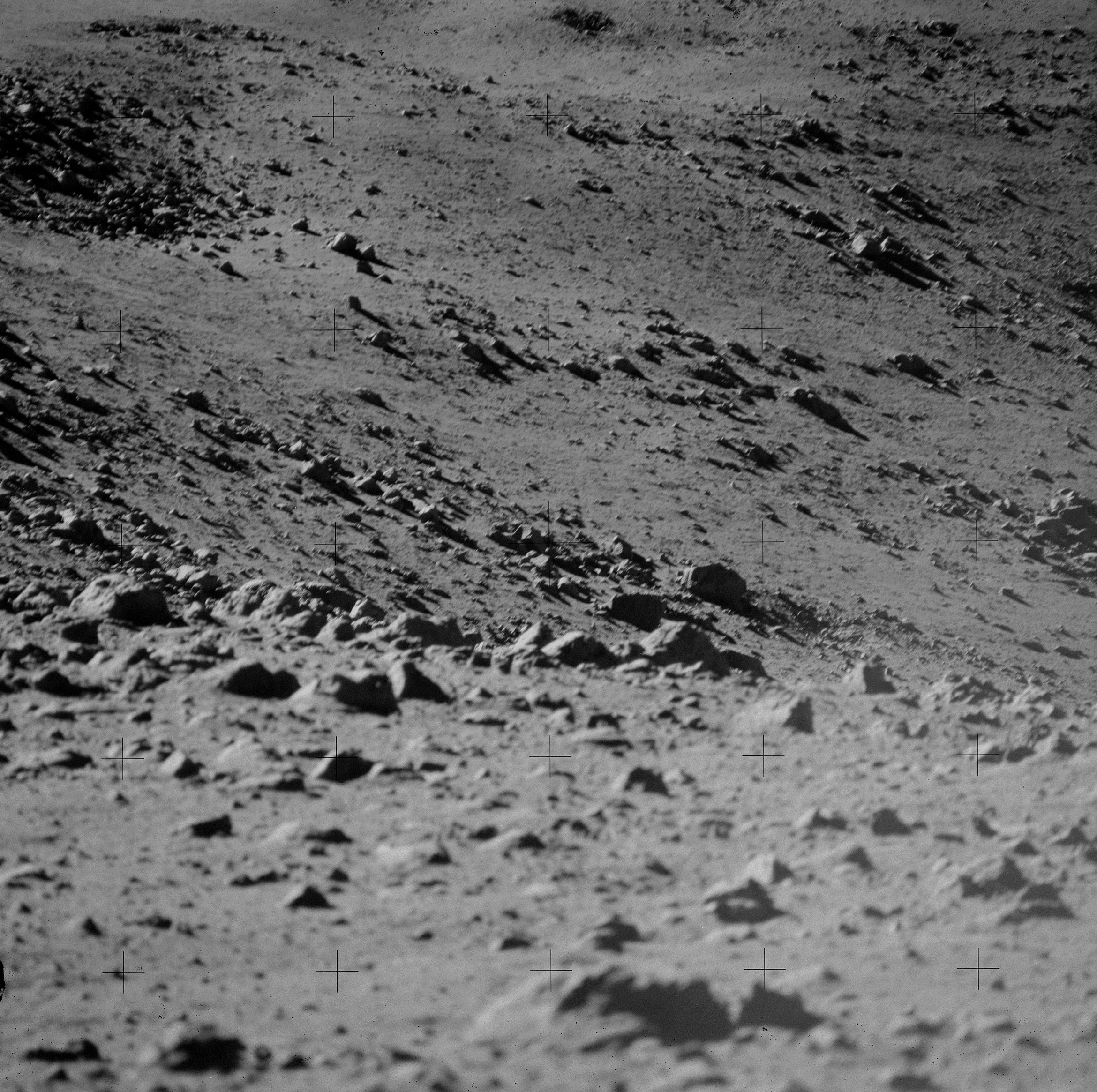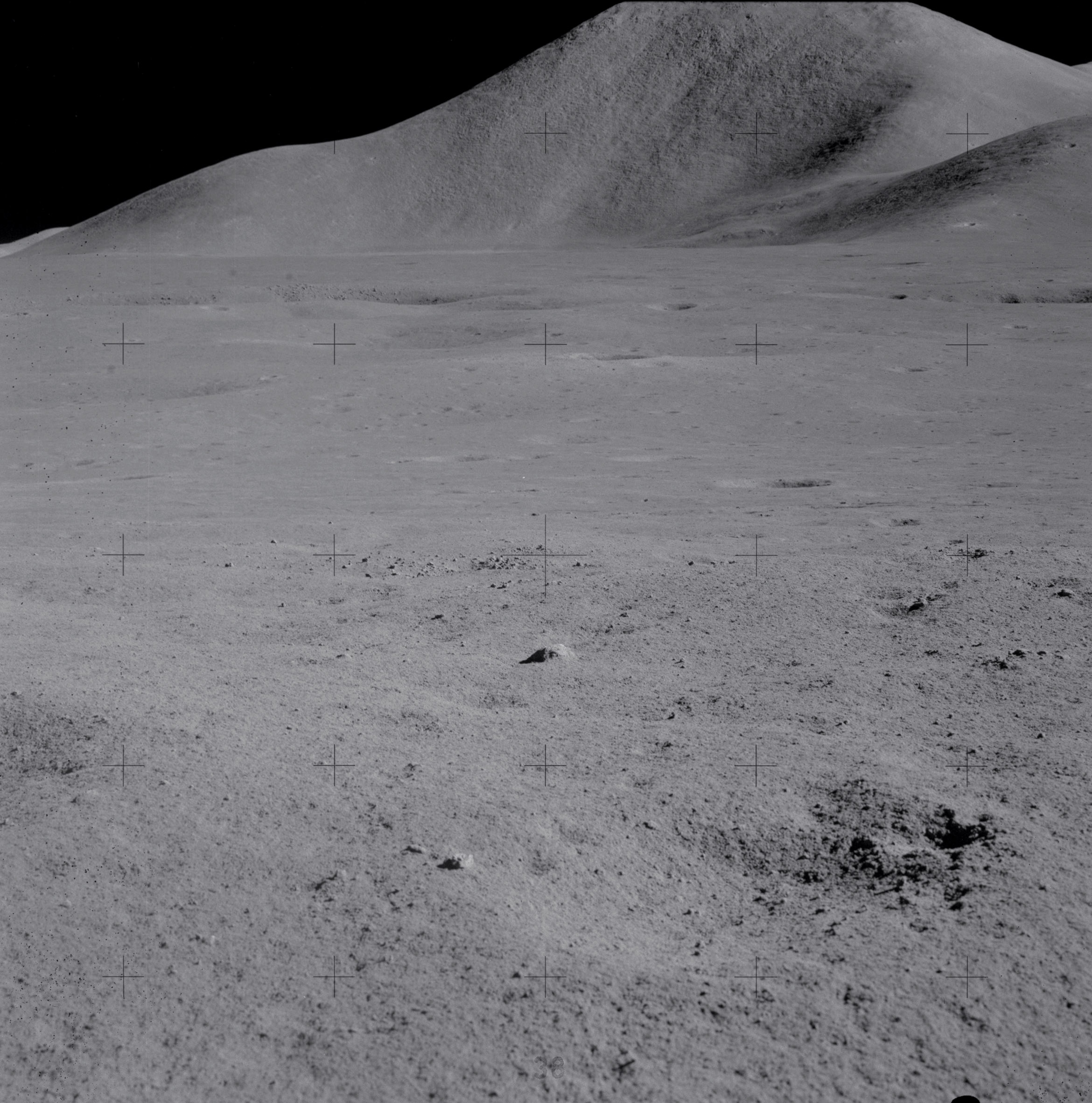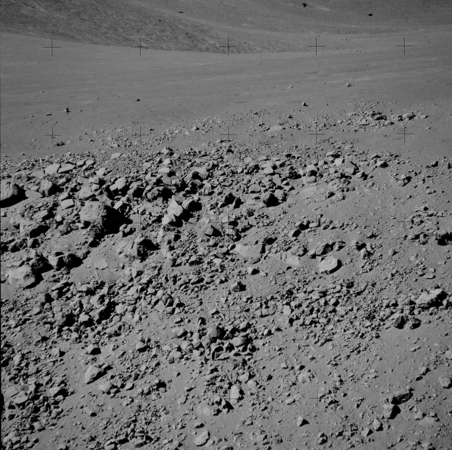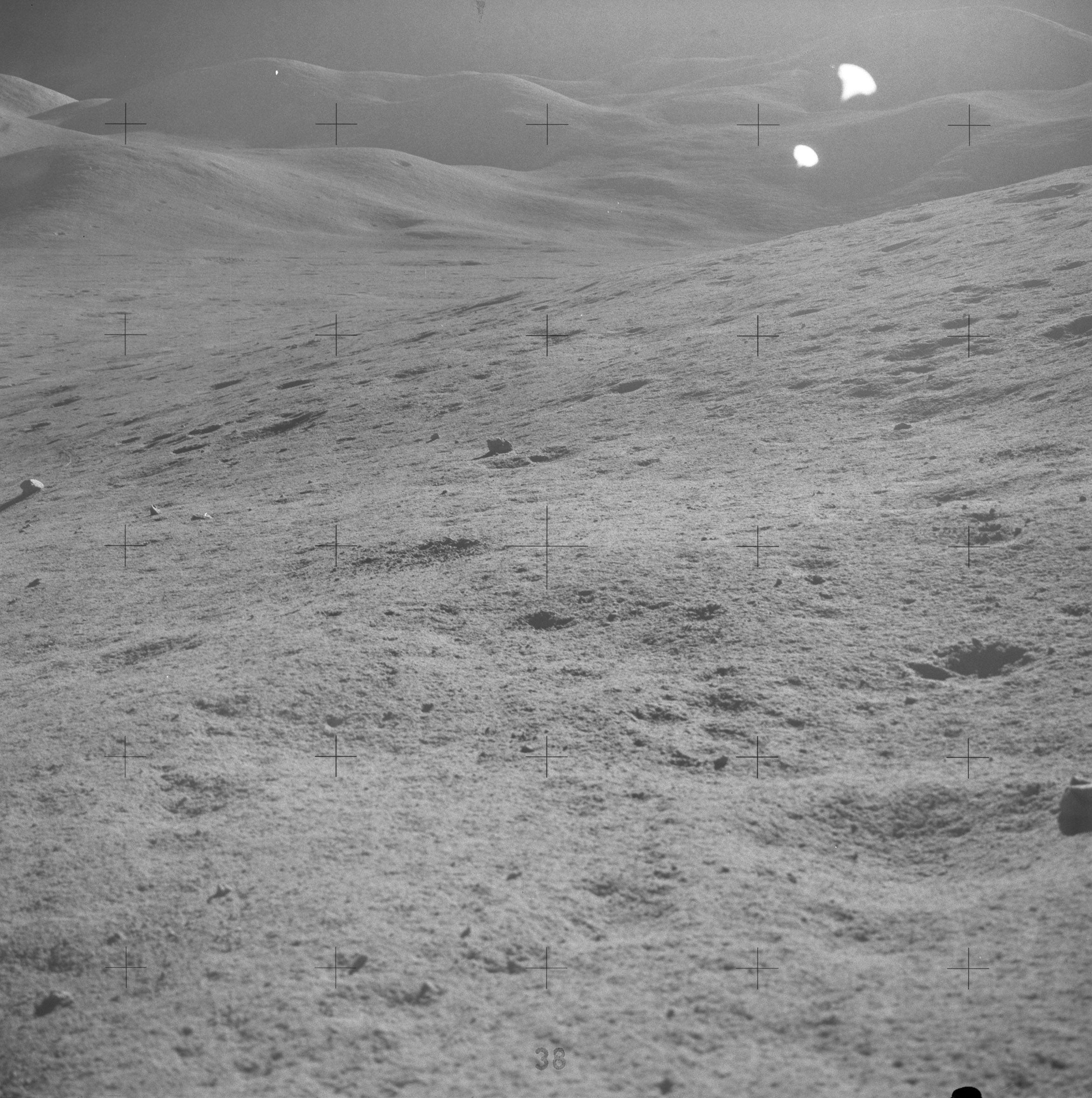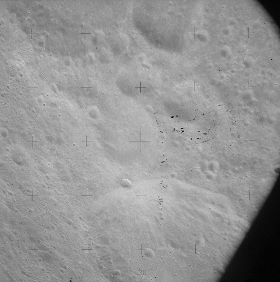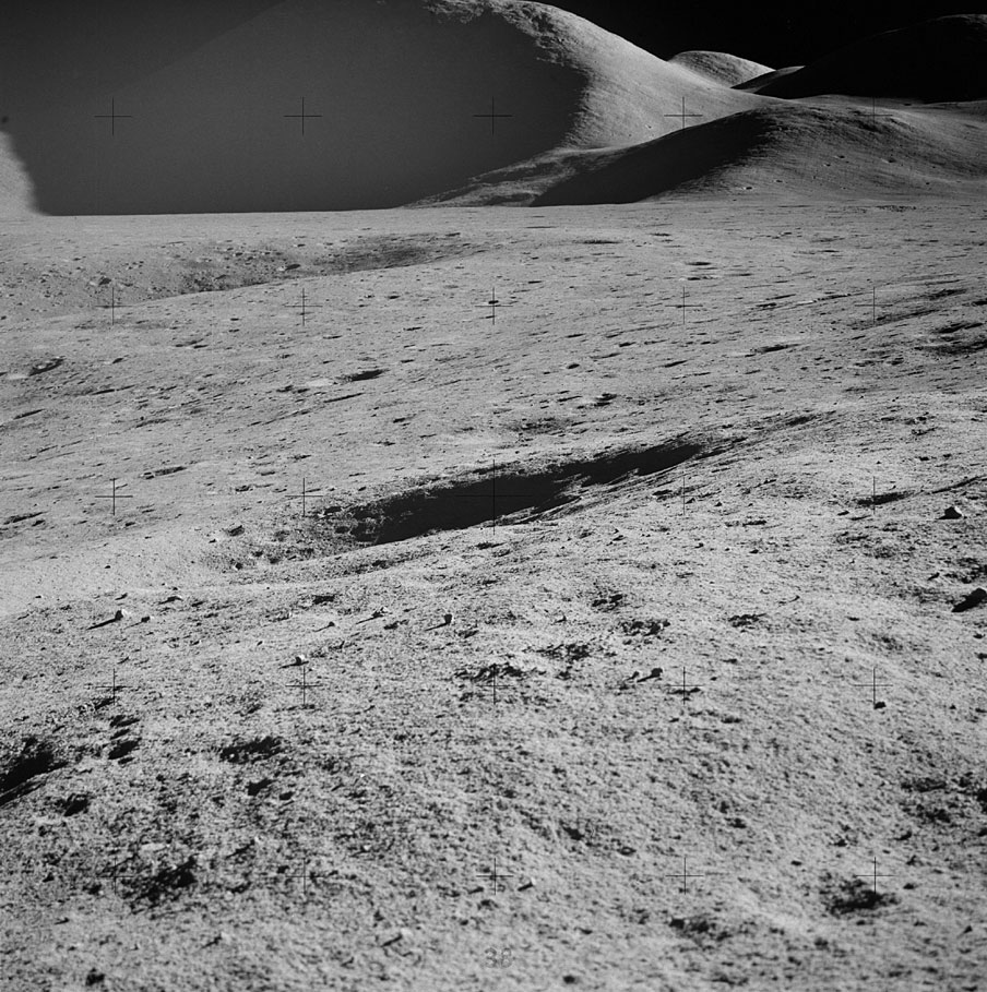 Stephen Tellier scanned a portion of Pan Camera frame 9798, which was taken during CSM Rev 38 at about 151:37. At that time, Dave and Jim were in the LM after the completion of EVA-2. A prominent feature of this image is the darkening of the soil around the LM and along a corridor extending from the LM toward 11 o'clock. See a comparison with frame 9377 by Markus Mehring, who has processed the images to account for differing orientations, different scales due to differing CSM-LM ranges, and different foreshortening due to differing CSM elevation angles. As Jack Schmitt discusses in the Apollo 17 commentary, the surface around the LM became brighter after being swept by the descent engine exhaust. As can be seen in photos taken on the surface, areas subsequently disturbed by the astronauts became relatively dark again. At locations relatively far from the LM, disturbed soil had the same brightness as undisturbed soil, another indication of brightening due to the engine exhaust.Rev. 50 Pan Camera 9809, North Detail ( 332k )