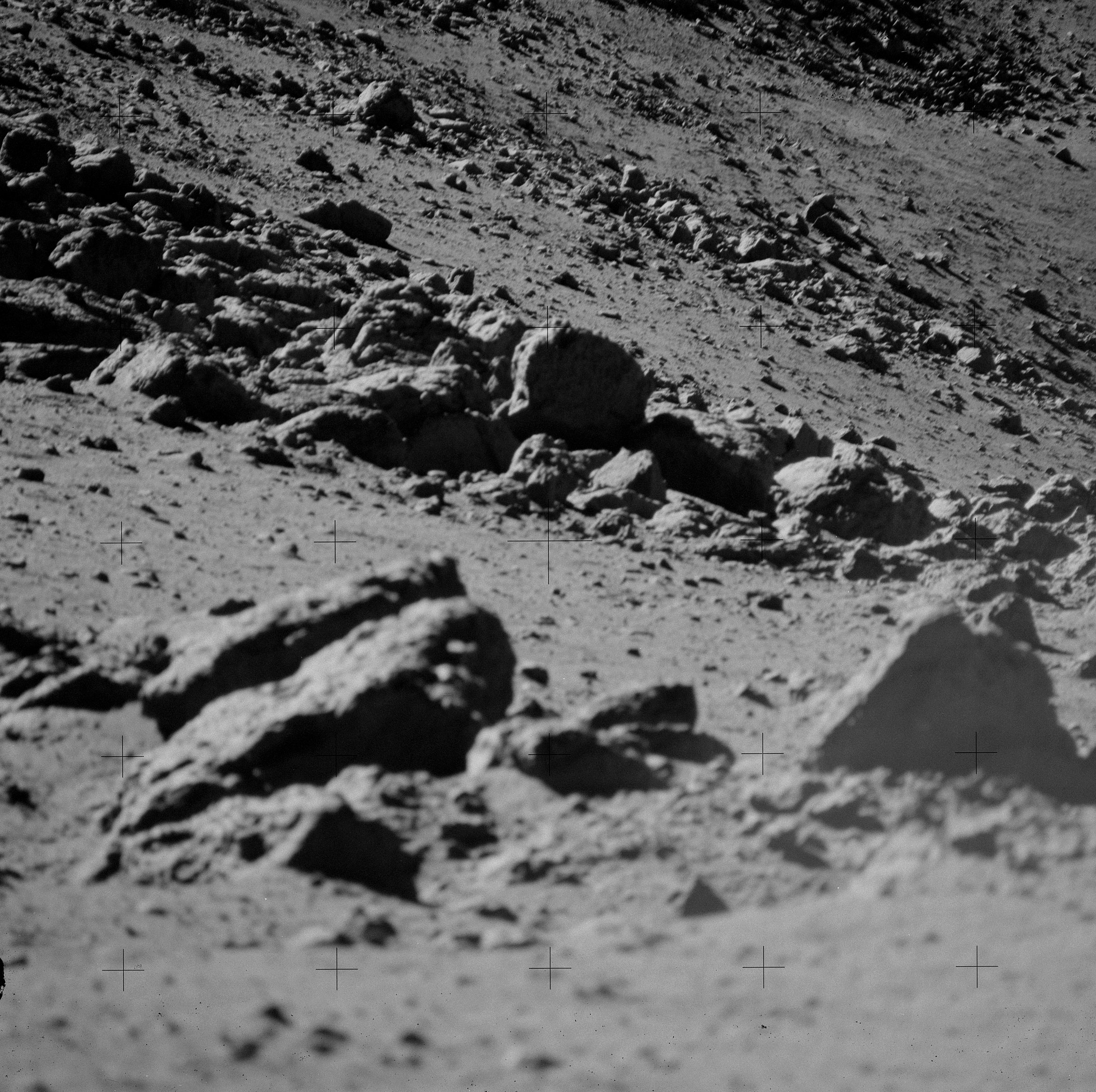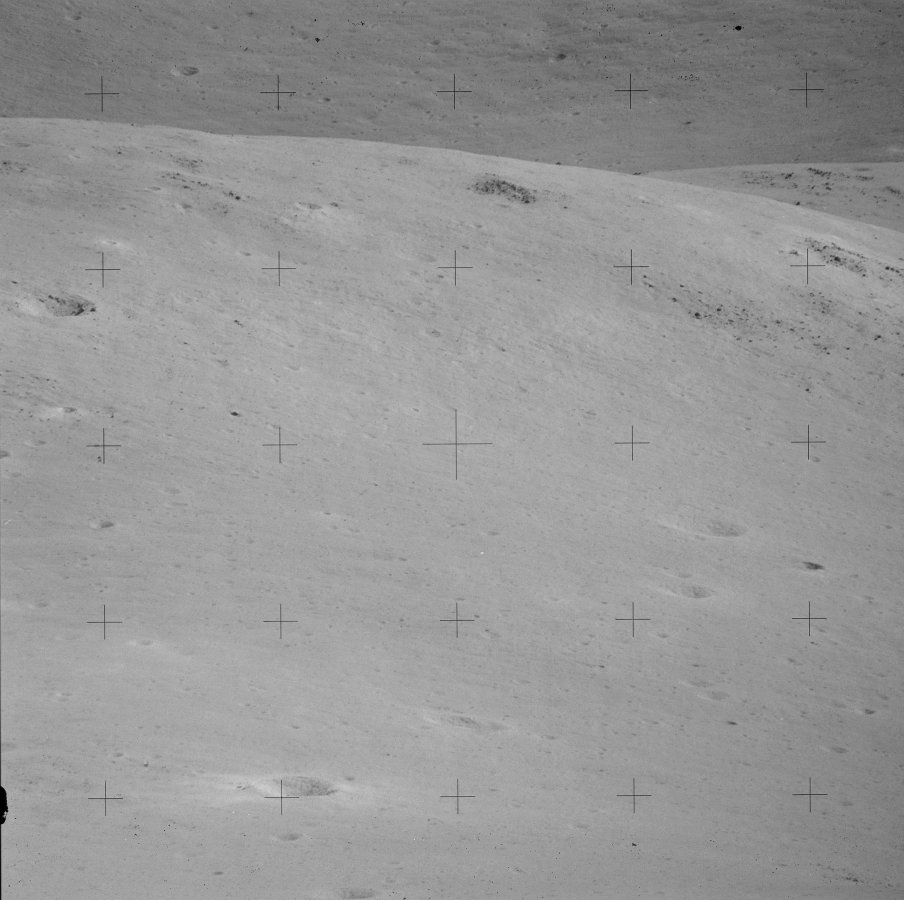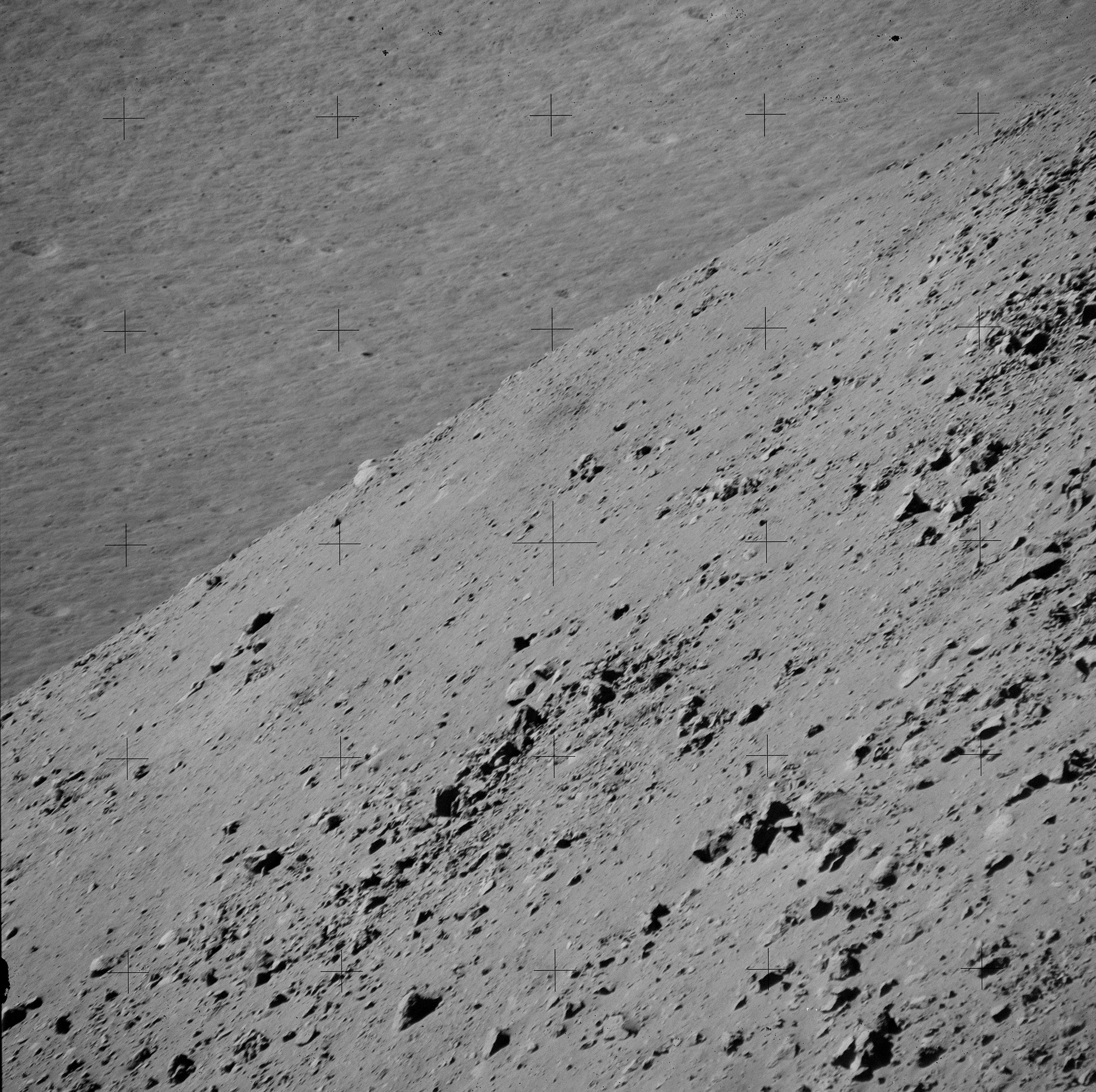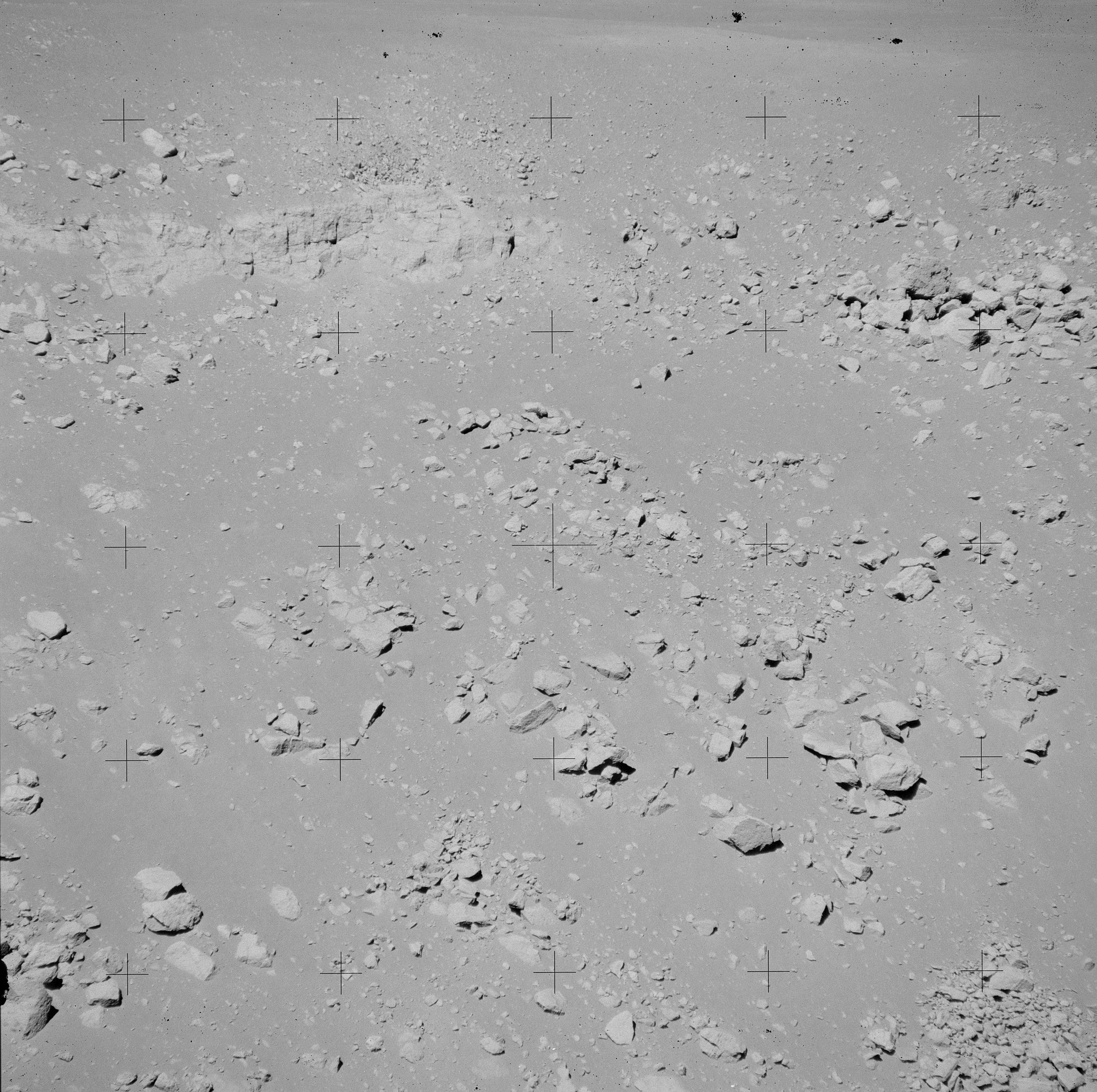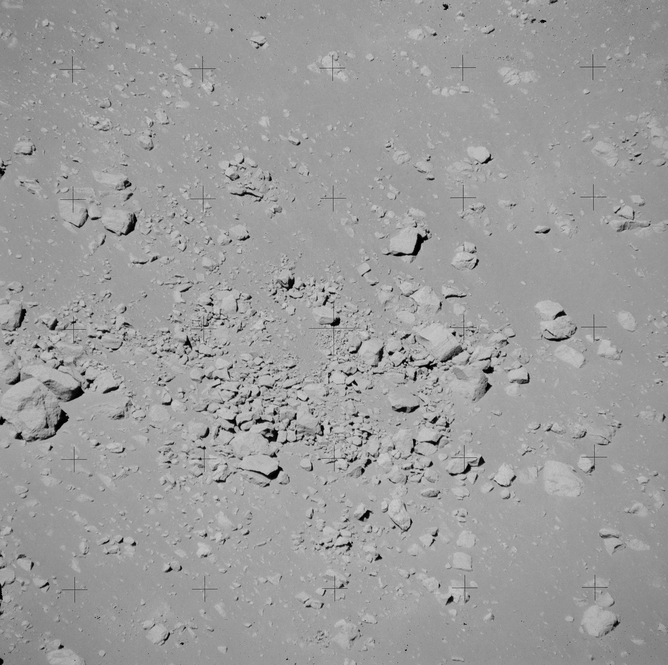 Stephen Tellier scanned a portion of Pan Camera frame 9798, which was taken during CSM Rev 38 at about 151:37. At that time, Dave and Jim were in the LM after the completion of EVA-2. A prominent feature of this image is the darkening of the soil around the LM and along a corridor extending from the LM toward 11 o'clock. See a comparison with frame 9377 by Markus Mehring, who has processed the images to account for differing orientations, different scales due to differing CSM-LM ranges, and different foreshortening due to differing CSM elevation angles. As Jack Schmitt discusses in the Apollo 17 commentary, the surface around the LM became brighter after being swept by the descent engine exhaust. As can be seen in photos taken on the surface, areas subsequently disturbed by the astronauts became relatively dark again. At locations relatively far from the LM, disturbed soil had the same brightness as undisturbed soil, another indication of brightening due to the engine exhaust.Rev. 50 Pan Camera 9809, North Detail ( 332k )