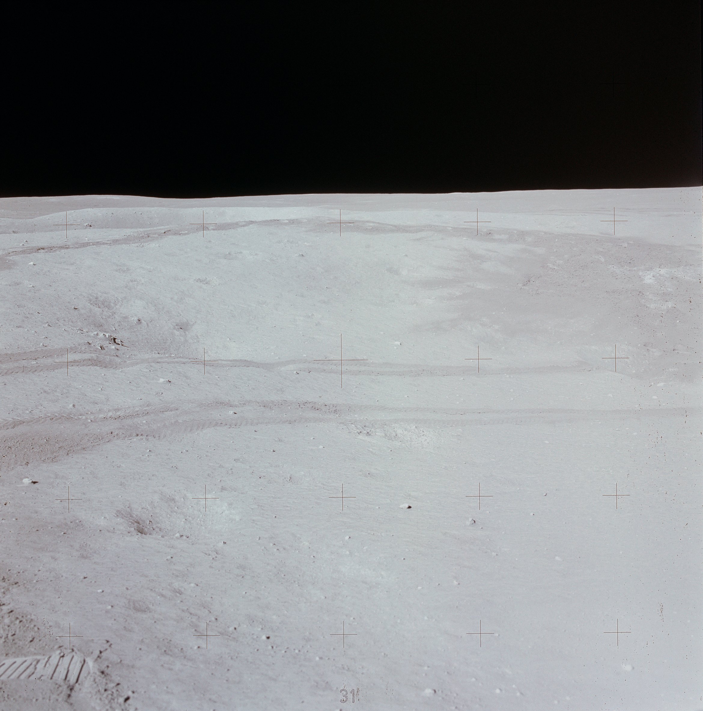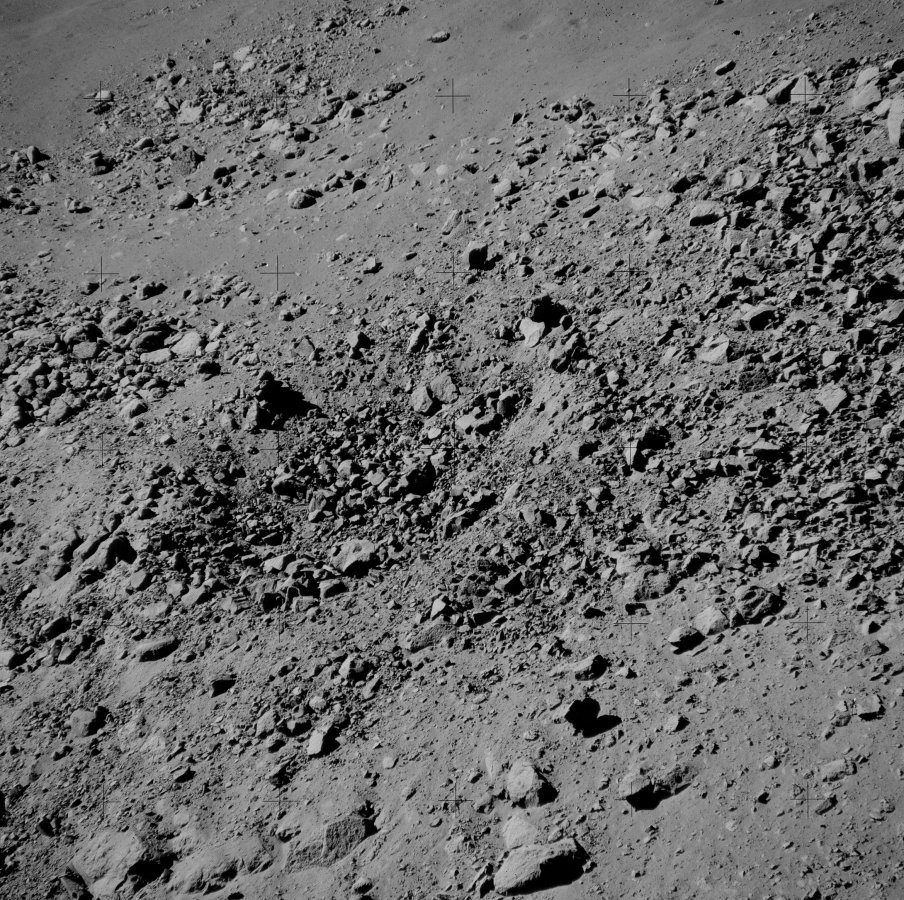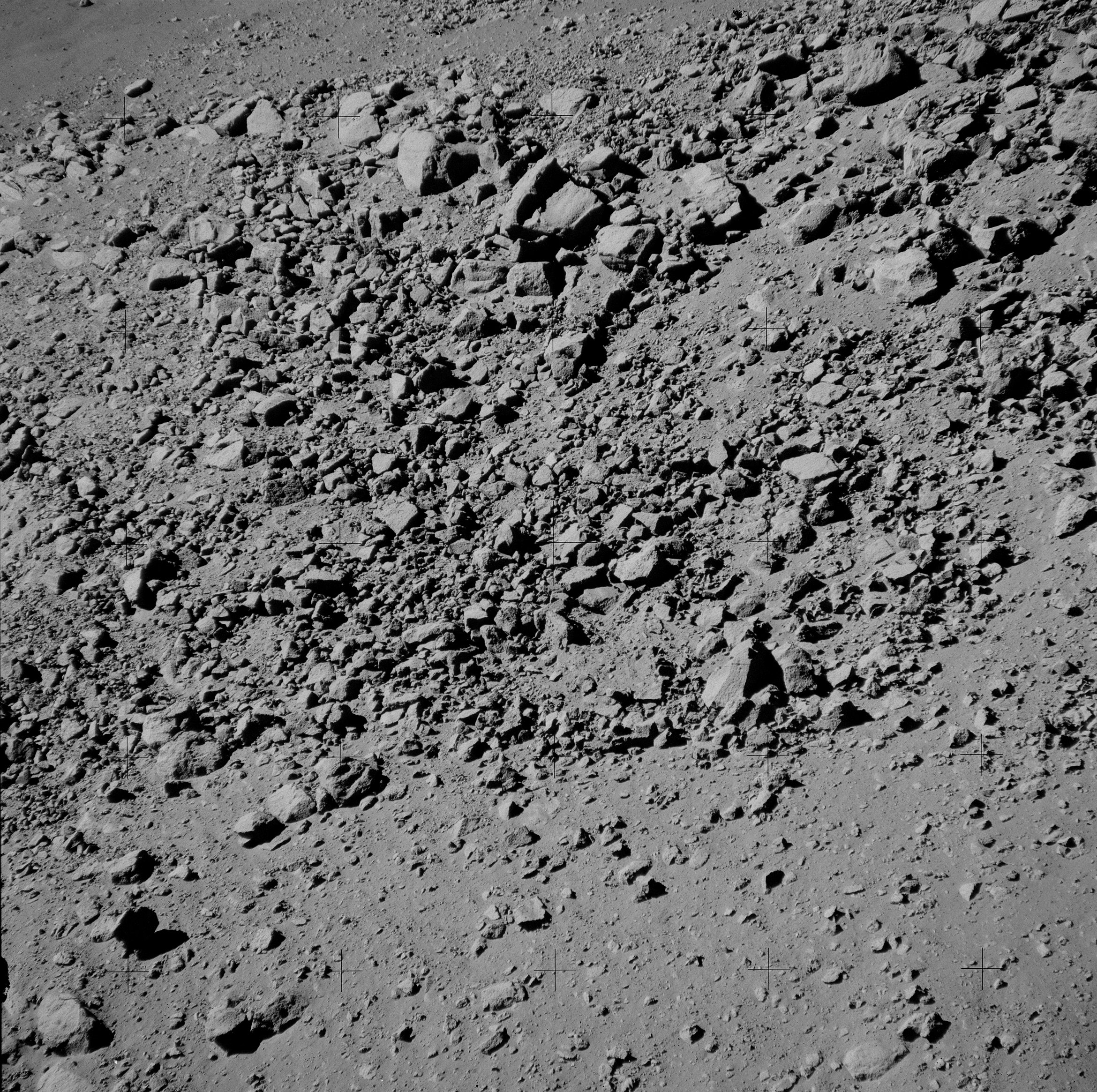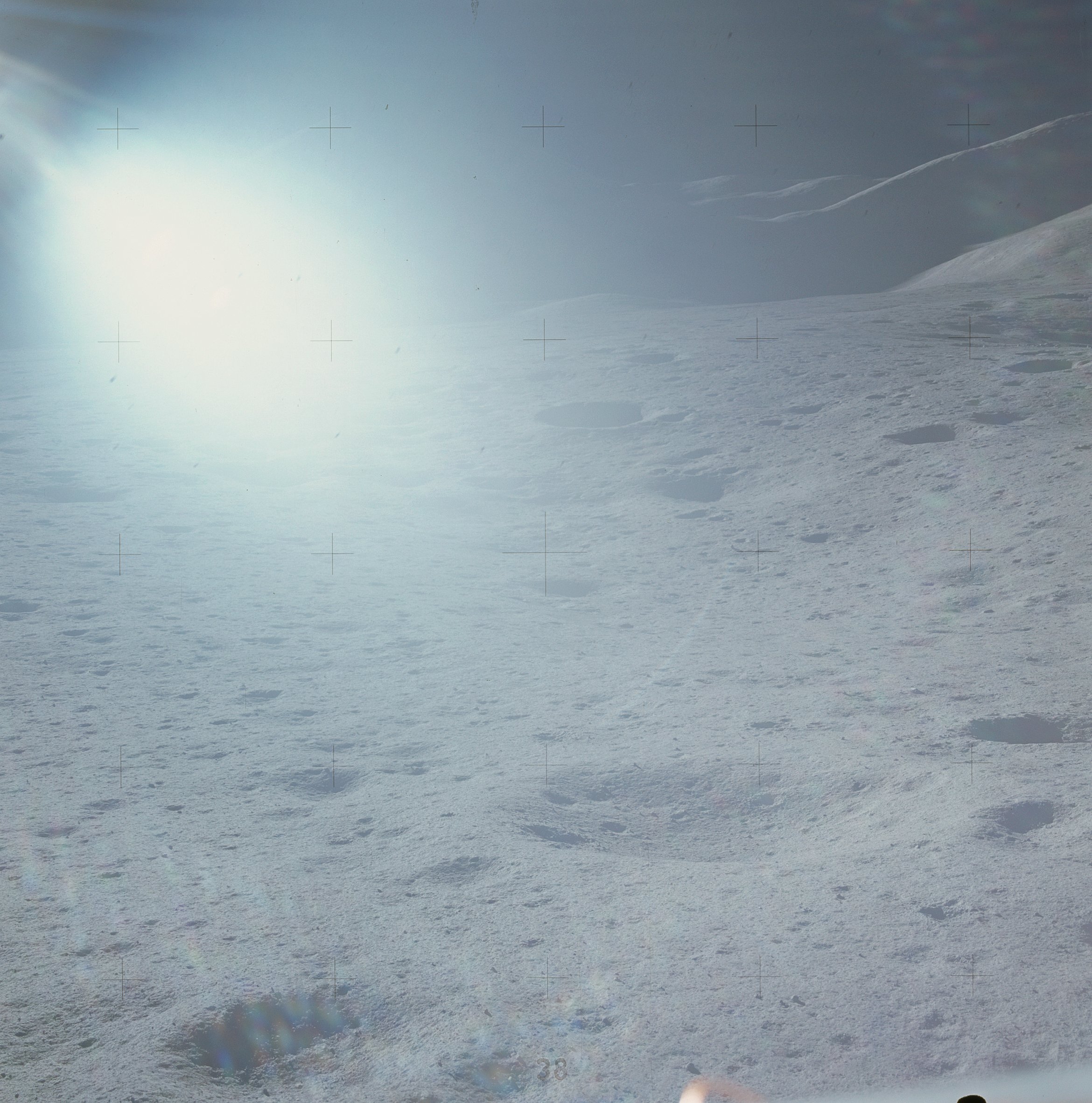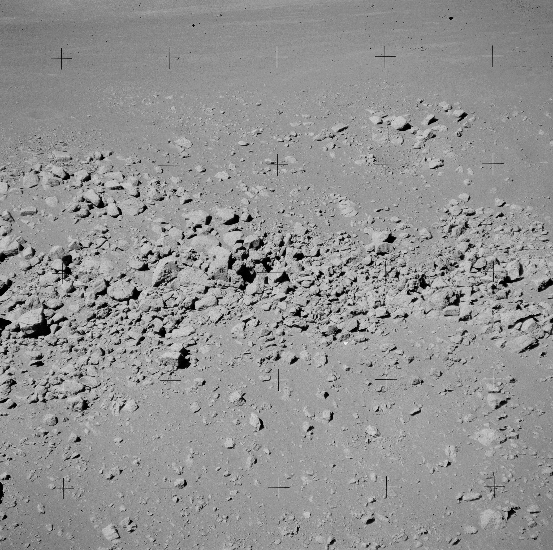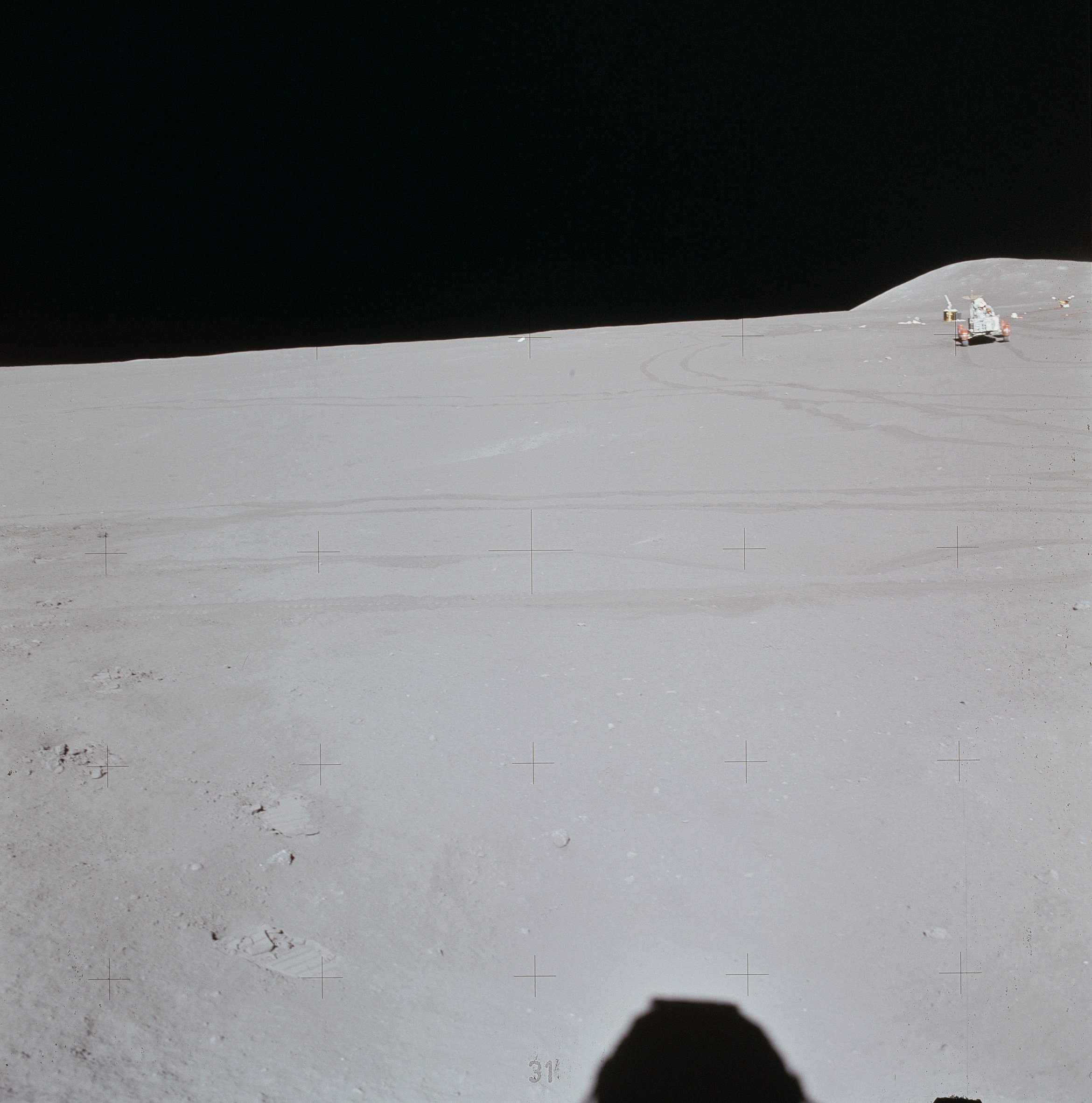 Stephen Tellier scanned a portion of Pan Camera frame 9798, which was taken during CSM Rev 38 at about 151:37. At that time, Dave and Jim were in the LM after the completion of EVA-2. A prominent feature of this image is the darkening of the soil around the LM and along a corridor extending from the LM toward 11 o'clock. See a comparison with frame 9377 by Markus Mehring, who has processed the images to account for differing orientations, different scales due to differing CSM-LM ranges, and different foreshortening due to differing CSM elevation angles. As Jack Schmitt discusses in the Apollo 17 commentary, the surface around the LM became brighter after being swept by the descent engine exhaust. As can be seen in photos taken on the surface, areas subsequently disturbed by the astronauts became relatively dark again. At locations relatively far from the LM, disturbed soil had the same brightness as undisturbed soil, another indication of brightening due to the engine exhaust.Rev. 50 Pan Camera 9809, North Detail ( 332k )