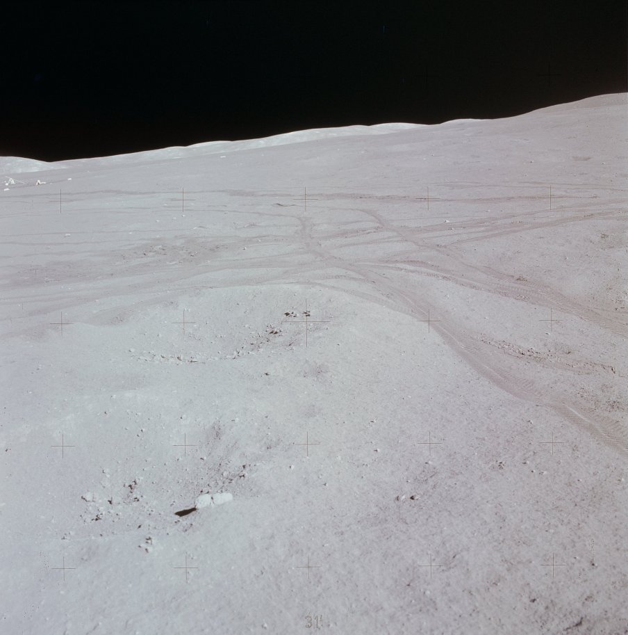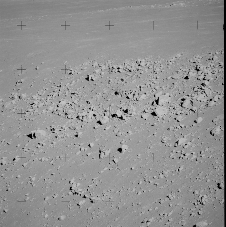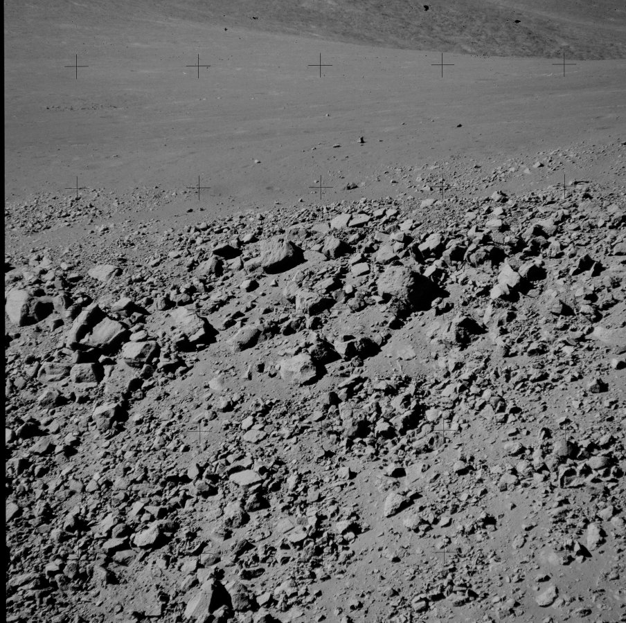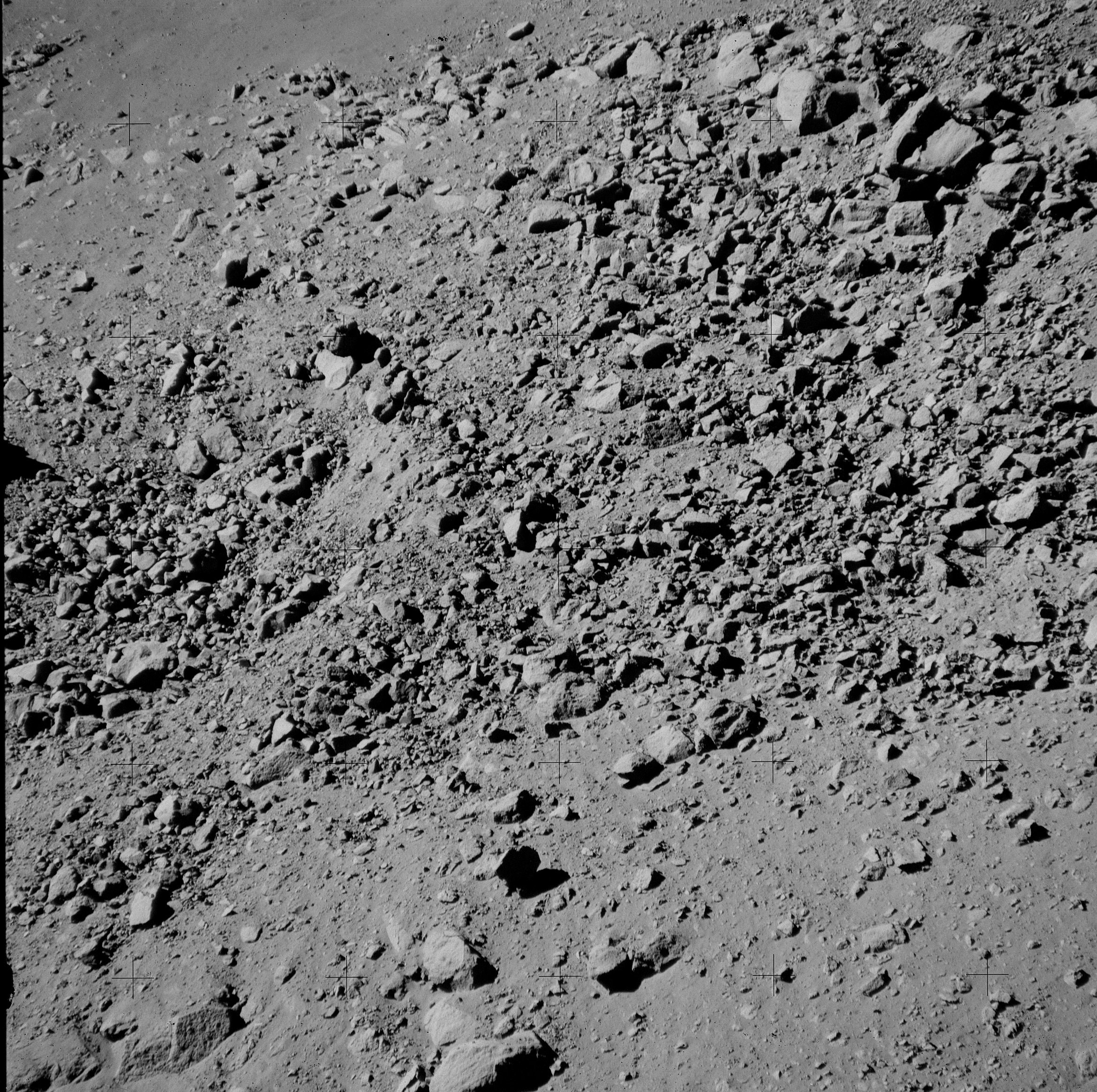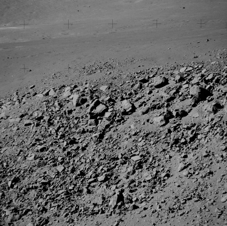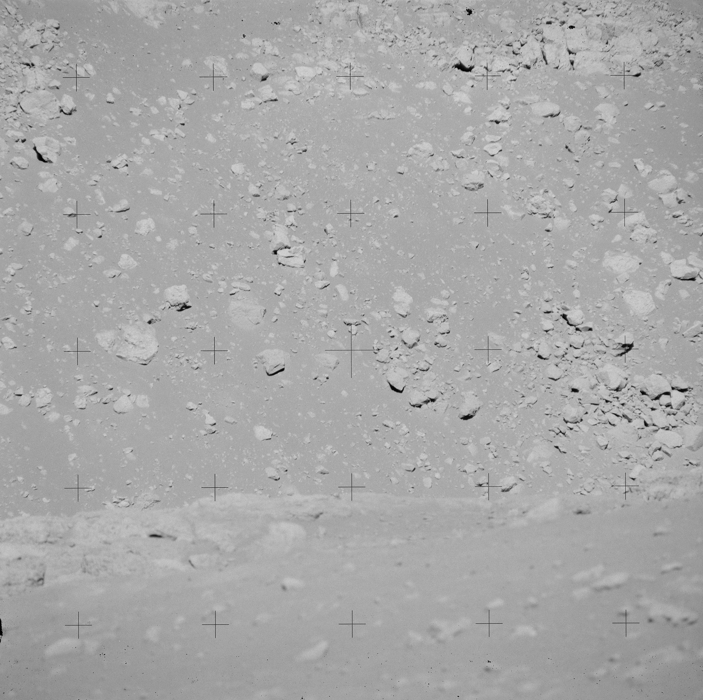 Stephen Tellier scanned a portion of Pan Camera frame 9798, which was taken during CSM Rev 38 at about 151:37. At that time, Dave and Jim were in the LM after the completion of EVA-2. A prominent feature of this image is the darkening of the soil around the LM and along a corridor extending from the LM toward 11 o'clock. See a comparison with frame 9377 by Markus Mehring, who has processed the images to account for differing orientations, different scales due to differing CSM-LM ranges, and different foreshortening due to differing CSM elevation angles. As Jack Schmitt discusses in the Apollo 17 commentary, the surface around the LM became brighter after being swept by the descent engine exhaust. As can be seen in photos taken on the surface, areas subsequently disturbed by the astronauts became relatively dark again. At locations relatively far from the LM, disturbed soil had the same brightness as undisturbed soil, another indication of brightening due to the engine exhaust.Rev. 50 Pan Camera 9809, North Detail ( 332k )