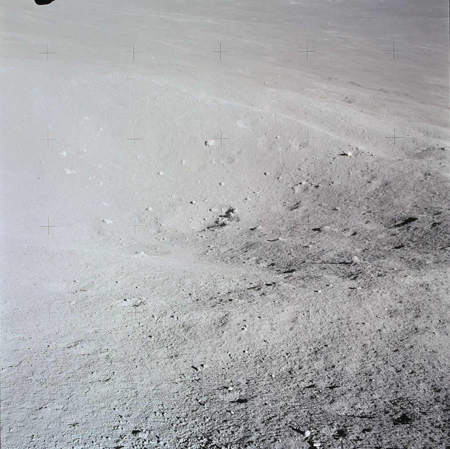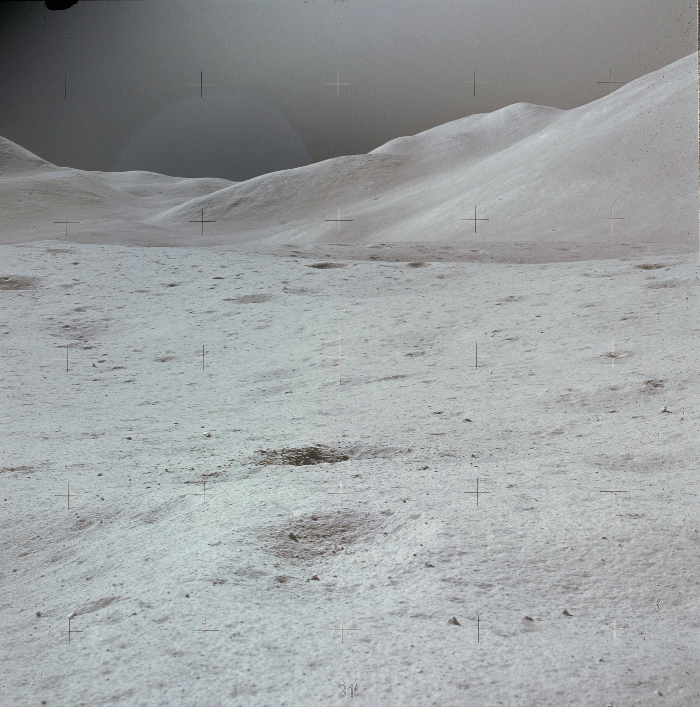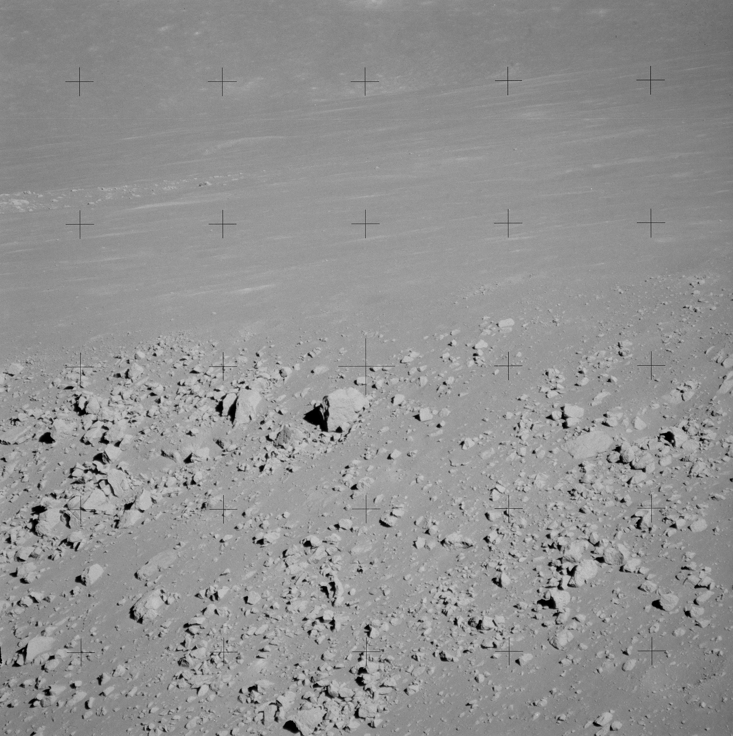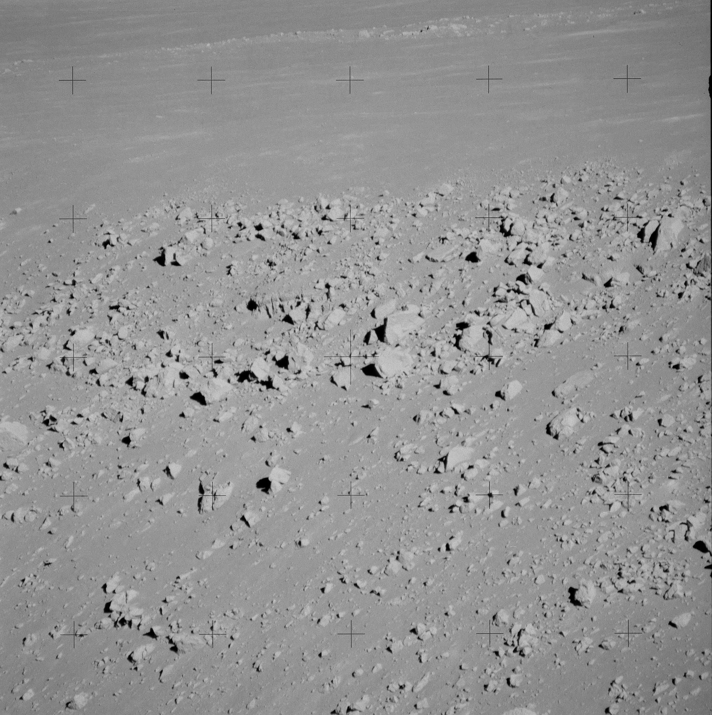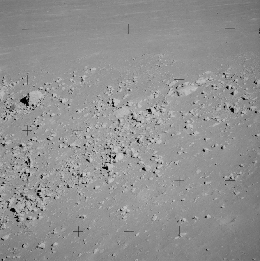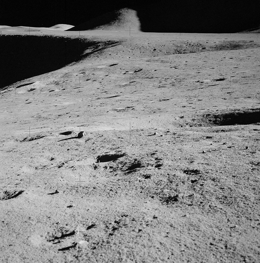Stephen Tellier scanned a portion of Pan Camera frame 9798, which was taken during CSM Rev 38 at about 151:37. At that time, Dave and Jim were in the LM after the completion of EVA-2. A prominent feature of this image is the darkening of the soil around the LM and along a corridor extending from the LM toward 11 o'clock. See a comparison with frame 9377 by Markus Mehring, who has processed the images to account for differing orientations, different scales due to differing CSM-LM ranges, and different foreshortening due to differing CSM elevation angles. As Jack Schmitt discusses in the Apollo 17 commentary, the surface around the LM became brighter after being swept by the descent engine exhaust. As can be seen in photos taken on the surface, areas subsequently disturbed by the astronauts became relatively dark again. At locations relatively far from the LM, disturbed soil had the same brightness as undisturbed soil, another indication of brightening due to the engine exhaust.Rev. 50 Pan Camera 9809, North Detail ( 332k )