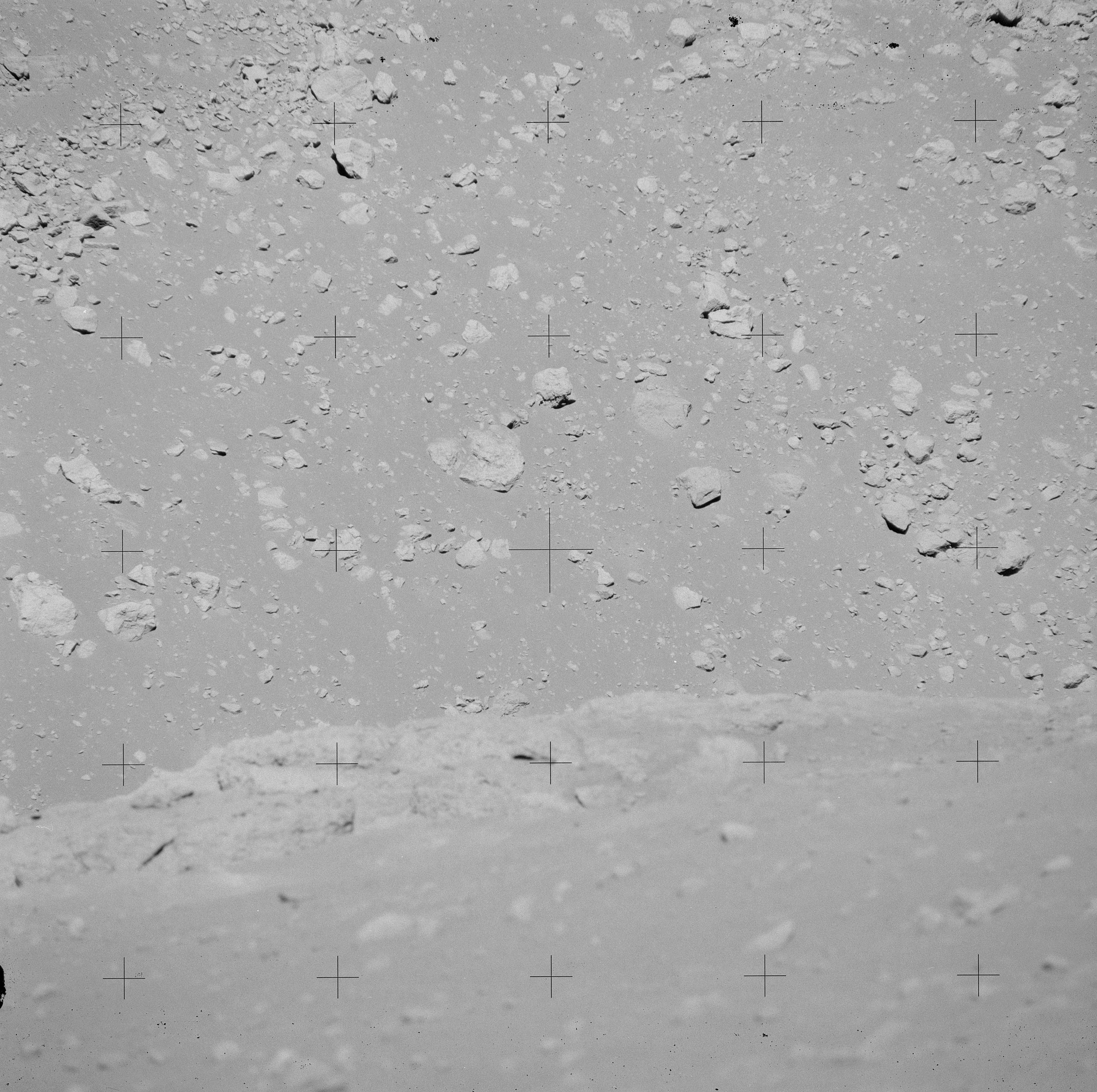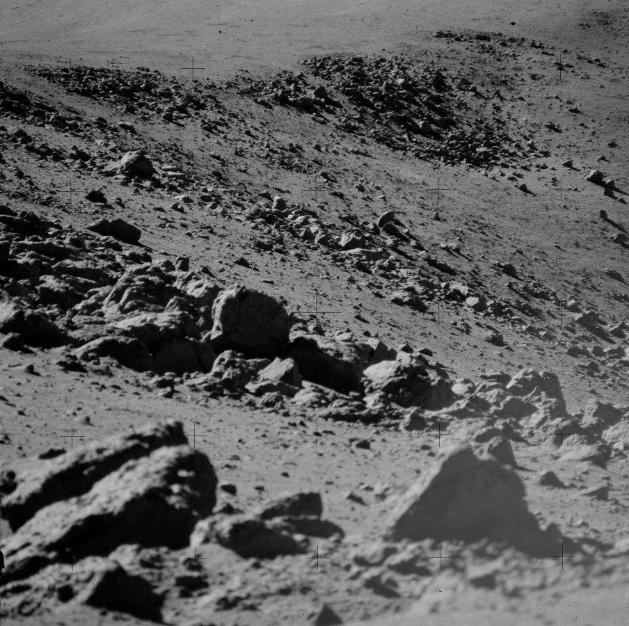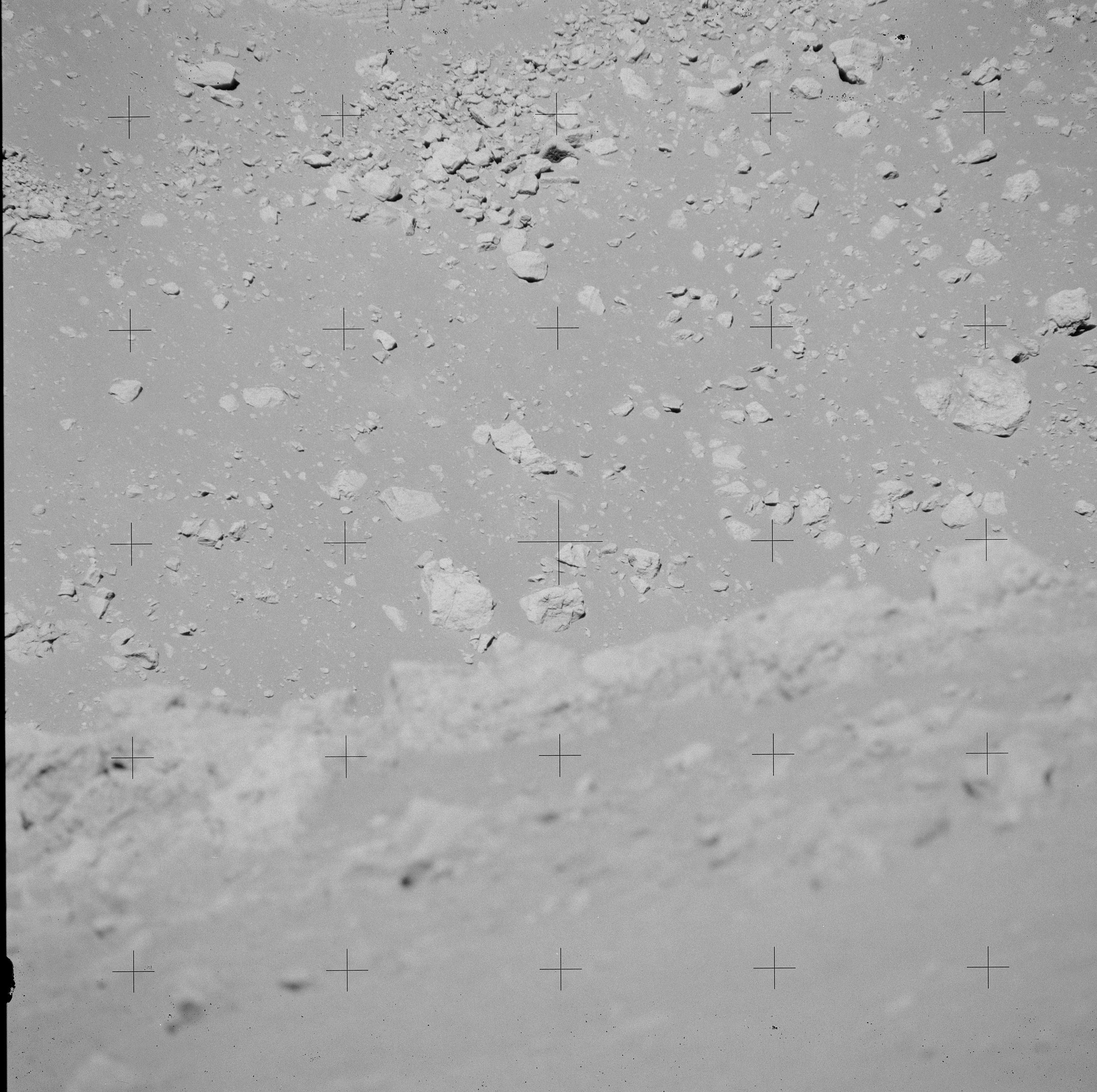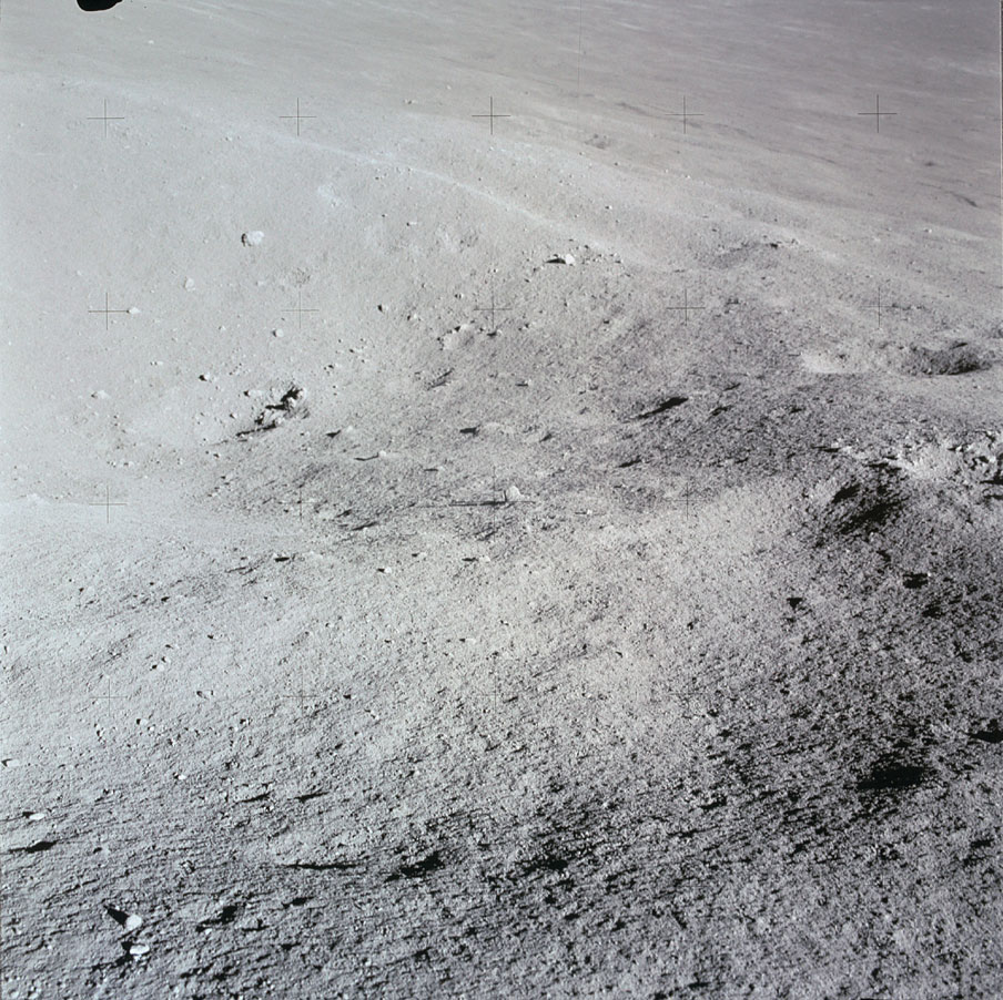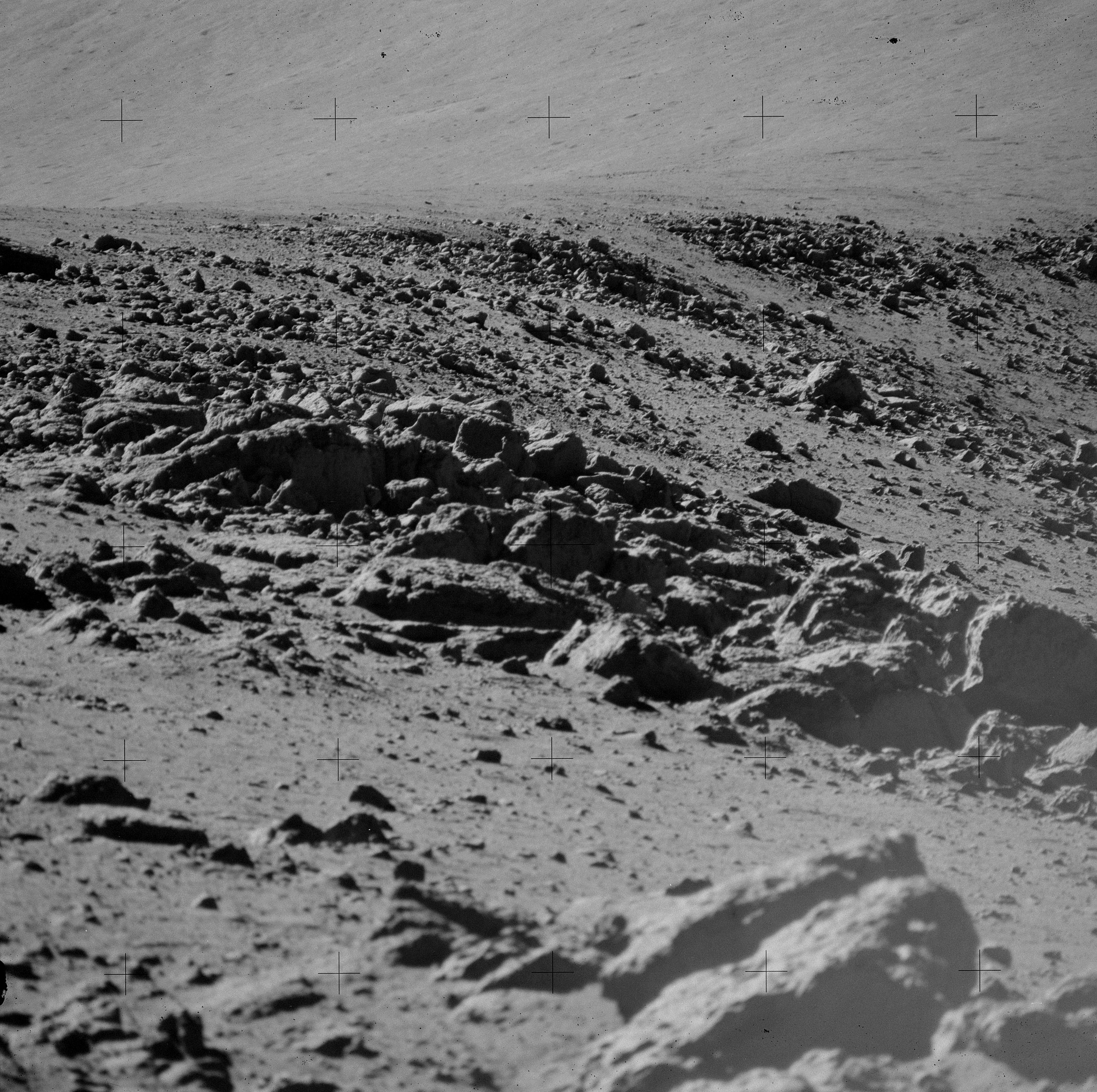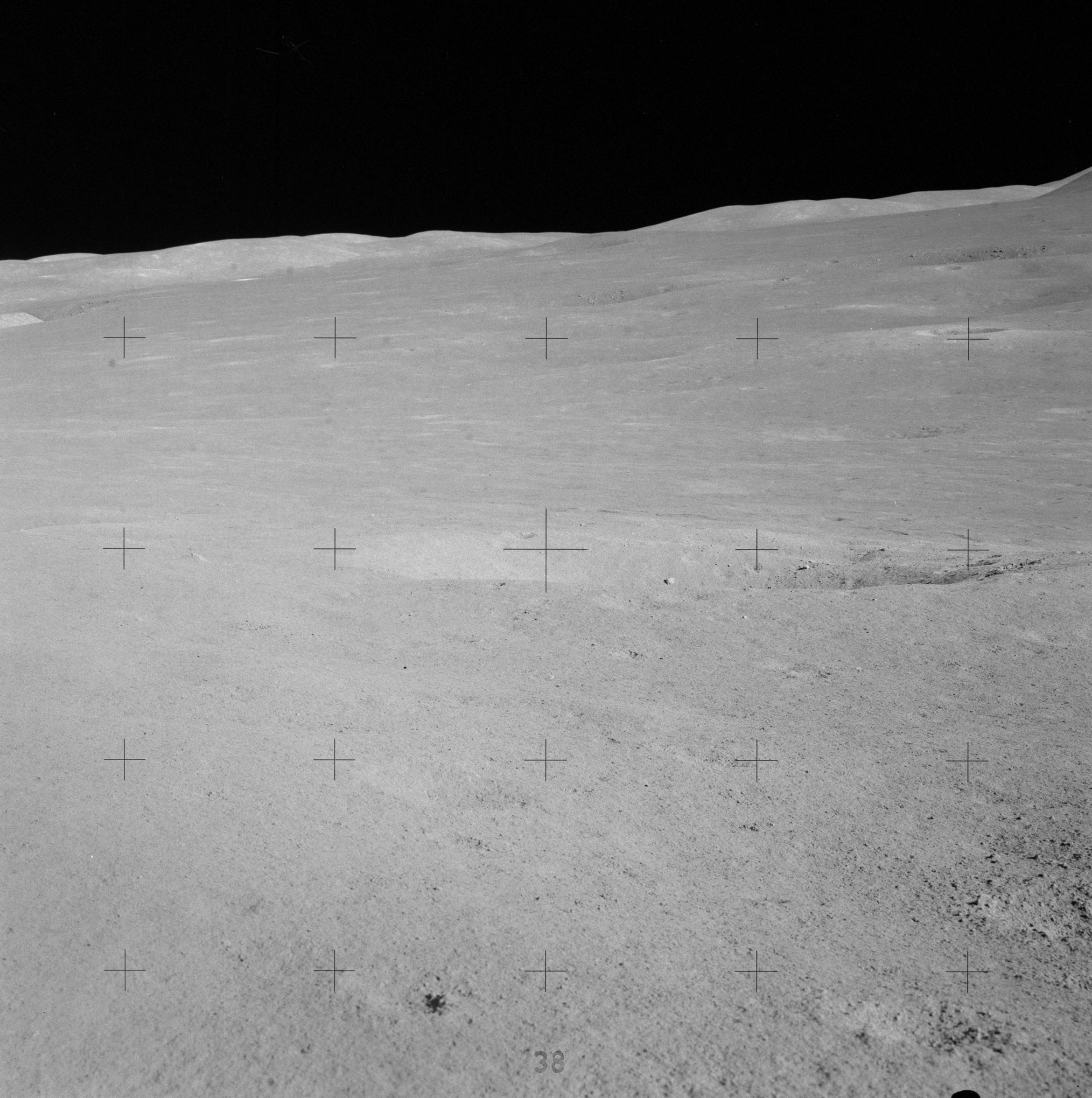 Stephen Tellier scanned a portion of Pan Camera frame 9798, which was taken during CSM Rev 38 at about 151:37. At that time, Dave and Jim were in the LM after the completion of EVA-2. A prominent feature of this image is the darkening of the soil around the LM and along a corridor extending from the LM toward 11 o'clock. See a comparison with frame 9377 by Markus Mehring, who has processed the images to account for differing orientations, different scales due to differing CSM-LM ranges, and different foreshortening due to differing CSM elevation angles. As Jack Schmitt discusses in the Apollo 17 commentary, the surface around the LM became brighter after being swept by the descent engine exhaust. As can be seen in photos taken on the surface, areas subsequently disturbed by the astronauts became relatively dark again. At locations relatively far from the LM, disturbed soil had the same brightness as undisturbed soil, another indication of brightening due to the engine exhaust.Rev. 50 Pan Camera 9809, North Detail ( 332k )