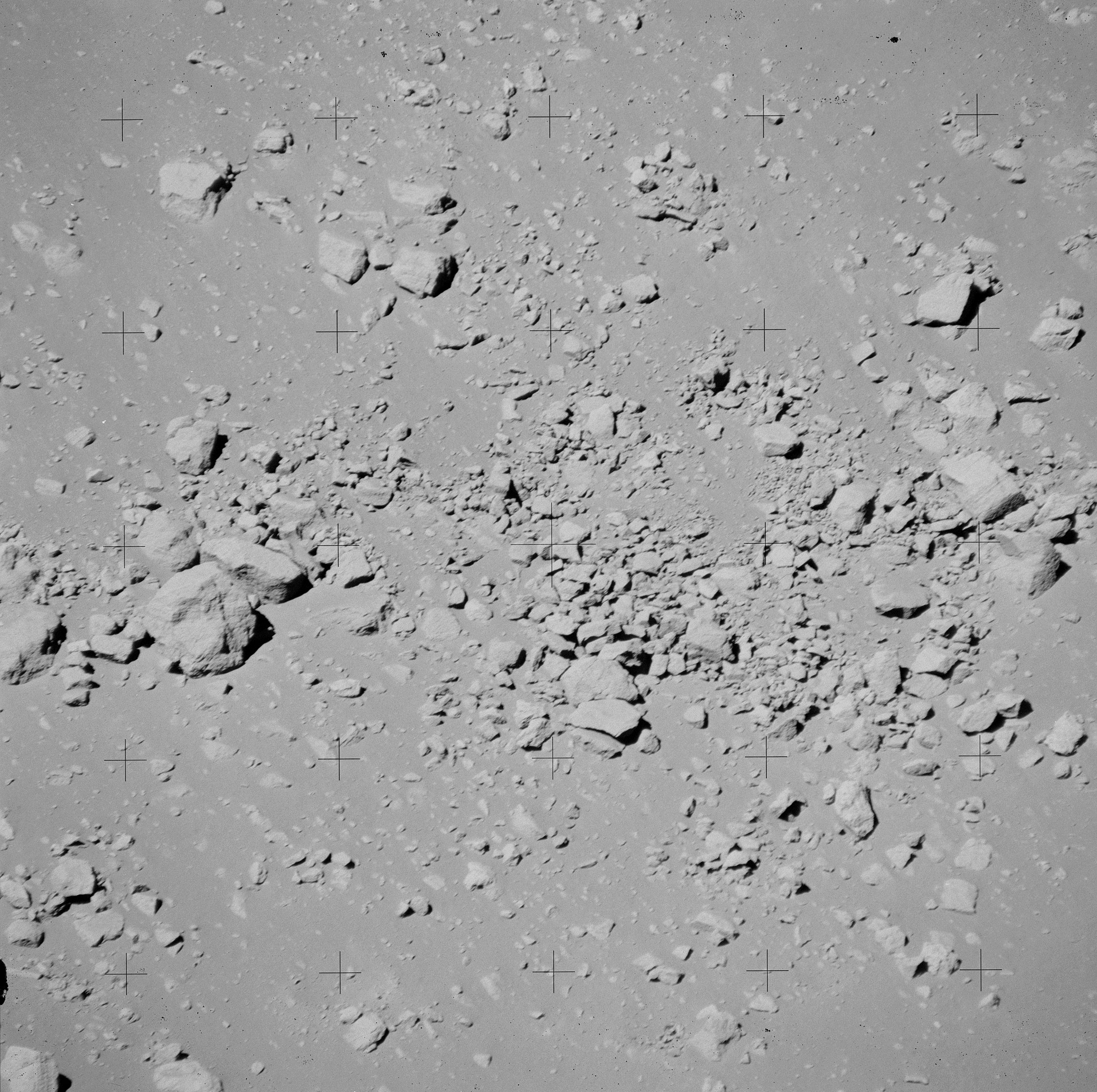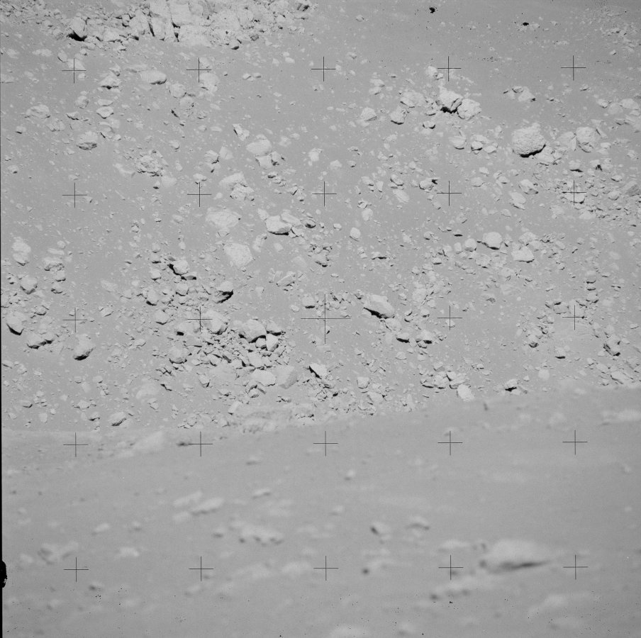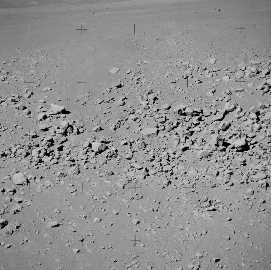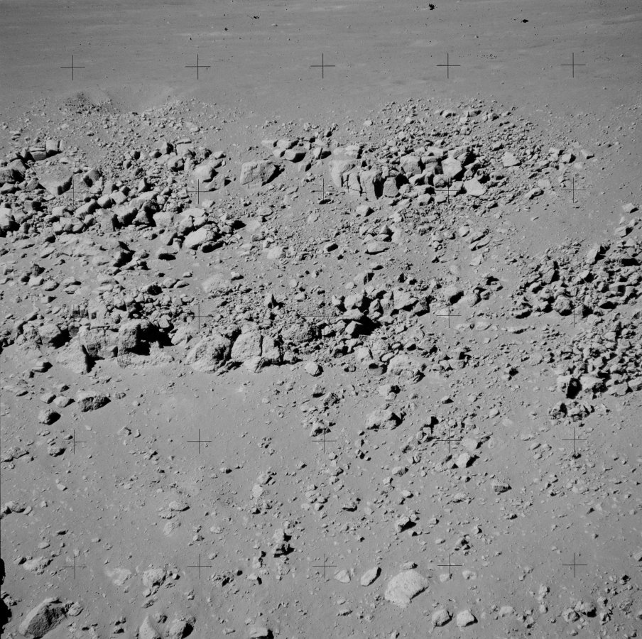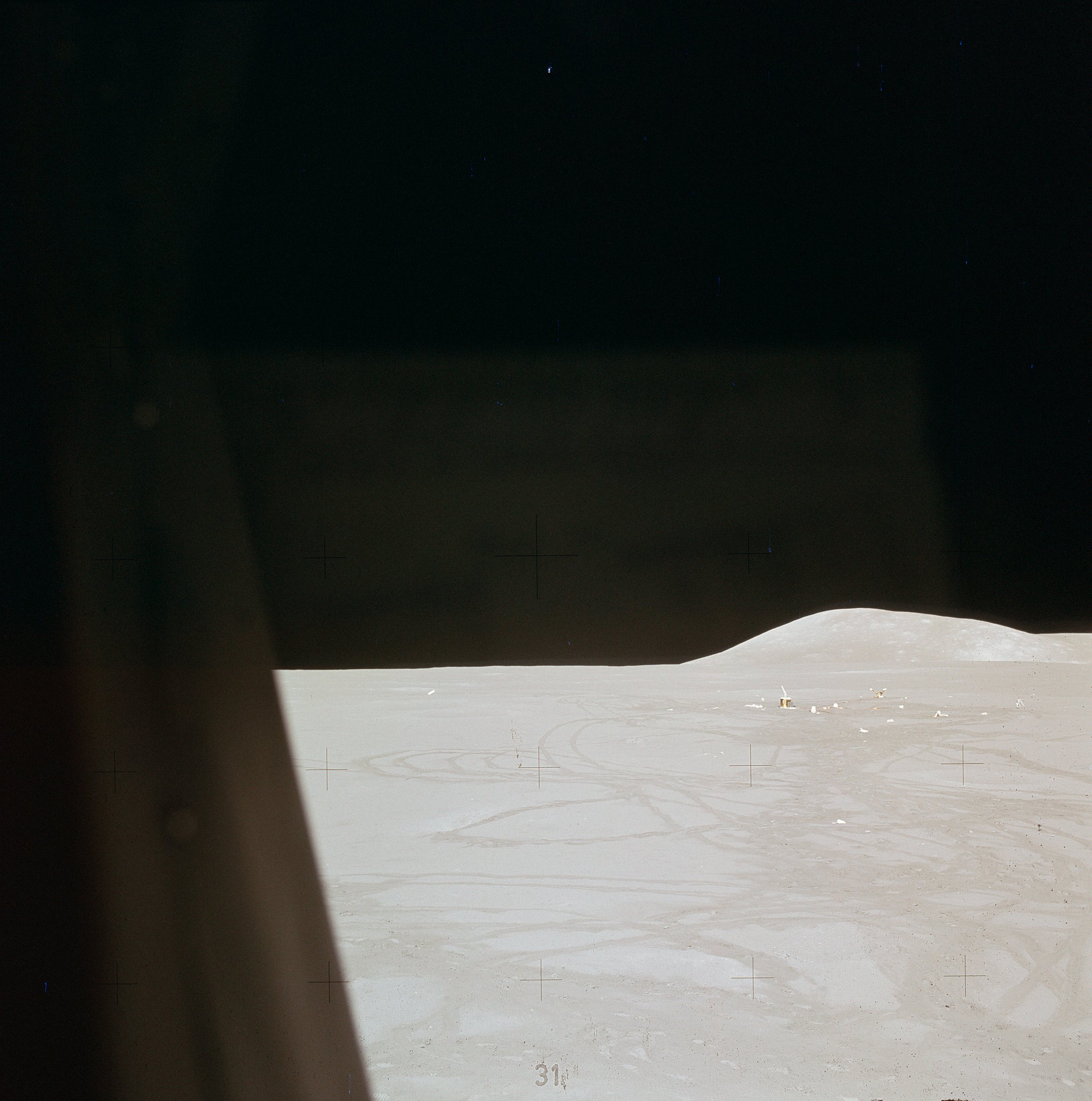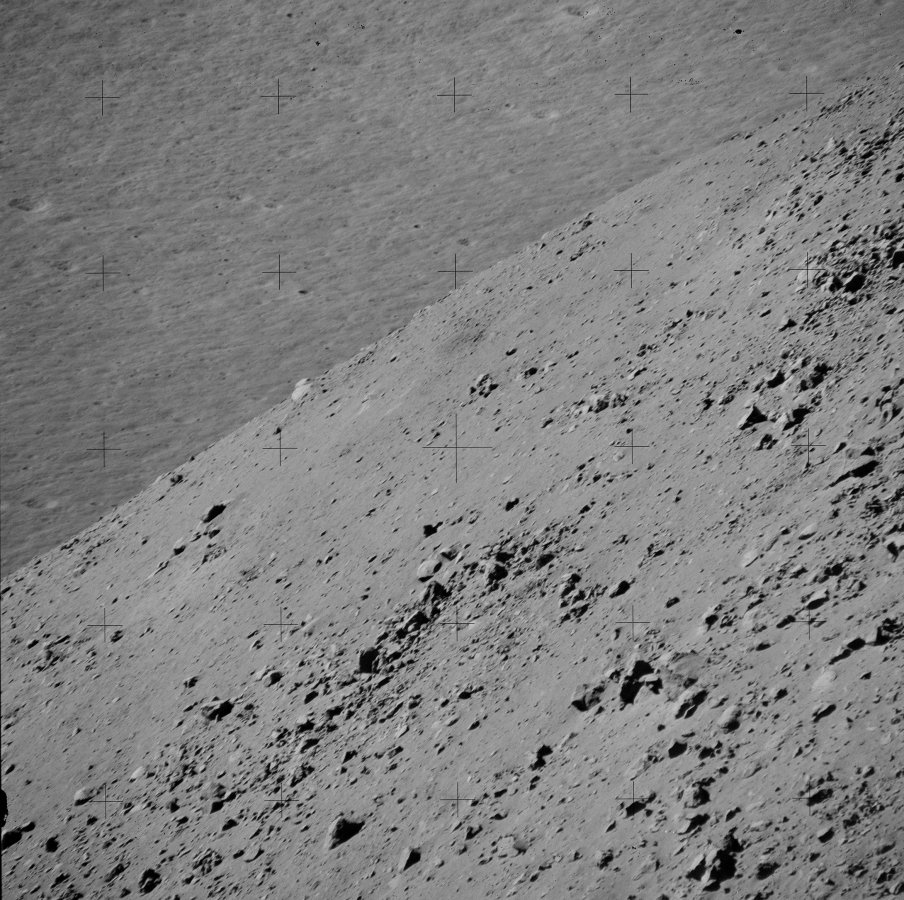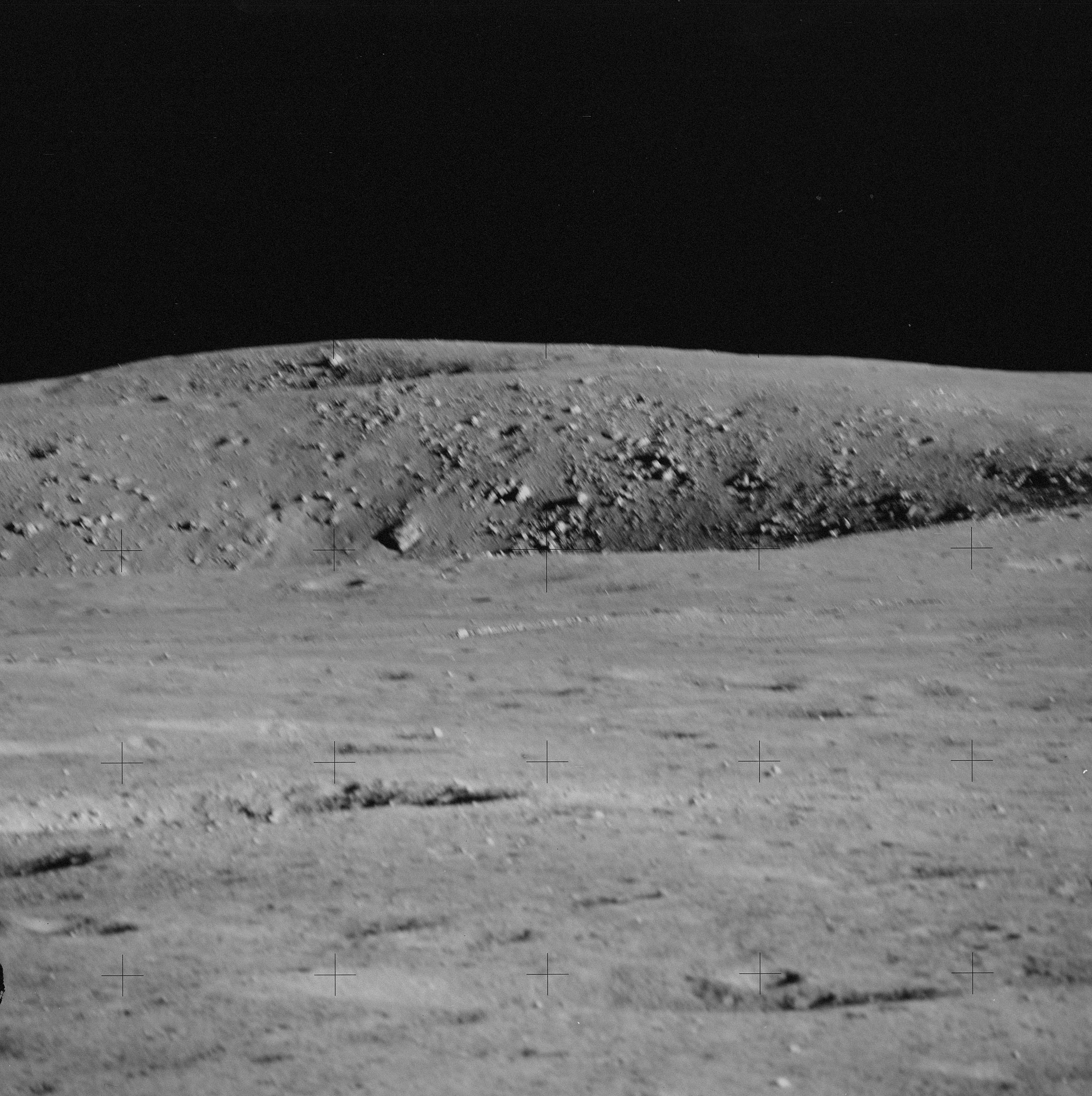 Stephen Tellier scanned a portion of Pan Camera frame 9798, which was taken during CSM Rev 38 at about 151:37. At that time, Dave and Jim were in the LM after the completion of EVA-2. A prominent feature of this image is the darkening of the soil around the LM and along a corridor extending from the LM toward 11 o'clock. See a comparison with frame 9377 by Markus Mehring, who has processed the images to account for differing orientations, different scales due to differing CSM-LM ranges, and different foreshortening due to differing CSM elevation angles. As Jack Schmitt discusses in the Apollo 17 commentary, the surface around the LM became brighter after being swept by the descent engine exhaust. As can be seen in photos taken on the surface, areas subsequently disturbed by the astronauts became relatively dark again. At locations relatively far from the LM, disturbed soil had the same brightness as undisturbed soil, another indication of brightening due to the engine exhaust.Rev. 50 Pan Camera 9809, North Detail ( 332k )