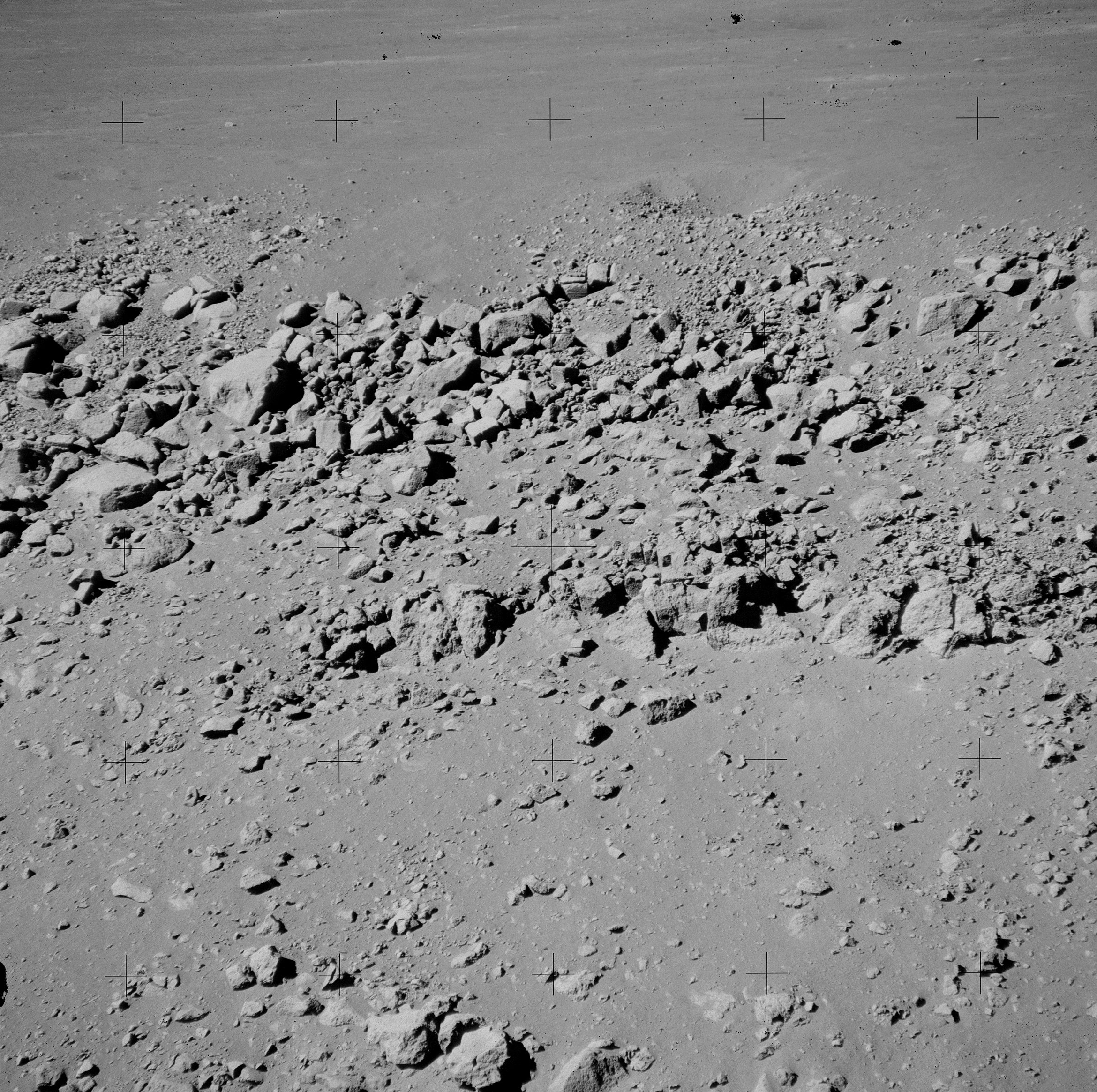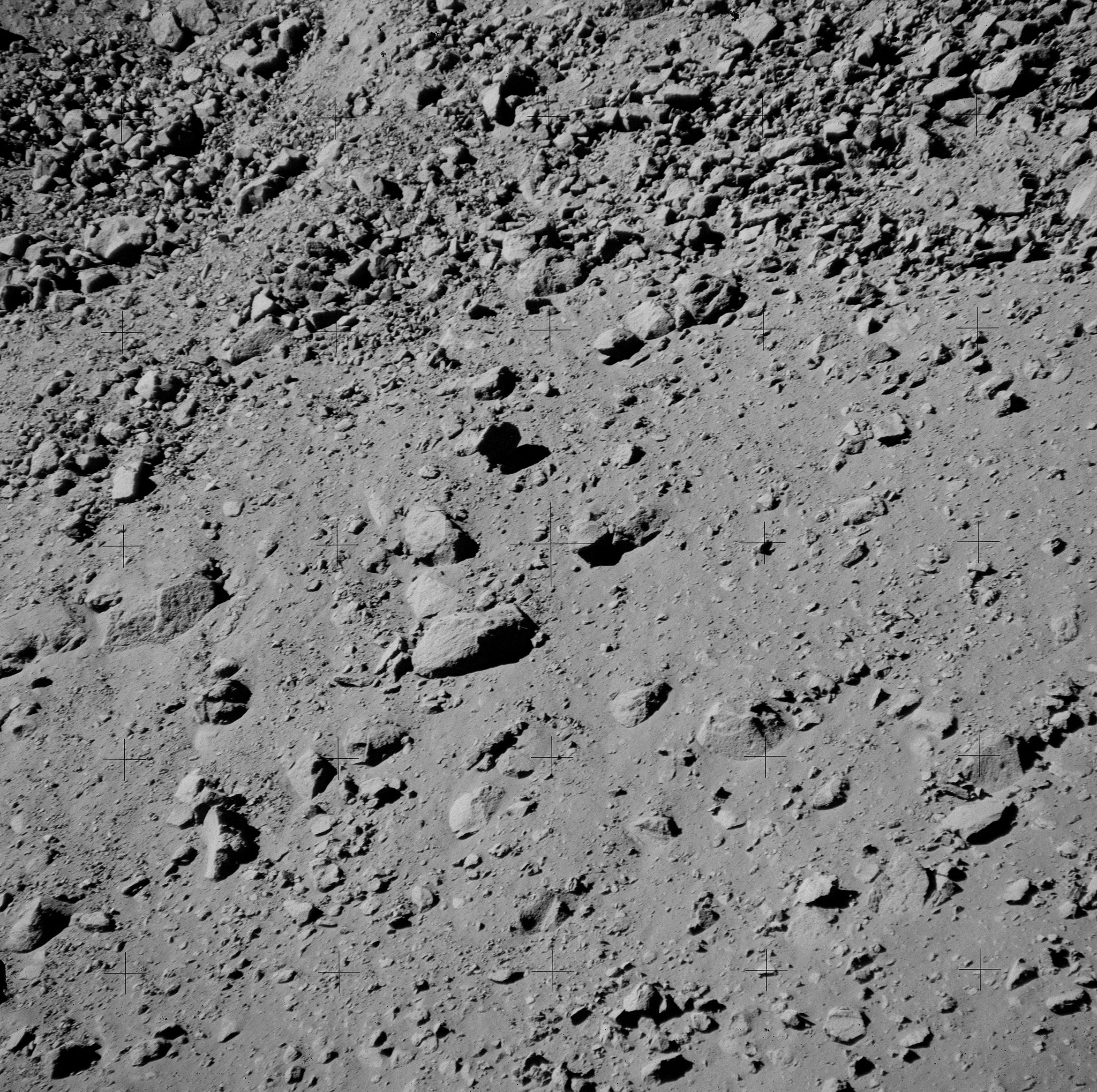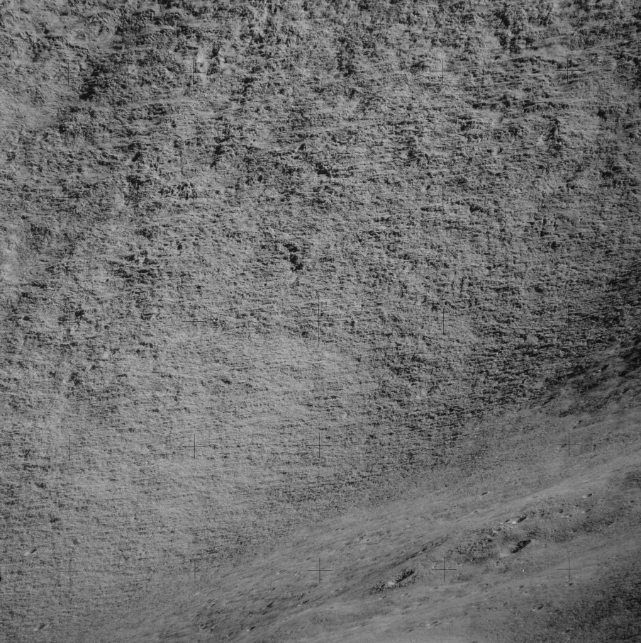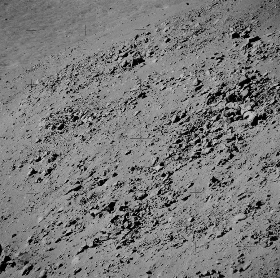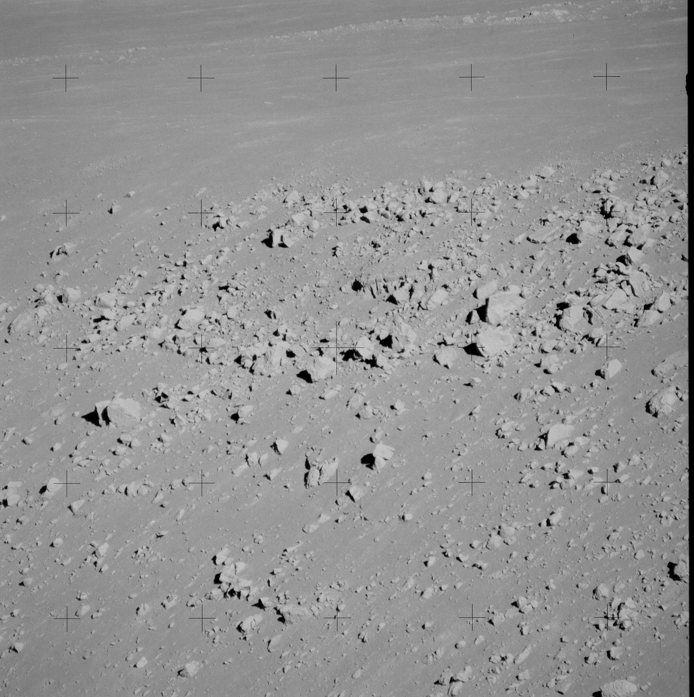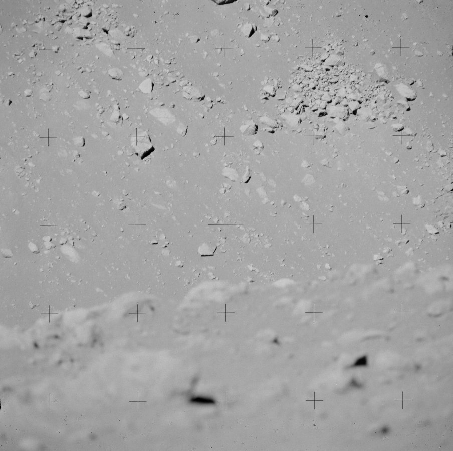 Stephen Tellier scanned a portion of Pan Camera frame 9798, which was taken during CSM Rev 38 at about 151:37. At that time, Dave and Jim were in the LM after the completion of EVA-2. A prominent feature of this image is the darkening of the soil around the LM and along a corridor extending from the LM toward 11 o'clock. See a comparison with frame 9377 by Markus Mehring, who has processed the images to account for differing orientations, different scales due to differing CSM-LM ranges, and different foreshortening due to differing CSM elevation angles. As Jack Schmitt discusses in the Apollo 17 commentary, the surface around the LM became brighter after being swept by the descent engine exhaust. As can be seen in photos taken on the surface, areas subsequently disturbed by the astronauts became relatively dark again. At locations relatively far from the LM, disturbed soil had the same brightness as undisturbed soil, another indication of brightening due to the engine exhaust.Rev. 50 Pan Camera 9809, North Detail ( 332k )
