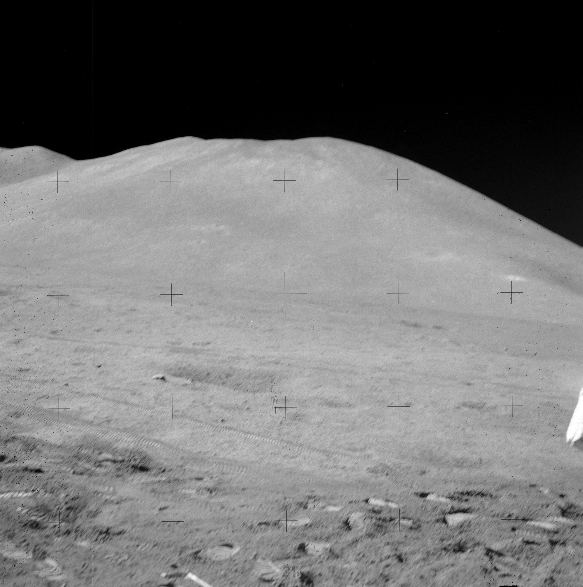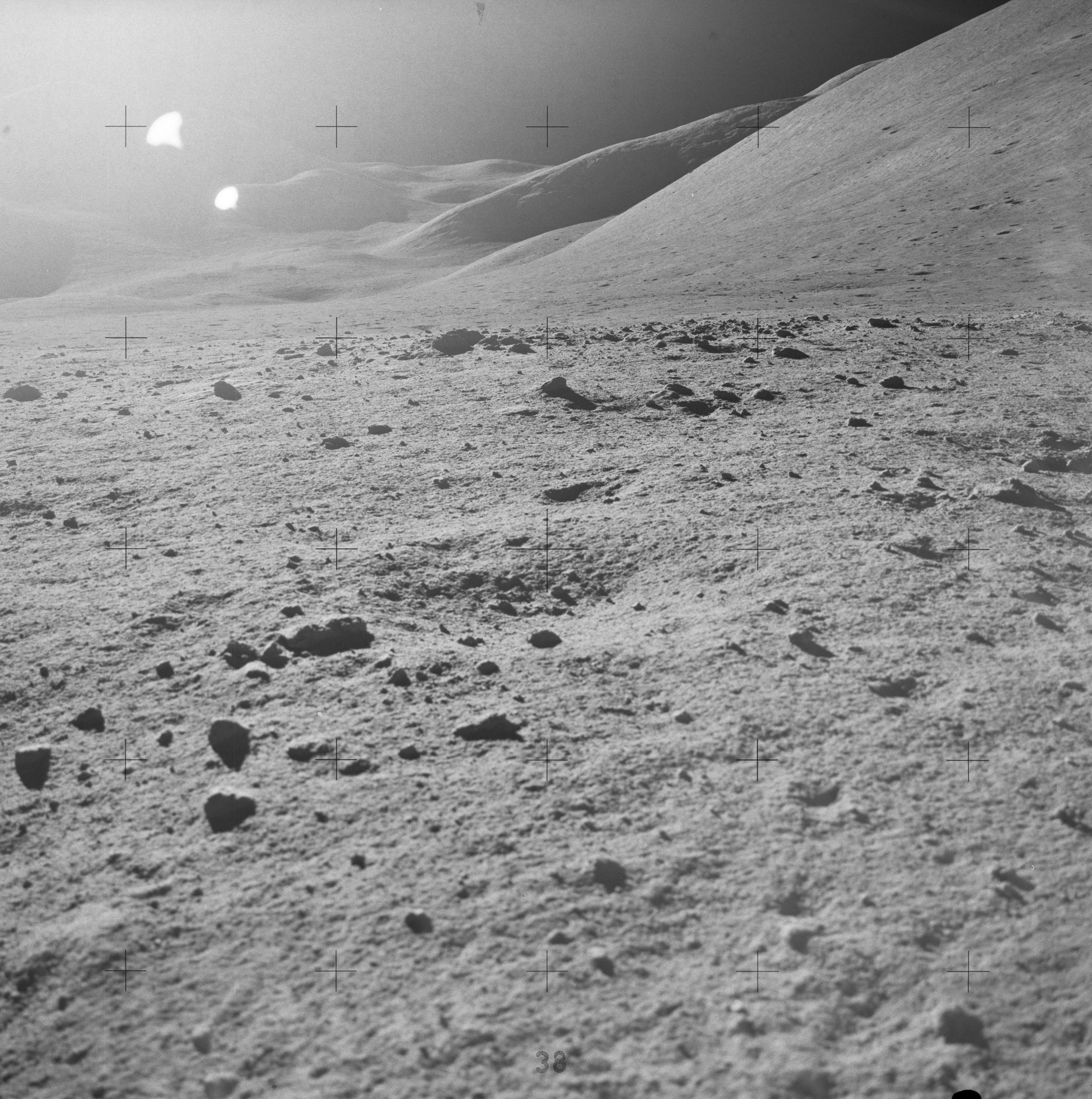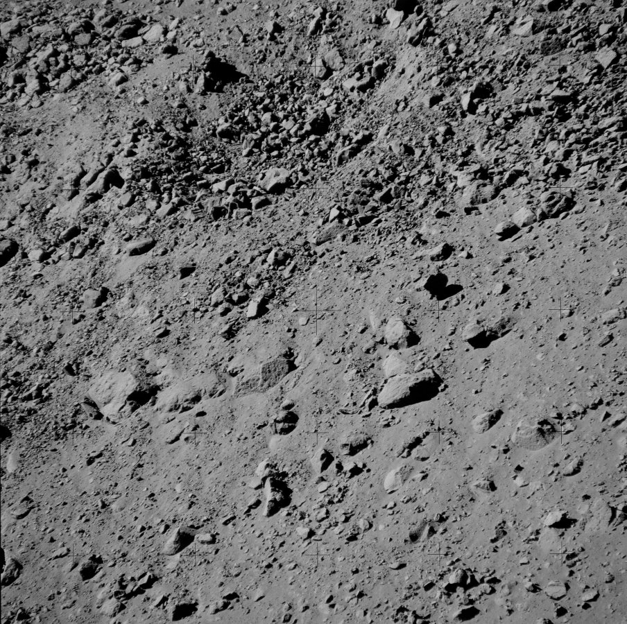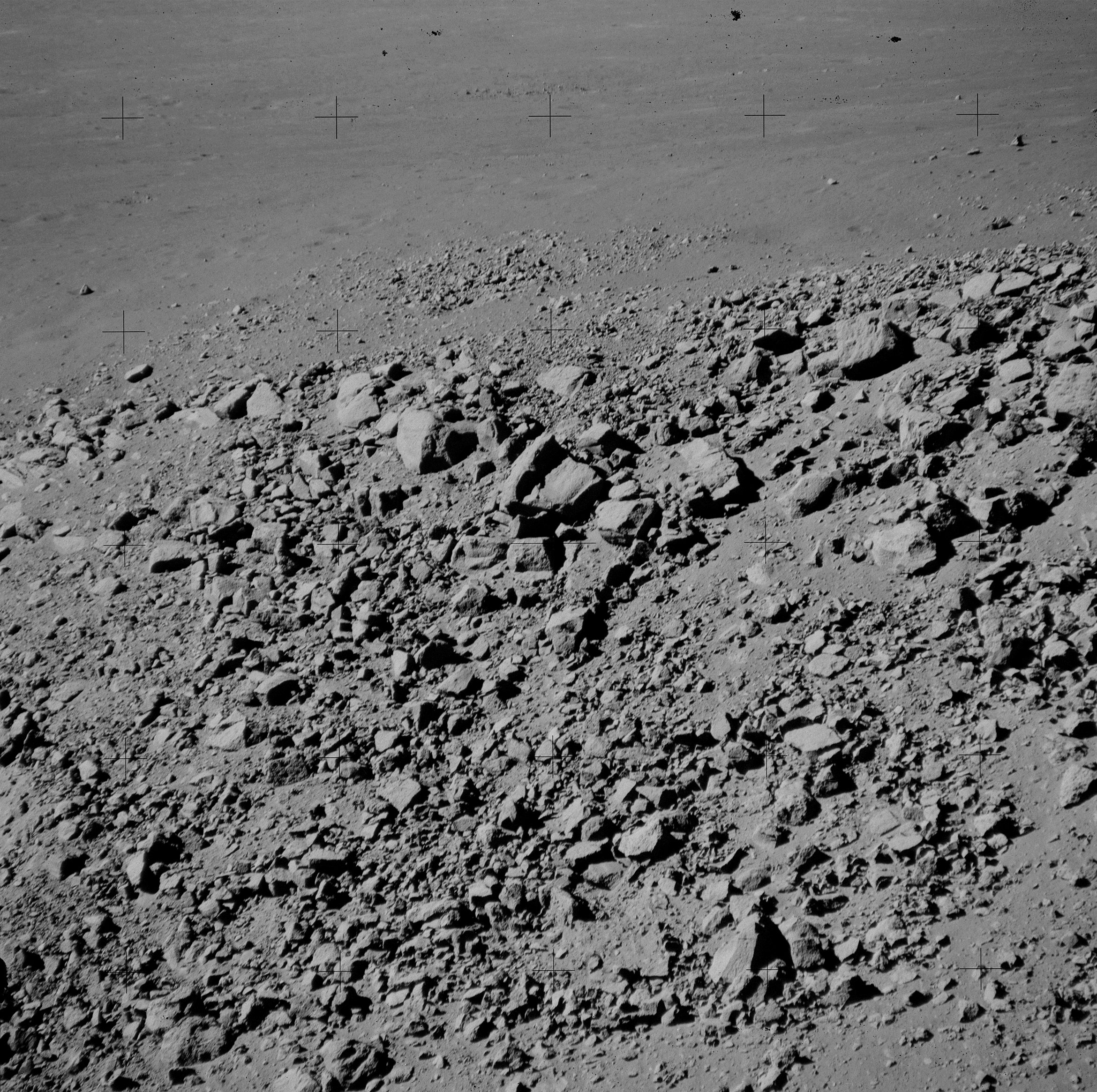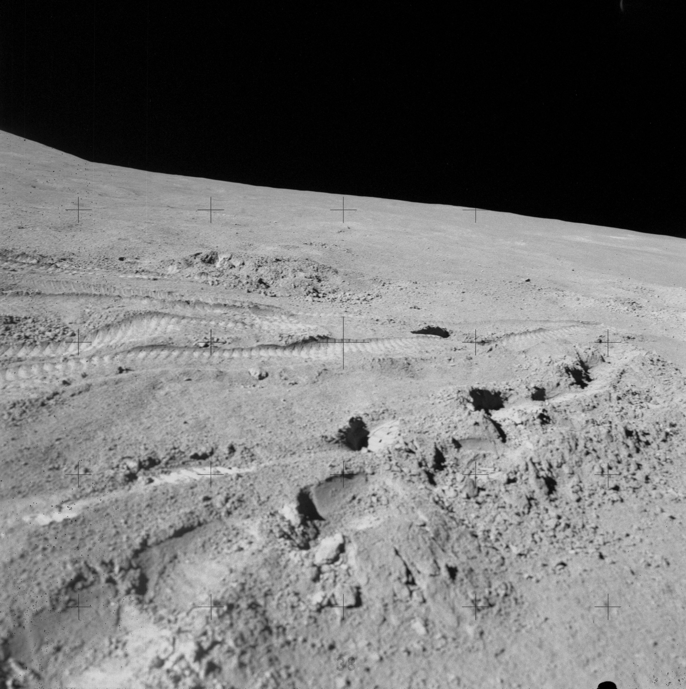 Stephen Tellier scanned a portion of Pan Camera frame 9798, which was taken during CSM Rev 38 at about 151:37. At that time, Dave and Jim were in the LM after the completion of EVA-2. A prominent feature of this image is the darkening of the soil around the LM and along a corridor extending from the LM toward 11 o'clock. See a comparison with frame 9377 by Markus Mehring, who has processed the images to account for differing orientations, different scales due to differing CSM-LM ranges, and different foreshortening due to differing CSM elevation angles. As Jack Schmitt discusses in the Apollo 17 commentary, the surface around the LM became brighter after being swept by the descent engine exhaust. As can be seen in photos taken on the surface, areas subsequently disturbed by the astronauts became relatively dark again. At locations relatively far from the LM, disturbed soil had the same brightness as undisturbed soil, another indication of brightening due to the engine exhaust.Rev. 50 Pan Camera 9809, North Detail ( 332k )