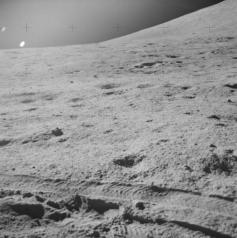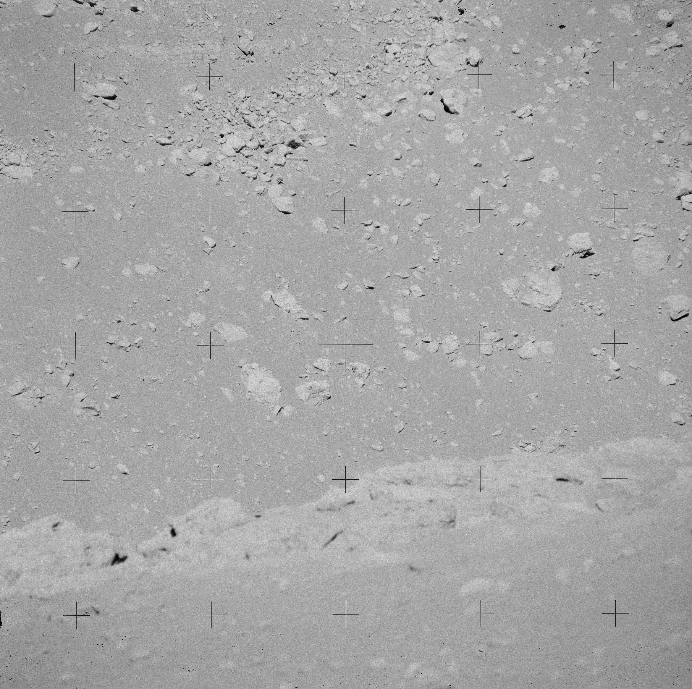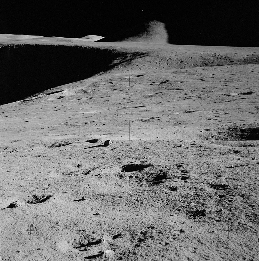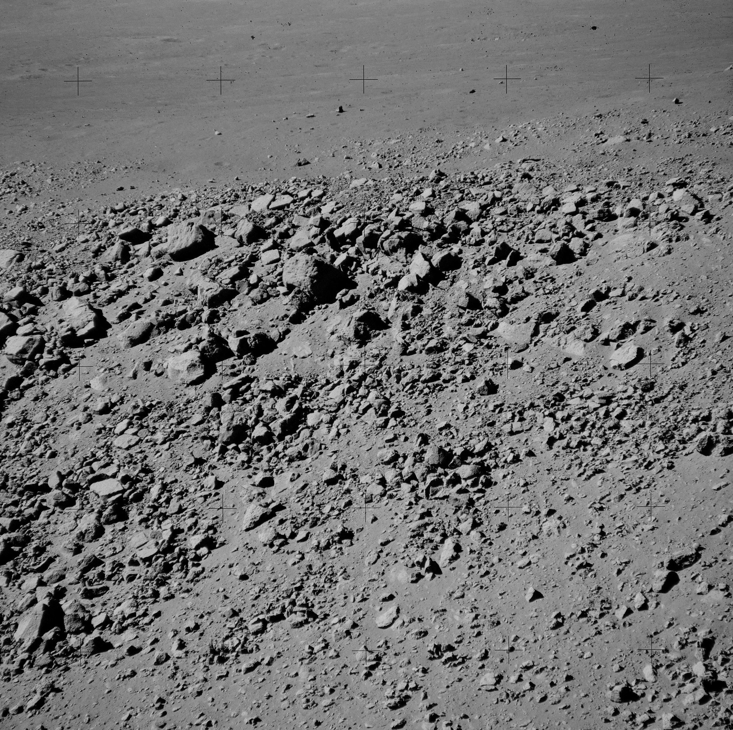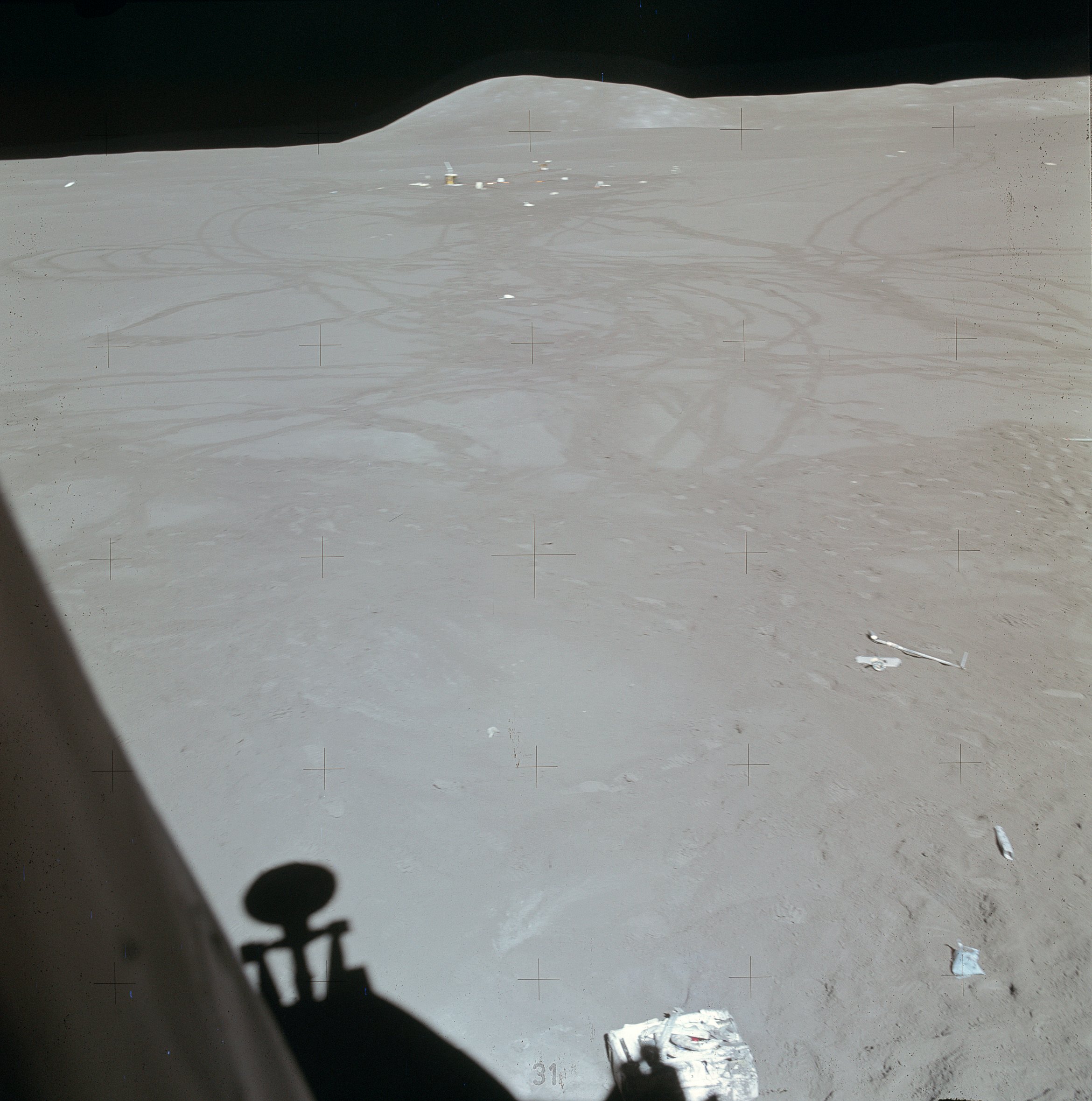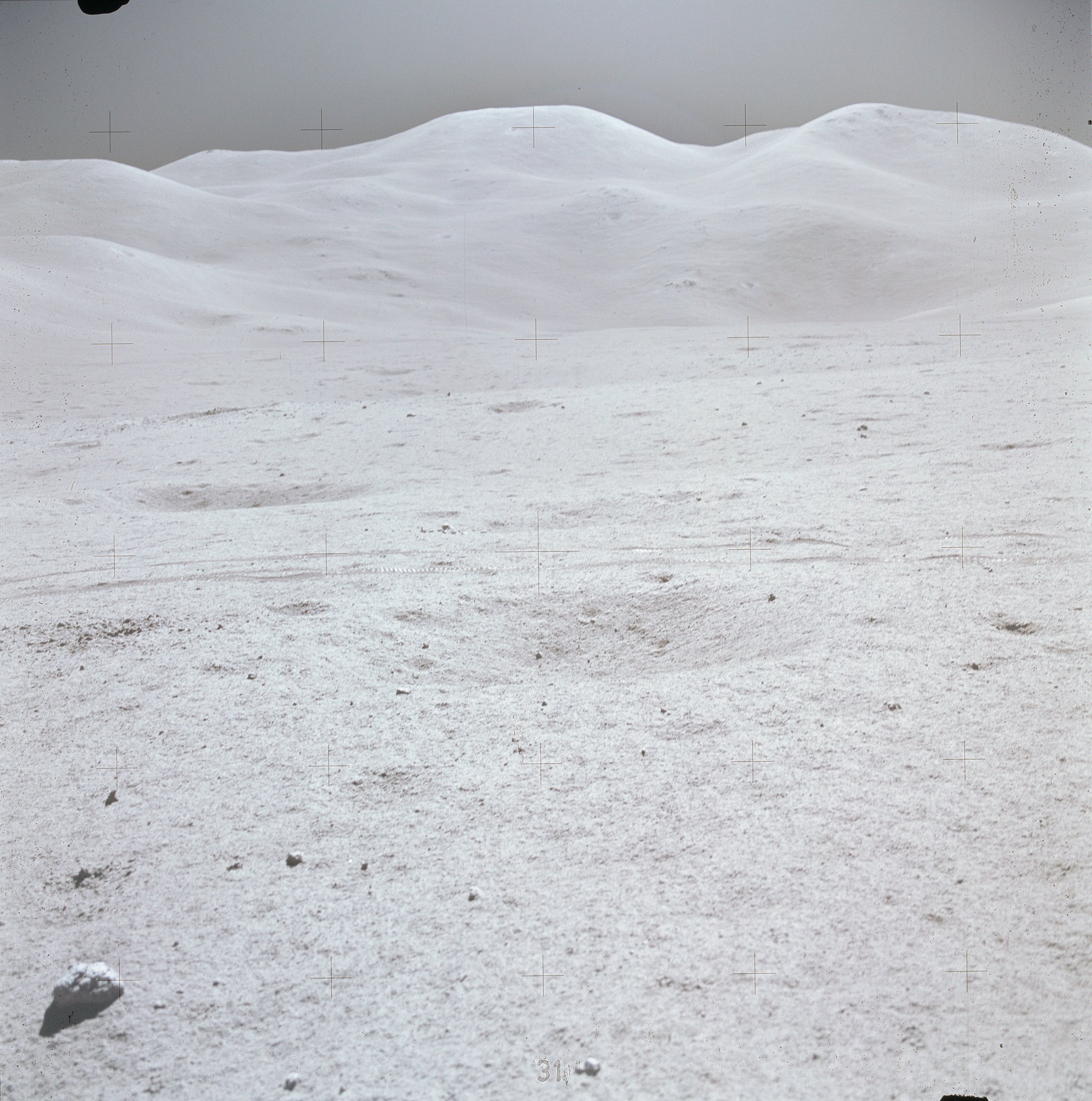 Stephen Tellier scanned a portion of Pan Camera frame 9798, which was taken during CSM Rev 38 at about 151:37. At that time, Dave and Jim were in the LM after the completion of EVA-2. A prominent feature of this image is the darkening of the soil around the LM and along a corridor extending from the LM toward 11 o'clock. See a comparison with frame 9377 by Markus Mehring, who has processed the images to account for differing orientations, different scales due to differing CSM-LM ranges, and different foreshortening due to differing CSM elevation angles. As Jack Schmitt discusses in the Apollo 17 commentary, the surface around the LM became brighter after being swept by the descent engine exhaust. As can be seen in photos taken on the surface, areas subsequently disturbed by the astronauts became relatively dark again. At locations relatively far from the LM, disturbed soil had the same brightness as undisturbed soil, another indication of brightening due to the engine exhaust.Rev. 50 Pan Camera 9809, North Detail ( 332k )