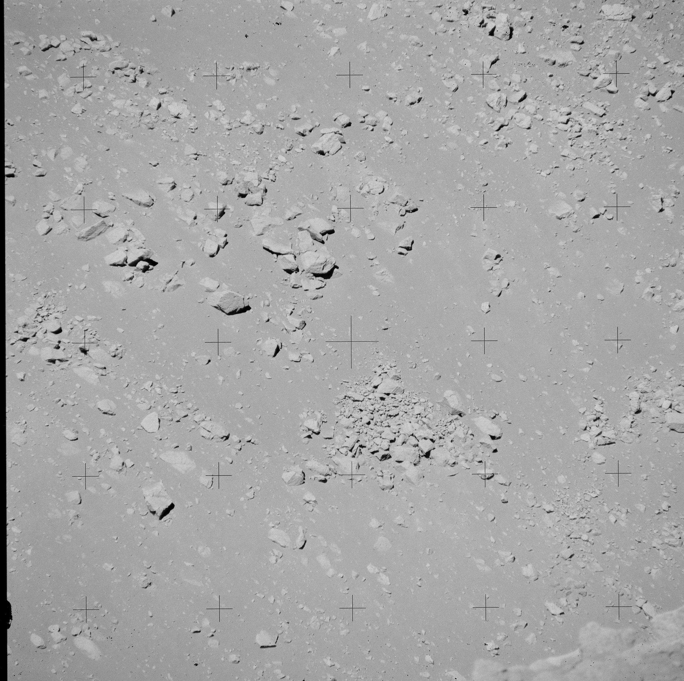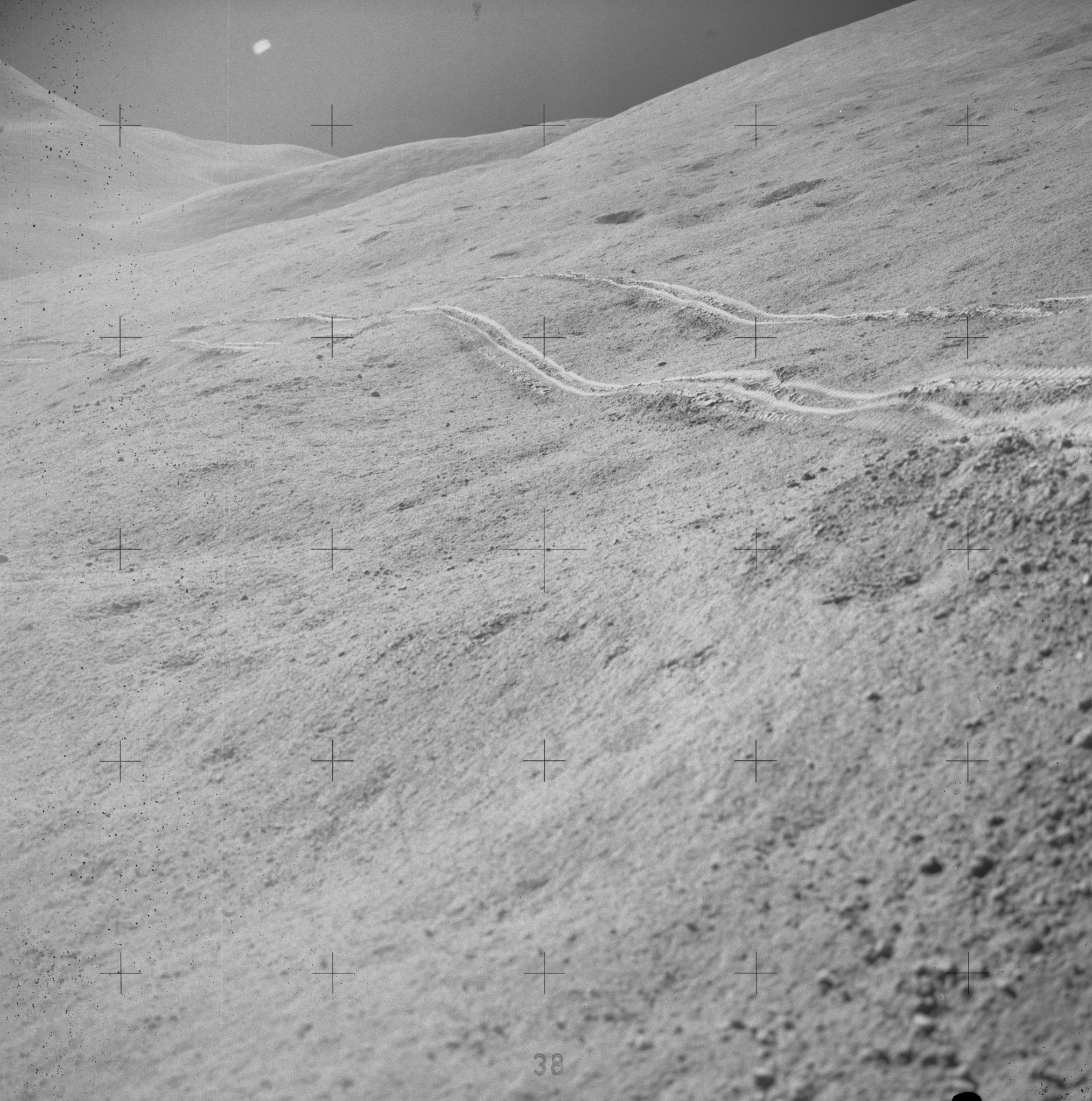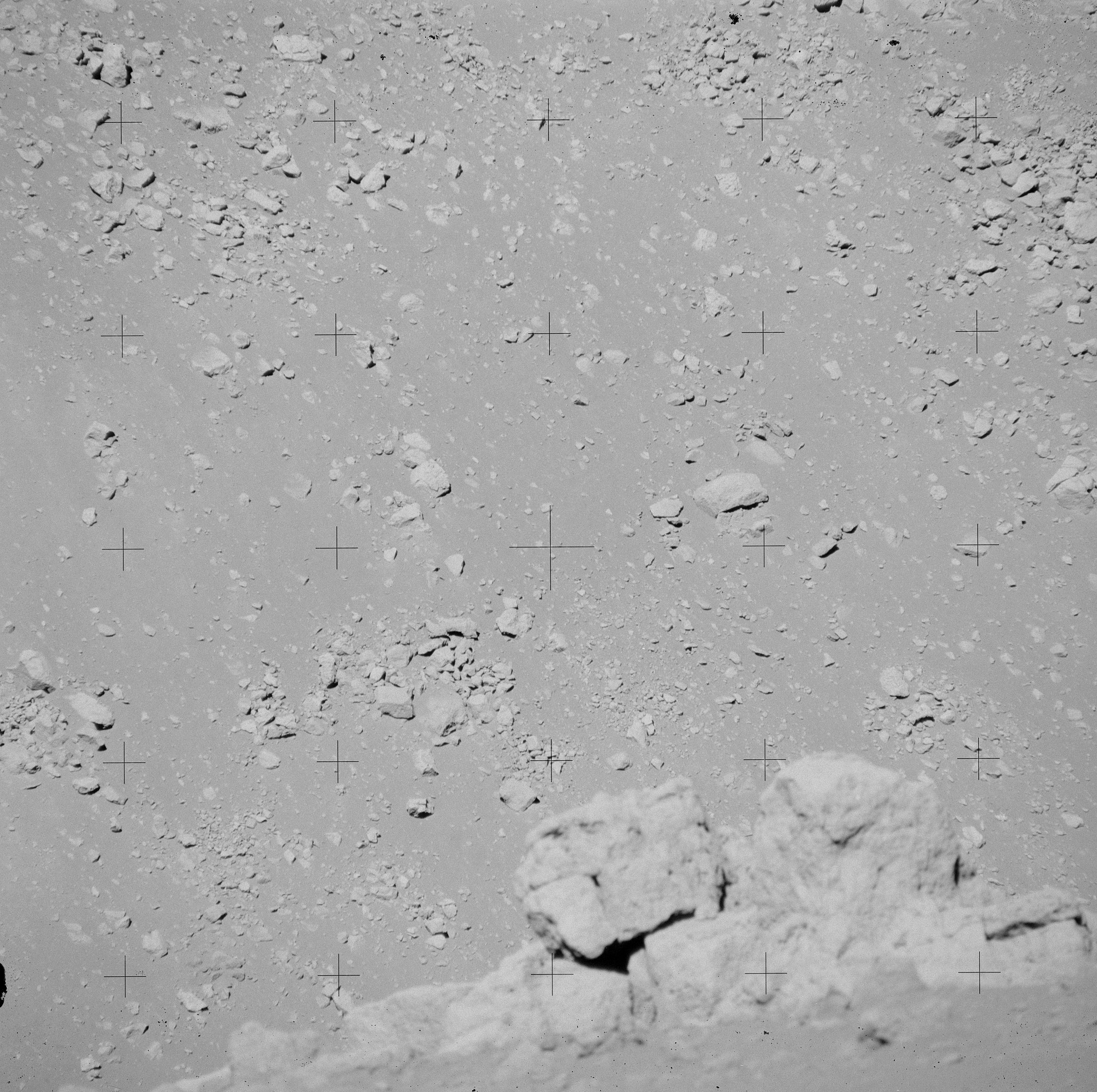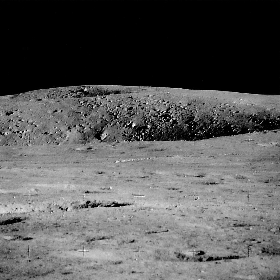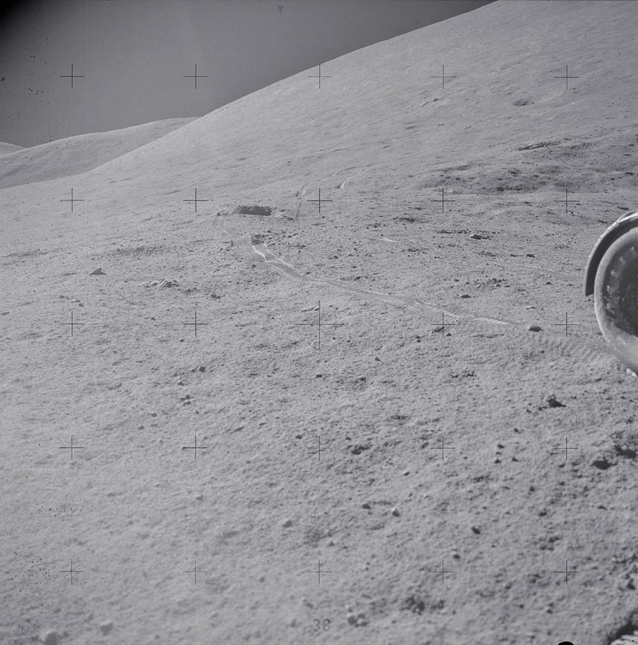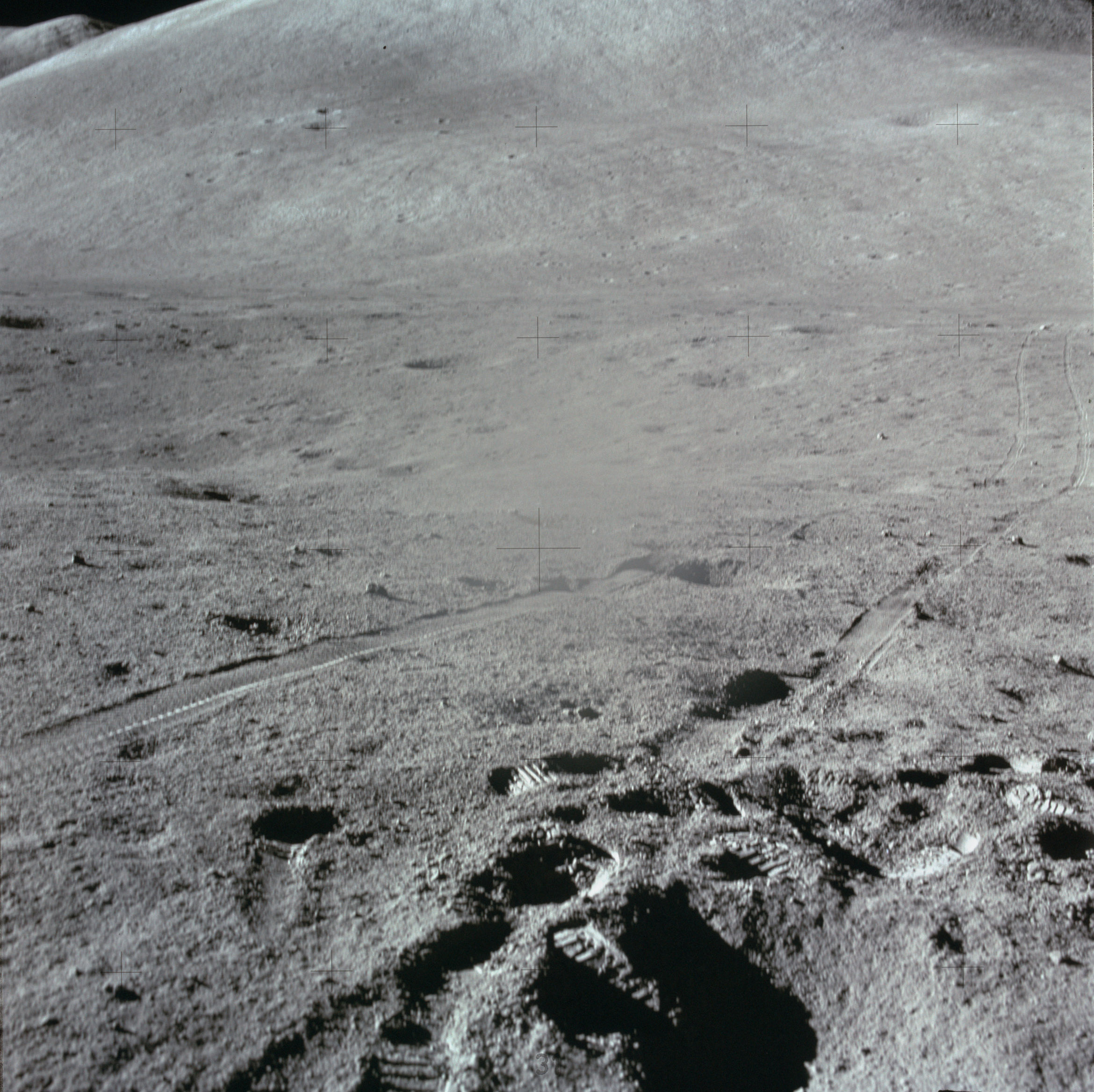 Stephen Tellier scanned a portion of Pan Camera frame 9798, which was taken during CSM Rev 38 at about 151:37. At that time, Dave and Jim were in the LM after the completion of EVA-2. A prominent feature of this image is the darkening of the soil around the LM and along a corridor extending from the LM toward 11 o'clock. See a comparison with frame 9377 by Markus Mehring, who has processed the images to account for differing orientations, different scales due to differing CSM-LM ranges, and different foreshortening due to differing CSM elevation angles. As Jack Schmitt discusses in the Apollo 17 commentary, the surface around the LM became brighter after being swept by the descent engine exhaust. As can be seen in photos taken on the surface, areas subsequently disturbed by the astronauts became relatively dark again. At locations relatively far from the LM, disturbed soil had the same brightness as undisturbed soil, another indication of brightening due to the engine exhaust.Rev. 50 Pan Camera 9809, North Detail ( 332k )