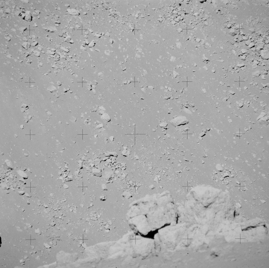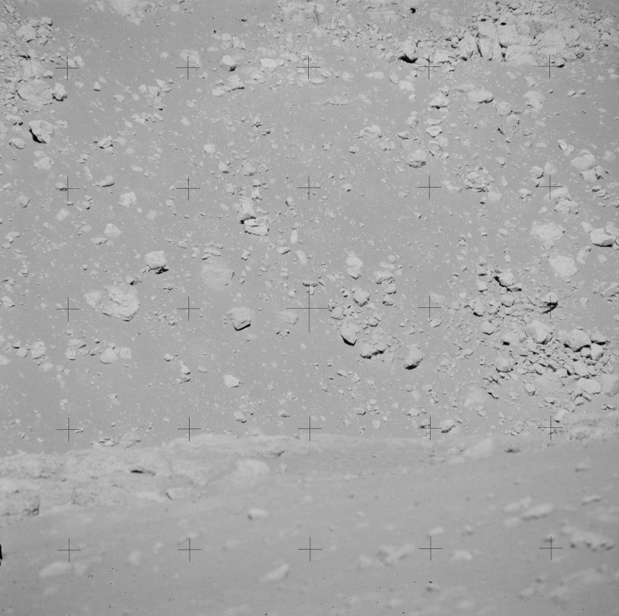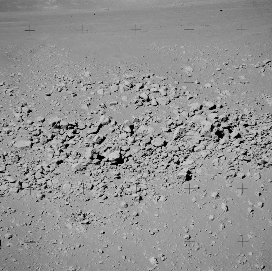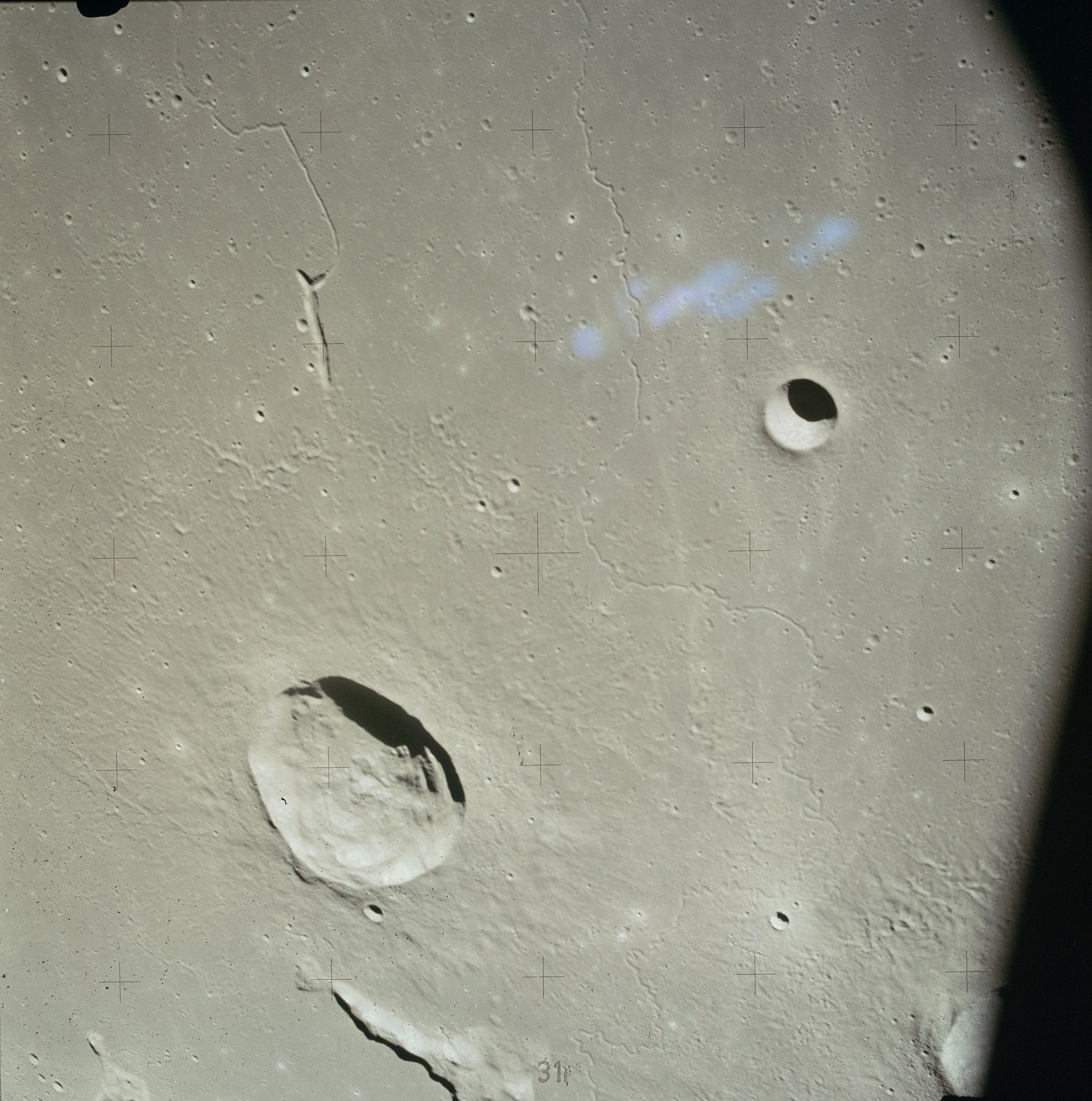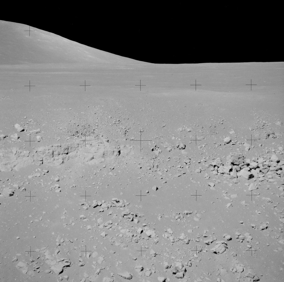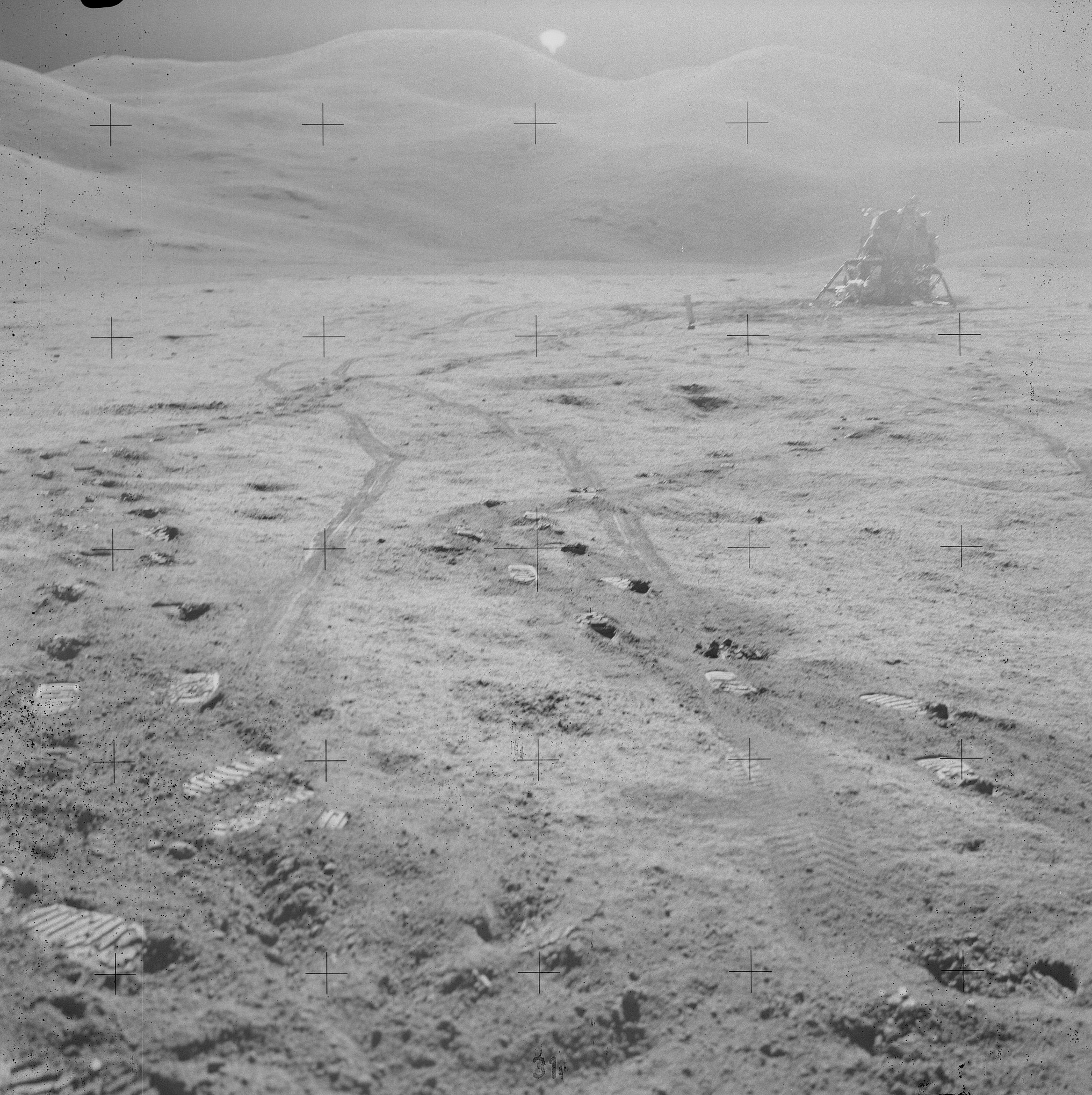 Stephen Tellier scanned a portion of Pan Camera frame 9798, which was taken during CSM Rev 38 at about 151:37. At that time, Dave and Jim were in the LM after the completion of EVA-2. A prominent feature of this image is the darkening of the soil around the LM and along a corridor extending from the LM toward 11 o'clock. See a comparison with frame 9377 by Markus Mehring, who has processed the images to account for differing orientations, different scales due to differing CSM-LM ranges, and different foreshortening due to differing CSM elevation angles. As Jack Schmitt discusses in the Apollo 17 commentary, the surface around the LM became brighter after being swept by the descent engine exhaust. As can be seen in photos taken on the surface, areas subsequently disturbed by the astronauts became relatively dark again. At locations relatively far from the LM, disturbed soil had the same brightness as undisturbed soil, another indication of brightening due to the engine exhaust.Rev. 50 Pan Camera 9809, North Detail ( 332k )