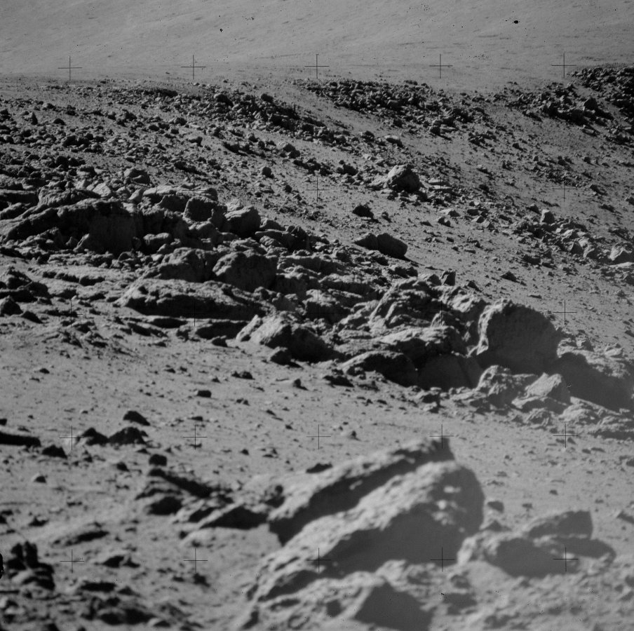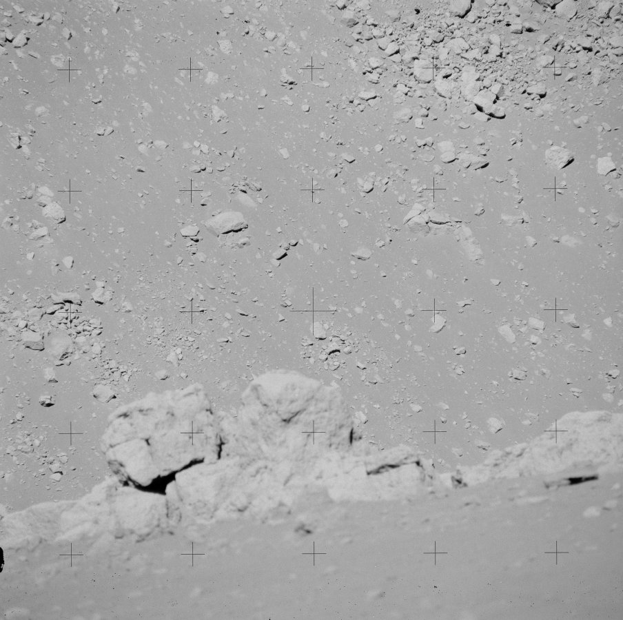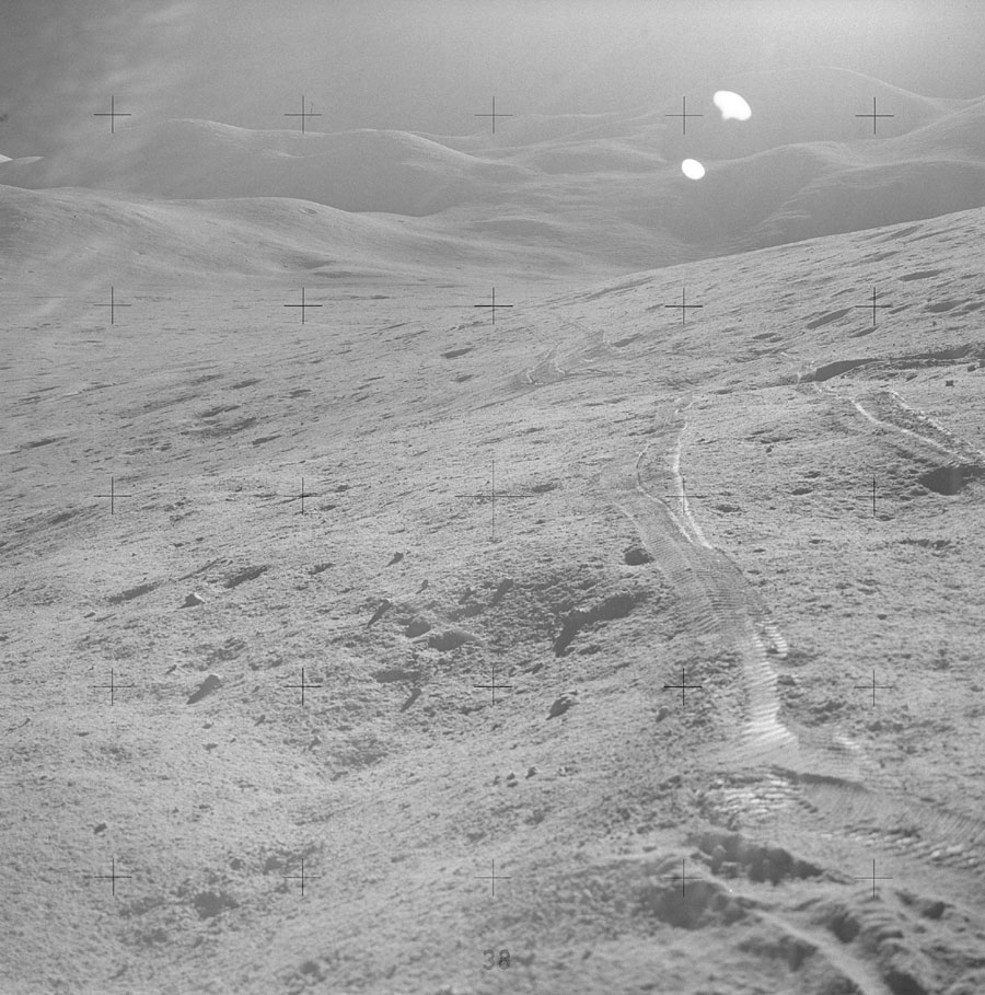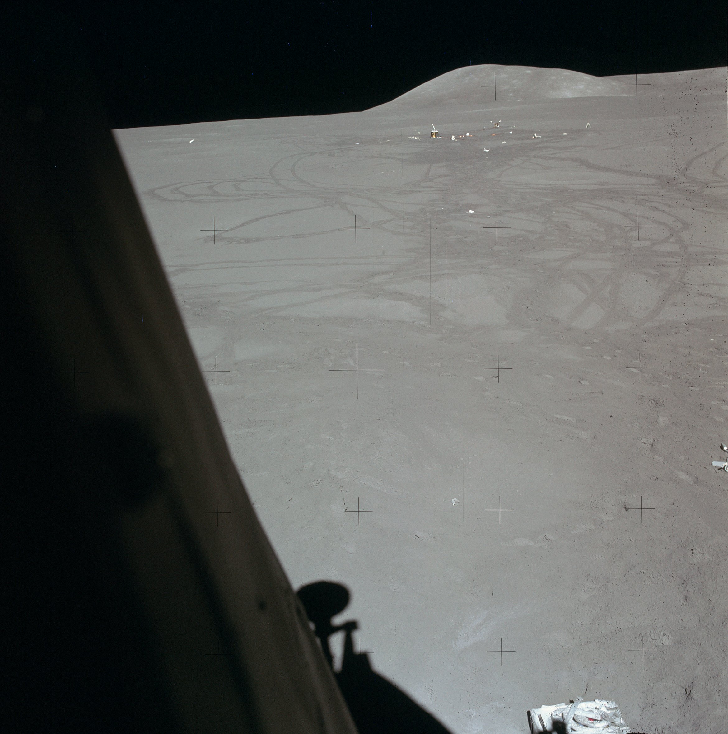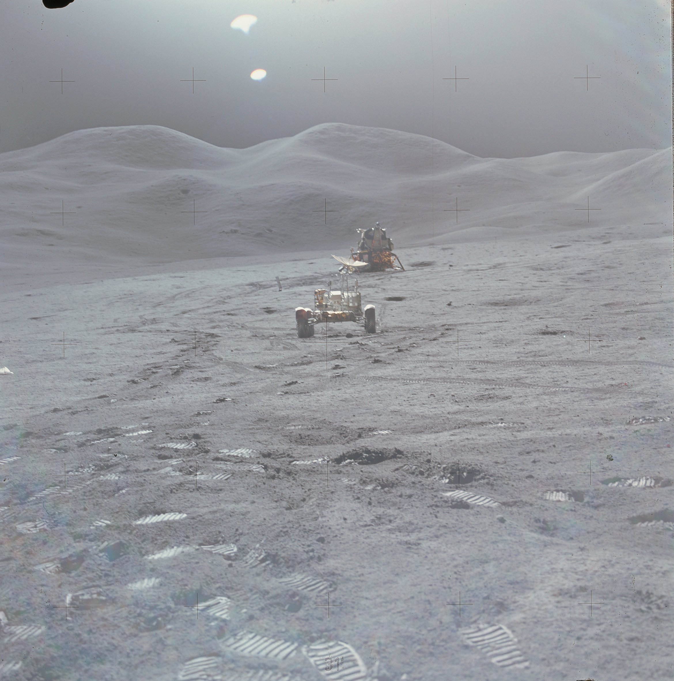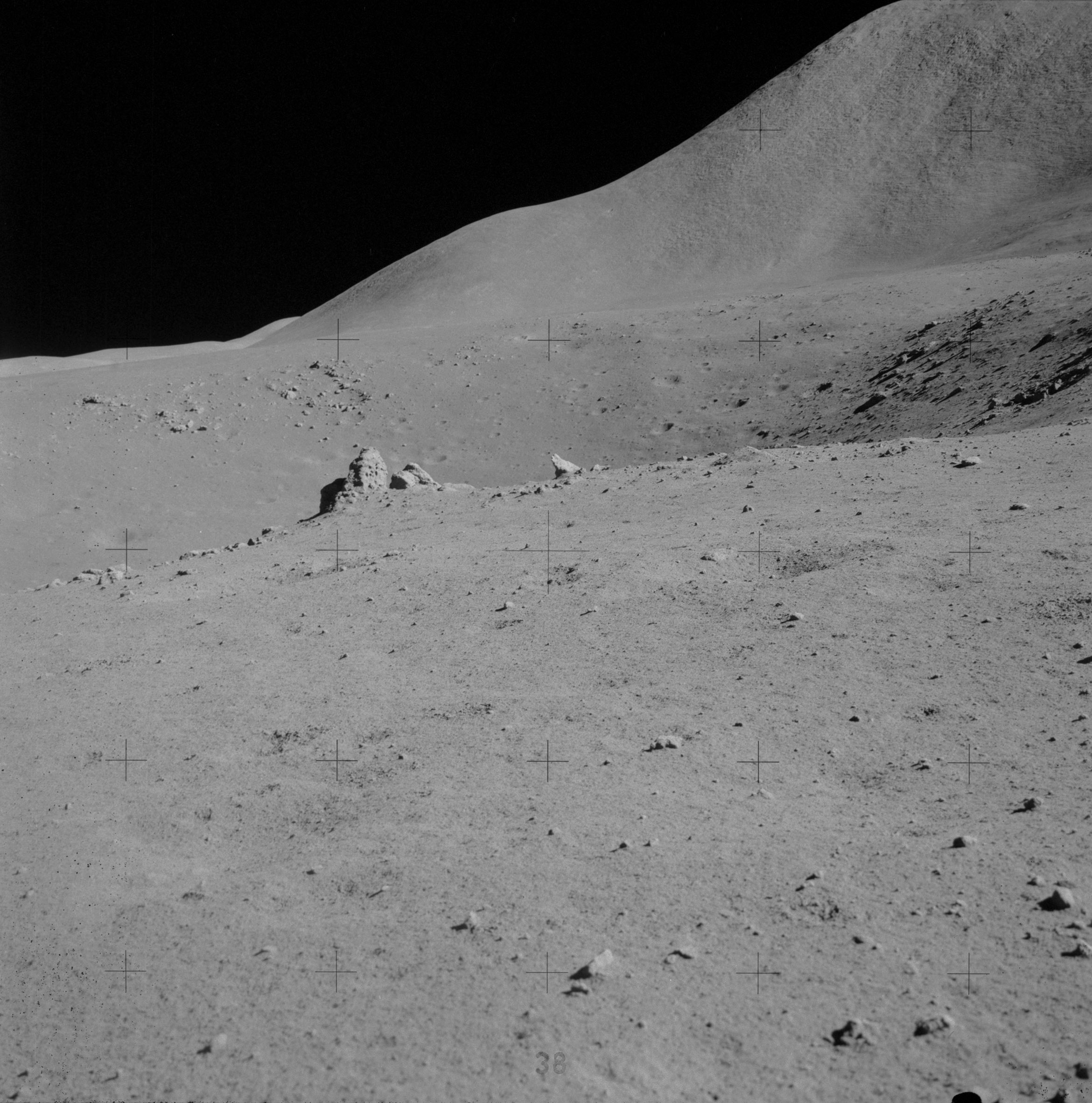 Stephen Tellier scanned a portion of Pan Camera frame 9798, which was taken during CSM Rev 38 at about 151:37. At that time, Dave and Jim were in the LM after the completion of EVA-2. A prominent feature of this image is the darkening of the soil around the LM and along a corridor extending from the LM toward 11 o'clock. See a comparison with frame 9377 by Markus Mehring, who has processed the images to account for differing orientations, different scales due to differing CSM-LM ranges, and different foreshortening due to differing CSM elevation angles. As Jack Schmitt discusses in the Apollo 17 commentary, the surface around the LM became brighter after being swept by the descent engine exhaust. As can be seen in photos taken on the surface, areas subsequently disturbed by the astronauts became relatively dark again. At locations relatively far from the LM, disturbed soil had the same brightness as undisturbed soil, another indication of brightening due to the engine exhaust.Rev. 50 Pan Camera 9809, North Detail ( 332k )