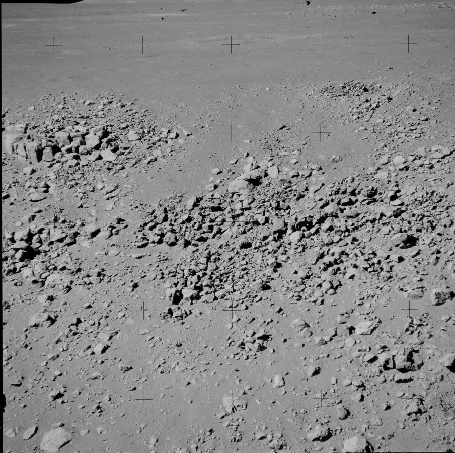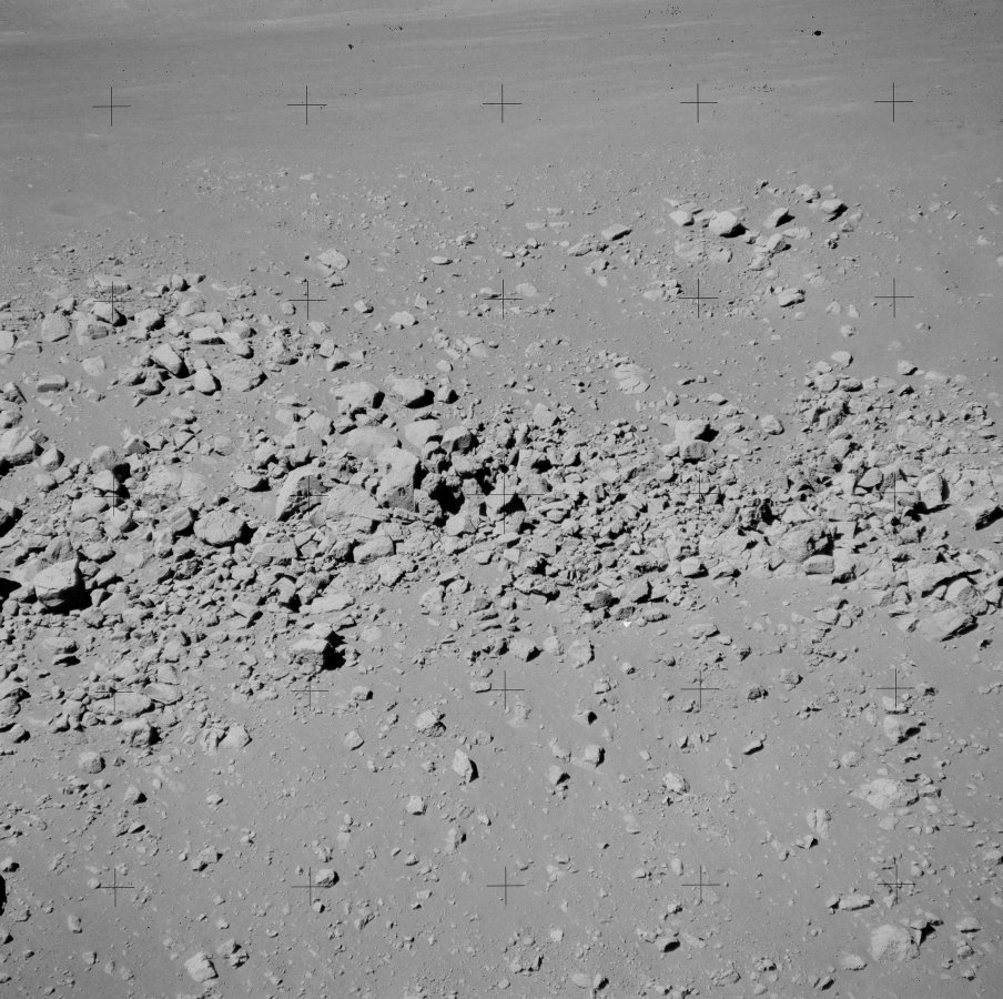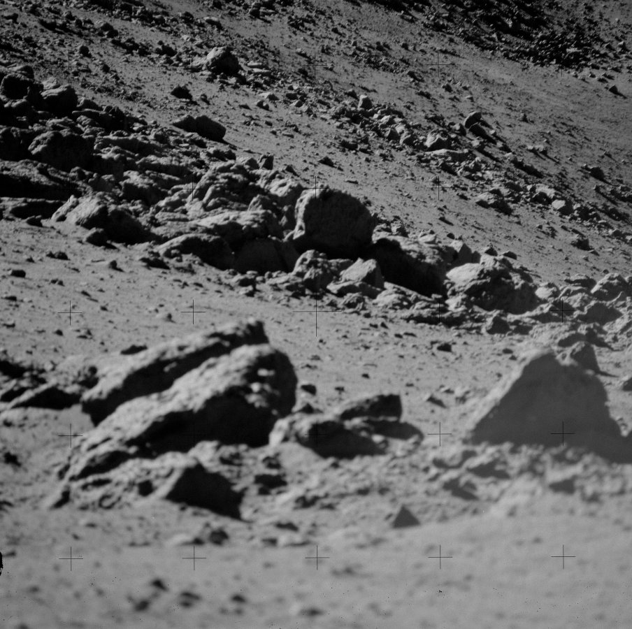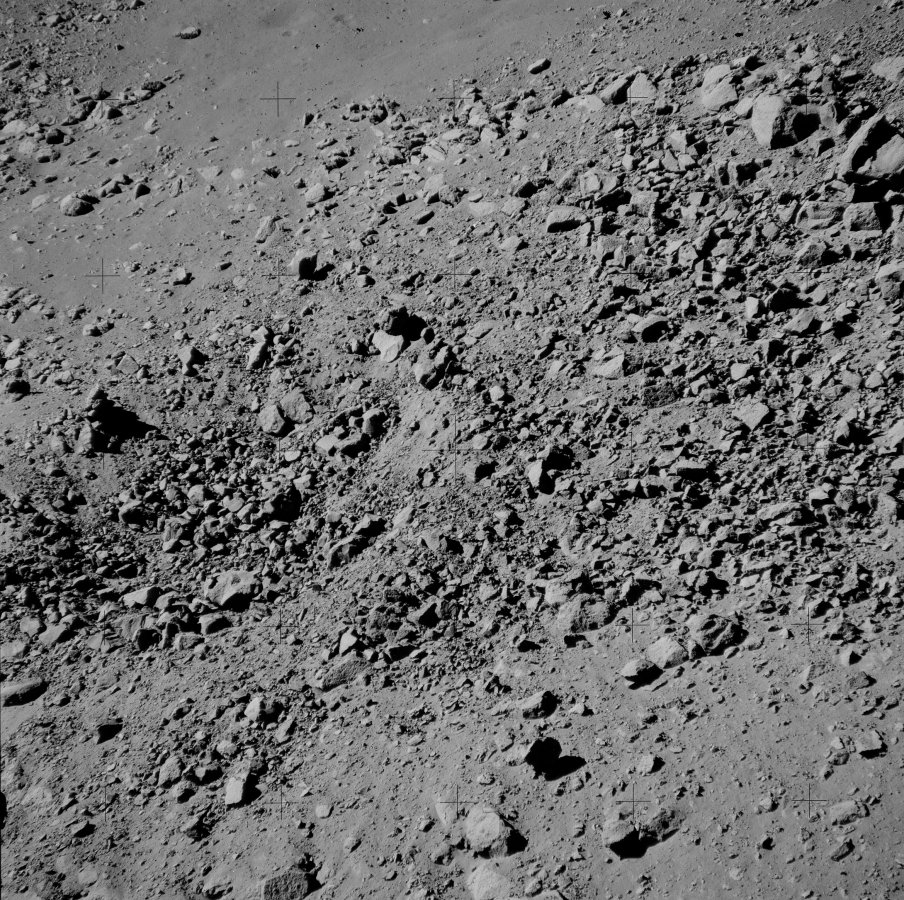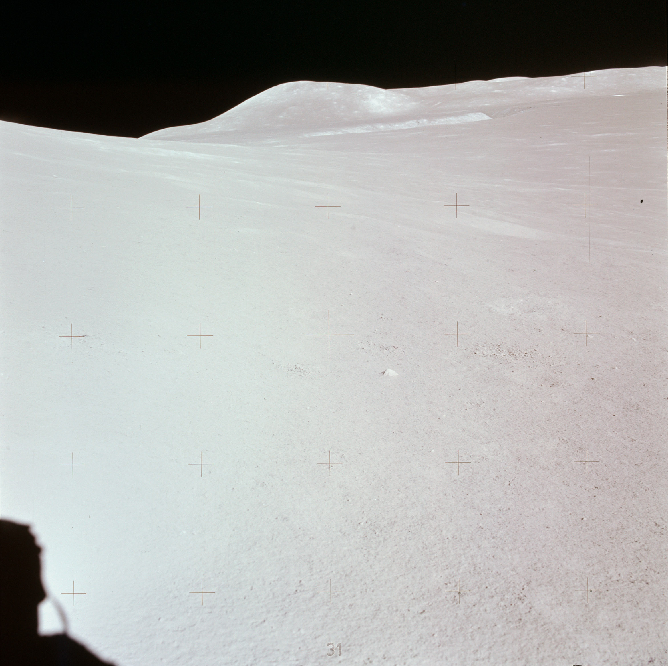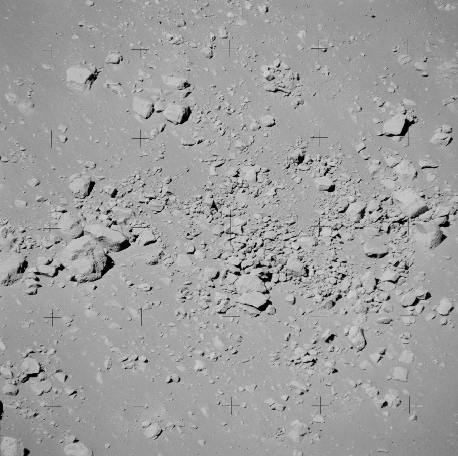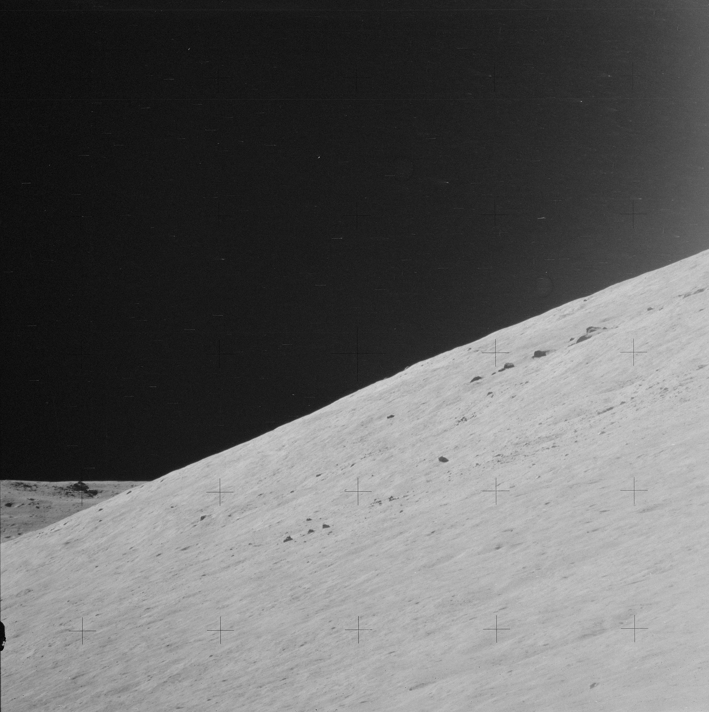 Stephen Tellier scanned a portion of Pan Camera frame 9798, which was taken during CSM Rev 38 at about 151:37. At that time, Dave and Jim were in the LM after the completion of EVA-2. A prominent feature of this image is the darkening of the soil around the LM and along a corridor extending from the LM toward 11 o'clock. See a comparison with frame 9377 by Markus Mehring, who has processed the images to account for differing orientations, different scales due to differing CSM-LM ranges, and different foreshortening due to differing CSM elevation angles. As Jack Schmitt discusses in the Apollo 17 commentary, the surface around the LM became brighter after being swept by the descent engine exhaust. As can be seen in photos taken on the surface, areas subsequently disturbed by the astronauts became relatively dark again. At locations relatively far from the LM, disturbed soil had the same brightness as undisturbed soil, another indication of brightening due to the engine exhaust.Rev. 50 Pan Camera 9809, North Detail ( 332k )
