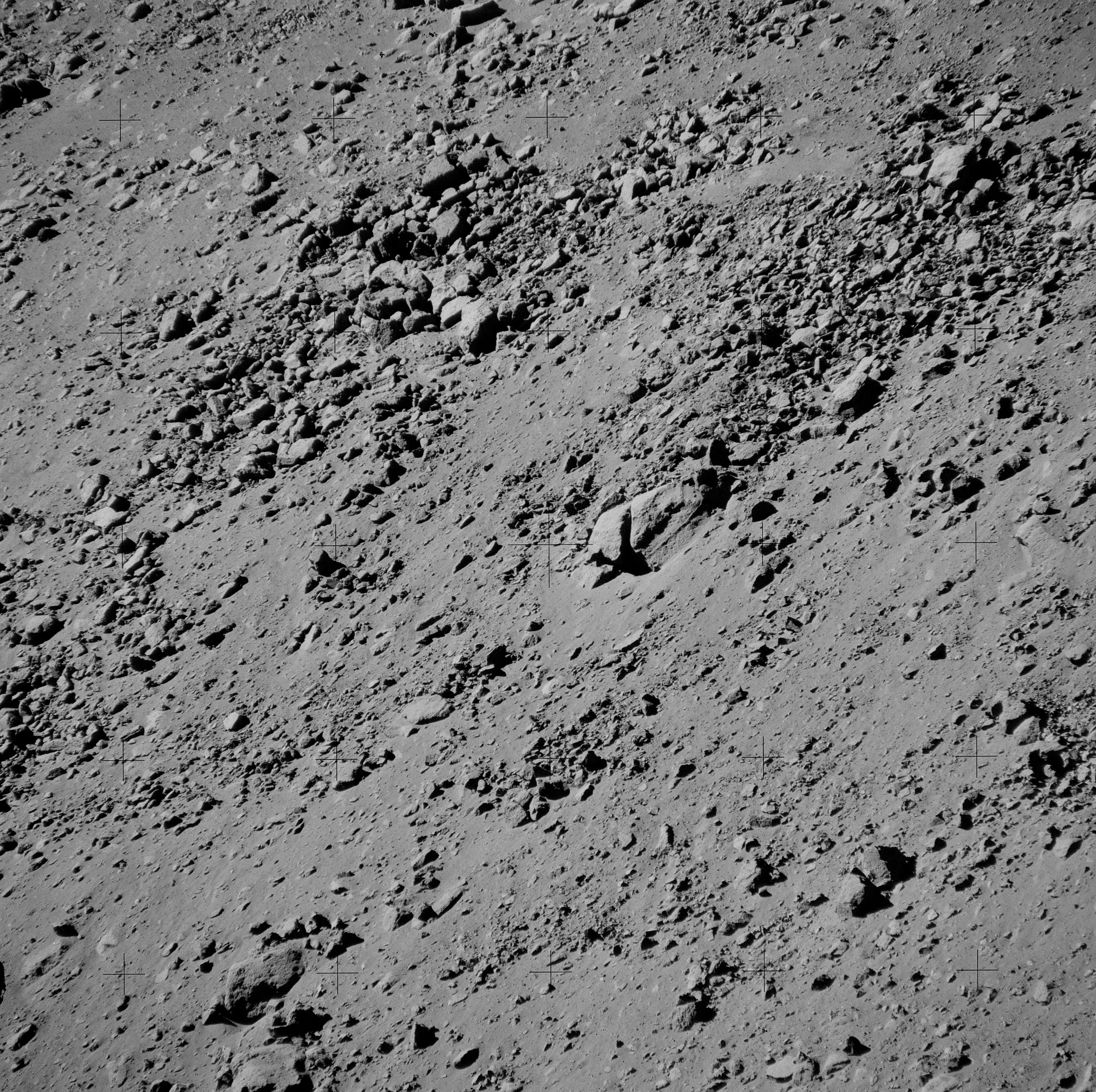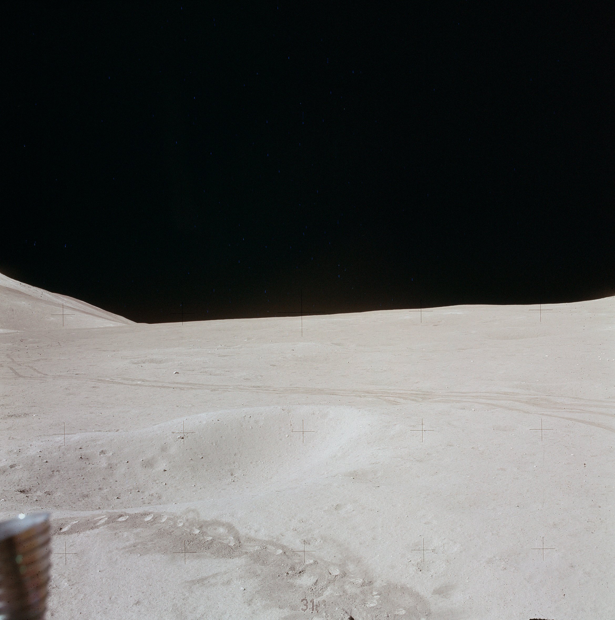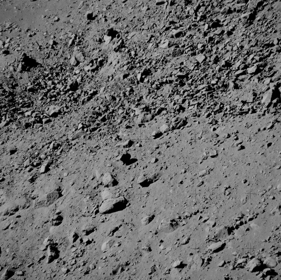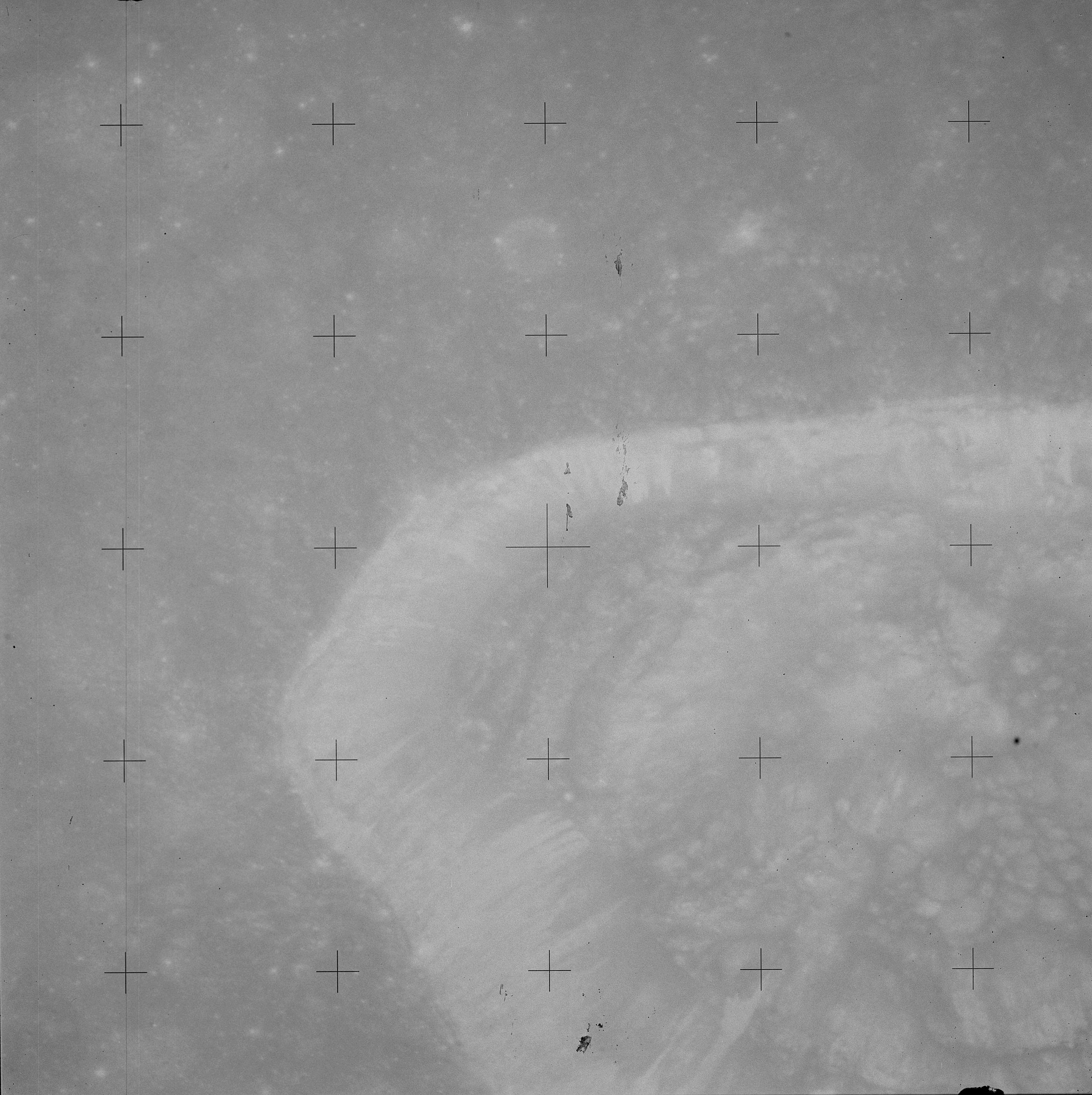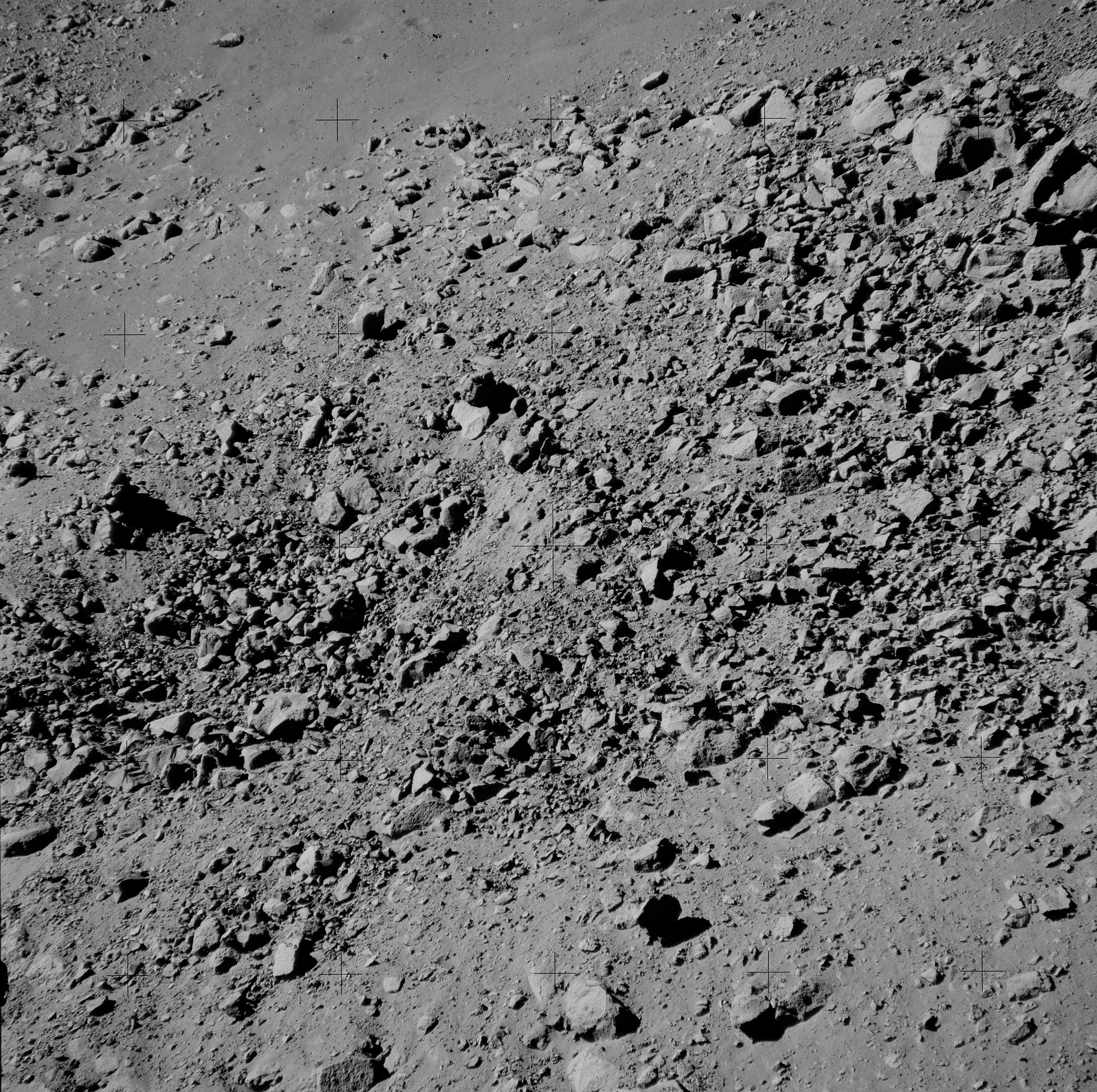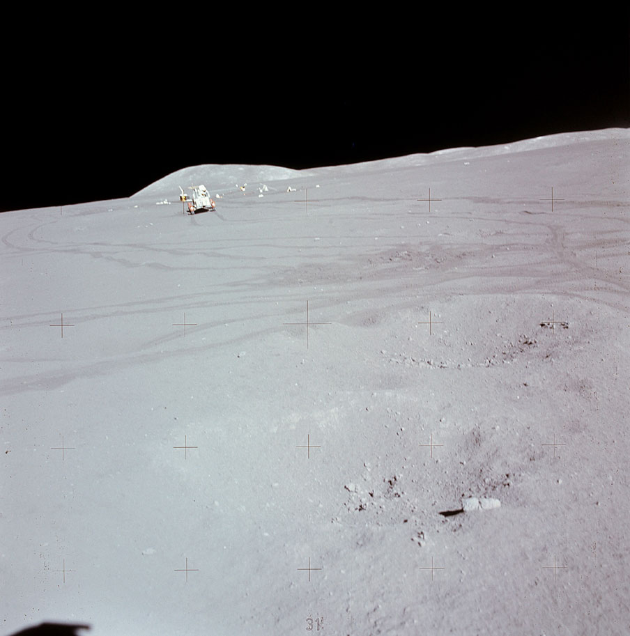 Stephen Tellier scanned a portion of Pan Camera frame 9798, which was taken during CSM Rev 38 at about 151:37. At that time, Dave and Jim were in the LM after the completion of EVA-2. A prominent feature of this image is the darkening of the soil around the LM and along a corridor extending from the LM toward 11 o'clock. See a comparison with frame 9377 by Markus Mehring, who has processed the images to account for differing orientations, different scales due to differing CSM-LM ranges, and different foreshortening due to differing CSM elevation angles. As Jack Schmitt discusses in the Apollo 17 commentary, the surface around the LM became brighter after being swept by the descent engine exhaust. As can be seen in photos taken on the surface, areas subsequently disturbed by the astronauts became relatively dark again. At locations relatively far from the LM, disturbed soil had the same brightness as undisturbed soil, another indication of brightening due to the engine exhaust.Rev. 50 Pan Camera 9809, North Detail ( 332k )
