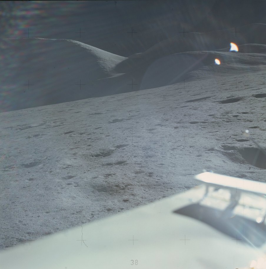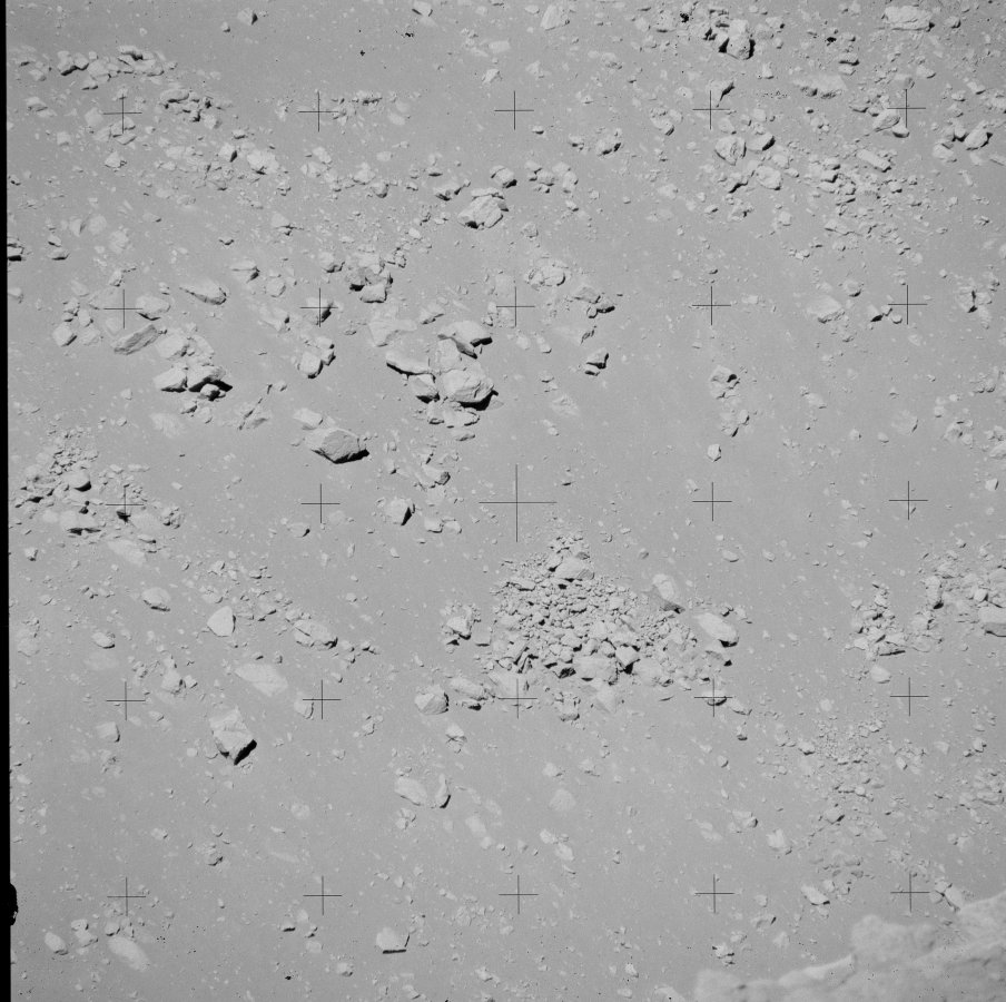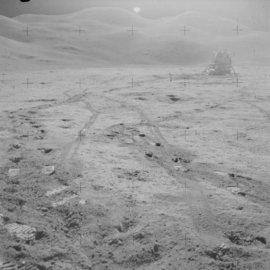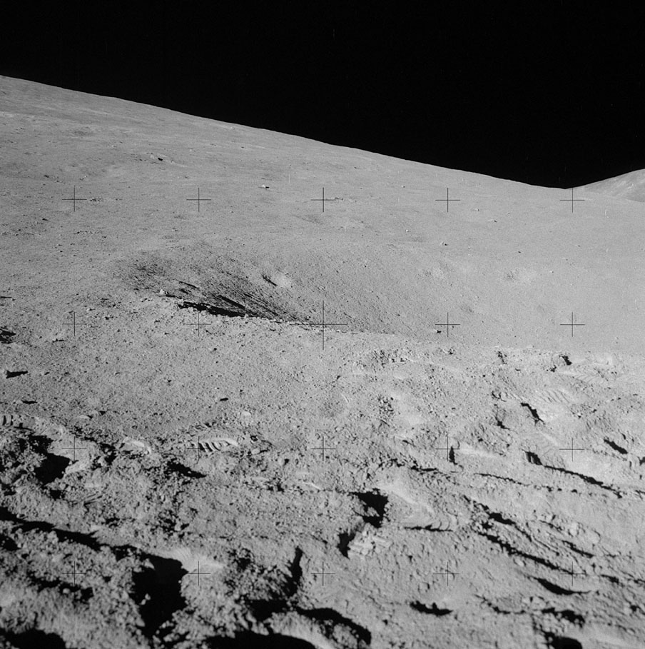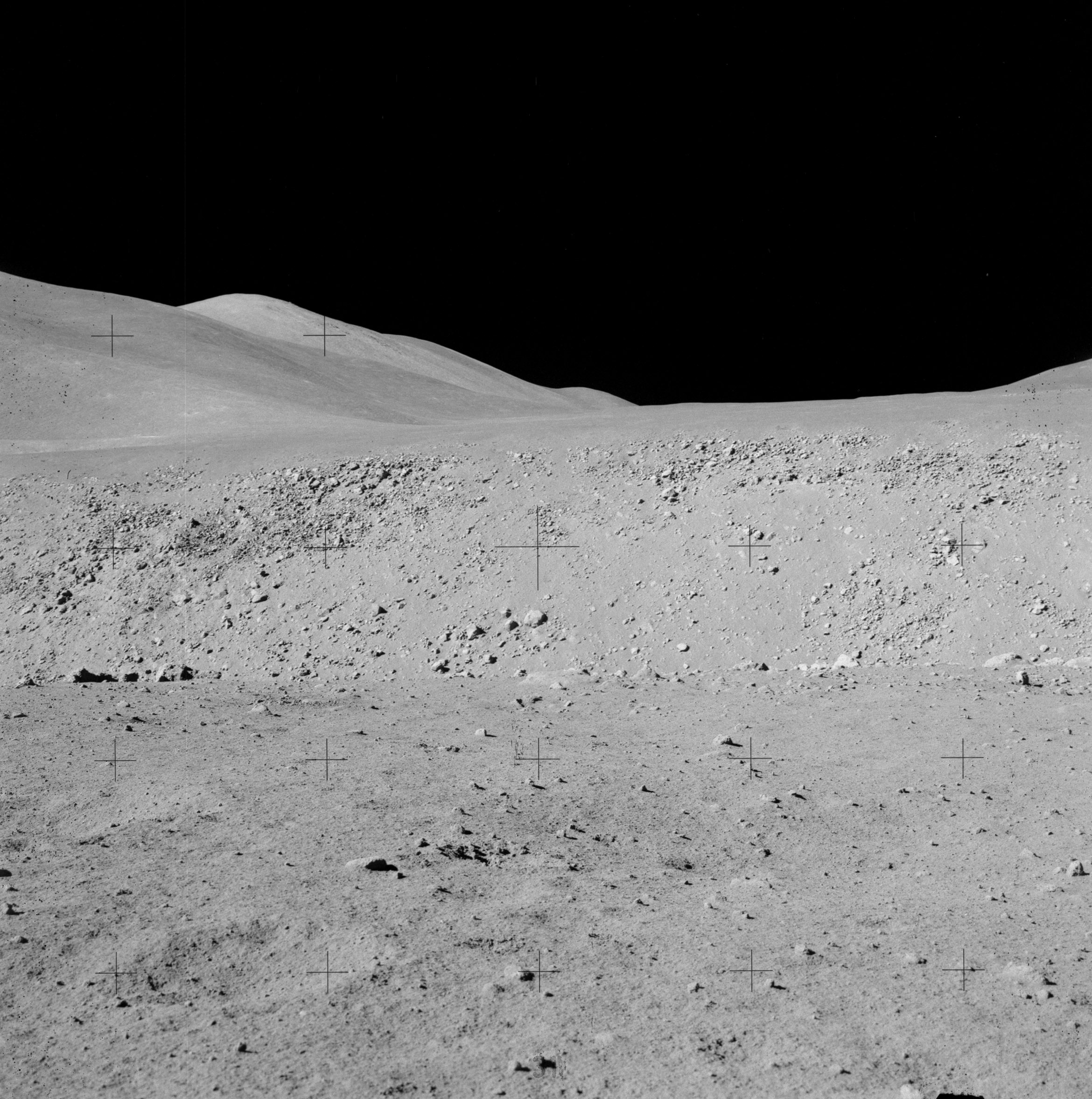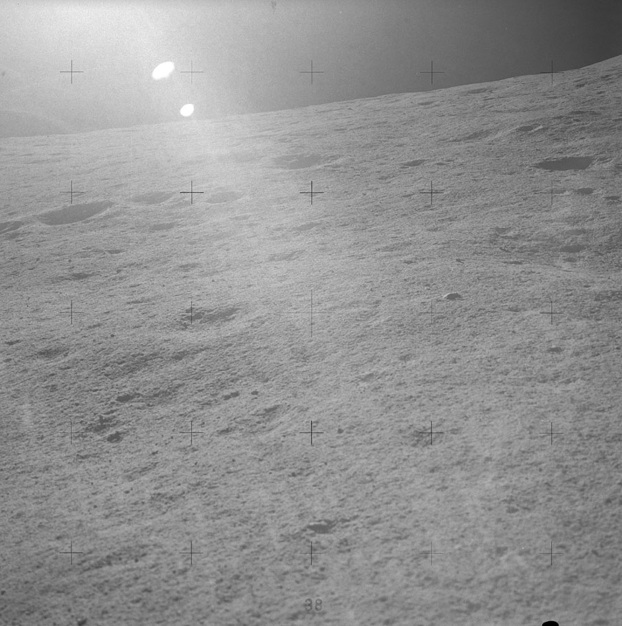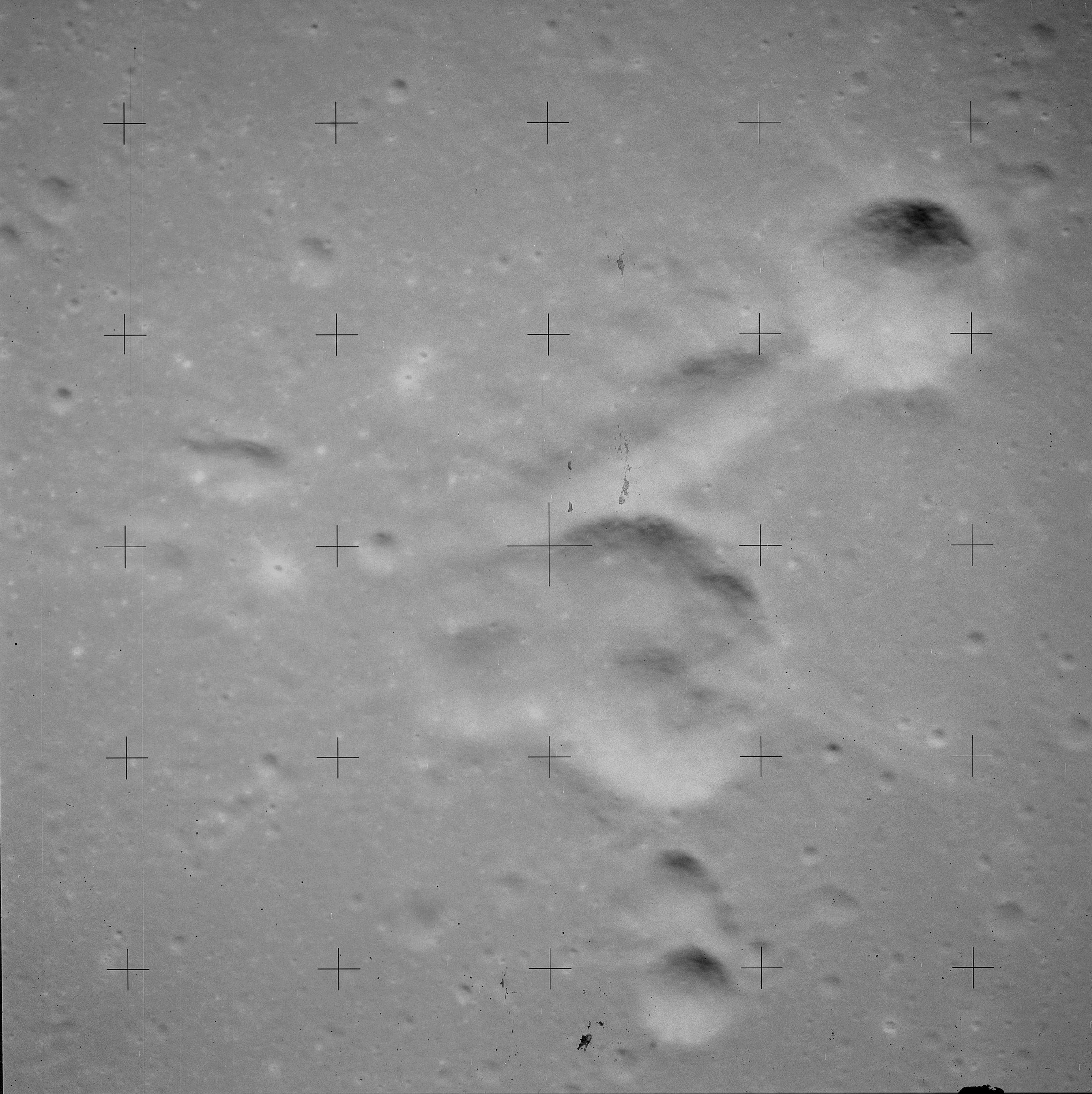 Stephen Tellier scanned a portion of Pan Camera frame 9798, which was taken during CSM Rev 38 at about 151:37. At that time, Dave and Jim were in the LM after the completion of EVA-2. A prominent feature of this image is the darkening of the soil around the LM and along a corridor extending from the LM toward 11 o'clock. See a comparison with frame 9377 by Markus Mehring, who has processed the images to account for differing orientations, different scales due to differing CSM-LM ranges, and different foreshortening due to differing CSM elevation angles. As Jack Schmitt discusses in the Apollo 17 commentary, the surface around the LM became brighter after being swept by the descent engine exhaust. As can be seen in photos taken on the surface, areas subsequently disturbed by the astronauts became relatively dark again. At locations relatively far from the LM, disturbed soil had the same brightness as undisturbed soil, another indication of brightening due to the engine exhaust.Rev. 50 Pan Camera 9809, North Detail ( 332k )