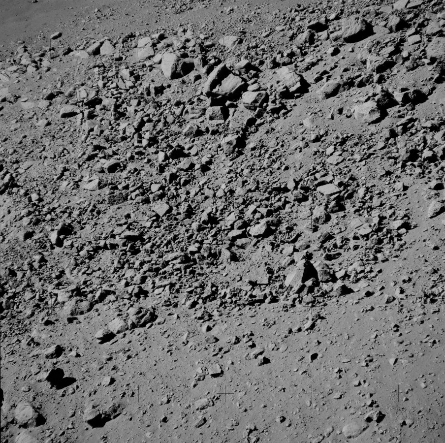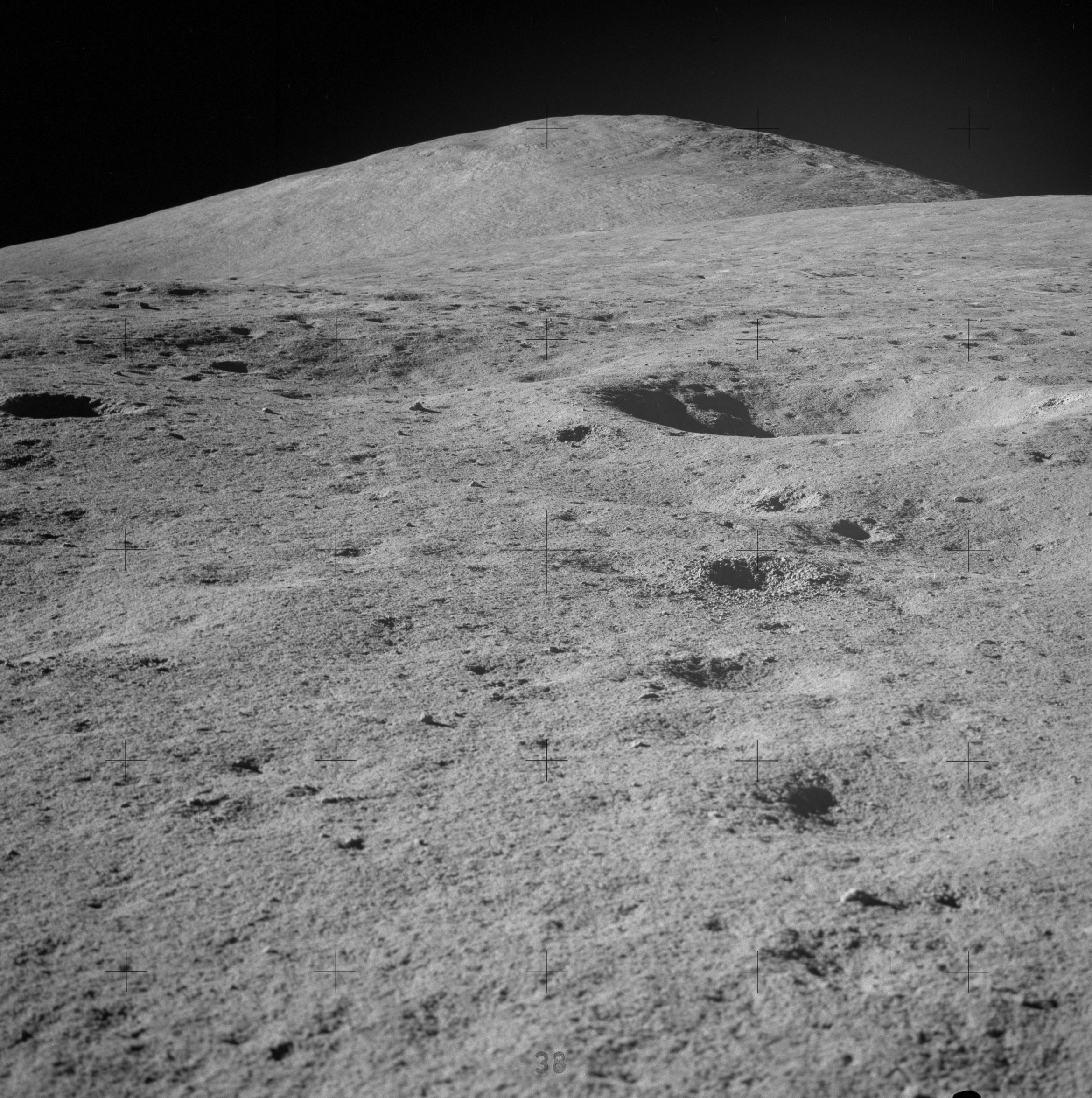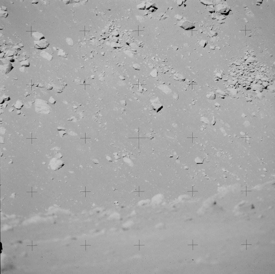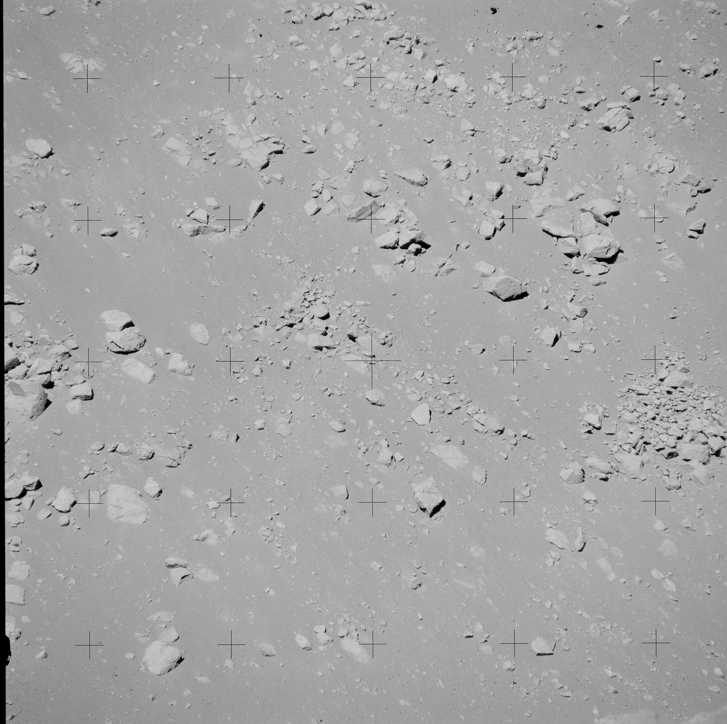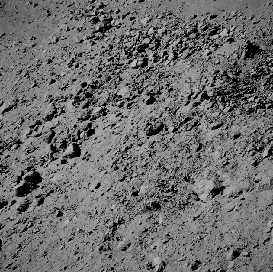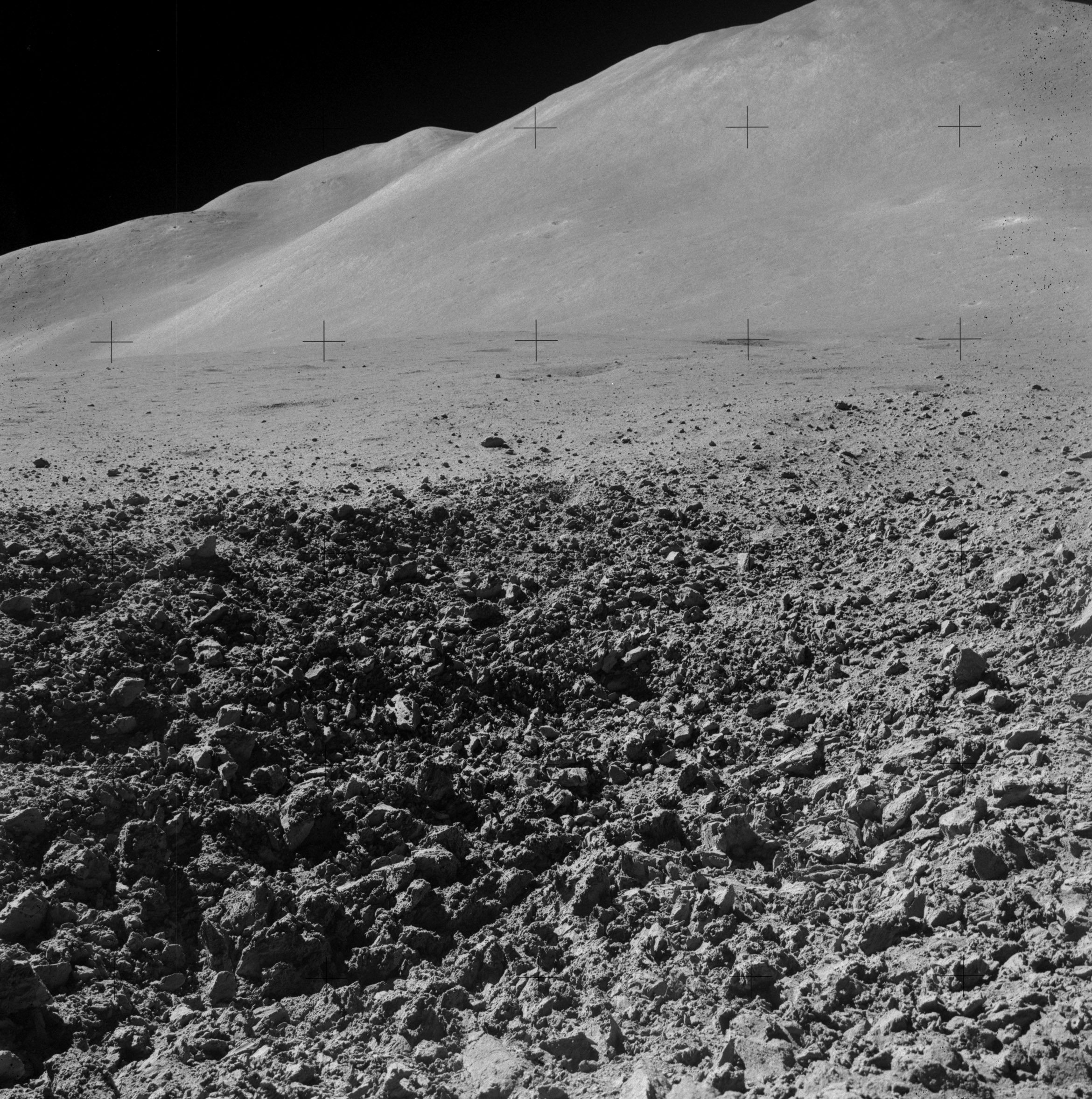 Stephen Tellier scanned a portion of Pan Camera frame 9798, which was taken during CSM Rev 38 at about 151:37. At that time, Dave and Jim were in the LM after the completion of EVA-2. A prominent feature of this image is the darkening of the soil around the LM and along a corridor extending from the LM toward 11 o'clock. See a comparison with frame 9377 by Markus Mehring, who has processed the images to account for differing orientations, different scales due to differing CSM-LM ranges, and different foreshortening due to differing CSM elevation angles. As Jack Schmitt discusses in the Apollo 17 commentary, the surface around the LM became brighter after being swept by the descent engine exhaust. As can be seen in photos taken on the surface, areas subsequently disturbed by the astronauts became relatively dark again. At locations relatively far from the LM, disturbed soil had the same brightness as undisturbed soil, another indication of brightening due to the engine exhaust.Rev. 50 Pan Camera 9809, North Detail ( 332k )
