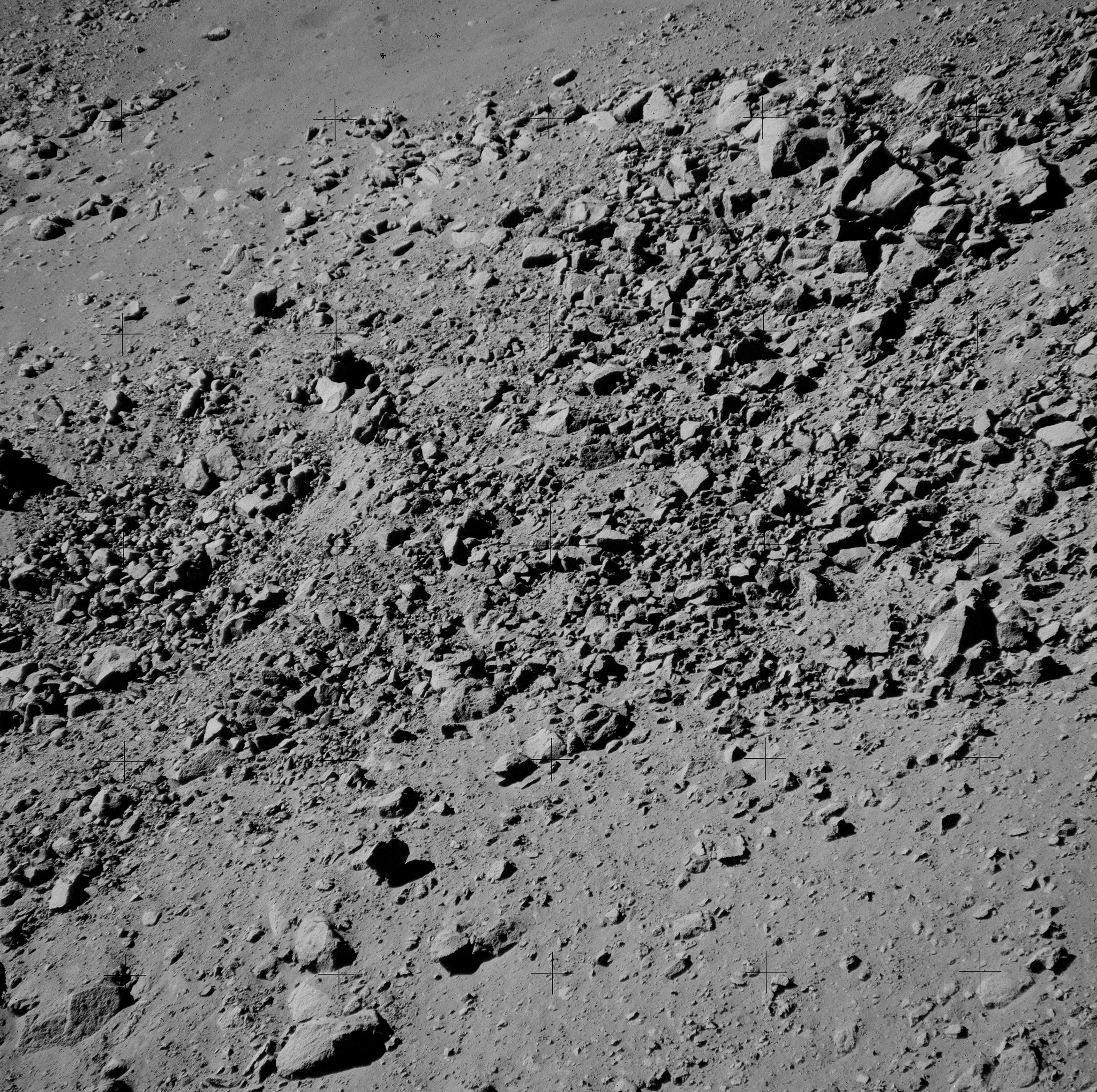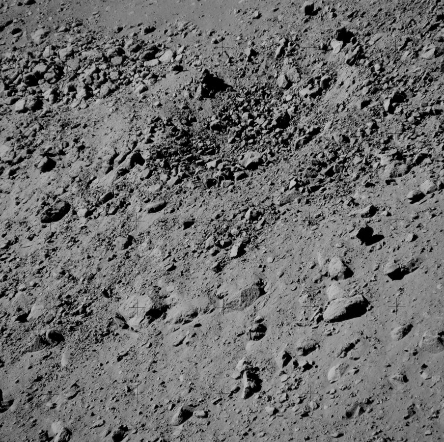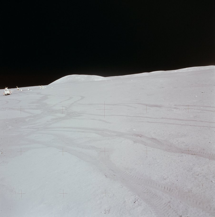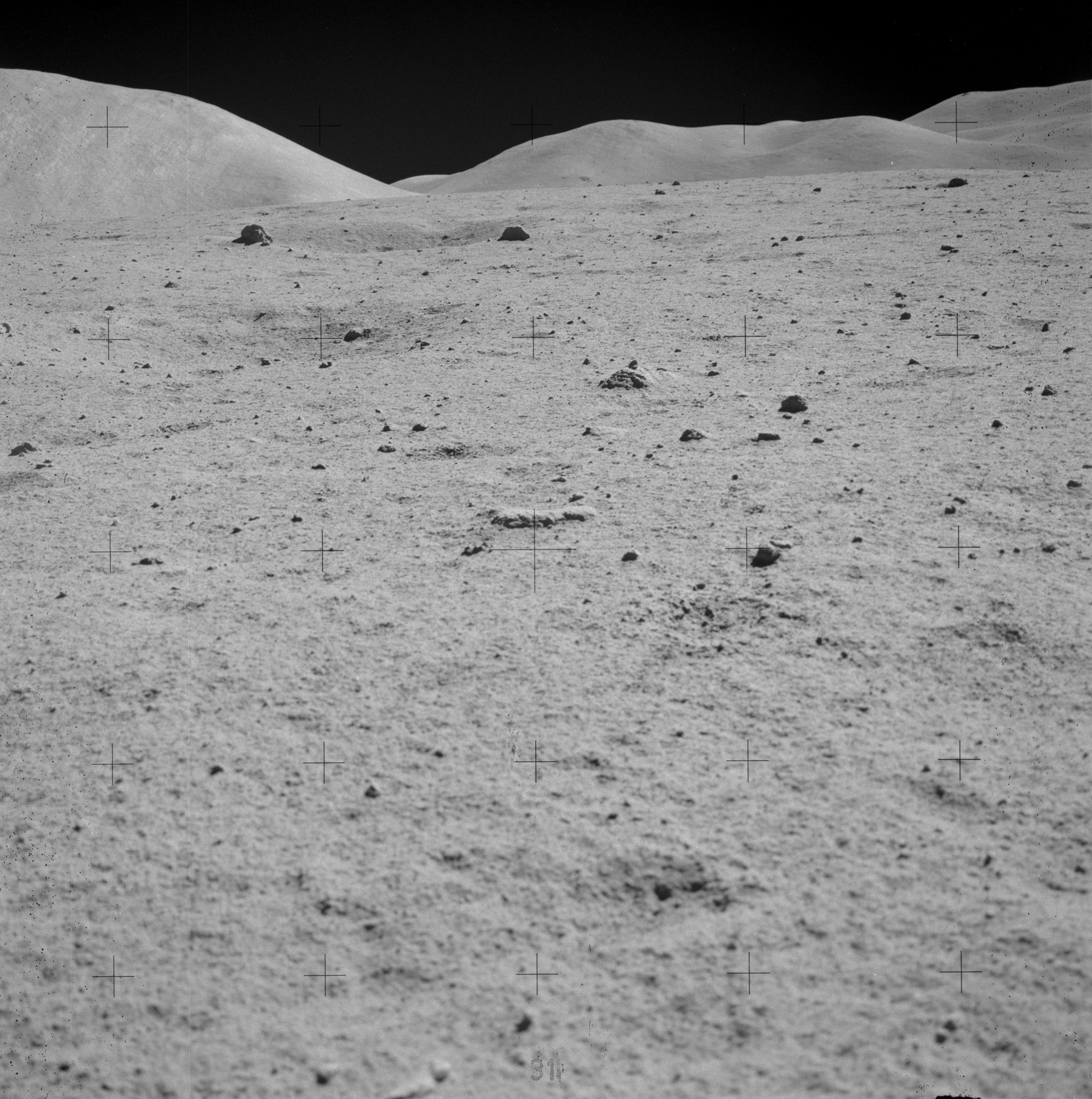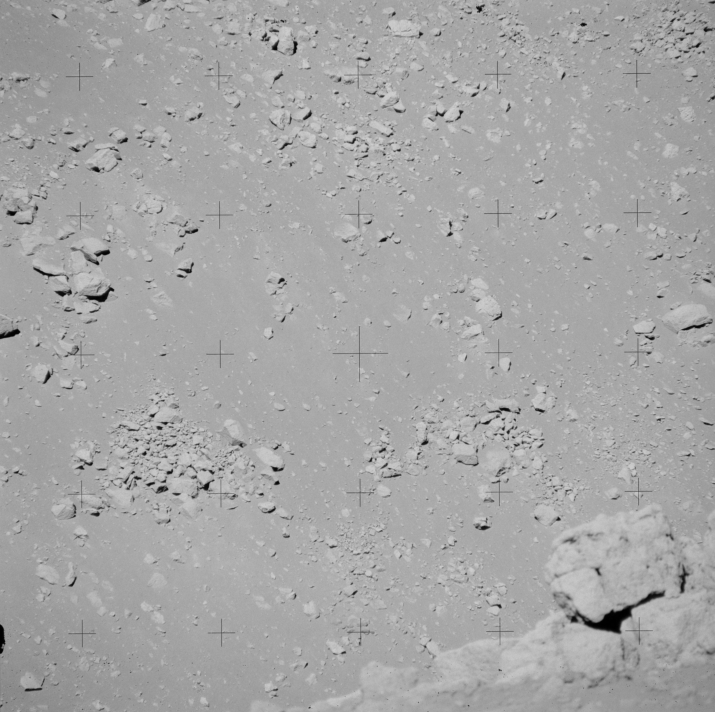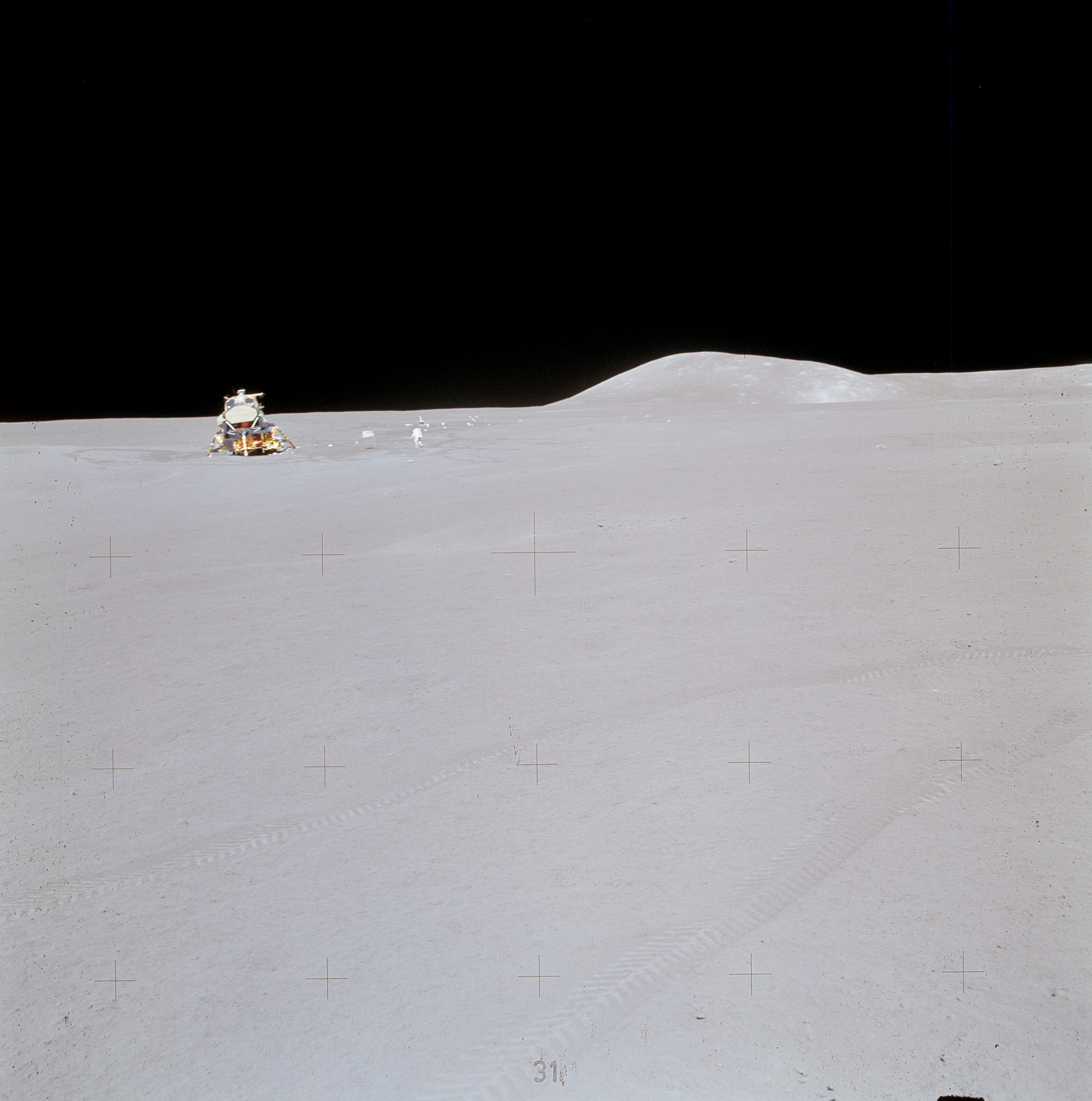 Stephen Tellier scanned a portion of Pan Camera frame 9798, which was taken during CSM Rev 38 at about 151:37. At that time, Dave and Jim were in the LM after the completion of EVA-2. A prominent feature of this image is the darkening of the soil around the LM and along a corridor extending from the LM toward 11 o'clock. See a comparison with frame 9377 by Markus Mehring, who has processed the images to account for differing orientations, different scales due to differing CSM-LM ranges, and different foreshortening due to differing CSM elevation angles. As Jack Schmitt discusses in the Apollo 17 commentary, the surface around the LM became brighter after being swept by the descent engine exhaust. As can be seen in photos taken on the surface, areas subsequently disturbed by the astronauts became relatively dark again. At locations relatively far from the LM, disturbed soil had the same brightness as undisturbed soil, another indication of brightening due to the engine exhaust.Rev. 50 Pan Camera 9809, North Detail ( 332k )