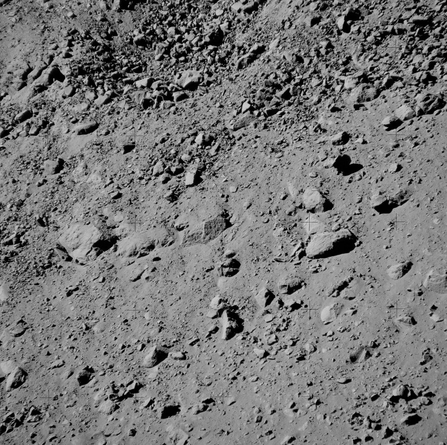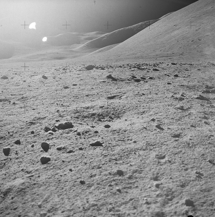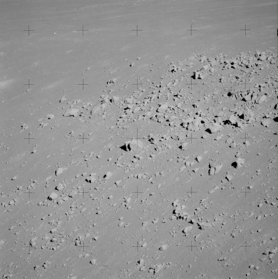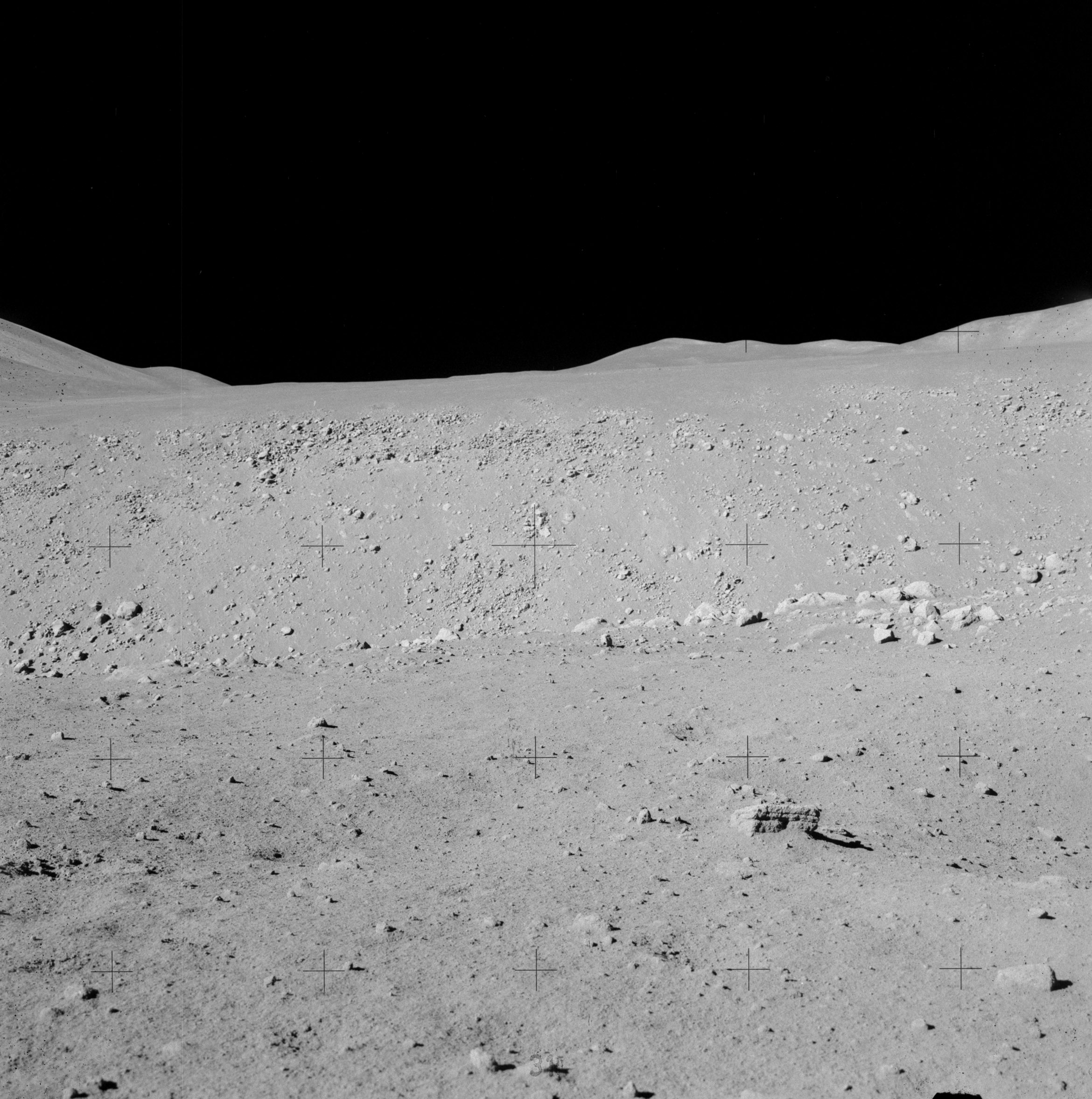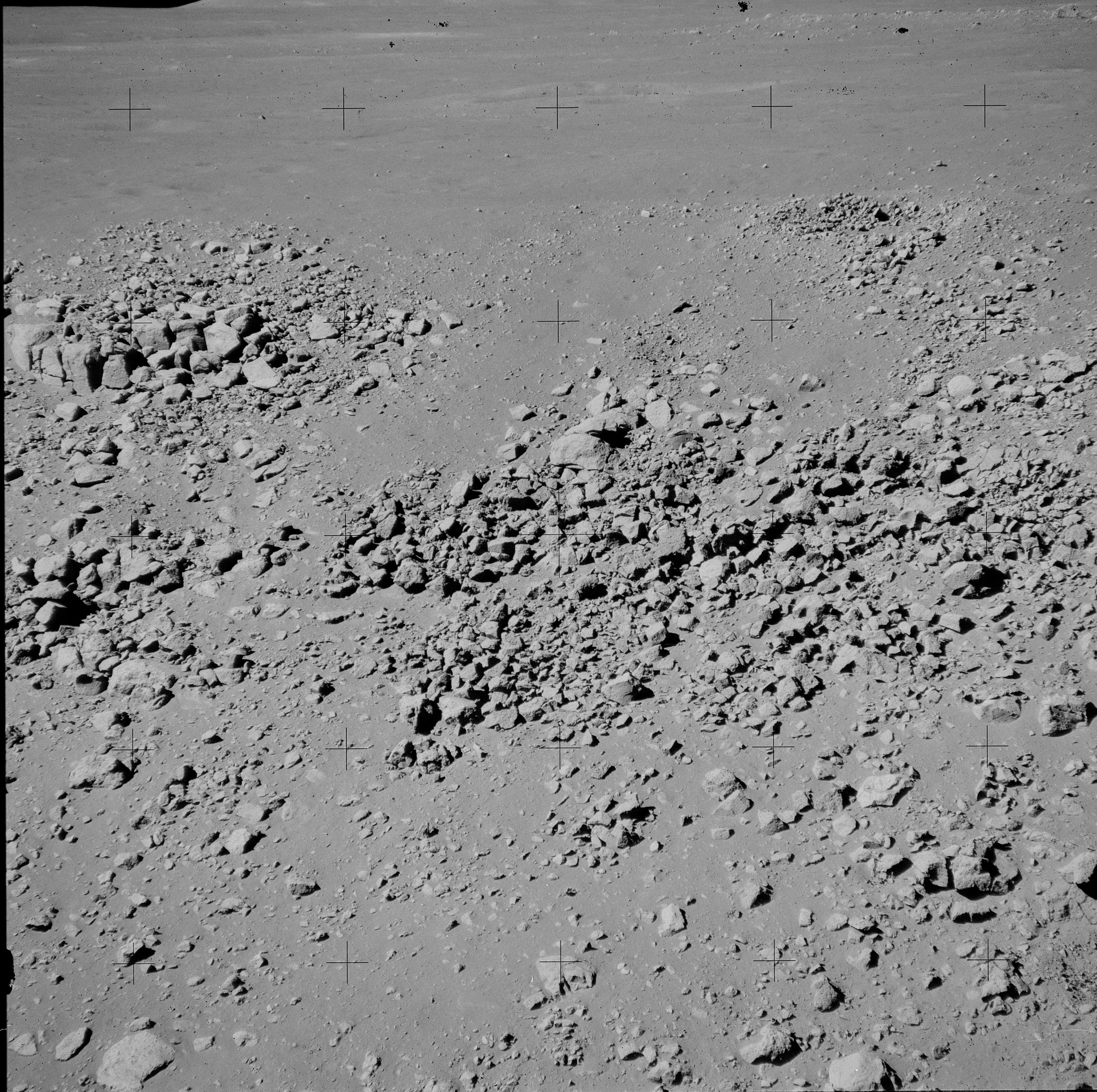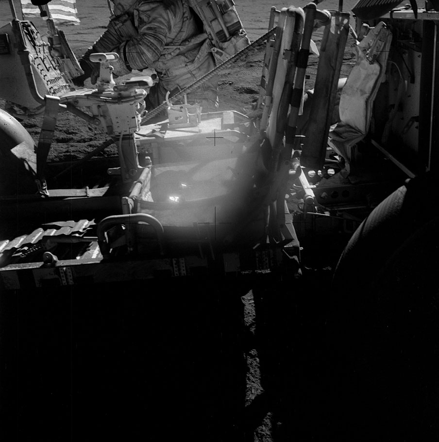 Stephen Tellier scanned a portion of Pan Camera frame 9798, which was taken during CSM Rev 38 at about 151:37. At that time, Dave and Jim were in the LM after the completion of EVA-2. A prominent feature of this image is the darkening of the soil around the LM and along a corridor extending from the LM toward 11 o'clock. See a comparison with frame 9377 by Markus Mehring, who has processed the images to account for differing orientations, different scales due to differing CSM-LM ranges, and different foreshortening due to differing CSM elevation angles. As Jack Schmitt discusses in the Apollo 17 commentary, the surface around the LM became brighter after being swept by the descent engine exhaust. As can be seen in photos taken on the surface, areas subsequently disturbed by the astronauts became relatively dark again. At locations relatively far from the LM, disturbed soil had the same brightness as undisturbed soil, another indication of brightening due to the engine exhaust.Rev. 50 Pan Camera 9809, North Detail ( 332k )