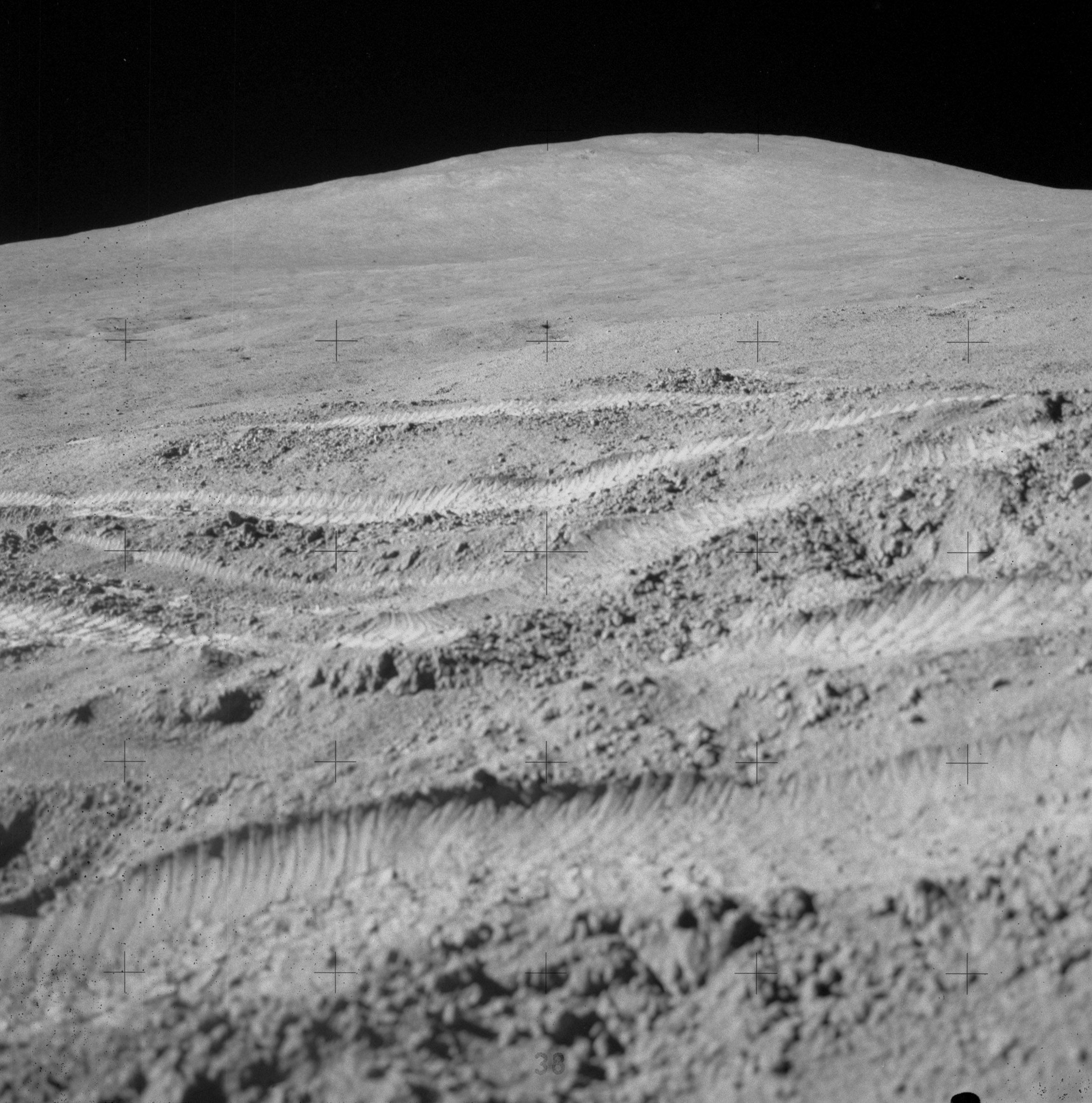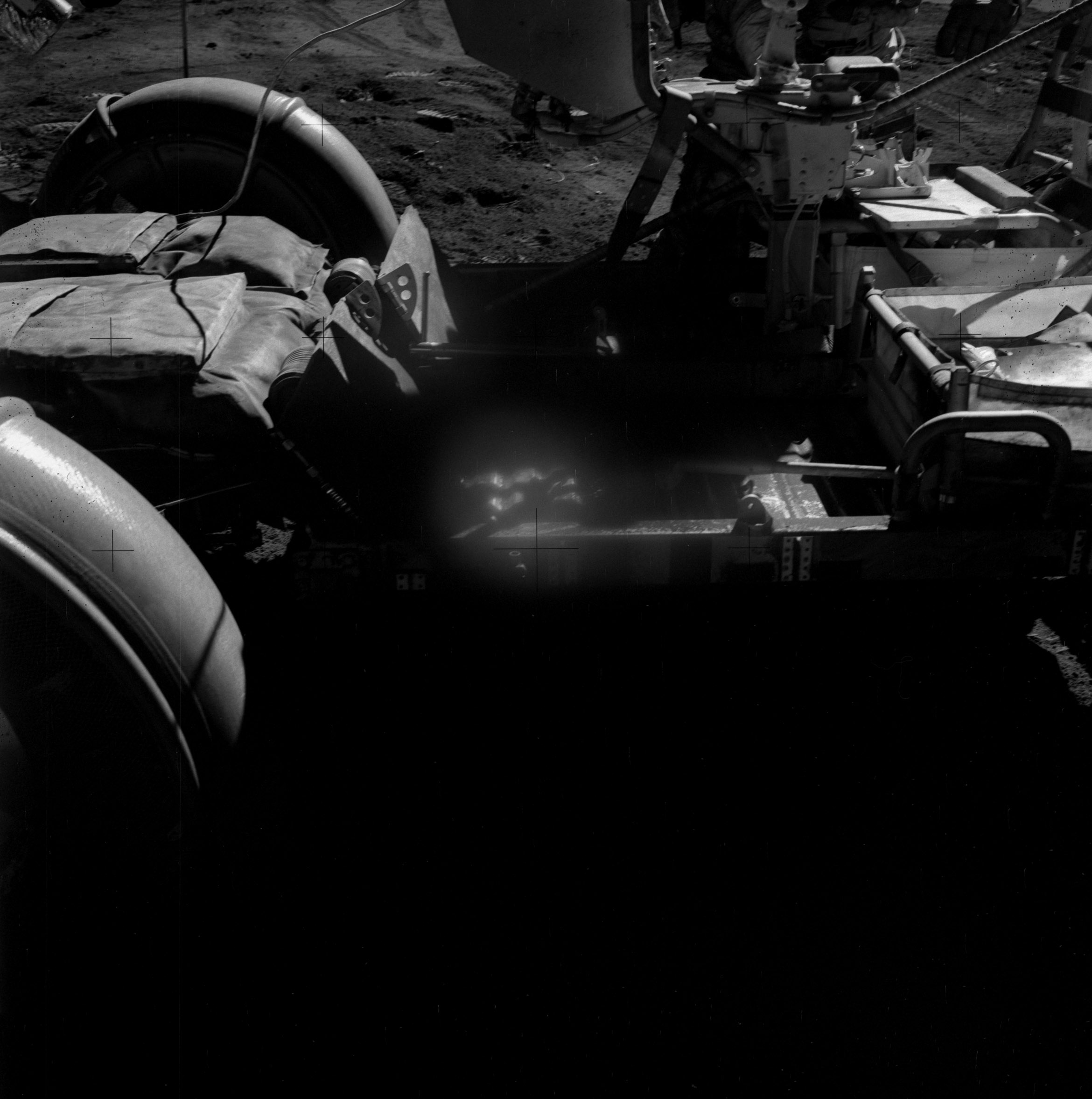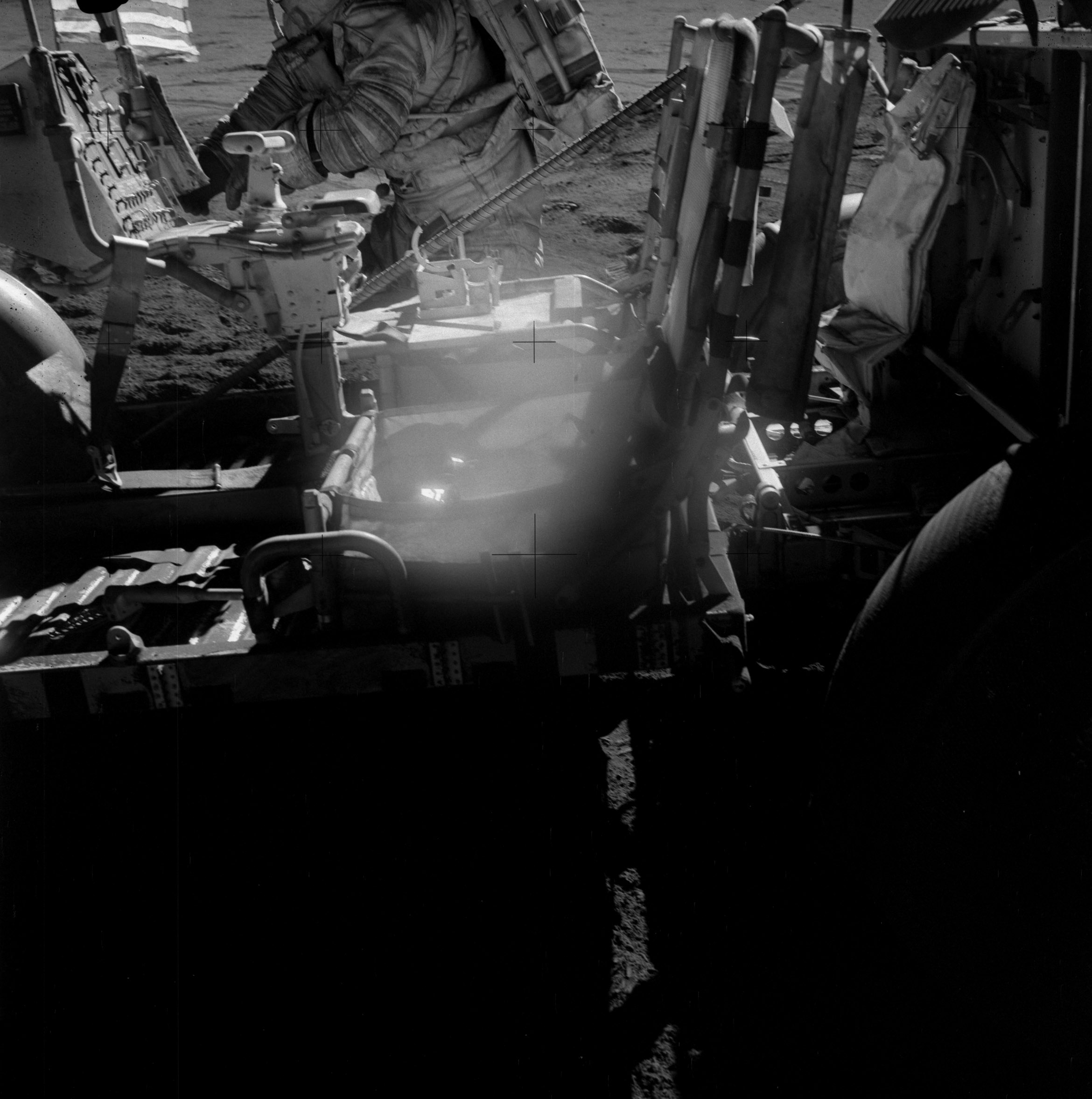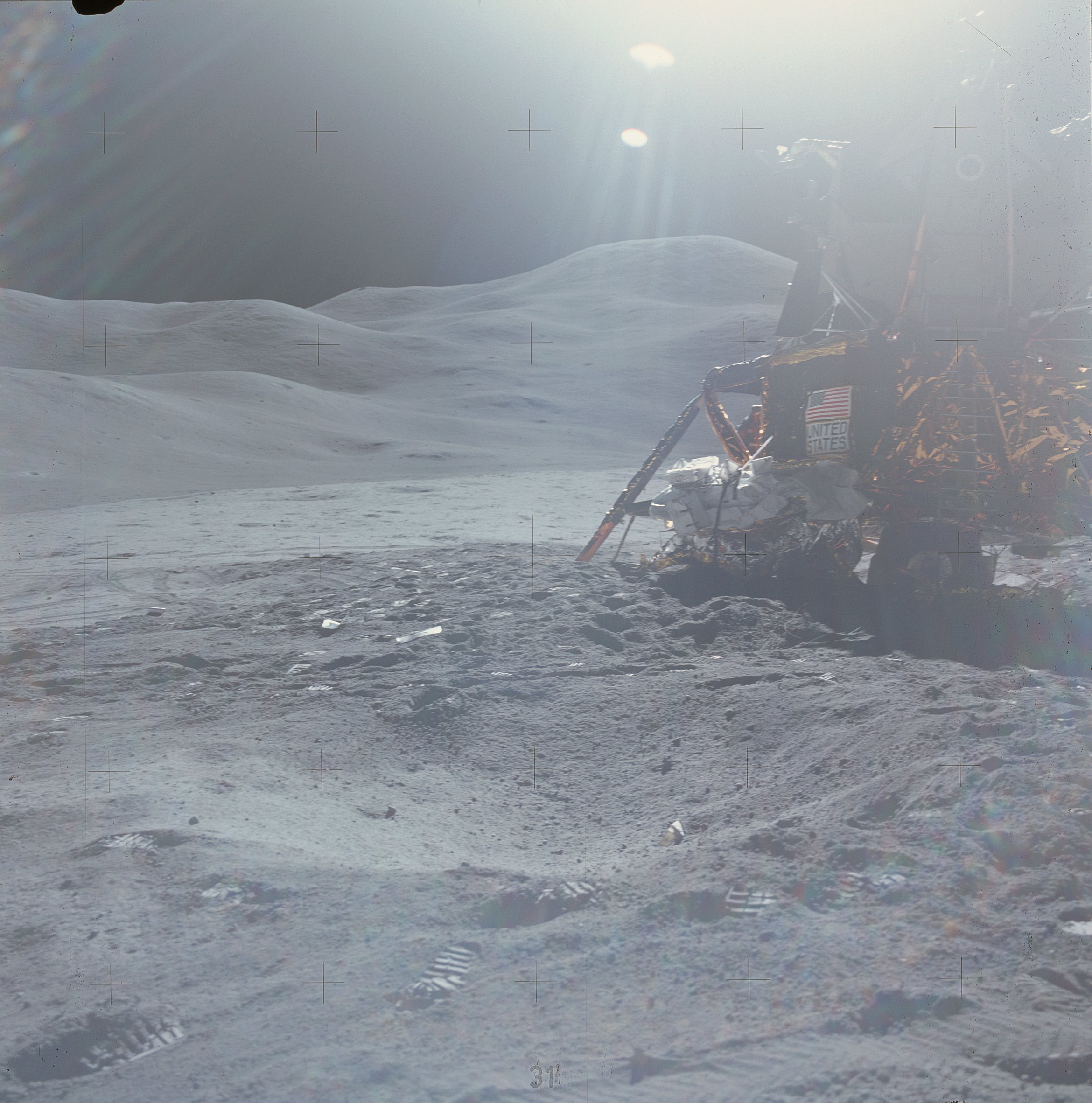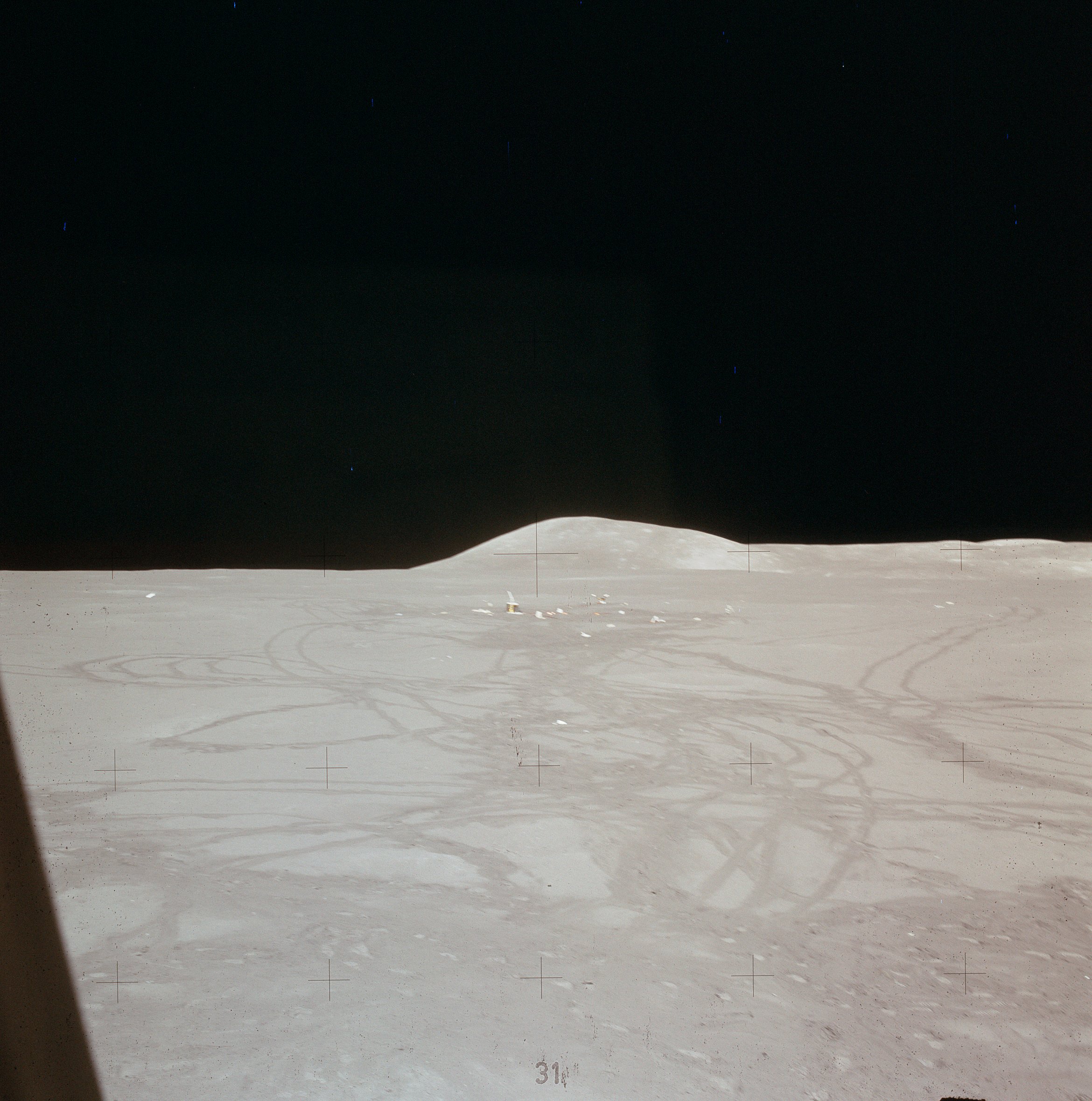 Stephen Tellier scanned a portion of Pan Camera frame 9798, which was taken during CSM Rev 38 at about 151:37. At that time, Dave and Jim were in the LM after the completion of EVA-2. A prominent feature of this image is the darkening of the soil around the LM and along a corridor extending from the LM toward 11 o'clock. See a comparison with frame 9377 by Markus Mehring, who has processed the images to account for differing orientations, different scales due to differing CSM-LM ranges, and different foreshortening due to differing CSM elevation angles. As Jack Schmitt discusses in the Apollo 17 commentary, the surface around the LM became brighter after being swept by the descent engine exhaust. As can be seen in photos taken on the surface, areas subsequently disturbed by the astronauts became relatively dark again. At locations relatively far from the LM, disturbed soil had the same brightness as undisturbed soil, another indication of brightening due to the engine exhaust.Rev. 50 Pan Camera 9809, North Detail ( 332k )
