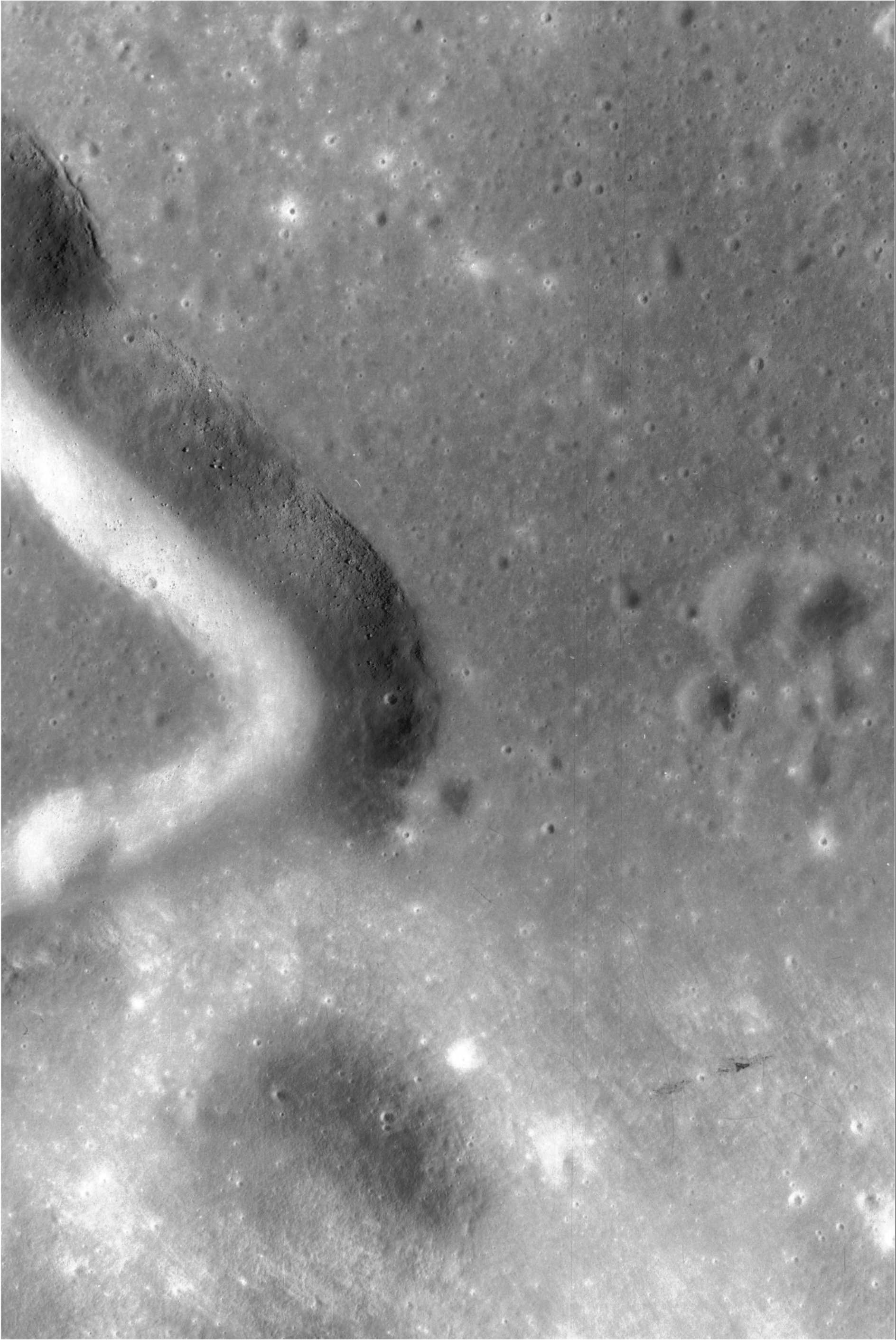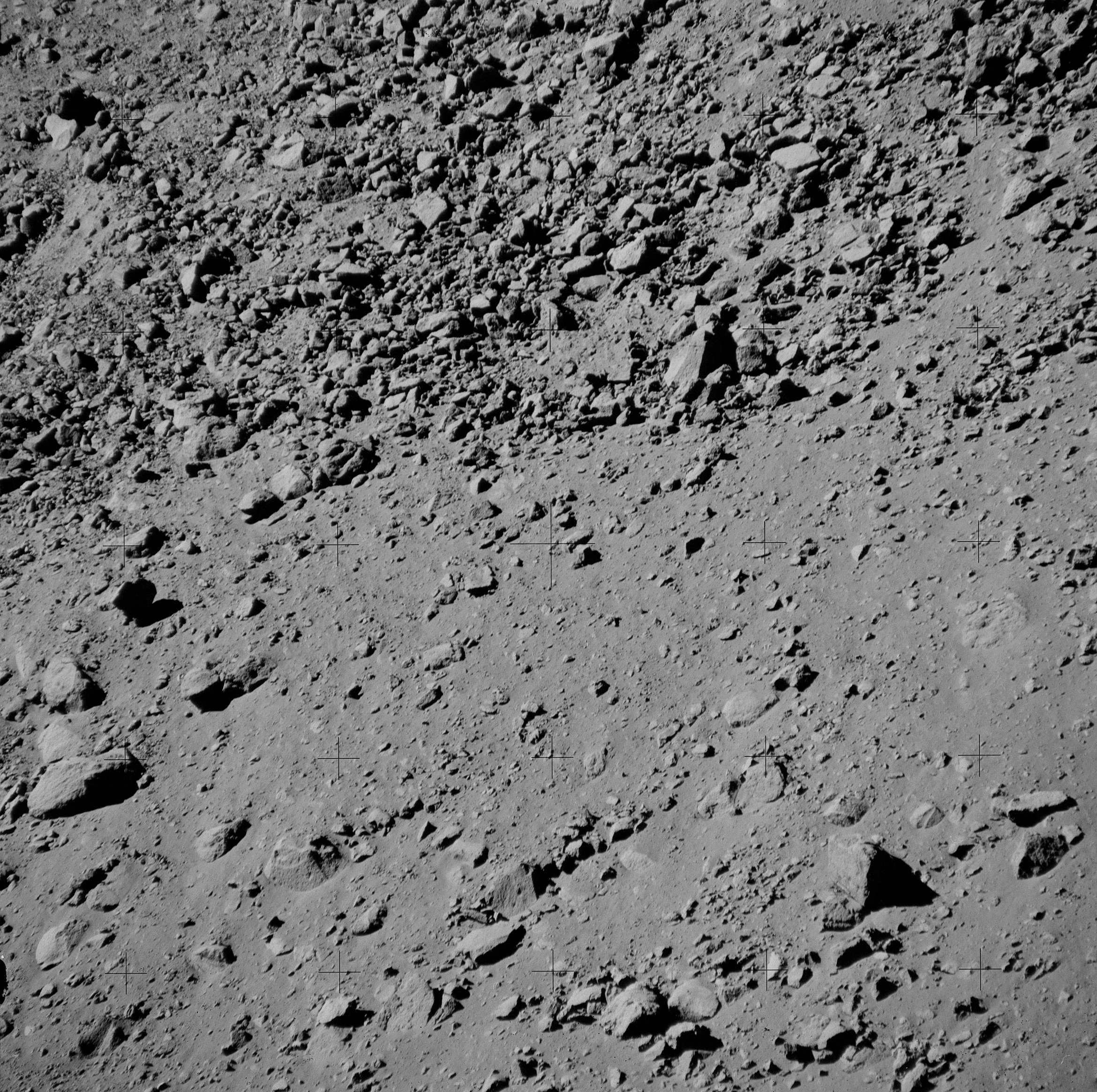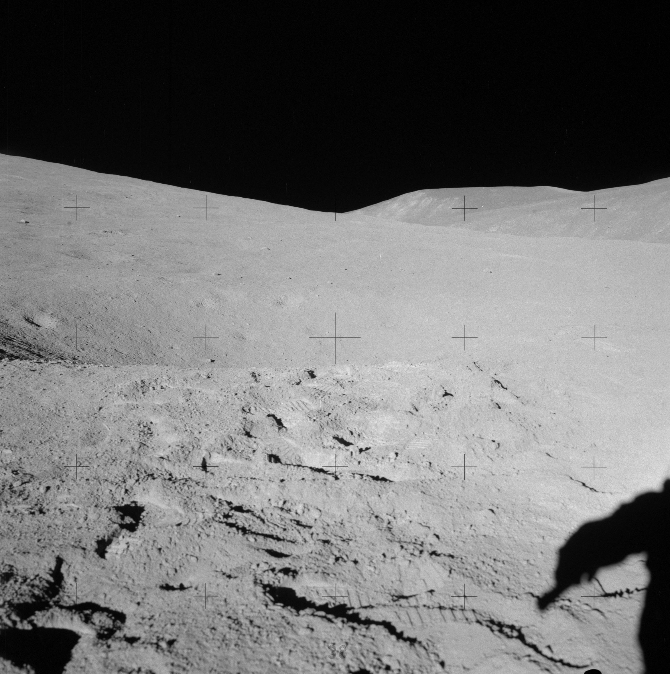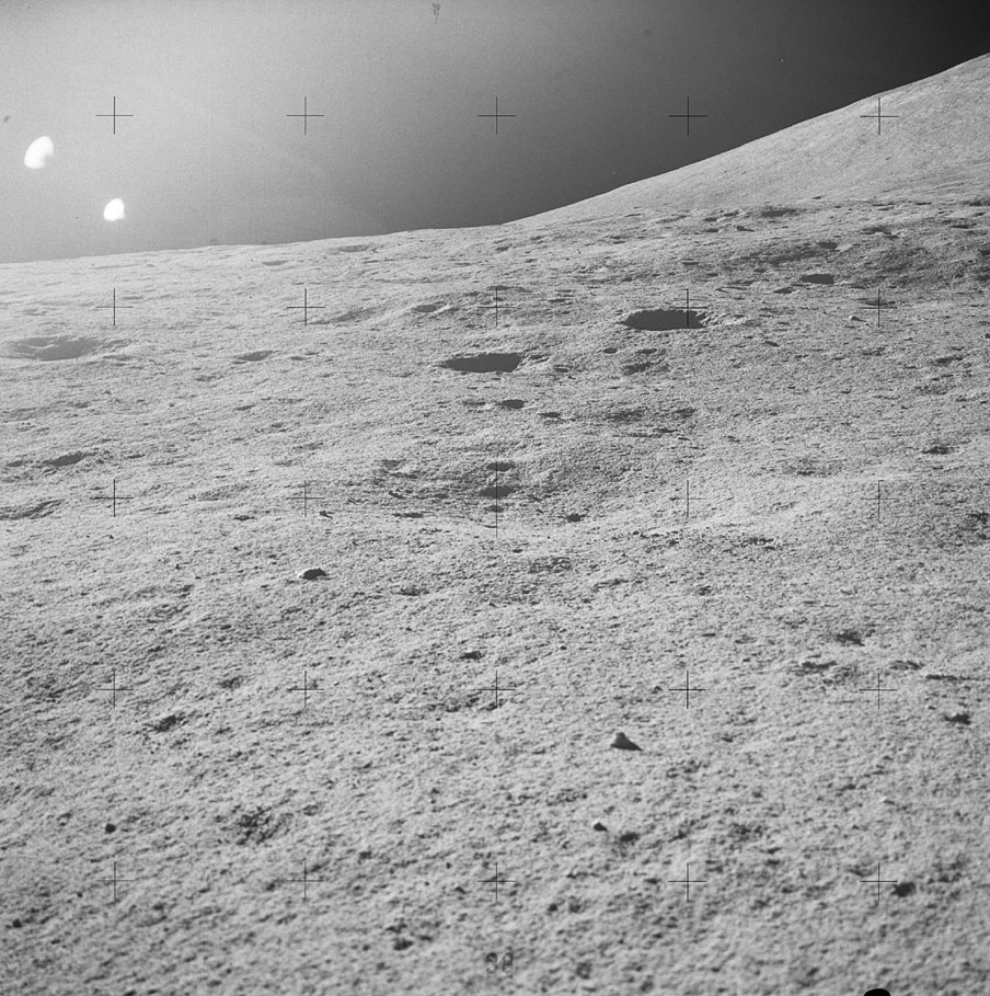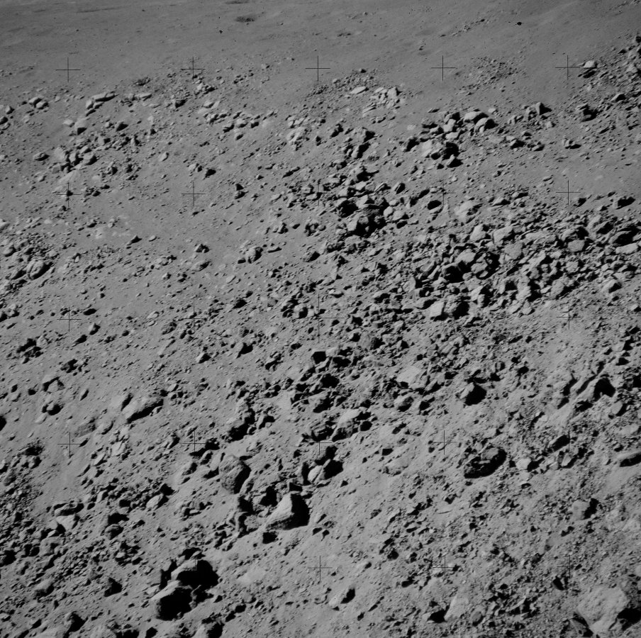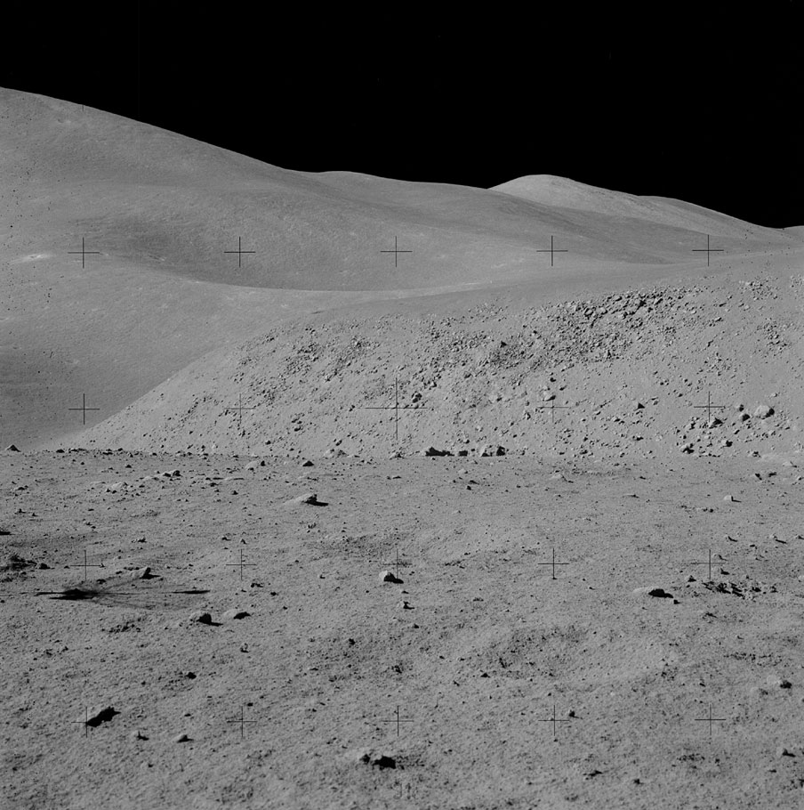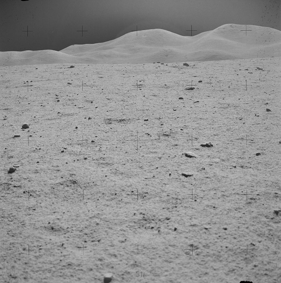 Stephen Tellier scanned a portion of Pan Camera frame 9798, which was taken during CSM Rev 38 at about 151:37. At that time, Dave and Jim were in the LM after the completion of EVA-2. A prominent feature of this image is the darkening of the soil around the LM and along a corridor extending from the LM toward 11 o'clock. See a comparison with frame 9377 by Markus Mehring, who has processed the images to account for differing orientations, different scales due to differing CSM-LM ranges, and different foreshortening due to differing CSM elevation angles. As Jack Schmitt discusses in the Apollo 17 commentary, the surface around the LM became brighter after being swept by the descent engine exhaust. As can be seen in photos taken on the surface, areas subsequently disturbed by the astronauts became relatively dark again. At locations relatively far from the LM, disturbed soil had the same brightness as undisturbed soil, another indication of brightening due to the engine exhaust.Rev. 50 Pan Camera 9809, North Detail ( 332k )