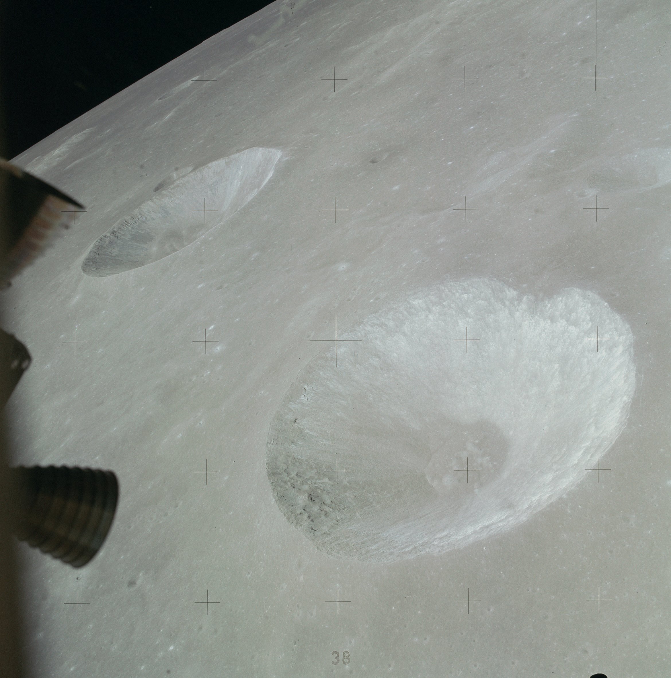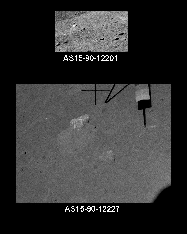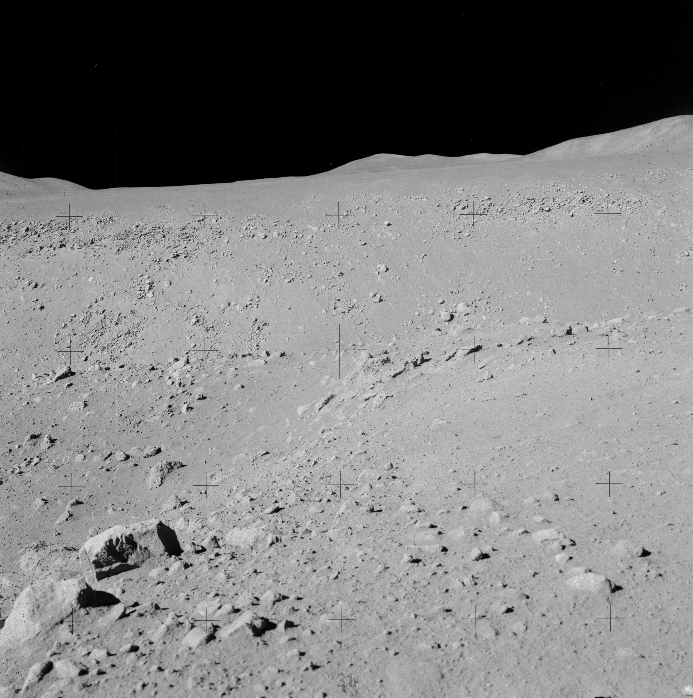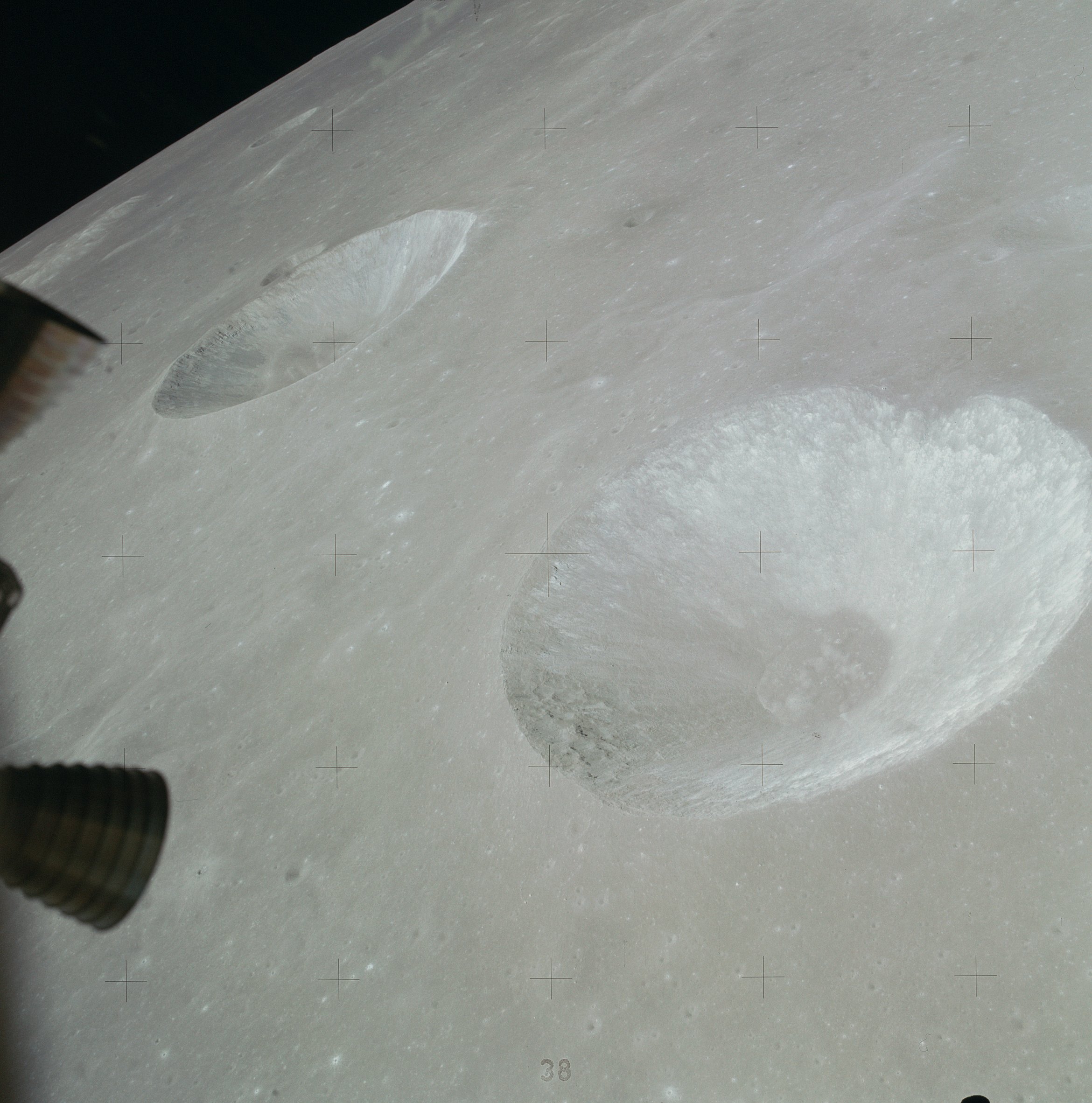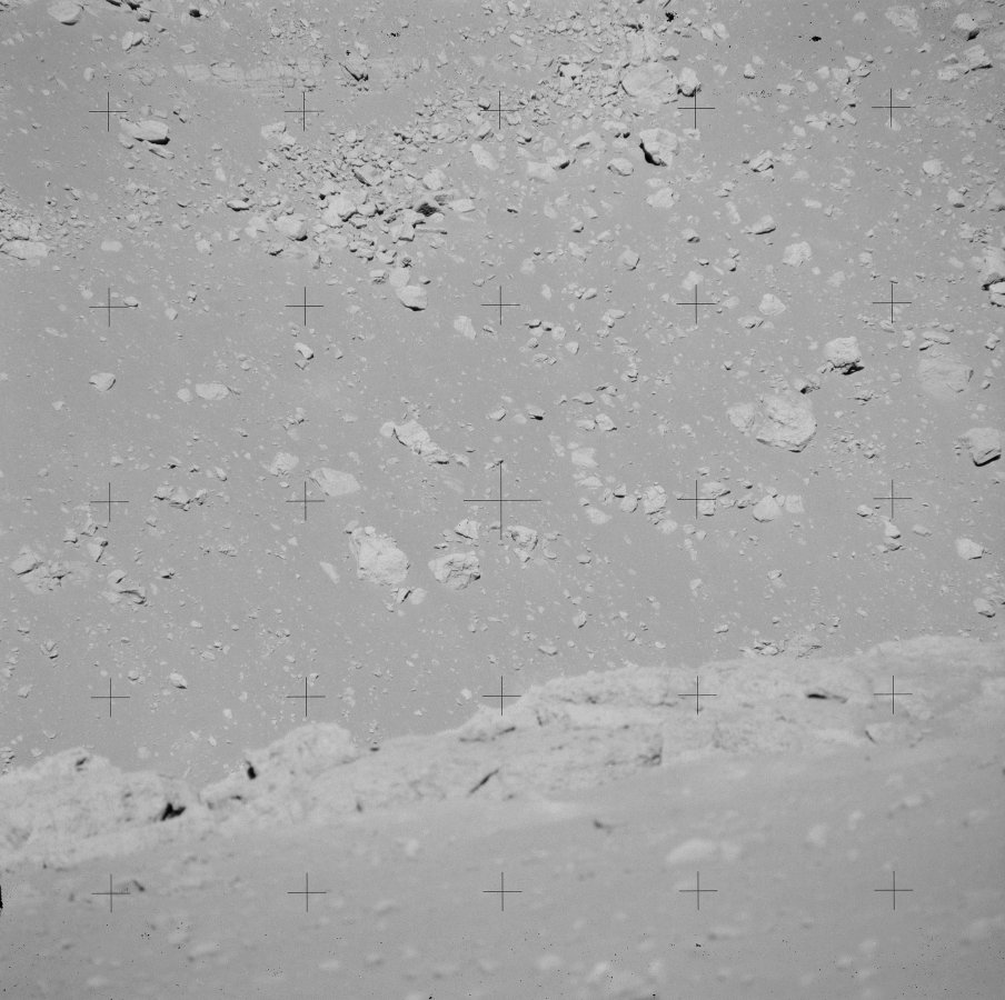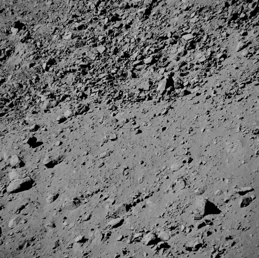 Stephen Tellier scanned a portion of Pan Camera frame 9798, which was taken during CSM Rev 38 at about 151:37. At that time, Dave and Jim were in the LM after the completion of EVA-2. A prominent feature of this image is the darkening of the soil around the LM and along a corridor extending from the LM toward 11 o'clock. See a comparison with frame 9377 by Markus Mehring, who has processed the images to account for differing orientations, different scales due to differing CSM-LM ranges, and different foreshortening due to differing CSM elevation angles. As Jack Schmitt discusses in the Apollo 17 commentary, the surface around the LM became brighter after being swept by the descent engine exhaust. As can be seen in photos taken on the surface, areas subsequently disturbed by the astronauts became relatively dark again. At locations relatively far from the LM, disturbed soil had the same brightness as undisturbed soil, another indication of brightening due to the engine exhaust.Rev. 50 Pan Camera 9809, North Detail ( 332k )