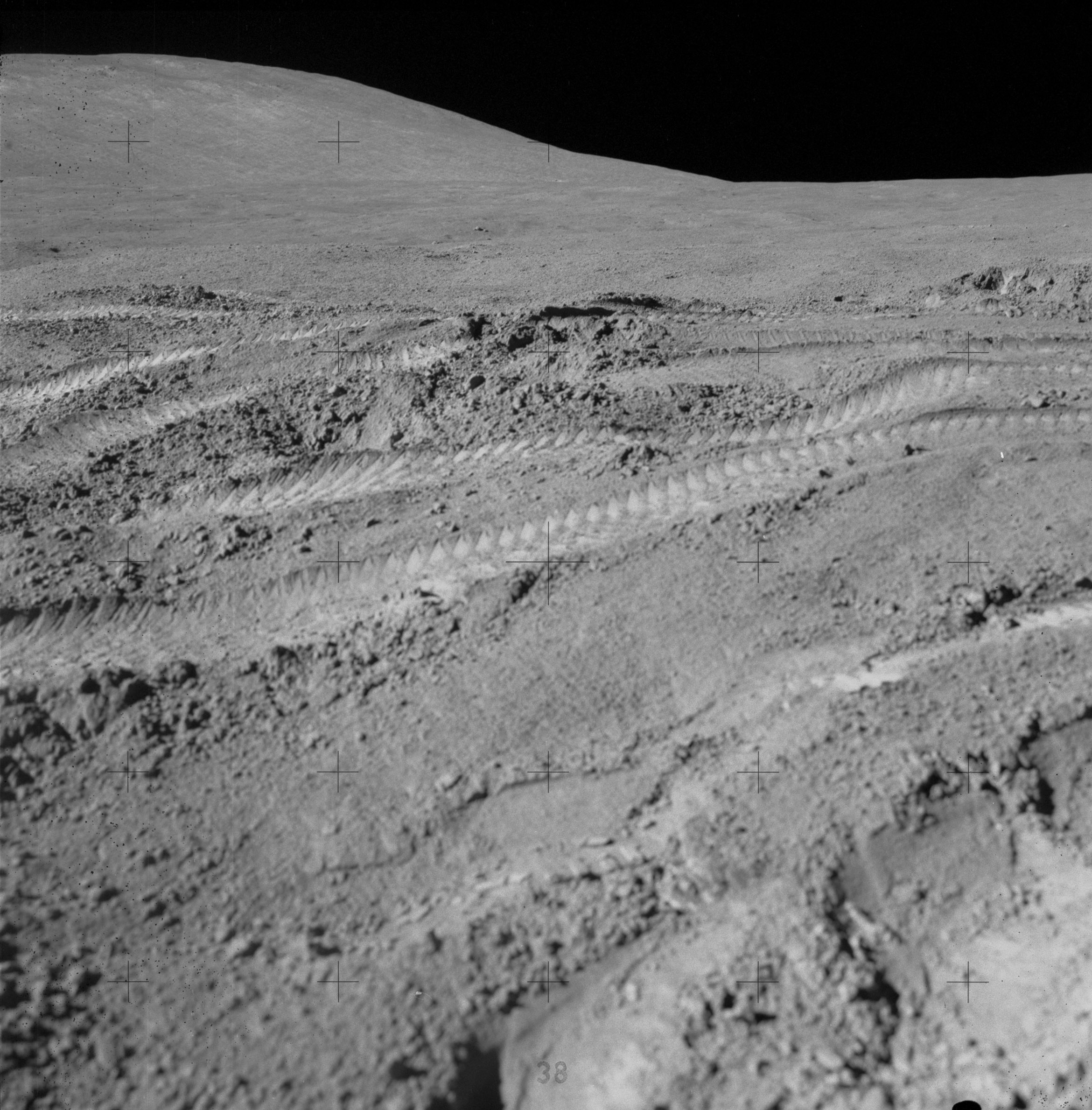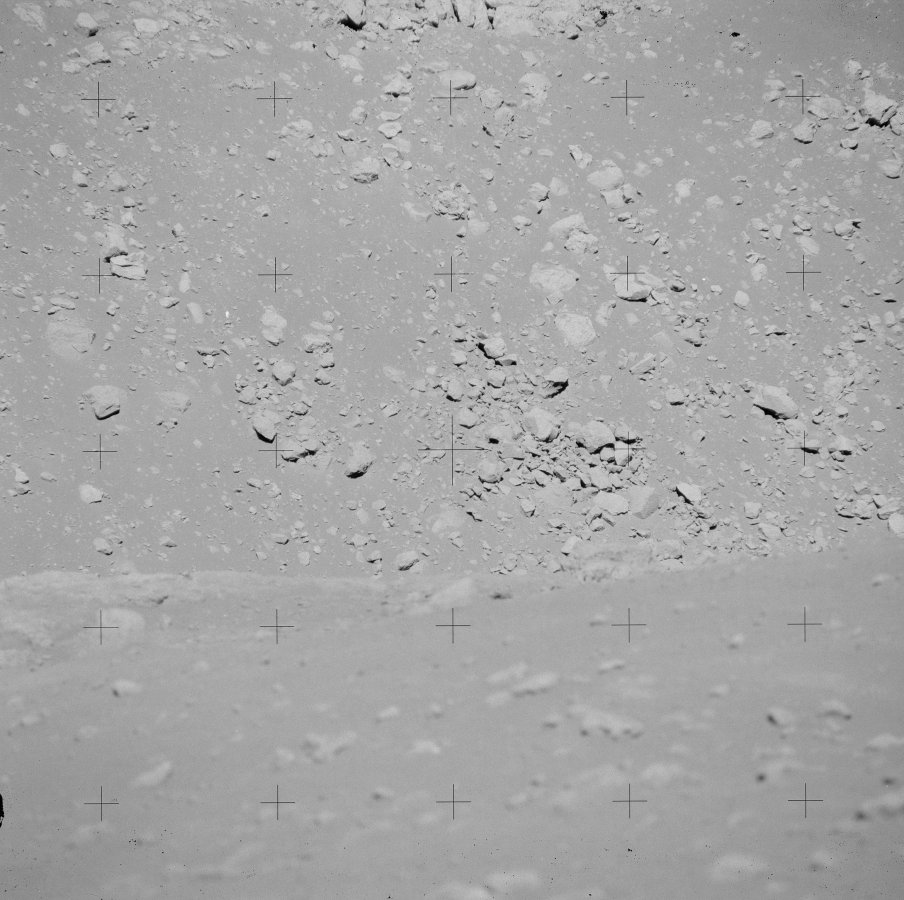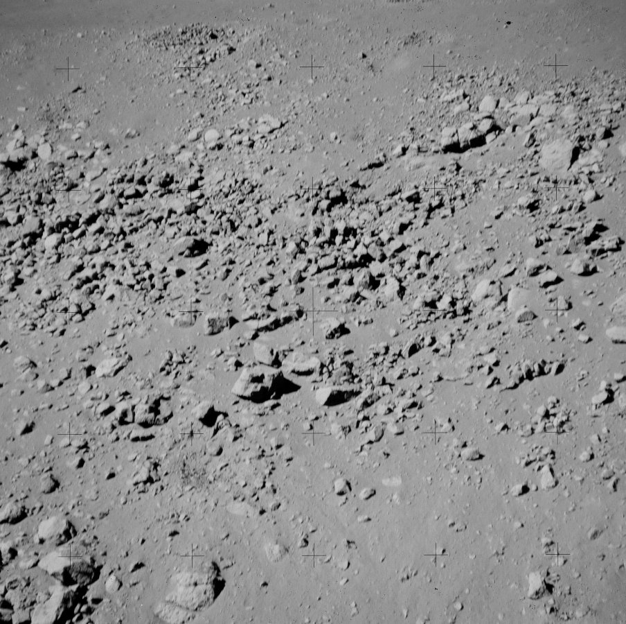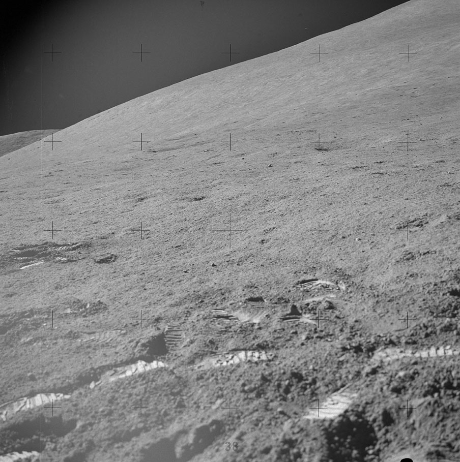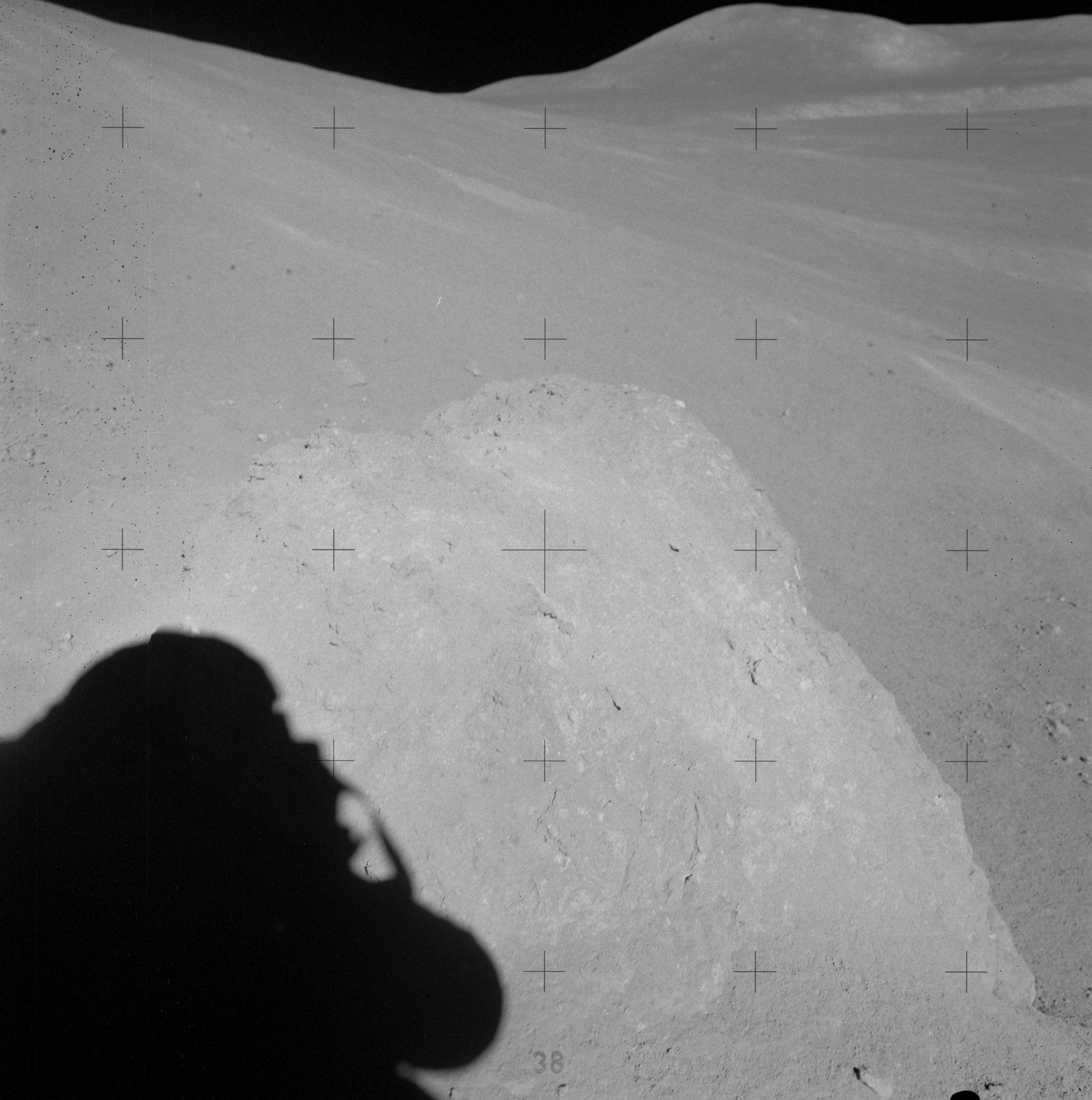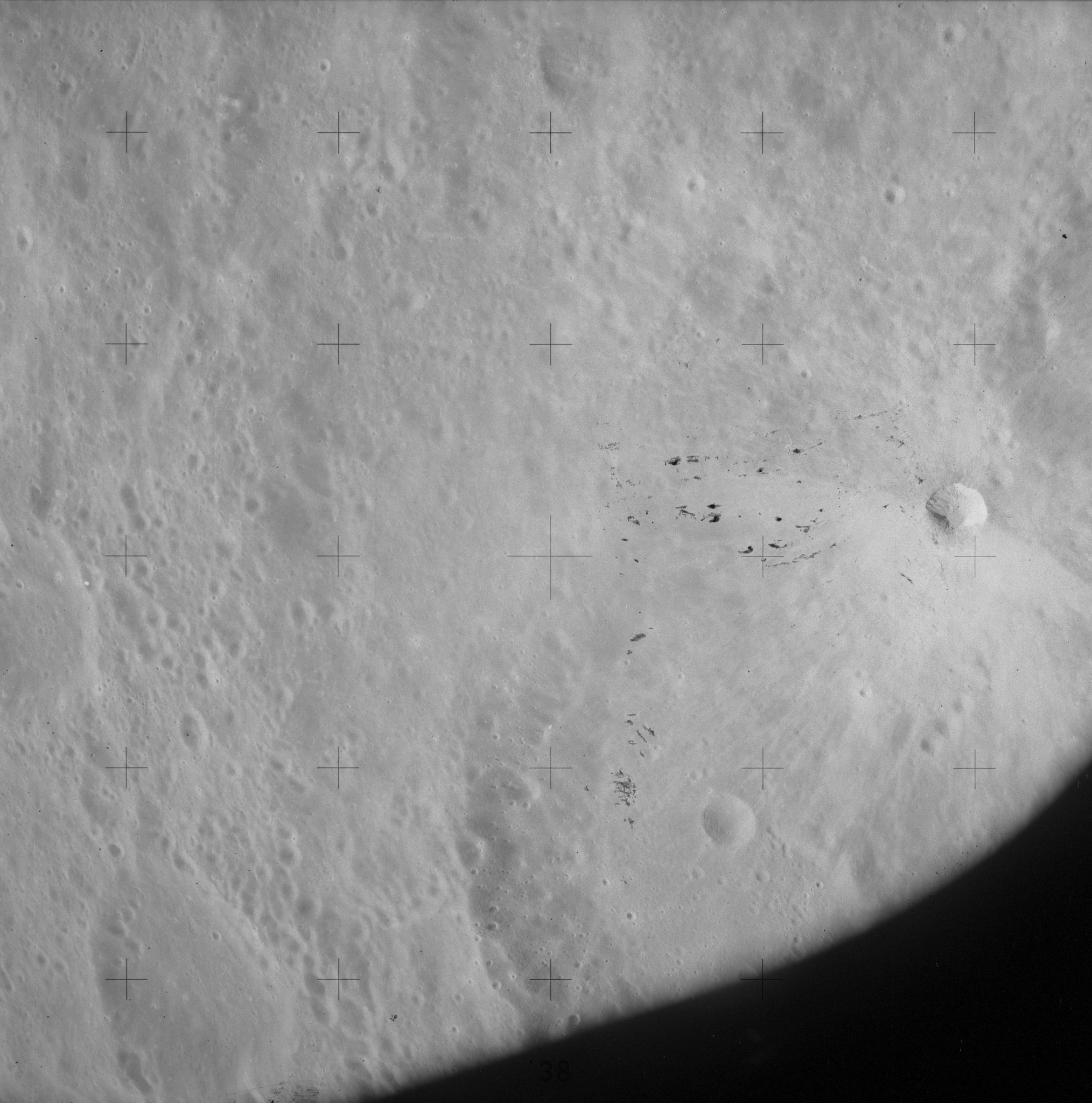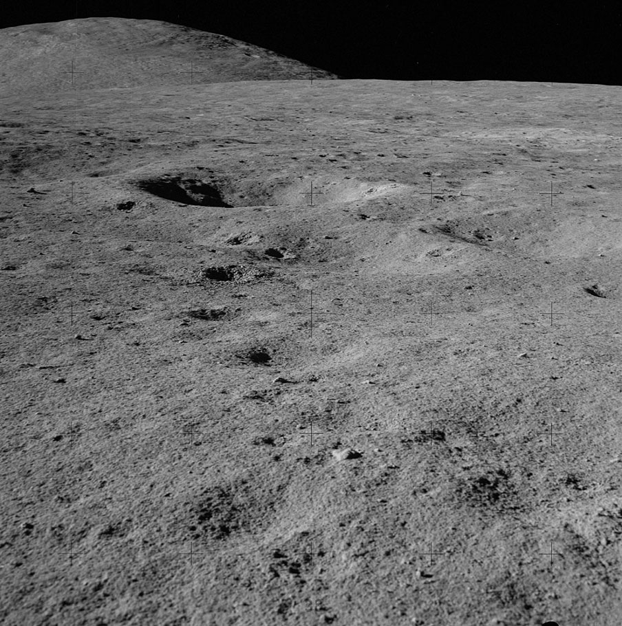Stephen Tellier scanned a portion of Pan Camera frame 9798, which was taken during CSM Rev 38 at about 151:37. At that time, Dave and Jim were in the LM after the completion of EVA-2. A prominent feature of this image is the darkening of the soil around the LM and along a corridor extending from the LM toward 11 o'clock. See a comparison with frame 9377 by Markus Mehring, who has processed the images to account for differing orientations, different scales due to differing CSM-LM ranges, and different foreshortening due to differing CSM elevation angles. As Jack Schmitt discusses in the Apollo 17 commentary, the surface around the LM became brighter after being swept by the descent engine exhaust. As can be seen in photos taken on the surface, areas subsequently disturbed by the astronauts became relatively dark again. At locations relatively far from the LM, disturbed soil had the same brightness as undisturbed soil, another indication of brightening due to the engine exhaust.Rev. 50 Pan Camera 9809, North Detail ( 332k )