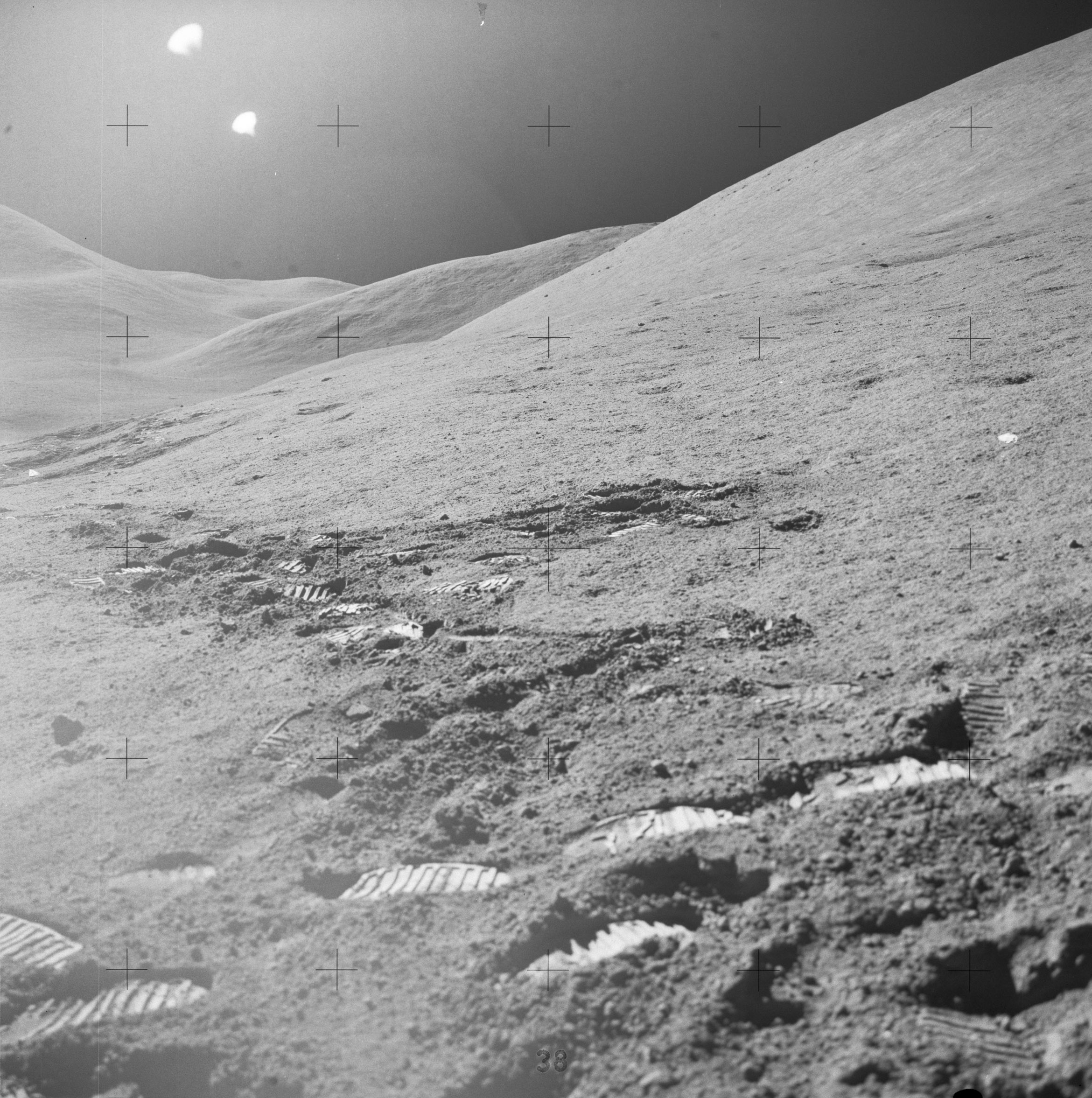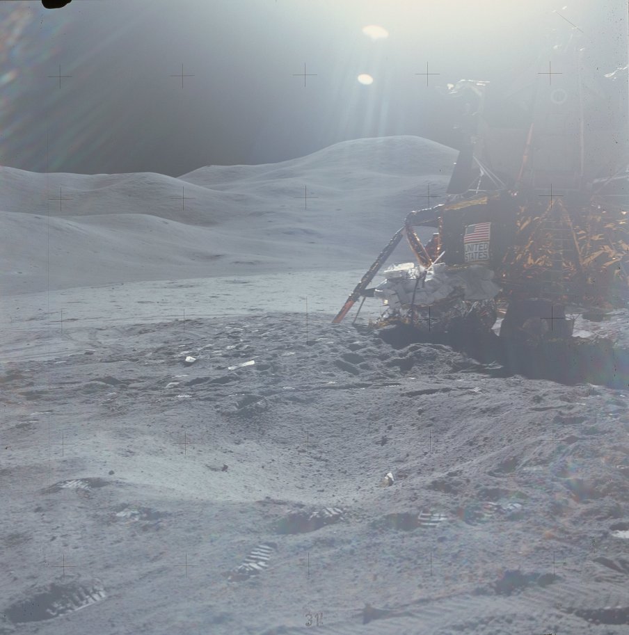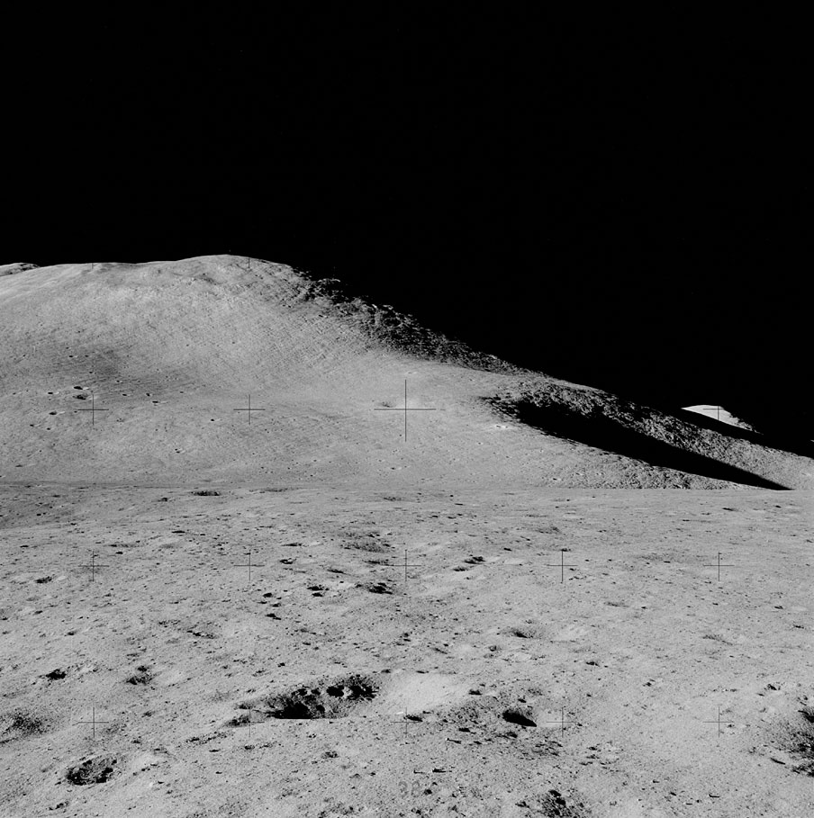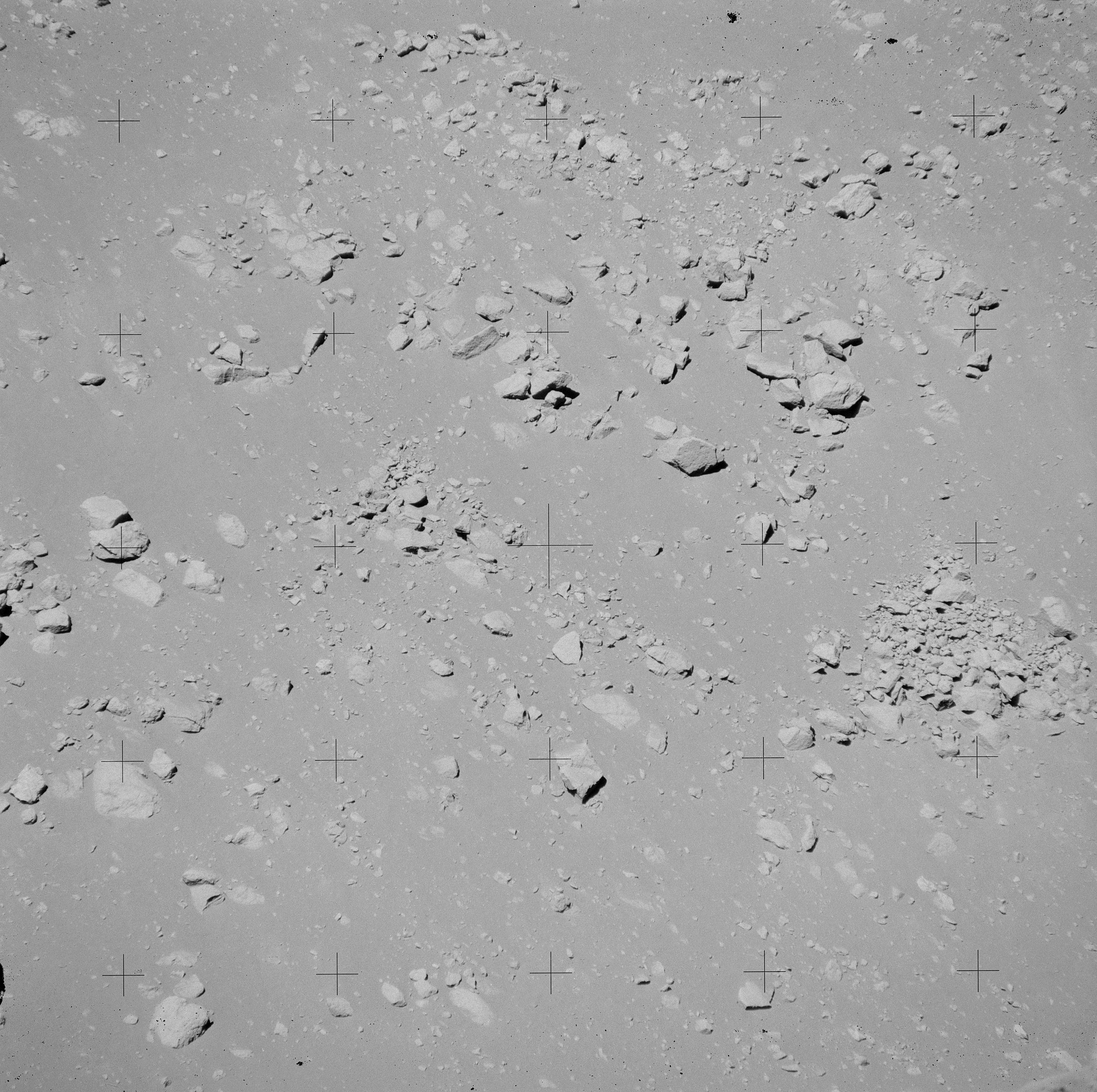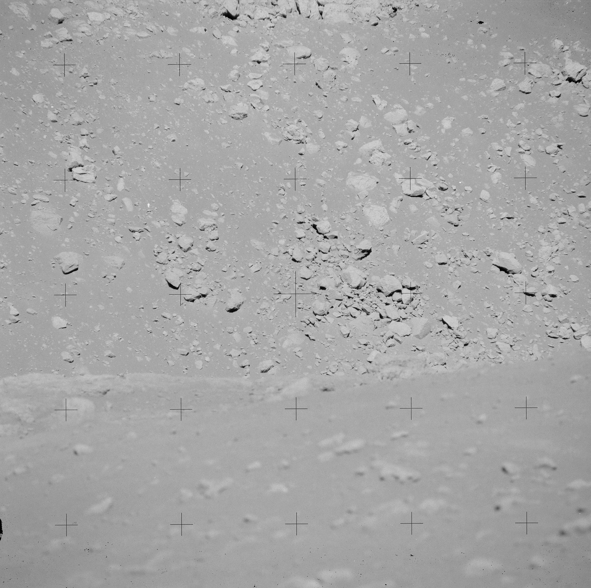 Stephen Tellier scanned a portion of Pan Camera frame 9798, which was taken during CSM Rev 38 at about 151:37. At that time, Dave and Jim were in the LM after the completion of EVA-2. A prominent feature of this image is the darkening of the soil around the LM and along a corridor extending from the LM toward 11 o'clock. See a comparison with frame 9377 by Markus Mehring, who has processed the images to account for differing orientations, different scales due to differing CSM-LM ranges, and different foreshortening due to differing CSM elevation angles. As Jack Schmitt discusses in the Apollo 17 commentary, the surface around the LM became brighter after being swept by the descent engine exhaust. As can be seen in photos taken on the surface, areas subsequently disturbed by the astronauts became relatively dark again. At locations relatively far from the LM, disturbed soil had the same brightness as undisturbed soil, another indication of brightening due to the engine exhaust.Rev. 50 Pan Camera 9809, North Detail ( 332k )