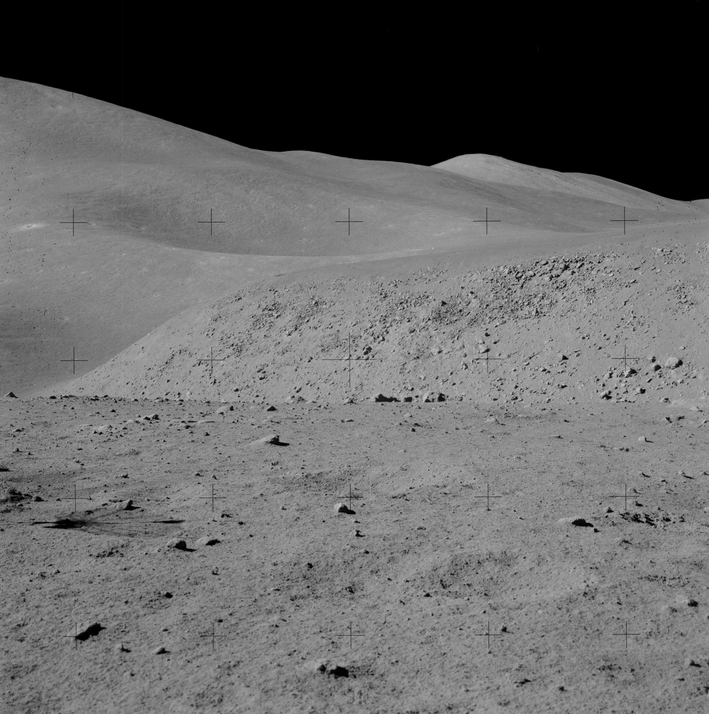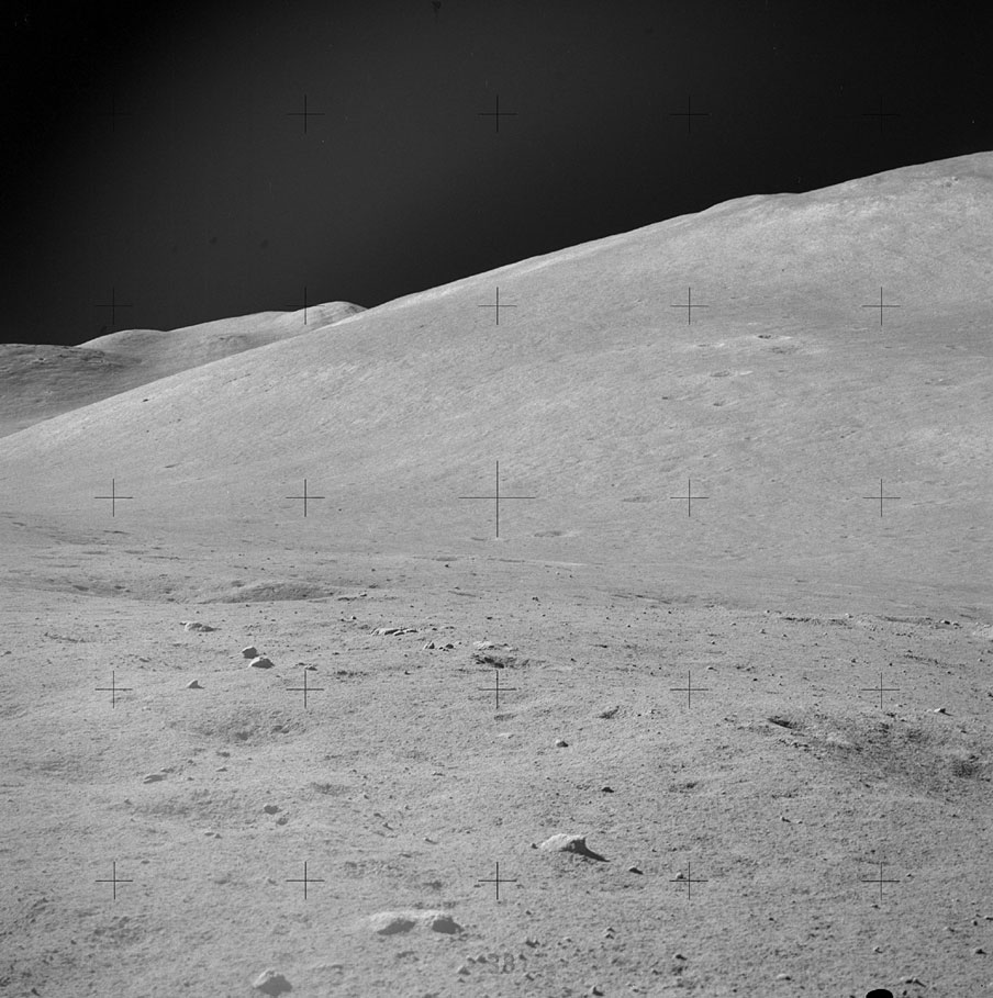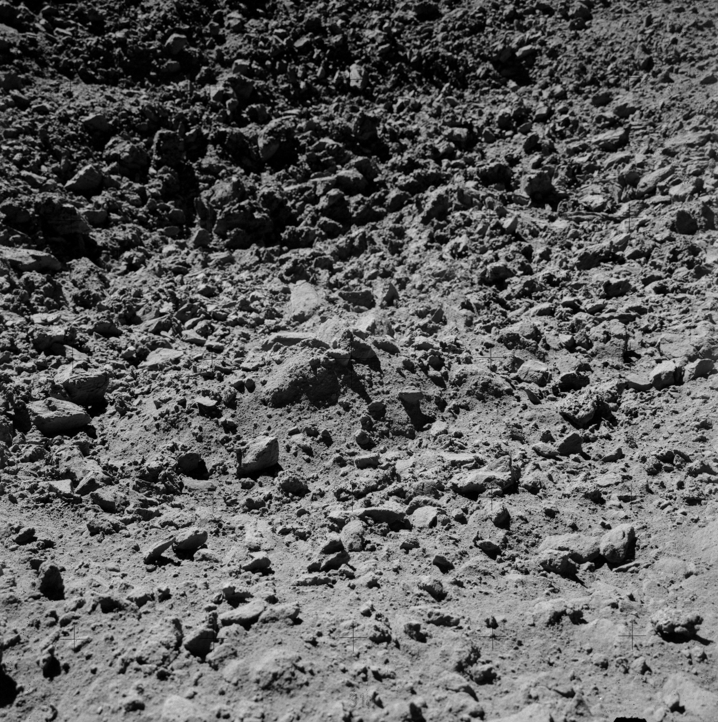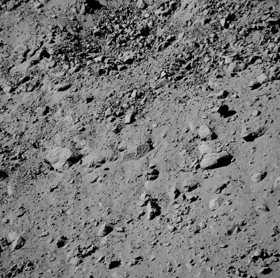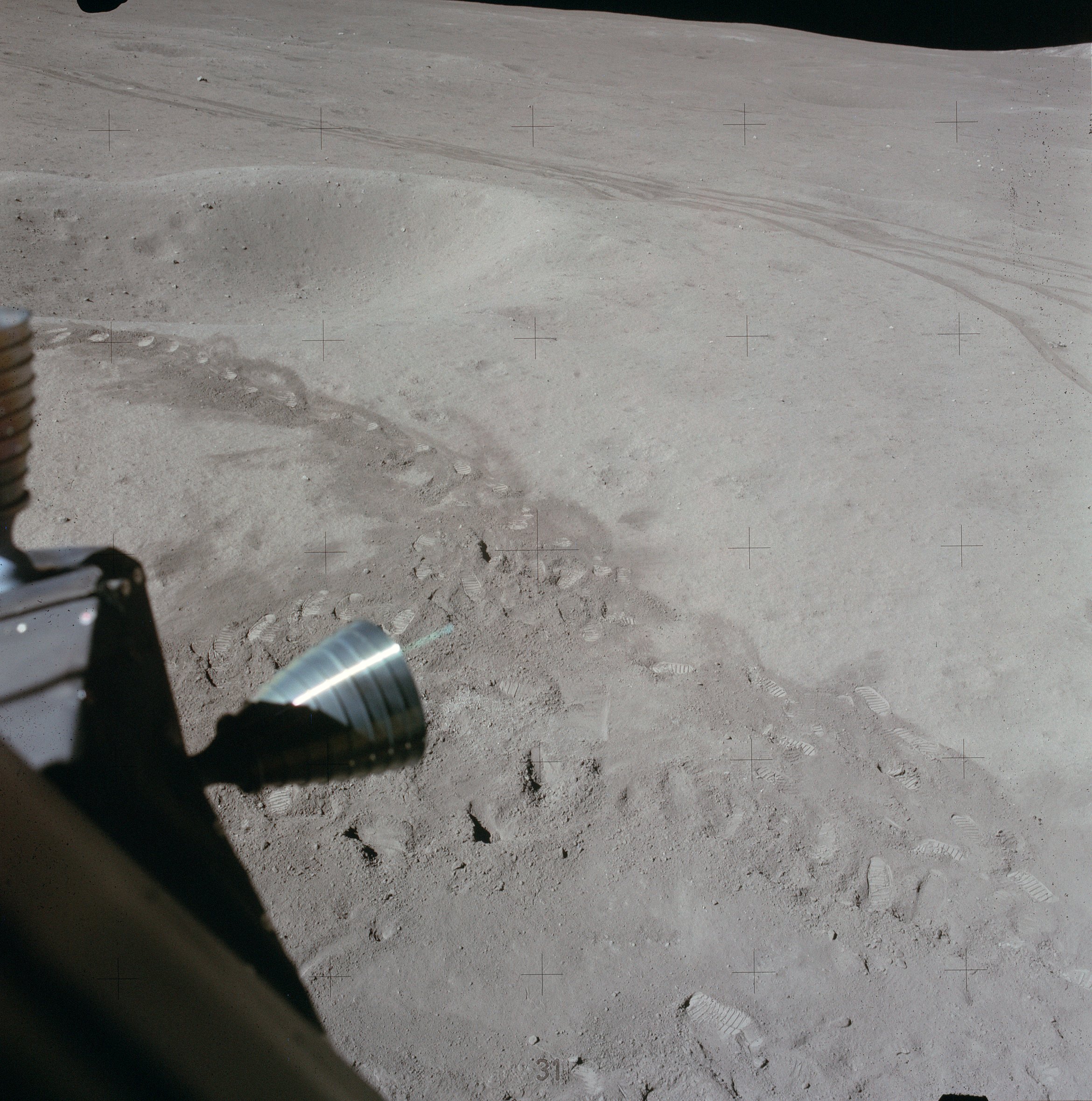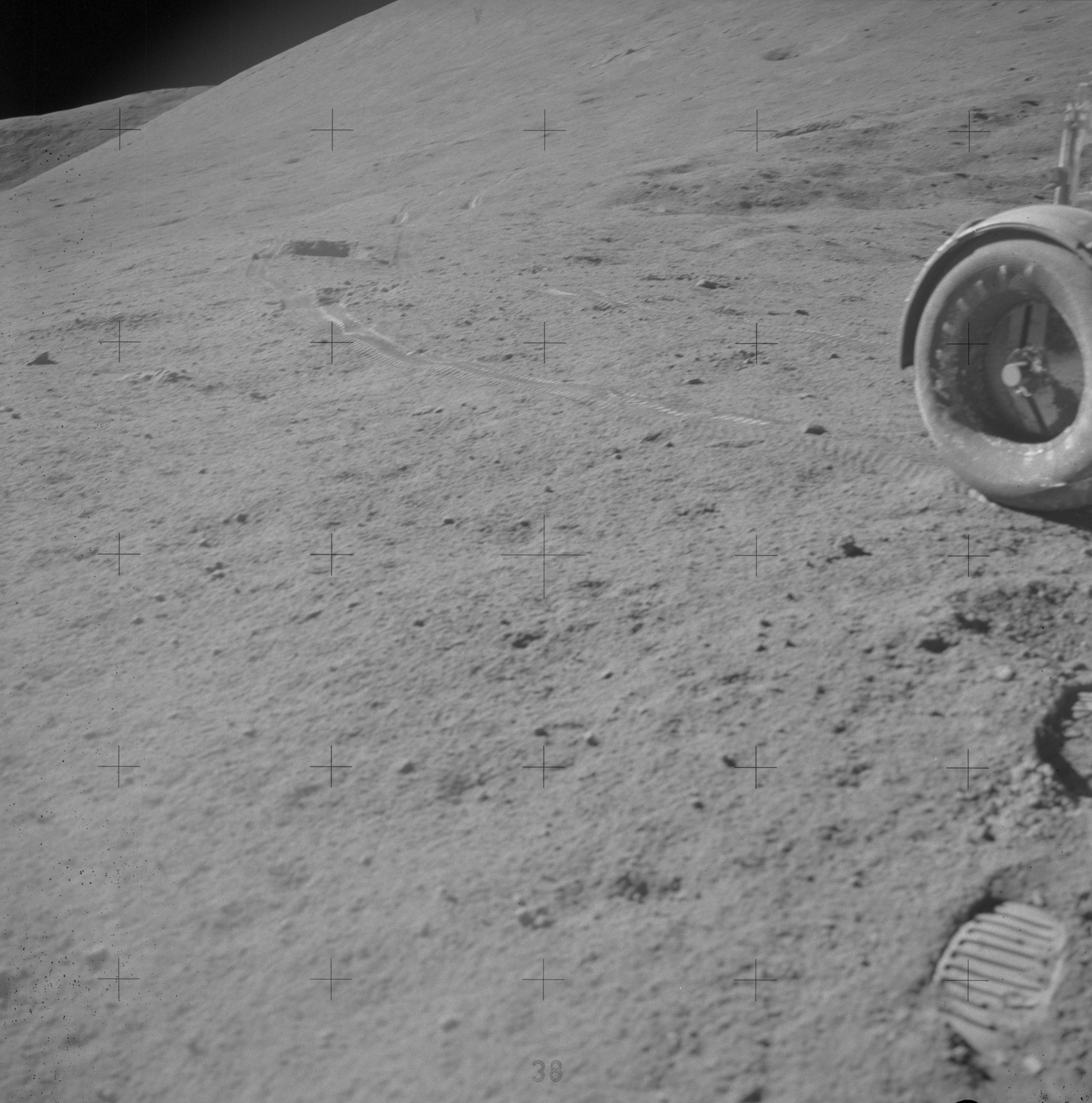 Stephen Tellier scanned a portion of Pan Camera frame 9798, which was taken during CSM Rev 38 at about 151:37. At that time, Dave and Jim were in the LM after the completion of EVA-2. A prominent feature of this image is the darkening of the soil around the LM and along a corridor extending from the LM toward 11 o'clock. See a comparison with frame 9377 by Markus Mehring, who has processed the images to account for differing orientations, different scales due to differing CSM-LM ranges, and different foreshortening due to differing CSM elevation angles. As Jack Schmitt discusses in the Apollo 17 commentary, the surface around the LM became brighter after being swept by the descent engine exhaust. As can be seen in photos taken on the surface, areas subsequently disturbed by the astronauts became relatively dark again. At locations relatively far from the LM, disturbed soil had the same brightness as undisturbed soil, another indication of brightening due to the engine exhaust.Rev. 50 Pan Camera 9809, North Detail ( 332k )